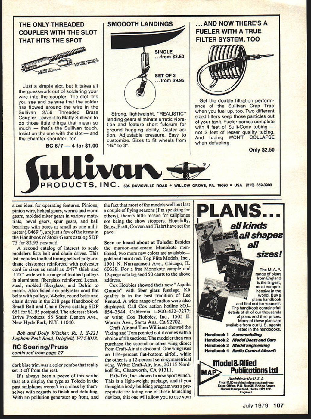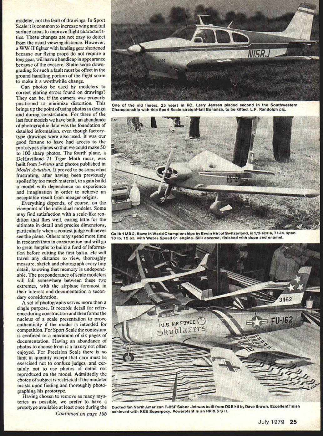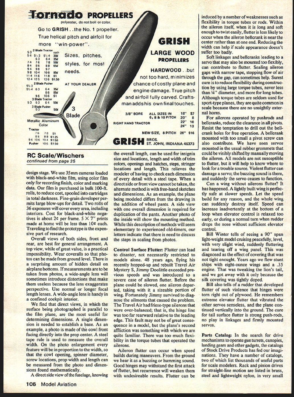 PHOTO Documentation Knowledgeable contest judges given choice between details shapes shown 3-view drawing also photos will usually take photo reliable information source Having fooled 3-view drawings numerous occasions past cannot help agree choice Unless hard dimensions given feature model being designed dimensioned detail drawings used prototype modeler helpless determine degree exactness shapes sizes positions will produce superior plane Planes suffer inexactness whether kit scratch-built familiar everyone famous racing plane example has photoAt DCRC Beltsville Contest Phil Sibilles Spitfire landed left wheel right wing tip touching prop Right wheel stuck up position Preston photograph graphed profusely during its lifetime will quite familiar modelers judges obviously off-scale some respect such having too short landing gear wheels too small too wide apart engine compartment undersized faults will painfully apparent anyone good sense proportions Some changes may intentional Udo Menkes Messerschrniu Mel u iii spe1acuIar nign apsag pass overOla waroen eroarome ngIana 111gm ou iooing ai pounus hoof Power adequate two Webrs 91 engines Modelers allowed use Old Warden Airfield special Sundays throughoutsummer 24 Model Aviation Duke Fox snapped George Myers WRAMS Show wants know Fox Twin production Basically pair 60s back back puts Out 3 hp 14500 rpm Simultaneous opposed firing low vibration massively built handle large propellers Nick Ziroli shows latest creation Midwest RK-20 fanjet unit deHavilland Vampire Power K&B 35cc Electric starter can used removing canopy forward section Myers pic modeler fault drawings Sport Scale common increase wing tail surface areas improve flight characteris tics changes easy detect usual viewing distance However WW II fighter landing gear shortened because flying props require long gear will have handicap appearance because eyesore Static score down grading such fault must offset ground handling portion flight score make worthwhile change Can photos used modelers correct glaring errors found drawings can camera properly positioned minimize distortion brings up point using photos design during construction three last four models have built abundance photographic data foundation detailed information though factorytype drawings also used good fortune have access prototypes planes could make 50 100 sharp photos fourth plane DeHavilland 71 Tiger Moth racer built 3-views photos published Model Aviation proved somewhat frustrating after having previously spoiled too much material again build model dependence experience imagination order achieve acceptable result meager origins Everything depends course viewpoint individual modeler Some may find satisfaction scale-like ren dition flies well caring little ultimate detail precise dimensions particularly contest judge will never see plane Others may spend time research construction will go great lengths build fund informa tion before cutting first balsa will travel distance view thoroughly measure sketch photograph tiny detail knowing memory undepend able preponderance scale modelers will fall somewhere between two extremes airplane foremost interest documentation secon dary consideration set photographs serves single purpose records detail refer ence during construction forms nucleus scale presentation prove authenticity model intended competition Sport Scale contestant confined maximum six pages documentation Having abundance photos choose luxury often enjoyed Precision Scale no limit quantity except care must exercised confuse judges cer tainly use photos detail reproduced model Admittedly choice subject restricted modeler insists upon finding thoroughly photo graphing prototype Having chosen remove mys teries possible prefer have prototype available least once during Continued page 106 July1979 25 old timers 25 years RC Larry Jensen placed second Southwestern Championship Sport Scale straight-tail Bonanza kitted LF Randolph pic Colibri MB 2 flown World Championships Erwin Hirt Switzerland 1 /3-scale 71-in span 10 lb 12 oz Webra Speed 61 engine Silk covered finished dope enamel Ducted fan North American F86F Saber Jet built D&B kit Dave Brown Excellent finish achieved K&B Superpoxy Powerplant RR 65 5 II fO1-flO PROPELLERS polyester boil orcolor Go GRISH propeller True helical pitch airfoil win-power 2 Blade Tractor 5-3each 5-45%-35&-430d 63643W 747-6785 848-6886W 949-697 9-810-410685dneeds 11-411611-8Si 12412512-6S150 2 Blade Pusher 5/ 3 5-46-36-43W 868W 9610-6Si 3 Blade Tractor 53 63 645O 3 Blade Pusher 6350d3 4a- Blade Metallic Aluminum Color Tractor 1678 Si 8688$125 96 106104SiSO Pusher1065150 Sizes pitches styles RC Scale/Wischers continued tram page 25 design stage use 35mm cameras loaded black-and-white film using color film recording finish color marking data film purchased bulk 100-ft rolls reduce cost spooled cartridges total darkness Fine-grain developer per mits large blow-ups detail Two rolls 36 exposures will cover area including interiors Cost black-and-white nega tives about 2 per frame 5 X 7 prints made home will less 10 Traveling find prototype expen sive part research Overall views both sides front rear best general arrangement top view great value practical impossibility Wear coveralls pho tos can made ground level surprising amount hidden detail airplane bottoms Ifmeasurements taken photos wide-angle lens will sometimes introduce distortions make useless because lens exaggerates perspective Use normal longer focal length lenses wide-angle lens handy confined cockpit interior find direct views surface being photographed parallel film plane useful determining dimensions single dimen sion needed establish base As example photo made cowl front facing directly prop center steel tape rule used measure overall width photo enlargement feature will proportion width cowl opening spinner diameter screw locations prop width length can measured photo dimen sions found mathematically direct side view fuselage 
