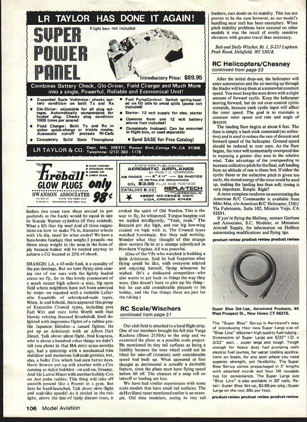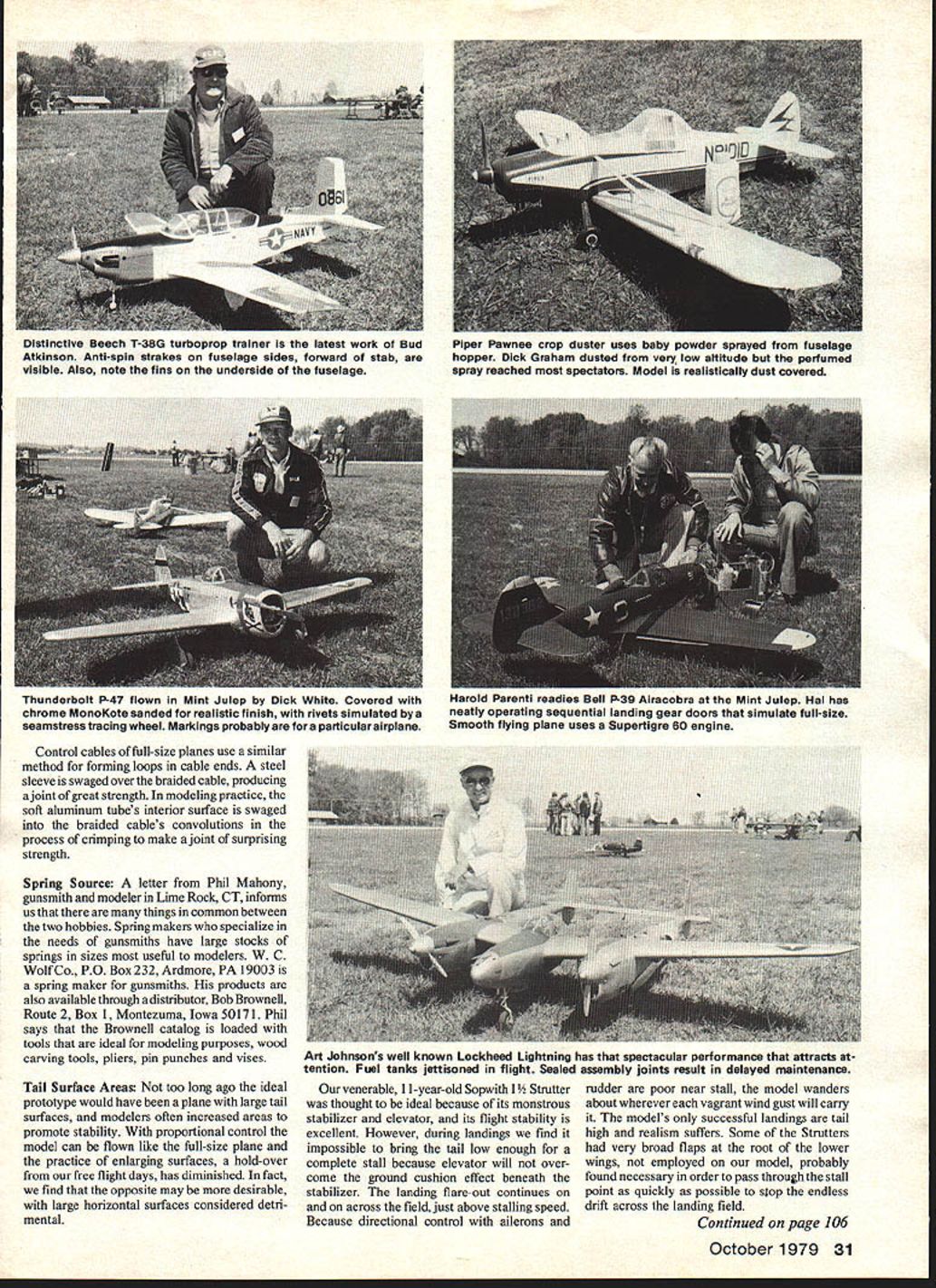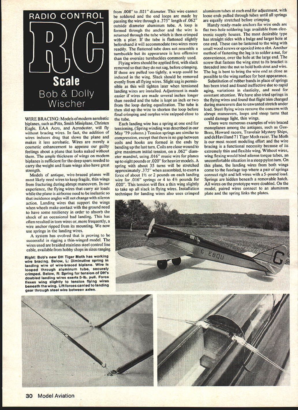 WIRE BRACING Models modern aerobatic biplanes such PiUs Smith Miniplane Christen Eagle EAA Acro Acroduster will fly bracing wires fact addition wires induces drag slows plane makes less aerobatic Wires merely cosmetic enhancement appease guilty feelings about plane looks naked ample thickness wings modern biplanes sufficient deep spars needed carry weight foam wings also have great strength Models antique wire-braced planes will likely need wires keep fragile thin wings fracturing during abrupt maneuvers experience flying wires carry air loads plane airborne need inelastic incidence angles will change aileron action Landing wires support wings wheels make contact ground need have some resiliency order absorb shock occasional bad landing has often resulted torn wires frequently wire anchor ripped its mounting now use springs landing wires system has evolved proving successful rigging thin-winged model wires used braided stainless steel control line cable available hobby shops sizes ranging Right Bobs new DH Tiger Moth has working wire bracing Below L Diminutive spring landing wire wire-braced biplane Wire looped through aluminum tube securely crimped Below R Spring tension OHs doubled landing wires exerts 5-lb pull Force flexes wing slightly tension flying wires beneath wing Lift forces carried landing gear through steel wire between axles 008 021 diameter wire cannot soldered end loops made passing wire through 375 length 062 outside diameter aluminum tube loop formed through anchor wire returned through tube crimped plier tube flattened slightly beforehand will accommodate two wires readily flattened tube does resemble turnbuckle its appearance less offensive oversize tumbuckles commonly used Flying wires should applied first slack removed sag before crimping pulled too tightly warp could induced wing Slack should removed evenly flying wires Slight sag permis sible will tighten later tensioned landing wires installed Adjustment made easier wires made several inches longer needed tube kept inch two loop during equalization tube slid up wire shorten loop before final crimping surplus wire snipped close tube landing wire has spring end tensioning Spring winding described May 79 column Tension springs similar compression except no gap between coils hooks formed ends bending up last turn Coils close wound give maximum initial tension 062 diam eter mandrel using 016 music wire planes uptoeightpoundsor020 forheaviermodels spring about 35 turns will stretched approximately 375 assembled exert force about 1 Y2 2 pounds landing wire 0 16 springs 4 4 pounds 020 tension will flex thin wing slightly take up slack flying wires Installation technique landing wires also uses crimped aluminum tubes end adjustment loose ends pulled through tubes until springs equally stretched before crimping Handy ready-made anchors wire ends flat two-hole soldering lugs available elec tronic supply houses desirable type has straight sides bulge larger hole end can fastened wing small wood screws epoxied slot Another method fastening lug solder nut convenience over hole large end screw fastens wing strut its bracket threaded nut hold both strut wire lug bent bring wire end close possible wing surface best appearance Substitution rubber bands place springs has tried found ineffective due rapid aging variations elasticity need constant attention have also tried springs flying wires found flight trim changed during maneuvers due unwanted stretch under load Steel flying wires remove concern abrupt maneuvers loops steep turns could damage light thin wings numerous examples wire braced monoplanes among antiques such GeeBees Howard racers Travelair Mystery Ships deHavilland 71 Tiger Moth racer Moth recent modeling effort wire bracing functional necessity because its extremely thin flexible wing Without wires wing flexing would bind aileron torque tubes uncomfortable situation steep pylon turn plane landing wires both wings come fuselage top pair springs connect right left wires 5-pound load Springs hidden beneath removable hatch wires prototype doubled model paired wires connect aluminum plate spring links plates 30 Model Aviation Control cables full-size planes use similar method forming loops cable ends steel sleeve swaged over braided cable producing ajoint great strength modeling practice soft aluminum tubes interior surface swaged braided cables convolutions process crimping make joint surprising strength Spring Source letter Phil Mahony gunsmith modeler Lime Rock CT informs us things common between two hobbies Spring makers specialize needs gunsmiths have large stocks springs sizes useful modelers W C Wolf Co PO Box 232 Ardmore PA 19003 spring maker gunsmiths products also available through distributor Bob Brownell Route 2 Box 1 Montezuma Iowa 50171 Phil says Brownell catalog loaded tools ideal modeling purposes wood carving tools pliers pin punches vises Tail Surface Areas too long ago ideal prototype would have plane large tail surfaces modelers often increased areas promote stability proportional control model can flown like full-size plane practice enlarging surfaces hold-over free flight days has diminished fact find opposite may desirable large horizontal surfaces considered detri mental venerable 11-year-old Sopwith 1 Strutter thought ideal because its monstrous stabilizer elevator its flight stability excellent However during landings find impossible bring tail low enough complete stall because elevator will over come ground cushion effect beneath stabilizer landing flare-out continues on across field just above stalling speed Because directional control ailerons rudder poor near stall model wanders about wherever vagrant wind gust will carry models successful landings tail high realism suffers Some Strutters very broad flaps root lower wings employed model probably found necessary order pass through stall point quickly possible stop endless drift across landing field Continued page 106 October 1979 31 Distinctiv
