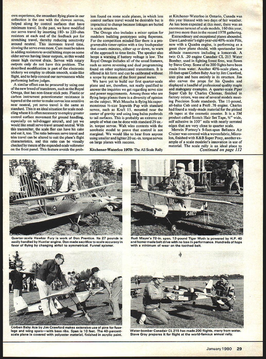 RC EQUIPMENT Scale not-todistant past scale modelers wanted interior detailing faced problem servo location space large servos ordinarily mounted near center gravity interfered cabin cockpit detail because also location passengers Four five cumbersome heavy servos hidden view often meant removing center-of-gravity locations convenient KITCHENER-WATERLOO RALLY motor slower smaller servos use diminutive low inertia motors help decrease transit times say fast servos disrupt scale realism because mirror twitchy thumbs something positive said old servos slow unlikely unscale-like twitch occur flight nervous thumb stick really need high-speed servos modern RC outfits scale models 28 Model Aviation Innovati roach twin engines single-engine airplane pair X45 Supertigres driving prop shaft through beltsengineered Rudi Mayer pix taken Kitchener-Waterloo point usually rearward contributed tail-heavy condition respect minia tore servos solve alotofproblems can hidden under seats beneath floor Tiny integrated circuit servos use full 48 volts across motors minus small voltage drop through output transistors makes very quick response old discreet component servos 24 volts I-irs OT trw otars ulun i-OKKar UV Iii pianes TO TiY W85 Dy DOD ijUflfl Iwo appeared K-W meet eight follow eiianca Air urueser displayed hener lterioo built Merwin Fortney has 9-foot wing span Lnarles Inamua CflDS6 rruii Super pound 1A-scala model finisheu Dulyrale Dupe ova Fiberglass cowl made up internal mold p UJOUL S S,UVV,U,U LU L,flUC IJL*tICIO UlLflLfl Hughes Spruce Goose will weigh 40 pounds Span feet Should prove flight succcessful original own experience smoothest flying plane collection slowest servos helped along control surfaces have minimum travel past have modified servo travel inserting 180- 220-ohm resistors end feedback pot stretching travel thereby reducing sensitivity around neutral increases travel time slowing servo Care must taken adding resistors avoid hitting stops some older servos having linear outputs would cause high current drain Servos rotary outputs have problem described modification part electronic trickery employ obtain smooth scale-like flight help conceal nervousness performing before judges similar effect can procured using new breed transistors such Royal Omega has non-linear stick pots Plastic carbon instrument potentiometer resistance tapered center make servos less sensitive near neutral yet servo travel same standard ideal situation scale mod eling often necessary employ greater control surface movement ground handling especially tail-dragger aircraft yet would like small servo travel around neutral transmitter scale flier can have cake eat too ratio between servo travel trim travel can altered suit planes flight characteristics ratio can visually checked means expanded-scale voltmeter front panel feature avoids prob lem found some scale planes less control surface travel would desirable impractical change because linkages buried scale structure Omega also includes mixer option modelers building prototypes using flaperons competition minded flier pro grammable timer option tiny loudspeaker counts minutes either up down warn approach time limits speaker also beeps warning battery voltage low Royal Omega includes usual features such servo reversing dual programming found other sophisticated transmitters offered kit form can calibrated scope means front panel meter have yet build first quarter-scale plane therefore really qualified answer inquiries get regarding servo size power requirements Among flying large planes diversity opinion subject Walt Moucha flying supermonstrous i-size Sopwith Pup standard servos such Kraft 15 mounted near center gravity using long balsa pushrods tail surfaces probably extreme ex ample what can done standard 29 oz torque servos Walt wins contests acrobatic model prove control marginal would like hear anyone using smaller lighter 20 oz-in torque servos large planes success Kitchener-Waterloo 1979 Scale Rally Kitchener-Waterloo Ontario Canada year blessed two days fair weather As has expected meet enormous turnout scale models 160 year just two record 1978 gathering Extraordinary exceptional planes abounded Dave Landvaters eight-year-old 40%-scale Pitts now Quadra engine performing great show plane should spectacular low altitude maneuvers including lomcevak twin OS 20 engine Canadair CL 215 Water Bomber used fighting forest fires flown Steve Gray Some its 200 flights have made water Another 40%-scale plane 10-foot-span Corben Baby Ace Jim Crawford uses pine bass entirely its structure Jim also carves props Quadra displayed handful professional quality maple mahogany examples quarter-scale Piper Super Cub Charles Chomas finished factory colors several models meet ing Precision Scale standards 11-pound all-balsa Cub used Profi 76 engine Charles found ready-made material pinked rib tapes cosmetic counter 3M product called Scotch Hair Set Tape self adhesive 350 rolls nearly serrated edges very close quarter scale Merwin Fortneys 9-foot-span Bellanca Air Cruiser covered woven fabric Micro Ion finished K&B Super Poxy another ex ample scale modelers innovation use material scale rally ideal place Continued page 112 4 January1980 29 Quarter-scale Hawker Fury work L Prentice Its 27 pounds easily handled Hustler engine Don made sacrifice scale accuracy favor flying changing airfoil symmetrical Funnel spinner Rudi Mayers 72-in span 12-pound Tiger Moth powered HP 40 home-made belt drive no loss performance Hundreds hops minimum wear toothed belt 5.. .an, La uarc UALUlIlVU USU U pit. Tur 1U3U lage wing sparswith bass ribs Span 10 feet 40-percentscale plane covered polyester material finished acrylic paint Steve Gray prp. flight F@RICAT@R n $39 Includes Asst Pack ABS SHIPPED PREPAID VVIA UPS US ONLY dealer order direct mEEk Vacuum former plastics Easy make own cowls wheel pants canopies etc works home oven hose type vacuum cieaner Instructions assembly & use included MOLD YOUR OW