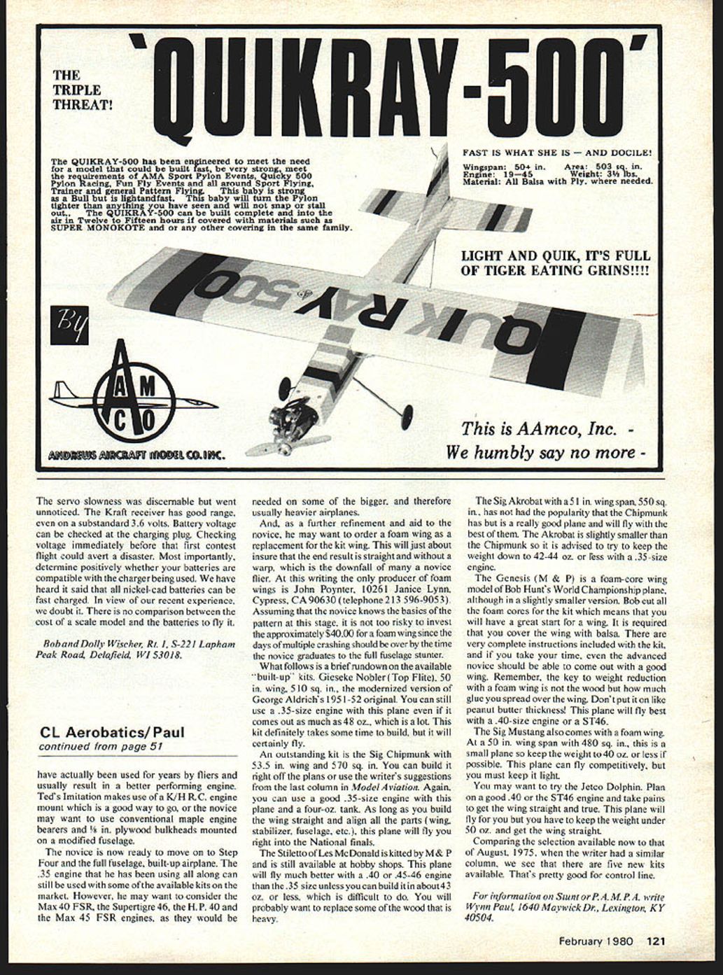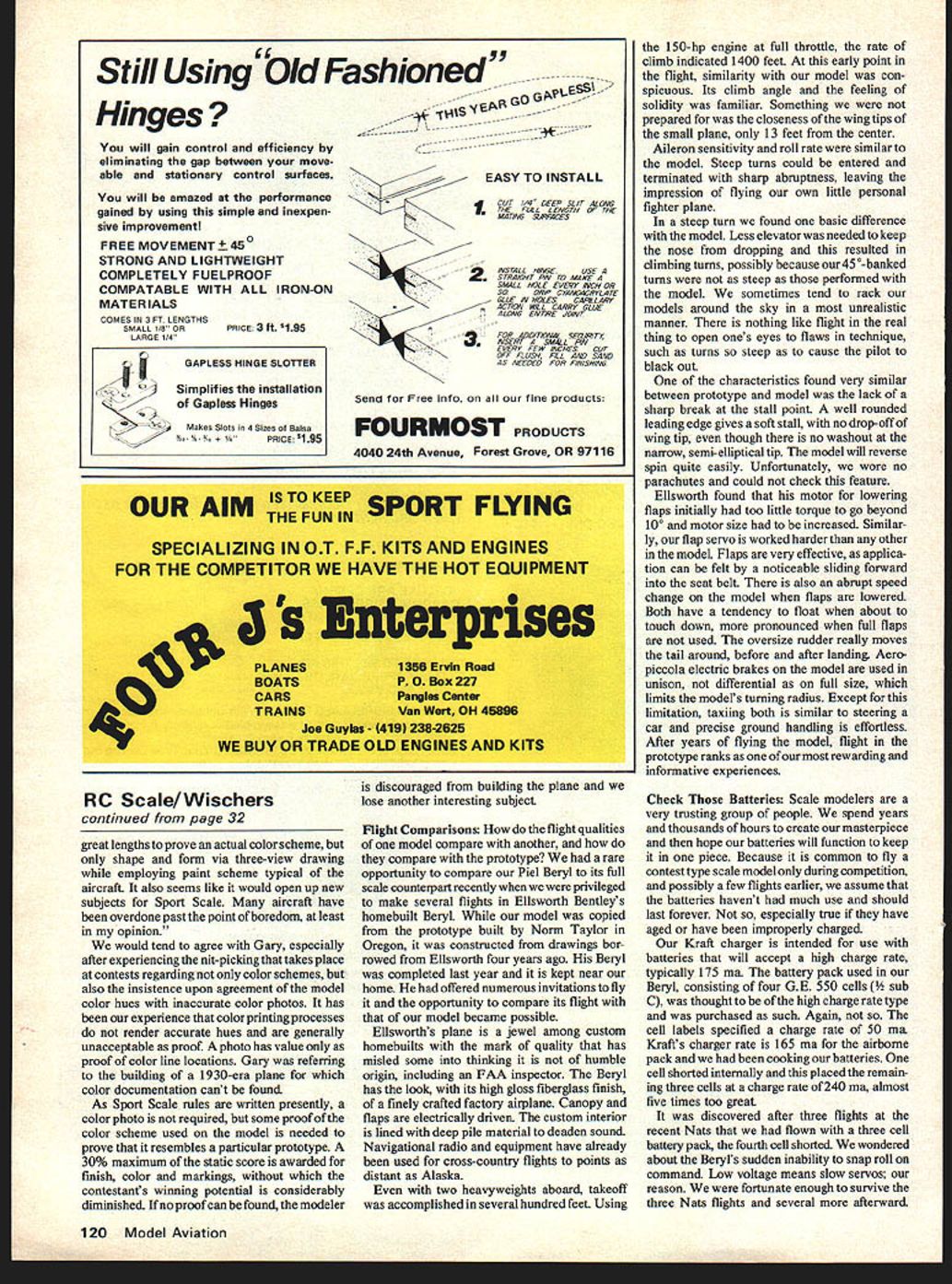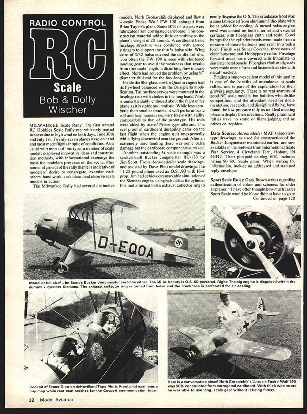 MILWAUKEE Scale Rally first annual RC Hobbies Scale Rally met partial success due high wind both days June 30th July 1st Twenty-seven planes hand made flights spite conditions As usual meets type number scale models displayed innovative ideas construc tion methods informational exchange basis modelers presence scene Phe nomenal growth rally theme indicative modelers desire congregate examine others handiwork seek ideas observe scale models action Milwaukee Rally several distinctive models Norb Grobarchik displayed flew -scale Focke WuIf FW 190 enlarged Brian Taylors plans Some 50% its parts fabricated corrugated cardboard con struction material added little nothing planes weight 20 pounds cardboard basic fuselage structure combined spruce stringers support thin a skin Wing skins 3/32 balsa covered cardboard ribs Too often FW 190 seen shortened landing gear avoid weakness results true scale length disturbing flaw scale effect Norb solved problem using eter drill rod foot-long legs Inside fiberglass cowl Quadra engine its flywheel balanced Brisighella modi fication Tail surface servos mounted fuselage rear chokes long leads Norb understandably enthused about flight plane stable realistic less aero batic smaller models will perform basic roll loop maneuvers very likely agility comparable prototype rolls aided use Friese-type ailerons real proof cardboard durability came last flight engine quit unexpectedly flying downwind near ground After extremely hard landing some balsa damage cardboard components survived Another outstanding -scale example scratch-built Bucker Jungmeister BU-133 Jim Scott Aeromodeller scale drawings assisted Dave Platt model drawings 1125-pound plane used OS 90 16-4 prop Jim achieved remarkable simulation Siemens engine using balsa discs cylinder fins turned balsa exhaust collector ring neatly disguise OS crankcase front cone fabricated aluminum litho-plate holes added cooling tumed balsa engine cowl coated both intemal external surfaces fiberglass cloth resin Cowl bumps cylinder heads made mixture micro-balloons resin balsa form Finish Super Coverite three coats clear butyrate Hobbypoxy color Fuselage forward areas covered lithoplate simulate metal panels Fiberglass cloth mudguards made over form fastened axles metal brackets Finding super-excellent model quality benefits attendance scale rallies part explanation growing popularity no real scarcity good RC scale models builders dislike competition attendant need docu mentation research disciplined flying have found low pressure rally ideal meeting place display creations Really prominent rallies have no static flight judging no prizes trophies Data Source 4eromodeller MAP three-viewtype drawings used construction Bucker Jungmeister mentioned earlier now available midwest International Scale Plan Service 4 Cleveland Tern Hobart IN 46342 postpaid catalog 60e includes listing 80 RC Scale plans writing information include addressed stamped reply envelope Sport Scale Rules Gary Brown writes regarding authentication colors schemes older airplanes have often thought much easier Sport Scale would did have go Continued page 120 32 Model Aviation Model orruII-sIze Jim CUIL b ockerJungmeistercould either The6Sin beauty 0S60 powered Right bigengineis disguisedwithinthe dummy 7-cylinder Siemens exhaust collector ring turned balsa crankcase perforated air cooling Cockpit OT varus-uIetrIui Front pilot examines tiny map rear man reaches iosport communication tube conversation piece Norb Grobarchiks scale Focke- WuIf 190 50% constructed corrugated cardboard thick wire struts able use long scale gear being flimsy Still Using bid Fashioned Hinges will gain control efficiency eliminating gap between moveable stationary control surfaces will amazed performance gained using simple inexpen sive improvement FREE MOVEMENT 4502 STRONG AND LIGHTWEIGHT COMPLETELY FUELPROOF COMPATABLE WITH ALL IRON-ON MATERIALS COMES IN 3 FT LENGTHS SMALL 15 ORPRiCE 3 ft S195 LARGE 14 1~s~GOG EASYTO INSTALL 5ISTALL HR/GE USE IGHT P/Al 102 MAKE SMALL HOLE EVERY INCH OR $02OR/P CTAA1OACRYLATE GLIE I/il HOLESCAPillARY AC7LW SILL CANNY GLUE - ALONG ENOIE JO/NT FOR AOO/T/ONAL SELUR/Tt INSERT SMALL P/Al EVERY FEW /NCHES CUT OFF FLUSH F/LL AND SAND AS SEEDED FOR F/N/SH/NG Send Free info fine products FOURMOST PRODUCTS 4040 24th Avenue Forest Grove OR 97116 OUR AIM THE FUN IN SPORT FLYING SPECIALIZING IN OT FF KITS AND ENGINES FOR THE COMPETITOR WE HAVE THE HOT EQUIPMENT 0 5 Enterprises 4 RC Scale Wischers continued page 32 great lengths prove actual color scheme shape form via three-view drawing employing paint scheme typical aircraft also seems like would open up new subjects Sport Scale aircraft have overdone past point boredom least opinion would tend agree Gary especially after experiencing nit-picking takes place contests regarding color schemes also insistence upon agreement model color hues inaccurate color photos has experience color printing processes render accurate hues generally unacceptable proof photo has value proof color line locations Gary referring building 1930-era plane color documentation cant found As Sport Scale rules written presently color photo required some proof color scheme used model needed prove resembles particular prototype 30% maximum static score awarded finish color markings contestants winning potential considerably diminished Ifno proof can found modeler discouraged building plane lose another interesting subject Flight Comparison flight qualities model compare another compare prototype rare opportunity compare Piel Beryl its full scale counterpart recentiy privileged make several flights Ellsworth Bentleys homebuilt Beryl model copied prototype built Norm Taylor Oregon constructed drawings bor rowed Ellsworth four years ago Beryl completed last year kept near home offered numerous invitations fly opportunity compare its flight model became possible Ellsworths plane jewel among custom homebuilts mark quality has misled some thinking 