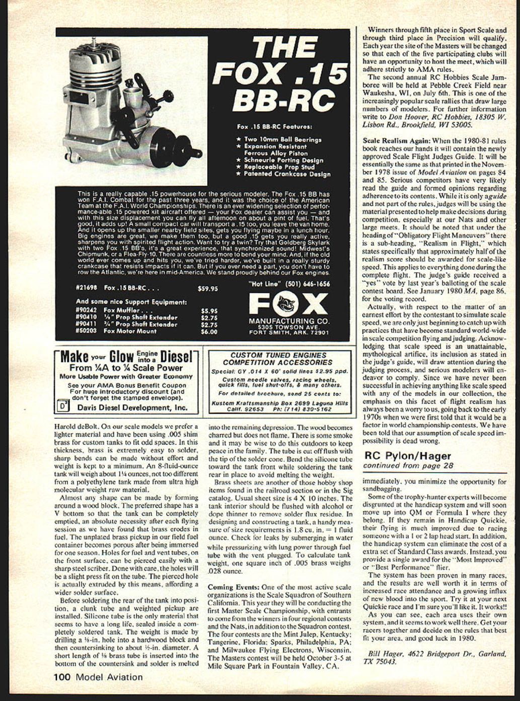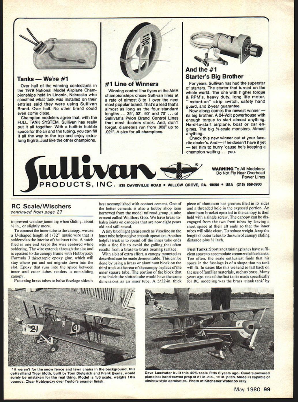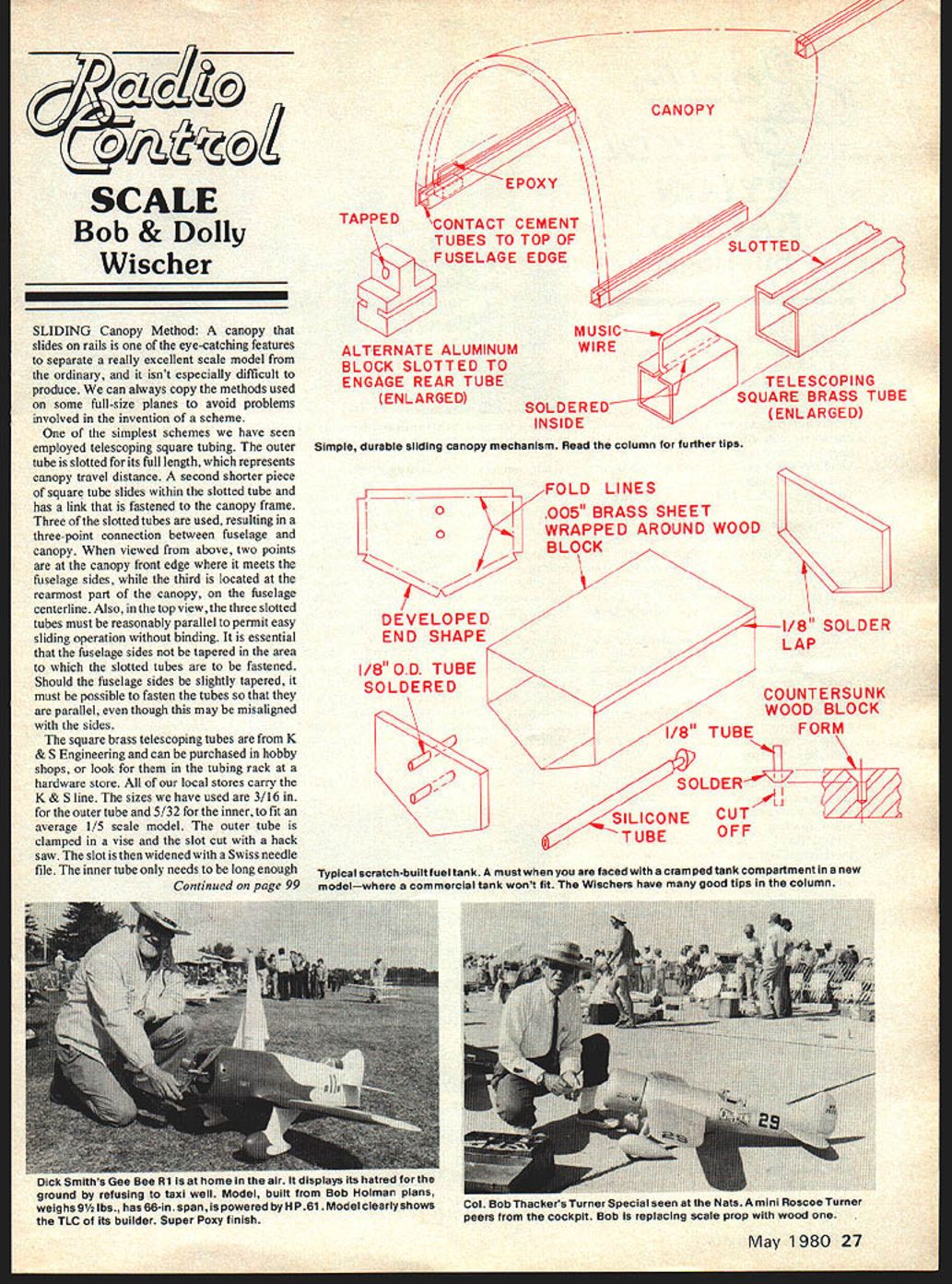 SCALE Bob & Dolly Wischer SLIDING Canopy Method canopy slides rails eye-catching features separate really excellent scale model ordinary isnt especially difficult produce can always copy methods used some full-size planes avoid problems involved invention scheme simplest schemes have seen employed telescoping square tubing outer tube slotted its full length represents canopy travel distance second shorter piece square tube slides within slotted tube has link fastened canopy frame Three slotted tubes used resulting three-point connection between fuselage canopy viewed above two points canopy front edge meets fuselage sides third located rearmost part canopy fuselage centerline Also top view three slotted tubes must reasonably parallel permit easy sliding operation binding essential fuselage sides tapered area slotted tubes fastened Should fuselage sides slightly tapered must possible fasten tubes parallel though may misaligned sides square brass telescoping tubes K & S Engineering can purchased hobby shops look tubing rack hardware store local stores carry K & S line sizes have used 3/16 outer tube 5/32 inner fit average 1/5 scale model outer tube clamped vise slot cut hack saw slot widened Swiss needle file inner tube needs long enough Continued page 99 CANOPY K - EPOXY CONTACT CEMENT TUBES TO TOP OFSLOTTED TAPPED FUSELAGE EDGE ALTERNATE ALUMINUM BLOCK SLOTTED ro ENGAGE REAR TUBE ENLARGED MUSIC WIRE - TELESCOPING SQUARE BRASS TUBE SOLDEREDENLARGED INSIDE Simple durable sliding canopy mechanism Read column further tips ___ _____-FOLD LINES o005 BRASS SHEET oWRAPPED AROUND WOOD BLOCK DEVELOPED1/8 SOLDER COUNTERSUNK WOOD BLOCK 1/8 TUBEFORM SOLDER SILICONE CUT TUBEOFF I/8OD TUBE SOLDERED May 1980 27 Typical scratch-built fuel tank must faced cramped tank compartment new modelwhere commercial tank wont fit Wischers have good tips column Dick Smiths Gee Bee Ri home air displays ItS natreo ror ground refusing taxi well Model built Bob Holman plans weighs gii2 lbs has 66-in span powered H P61 l clearly shows TLC its builder Super Poxy finish LOI OD IflacKers lurner Special seen Nats mini Roscoe Turner peers cockpit Bob replacing scale prop wood N Tanks ver half winning contestants 1979 National Model Airplane Cham pionships held Lincoln Nebraska specified what tank installed entries said using Sullivan Brand Over half No other brand could come close Champion modelers agree FULL TANK SYSTEM Sullivan has really put together built-in bubble space air tubing can fill way top enjoy extralong flights Just like other champions #1 Line o winners Winning control line flyers AMA championships chose Sullivan lines rate almost 3 1 over next popular brand Thats lead thats almost long four standard lengths . 35 52 60 70 . Sullivans Pylon Brand Control Lines dealers stock dont forget diameters run 008 up 021 size champions #1 Starters Big Brother years Sullivan has superstar starters starter turned whole world higher torque & RPMs heavy duty long life motor instant-on strip switch safety hand guard 2-year guarantee Now along comes newest winner its big brother 24-Volt powerhouse enough torque start almost anything Hard-to-start airplane boat car en gines big -scale monsters Almost anything Check new winner out favo rite dealers nt have yet tell him hurry cause hes keeping champion waiting . WARNING Modelers Fly Near Overhead Power Lines P R 0 D U C T S N C 535 DAVISVILLE ROAO OW GROVE PA 19090 215 650-3900 RC Scale/Wischers continued page 27 prevent window jamming sliding about slightly connectthe inner tube canopywe use U-shaped length 1/32 music wire soldered interior inner tube notch filed end keeps wire centered soldering wire extends through slot epoxied canopy frame Hobbypoxy Formula 3 thixotropic epoxy glue will stay put migrate down slot Epoxy runs space between inner outer tubes renders non-sliding canopy Fastening brass tubes balsa fuselage sides best accomplished contact cement better cements also hobby shop item borrowed model railroad group tube cement called Waithers Goo have brass-tobalsa joints canopies now eight years old still sound tiny bit light grease such Vaseline inner tube helps give smooth operation Another helpful trick round off inner tube ends fine file avoid galling often results brass-to-brass bearing surface bit extra effort canopy mounted described can made demountable can done using brass aluminum block third track rear canopy place inner square tube portion block runs inside slotted tube would have same dimensions inner tube 5/32-in thick piece aluminum has grooves filed its sides threaded hole exposed portion An aluminum bracket epoxied canopy held single screw canopy can dis engaged two front tubes leaving short space aft ends inner tubes will slide clear reduce weight keep length outer tubes sum canopy sliding distance plus /2 inch Fuel Tanks Sport training planes have suffi cient space accomodate commercial fuel tanks Too often scale enthusiast finds space fuselage shape no tank will fit cases like tend fall back use familiar materialssuch brass years ago first tanks made specifically RC modeling brass clank tank May 1980 99 werent snow fence lawn chairs background deHavilland Tiger Moth built Tom Dieterich Frank Evans would surely mistaken real thing Model 1/6 scale weighs 10 pounds Clear Hobbypoxy over Testors enamel finish Dave Landvater built 40%-scale Pitts 8 years ago Quadra-powered plane has hand-carved prop 21 dia 12 pitch Model capable airshow-style aerobatics Photo Kitchener-waterloo rally Harold deBolt scale models prefer lighter material have using 005 shim brass custom tanks fit odd spaces thickness brass extremely easy solder sharp bends can made effort weight kept minimum An 8-fluid-ounce tank will weigh about 1 ounces too different polyethylene tank made ultra high molecular weight raw material Almost shape can made forming around wood block preferred shape has V bottom tank can completely emptied absolute necessity after flying session have found brass ero
