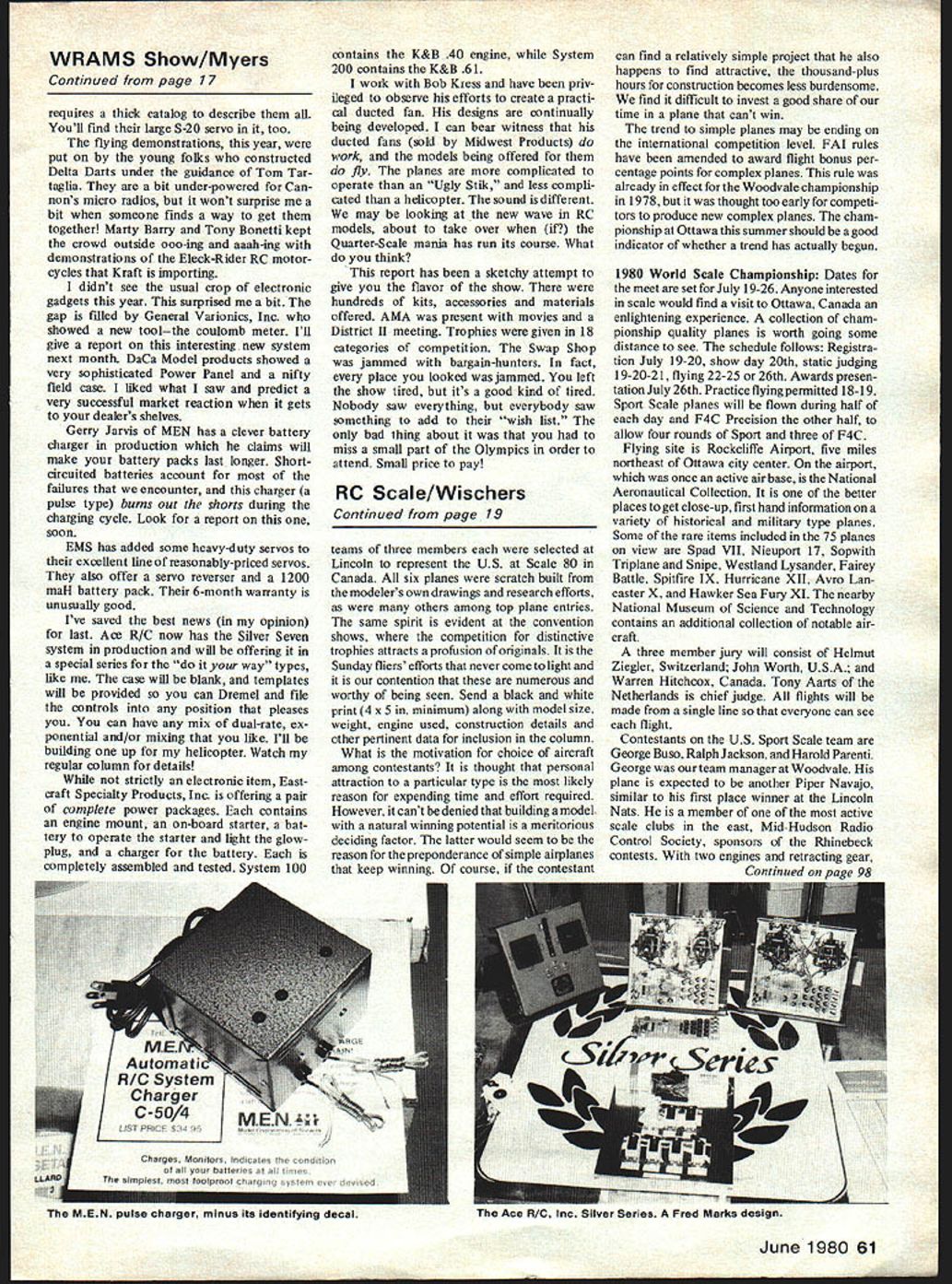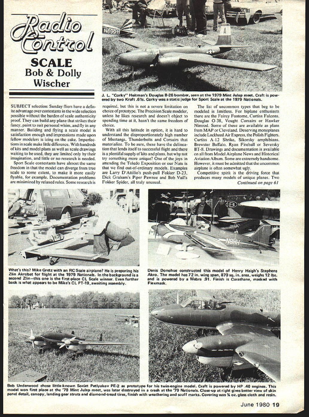 SCALE Bob & Dolly Wischer SUBJECT selection Sunday fliers have defin ite advantage over contestants wide selection possible burden scale authenticity proof can build plane strikes fancy paint suit personal whim fly manner Building flying scale model satisfaction enough impressions made upon fellow modelers icing cake Imperfec tions scale make little difference hundreds kits model plans well scale drawings waiting used limited imagination little no research needed Sport Scale contestants have almost same freedom model can diverge true scale some extent make easily flyable example Documentation problems minimized relaxed rules Some research required severe limitation choice prototype Precision Scale modeler unless likes research doesnt object spending time hasnt same freedom choice latitude option hard understand disproportionately high number Mustangs Thunderbolts Corsairs materialize sure have delinea tion lends itself successful flight plentiful supply kits plans try something unique joys attending Toledo Exposition Nats find out-of-ordinary models Examples Larry DAttilios push-pull Fokker D-23 Dick Grahams Piper Pawnee Bob Vails Fokker Spider truly unusual list uncommon types beg modeled limitless biplane enthusiasts Fairey Fantome Curtiss Falcons Douglas 0-38 Vought Corsairs Hawker Nimrod Some available plans MAP Cleveland Deserving monoplanes include Lockheed Air Express Polish Fighters Curtiss A-12 Shrike Sikorsky amphibians Brewster Buffalo Ryan Fireball Seversky BT-8 Drawings documentation available Model Airplane News Historical Aviation Album Some extremely handsome However must admitted uncommon airplane often somewhat ugly Competitive spirit driving force produces models unique planes Two Continued page 61 June 1980 19 J 1 Corky Heitmans Douglas B-26 bomber seen 1979 Mint Julep meet Craft pow ered two Kraft 61s Corky static judge Sport Scale 1979 Nationals Whats Mike Gretz RC Scale airplane preparing Denis Donohue constructed model Henry Haighs Stephens Zlin Akrobat flight 1979 Nationals background isa Akro model has 72 wing span 870 sq area weighs 12 lbs second Zlinthis first-place CL Scale winner further powered Webra 91 Finish Curathane masked back what appears Mikes CL PT-19 awaiting assembly Flexmask Bob Underwood chose little-known Soviet Petlyakov PE-2 prototype twinengine model Craft powered HP 40 engines model won first place 79 Mint Julep meet later destroyed crash 79 Nationals Close-up right gives better view skin panel detail canopy landing gear struts diamond-tread tires finish weathering scuff marks Covering % oz glass cloth resin WRAMS Show/Myers Continued page 17 requires thick catalog describe Youll find large S-20 servo too flying demonstrations year put young folks constructed Delta Darts under guidance Tom Tar taglia bit under-powered Can nons micro radios wont surprise bit someone finds way get together Marty Barry Tony Bonetti kept crowd outside ooo-ing aaab-ing demonstrations Eleck-Rider RC motor cycles Kraft importing didnt see usual crop electronic gadgets year surprised bit gap tilled General Varionics Inc showed new toolthe coulomb meter Ill give report interesting new system next month DaCa Model products showed very sophisticated Power Panel nifty field case liked what saw predict very successful market reaction gets dealers shelves Gerry Jarvis MEN has clever battery charger production claims will make battery packs last longer Shortcircuited batteries account failures encounter charger pulse type burns out shorts during charging cycle Look report soon EMS has added some heavy-duty servos excellent line reasonably-priced servos also offer servo reverser 1200 maH battery pack 6-month warranty unusually good Ive saved best news opinion last Ace R/C now has Silver Seven system production will offering special series way types like case wlll blank templates will provided can Dremel tile controls position pleases can have mix dual-rate ex ponential and/or mixing like Ill bullding up helicopter Watch regular column details strictly electronic item Eastcraft Specialty Products Inc offering pair complete power packages contains engine mount on-board starter bat tery operate starter light glowplug charger battery completely assembled tested System 100 contains K&B 40 engine System 200 contains K&B 61 work Bob Kress have priv ileged observe efforts create practi cal ducted fan designs continually being developed can bear witness ducted fans sold Midwest Products work models being offered fly planes complicated operate Ugly Stik less compli cated helicopter sound different may looking new wave RC models about take over Quarter-Scale mania has run its course What think report has sketchy attempt give tiavor show hundreds kits accessories materials offered AMA present movies District II meeting Trophies given 18 categories competition Swap Shop jammed bargain-hunters fact place looked jammed left show tired its good kind tired Nobody saw everything everybody saw something add wish list bad thing about miss small part Olympics order attend Small price pay RC Scale/Wischers Continued page 19 teams three members selected Lincoln represent US Scale 80 Canada six planes scratch built modelers own drawings research efforts others among top plane entries same spirit evident convention shows competition distinctive trophies attracts profusion originals Sunday fliers efforts never come light contention numerous worthy being seen Send black white print 4 x 5 minimum along model size weight engine used construction details other pertinent data inclusion column What motivation choice aircraft among contestants thought personal attraction particular type likely reason expending time effort required However cant denied building model natural winning potential meritorious deciding factor latter would seem reason preponderance simple airplanes keep winning course contestant can find relatively simple project also happens find attractive thousand-plus hours construction become