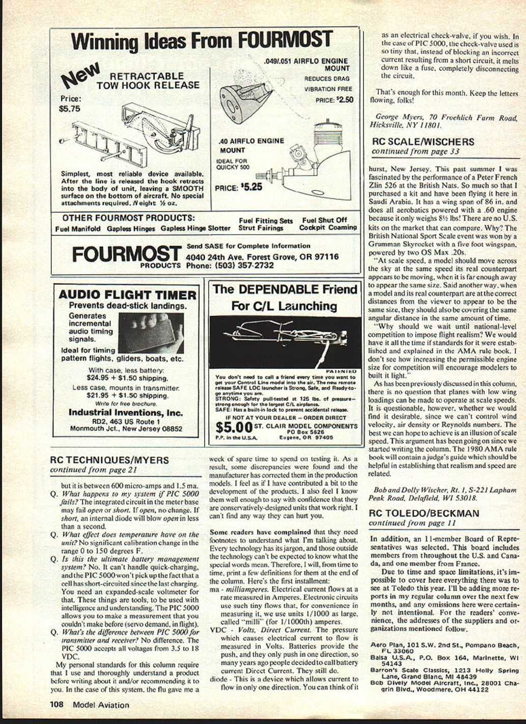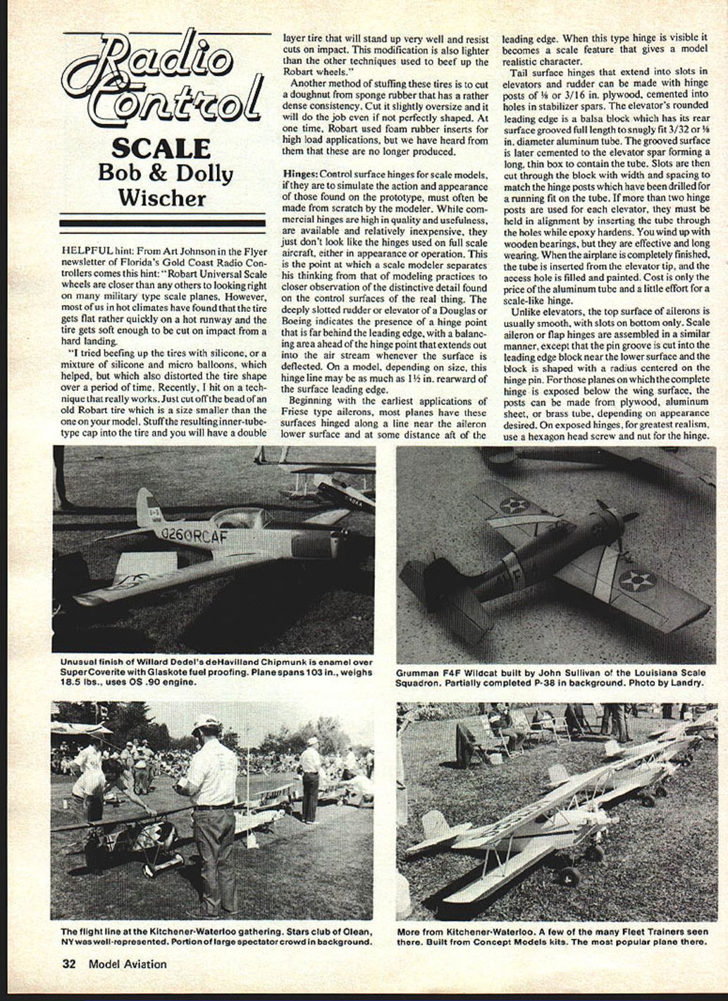 C SCALE Bob & Dolly Wischer HELPFUL hint Art Johnson Flyer newsletter Floridas Gold Coast Radio Con trollers comes hint Robart Universal Scale wheels closer others looking right military type scale planes However us hot climates have found tire gets flat rather quickly hot runway tire gets soft enough cut impact hard landing tried beefing up tires silicone mixture silicone micro balloons helped also distorted tire shape over period time Recently hit tech nique really works Just cut off bead old Robart tire size smaller model Stuff resulting inner-tubetype cap tire will have double layer tire will stand up very well resist cuts impact modification also lighter other techniques used beef up Robart wheels Another method stuffing tires cut doughnut sponge rubber has rather dense consistency Cut slightly oversize will job perfectly shaped time Robart used foam rubber inserts high load applications have heard no longer produced Hinges Control surface hinges scale models simulate action appearance found prototype must often made scratch modeler com mercial hinges high quality usefulness available relatively inexpensive just dont look like hinges used full scale aircraft either appearance operation point scale modeler separates thinking modeling practices closer observation distinctive detail found control surfaces real thing deeply slotted rudder elevator Douglas Boeing indicates presence hinge point far behind leading edge balanc ing area ahead hinge point extends Out air stream whenever surface deflected model depending size hinge line may much 1 rearward surface leading edge Beginning earliest applications Friese type ailerons planes have surfaces hinged along line near aileron lower surface some distance aft leading edge type hinge visible becomes scale feature gives model realistic character Tail surface hinges extend slots elevators rudder can made hinge posts plywood cemented holes stabilizer spars elevators rounded leading edge balsa block has its rear surface grooved full length snugly fit 3/32 diameter aluminum tube grooved surface later cemented elevator spar forming long thin box contain tube Slots cut through block width spacing match hinge posts have drilled running fit tube two hinge posts used elevator must held alignment inserting tube through holes epoxy hardens wind up wooden bearings effective long wearing airplane completely finished tube inserted elevator tip access hole filled painted Cost price aluminum tube little effort scale-like hinge Unlike elevators top surface ailerons usually smooth slots bottom Scale aileron flap hinges assembled similar manner except pin groove cut leading edge block near lower surface block shaped radius centered hinge pin planes complete hinge exposed below wing surface posts can made plywood aluminum sheet brass tube depending appearance desired exposed hinges greatest realism use hexagon head screw nut hinge 32 Model Aviation Unusual finish Willard Dedels deHavilland Chipmunk enamel over Super Coverite Glaskote fuel proofing Plane spans 103 weighs 185 lbs uses OS 90 engine Grumman F4F Wildcat built John Sullivan Louisiana Scale Squadron Partially completed P-38 background Photo Landry flight line Kitchener-Waterloo gathering Stars club Olean NYwaswell-represented Portion large spectatorcrowd background Kitchener-Waterloo few Fleet Trainers seen Built Concept Models kits popular plane Tiny scale screws available hobby shops Sig catalog Accurately locating hinge lines model also has considerable effect flight characteristics Friese type ailerons intended prevent adverse yaw turn inducing drag raised aileron because its nose dips below wing lower surface balances drag lowered aileron Air flowing through slot lower upper surface makes raised aileron effective Without feature tendency plane banked direction swing its tail same direction opposite what desired get smoothly coordinated turn rudder must used excessively prevent adverse tail swing Friese type ailerons need rudder coordination aileron minimized Flight model becomes realistic requires less effort transmitter Sopwith 1 /2 Strutter needs use rudder coordination ailerons smooth scale-like turns uses standard model hinges top aileron surface Several years ago during visit Paris Air Museum able inspect full scale plane surprised see its ailerons hinged bottom surface gap top veteran pilot has flown early types informed us ailerons lose effectiveness arrangement Obviously times better make scale errors favor better flying often wonder what control changes would occur model converted non-scale Friese type ailerons Flight realism again March 80 column asked opinions subject flight realism pertains contest activity received number answers some tirades against rules rule makers officials judges latter answers must taken proverbial grain salt coming persons dont recognize friends workers contests spend time energy money contestants can play Make no mistake fly contests participat ing personal enjoyment otherwise known playtime hard working organizers officials judges must considered serious modeler respected friends Except winners almost contestants tend lay blame low scores everyone themselves speak personal experi ence respect having times received what considered unjustly low marks pays resilient Rather complain attempt change rules build models adapt flying techniques conform existing rules disagreeable philosophy seems have worked letter came Dale Johnston has opportunity observe trends scale flying outside US Realism takes important role everywhere Read am pleased about article flight realism March MA am writing before finish magazine have minimal success trying convince fellow scale modelers home area Virginia what scale speed should Most agree should slower pattern flying almost agree should reduced same scale model modelers full scale pilots As point out article truly scale speed very difficult achieve maintain should scale modelers objective During relatively short time hobby have obser