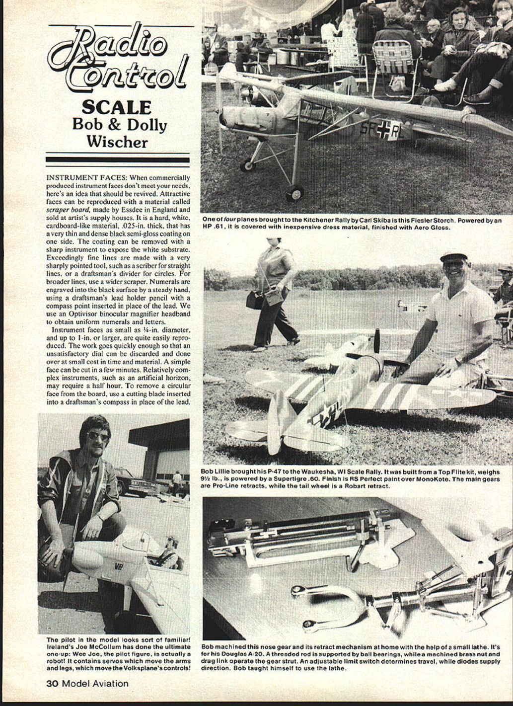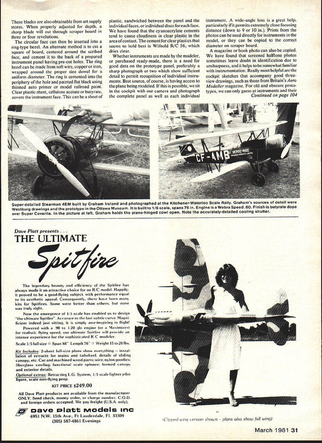 SCALE Bob & Dolly Wischer INSTRUMENT FACES commercially produced instrument faces dont meet needs heres idea should revived Attractive faces can reproduced material called scraper board made Essdee England sold artists supply houses hard white cardboard-like material 025-in thick has very thin dense black semi-gloss coating side coating can removed sharp instrument expose white substrate Exceedingly fine lines made very sharply pointed tool such scriber straight lines draftsmans divider circles broader lines use wider scraper Numerals engraved black surface steady hand using draftsmans lead holder pencil compass point inserted place lead use Optivisor binocular magnifier headband obtain uniform numerals letters Instrument faces small -in diameter up 1-in larger quite easily repro duced work goes quickly enough unsatisfactory dial can discarded done over small cost time material simple face can cut few minutes Relatively com plex instruments such artificial horizon may require half hour remove circular face board use cutting blade inserted draftsmans compass place lead 30 Model Aviation une orrourplanes broughttothe Kitchener Rally Carl Skiba isthis FieslerStorch Powered HP 61 covered inexpensive dress material finished Aero Gloss Bob Lillie brought P-47 Waukesha WI Scale Rally built Top Flite kit weighs 91/2 lb powered Supertigre 60 Finish RS Perfect paint over MonoKote main gears Pro-Line retracts tail wheel Robart retract inc paiox inc moaei lOOKS sort familiar Irelands Joe McCollum has done ultimate oo macfined nose gear its retract mechanism home help small lathe Its one-up Wee Joe pilot figure actually Douglas A-20 Athreaded rod supported ball bearings machined brass nut robot contains servos move arms drag link operate gear strut An adjustable limit switch determines travel diodes supply legs movetheVolksplanescontrols direction Bob taught himself use lathe blades also obtainable art supply stores properly adjusted depth sharp blade will cut through scraper board three four revolutions circular face can inserted ring-type bezel An alternate method cut square board centered around scribed face cement back prepared instrument panel having pre-cut holes ring bezel can made soft wire copper iron wrapped around proper size dowel uniform diameter ring cemented periphery hole painted flat black using thinned auto primer model railroad paint Clear plastic sheet cellulose acetate butyrate covers instrument face can sheet plastic sandwiched between panel individual faces individual discs face have found cyanoacrylate cements tend cause cloudiness clear plastic area contact cement clear plastics seems hold best Wilhold RIG 56 dries clear Whether instruments made modeler purchased ready-made need good data prototype panel preferably sharp photograph two show sufficient detail permit recognition individual instru ments Best source course having access plane being modeled possible sit cockpit camera photograph complete panel well individual instrument wide-angle lens great help particularly permits extremely close focusing distance down 9 10 Prints photos can used directly instruments model can copied correct diameter scraper board magazine book photo can also copied have found screened halftone photos sometimes leave doubt identification due unsharpness helps somewhat familiar instrumentation Really helpful cockpit sketches accompany good threeview drawings such Britains Aero Modeller magazine old obscure proto types can guess instruments Continued page 104 Super-detailed Stearman 4EM built Graham Ireland photographed Kltchener-WaIerIOO Scale Rally Grahams sources detail Westburg drawings prototype Ottawa Museum bulltto 1/6 scale spans 76 Engine Webra Speed 60 Finish butyrate dope over Super Coverite picture left Graham holds piano-hinged cowl open Note accurately-detailed cooling shutter Dave Platt presents. THE ULTIMAT E legendary beauty efficiency Spitfire has always made attractive choice RiC model Happily proved good-flying subiect performance equal its aesthetic appeal Consequently have kits Spitfires Some better others truly right Now emergence 1/5 scale has enabled us design ultimate Spitfire Accurate last subtle curve Magni ficient indeed just sitting simply awe-inspiring flight Powered 90 120 glo engine Maximizer realistic flying speed ultimate Spitfire will provide intense experience sophisticated H C modeler Scale 1/5 full size 0 Span 88 Length 76 ht l5io2Olbs Kit Includes 2-sheet full-size plans show everything . instal lation retracts mains tailwheel details sliding canopy etc Cut machined wood parts wire nylon goodies fiberglass cowling functional scale spinner formed canopy exterior details Optional exfras Retracting LG System 1 5 scale fighter pilot figure scale non-flying prop KIT PRICE s249OO Dave Plaft products available manufacturer ONLY Send check money order charge number COD foreign orders accepted pay freight USA nave Dlatt ivuodels inc 6951 NW 15th Aye Ft Lauderdale FL 33309 305 587-4861 Evenings March 1981 31 Clpped-uin Lersion shown -- plans also show full wing /', eJ IsLe IZS[S] KIORITZ Deep Fins Optimum Cooling 21/4 Flywheel Small Magneto 1 5/8in Six Bolt Aluminum Hub Endorsed Don Godfrey Phone 607 722-1765 Pre-Drilled Props Available Ask About Custom Built KIORITZ Engines trim lever high speed position pushed forward moving throttle lever forward back twice advance film cycle accom plished shutter release cycle accomplished moving trim lever down back up allows servo travel Position #1 Position #3 causing rocker arm trip shutter After little practice no film camera finally got wind release cycles down pat main thing remember after release shutter must return trim lever hack its original position Otherwise tt locks out film advance Having mastered little exercise took glider back Malibu slope Within 15minute period blessing nice lift took 24 fantastic pictures ENGINES BY GIBBS HOBBY & RESEARCH Original Developer Factory Trained Authorized Master Service Dealer SPEC