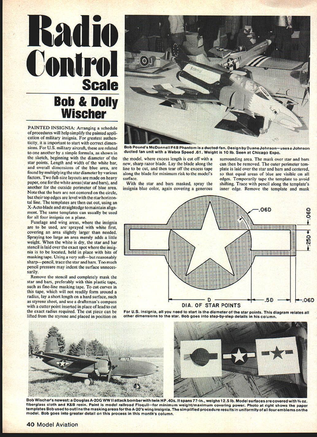 Cenirol Scale Bob & Dolly Wischer PAINTED INSIGNIA Arranging schedule procedures will help simplify painted appli cation military insignia greatest authen ticity important start correct dimen sions US military aircraft related another simple formula shown sketch beginning diameter star points Length width white bar overall dimensions blue area found multiplying star diameter various factors Two full-size layouts made heavy paper forthe white areasstar bars another outside perimeter blue area Note bars centered circle top edges level star horizon tal line templates cut out using X-Acto blade straightedge maintain align ment same templates can usually used four insignia plane Fuselage wing areas insignia used sprayed white first covering area slightly larger needed Spraying too large area merely adds little weight white dry star bar stencil laid over exact spot insig nia located held place bits masking tape Using very softbut reasonably sharppencil trace star bars Too much pencil pressure may indent surface unneces sarily Remove stencil completely mask star bars preferably thin plastic tape such tine-line masking tape cut curves tape will readily form around radius lay short length hard surface such styrene sheet use draftsmans compass cutter point inserted place lead cut exact radius required cut piece can lifted styrene placed position 06D [I UK 71 V __________ 0 0 0 4 0 N 0- O6D DIA OF STAR POINTS US insignia need start diameter star points diagram relates other dimensions star Bob goes step-by-step details column 40 Model Aviation muunneii rQu rnantom isa auCTed-tan Design Duane Johnsonuses Johnson ducted fan unit Webra Speed 61 Weight 10 lb Seen Chicago Expo model excess length cut off surrounding area mask over star bars new sharp razor blade Lay blade along can removed outer perimeter tem line cut tear off excess tape plate laid over star bars centered along blade minimum risk models equal areas blue visible surface edges Temporarily tape template avoid star bars masked spray shifting Trace pencil along templates insignia blue color again covering generous inner edge Remove template mask uoo wiscners newest Douglas A-20G WW II attack bomberwith twin HP 40s spans 77in weighs 125 lb Model surfacesare ccv~u wiii U fiberglass cloth K&B resin Paint model railroad Floquilfor minimum weight/maximum covering power Photo right shows paper templates Bob usedto outlinethe masking areas forthe A20swing insignia simplified procedure results uniformityof fouremblemsonthe model Bob goes greater detail process months column everything inside pencil lines mask remains place throughout painting complete plane Templates represent time well spent Uniform results time saved laying Out indi vidual insignia offset time spent templates hidden asset ability locate insignia precise spot relative other features model knowing will agree exactly documentation photos drawings prototype also permits initial viewing distance determine whether bars properly aligned nearby features such wing edges fuselage top older style insignia red surrounding blue circle white bars additional template needed color Static judging last months column touched upon subject what must done make Sport Scale model competitive Preci sion FAI Scale Static judging FA rules differs some minor respects AMA Under AMA rules model scored separately fidelity craftsmanship FAI combines two scores score general appearance applied AMA scored FAI although initial basic check made uncover obvious overall errors seven model areas fuselage wing tail landing gear engine area cockpit finish graded equally AMA scoring FAI seven given K-factor graded equally Finish color markings given highest K-factor cockpit graded about sh factor 4 Sport Scale model incomplete cockpit would severely downgraded FAI scoring FAI K-factors listed page 104 AMA rule book Under FAI rules contestant given additional static score special ingenuity presentation book should include list model features qualify provided made modeler purchased Examples items will boost score hand made tires wheels cooling gills operated throttle cockpit controls operated surfaces RC gear concealed inside pilot model engine exhausts scale location Dont expect ingenuity points working lights instru ments functioning scale items such flaps retracts unless retract mechanism special ly made modeler particular model using purchased actuators FAI static judging begins contestant given five minutes tell judges about unusual features explain discrepancies between photos three-view drawing also time demonstrate items listed under special ingenuity FAI judges will use scale rulers furnished modeler measure both three-view drawing model differs AMA Continued page 127 %$MAStER AIRSCIUW PR ESENTS QSA STRIPPER A95 U AT YOUR DEALER PRECISION STRIP WOOD TO INS FROM BALSA SHEET ALSO FOR DRAFTING AND PHOTO MATS USES TYPE II BLADE SUPER TOOLGREAT PRICE WINDSOR PROPELLER CO PO BOX 112 WINDSOR CA 95492 LEADER IN SMALL AIRFOIL TECHNOLOGY MASTER AIRSCREW MASTERAI~ IMPROVED THROUGH FOUR YEARS OF PRODUCTION THE GIF SERIES IS UNEQUALED FOR PERFORMANCE & DURABILITY AVAILABLE WORLDWIDE THROUGH 131 DISTRIBUTORS PO BOX 112 WINDSOR PROPELLER CO WINDSOR CA 95492 RAPIER SPECIFICATIONS Machine-shaped balsa plywood hardwood Die-cut ribs Iconstant chord wing Dural main landing gear tricycle gear Hardware package nuts bolts control horns nose-gear bearing Fuel tank size 10 oz 12 oz Flying weight 6 lb Wingspan 57 Wing area 752 sq Wing chord 13 Fuselage 48 Build 15 hours gentle flyer 40 great sport flyer 60 Semi-symmetrical wing long moment big plane responsive flyer fully acrobatic Four-channel radio engine elevator rudder Complete building instruction booklet Basic materials balsa plywood selected hardwoods June 1981 41 Tom Tyler built Art Chester Jeep R/C Sportsman plans Prototype small 53-in span model Quarter Scale Weighs 51/i lb uses OS Max 35 course three times direction pausing 30 seconds square ZAHand dont cheat hard serious work L