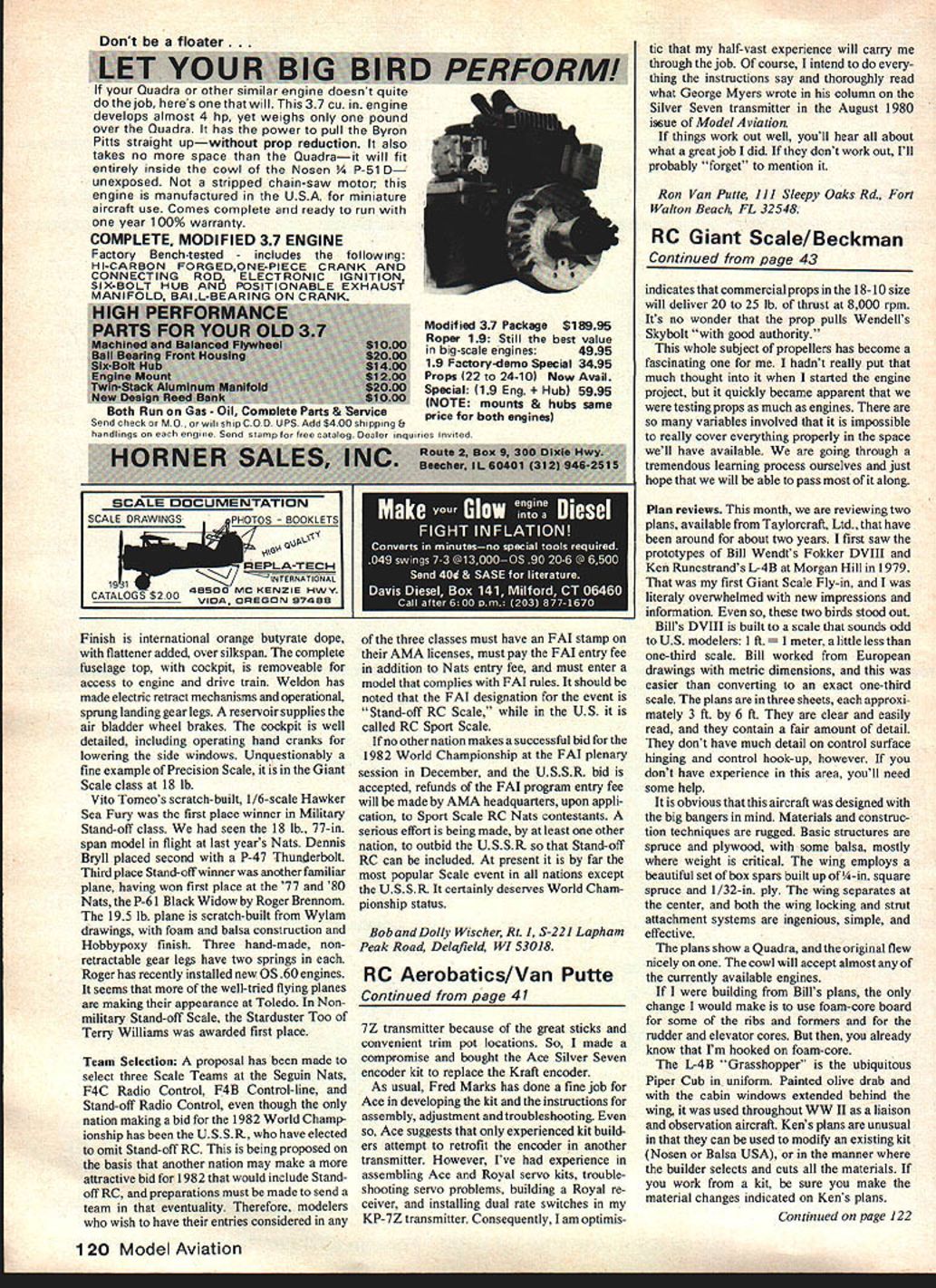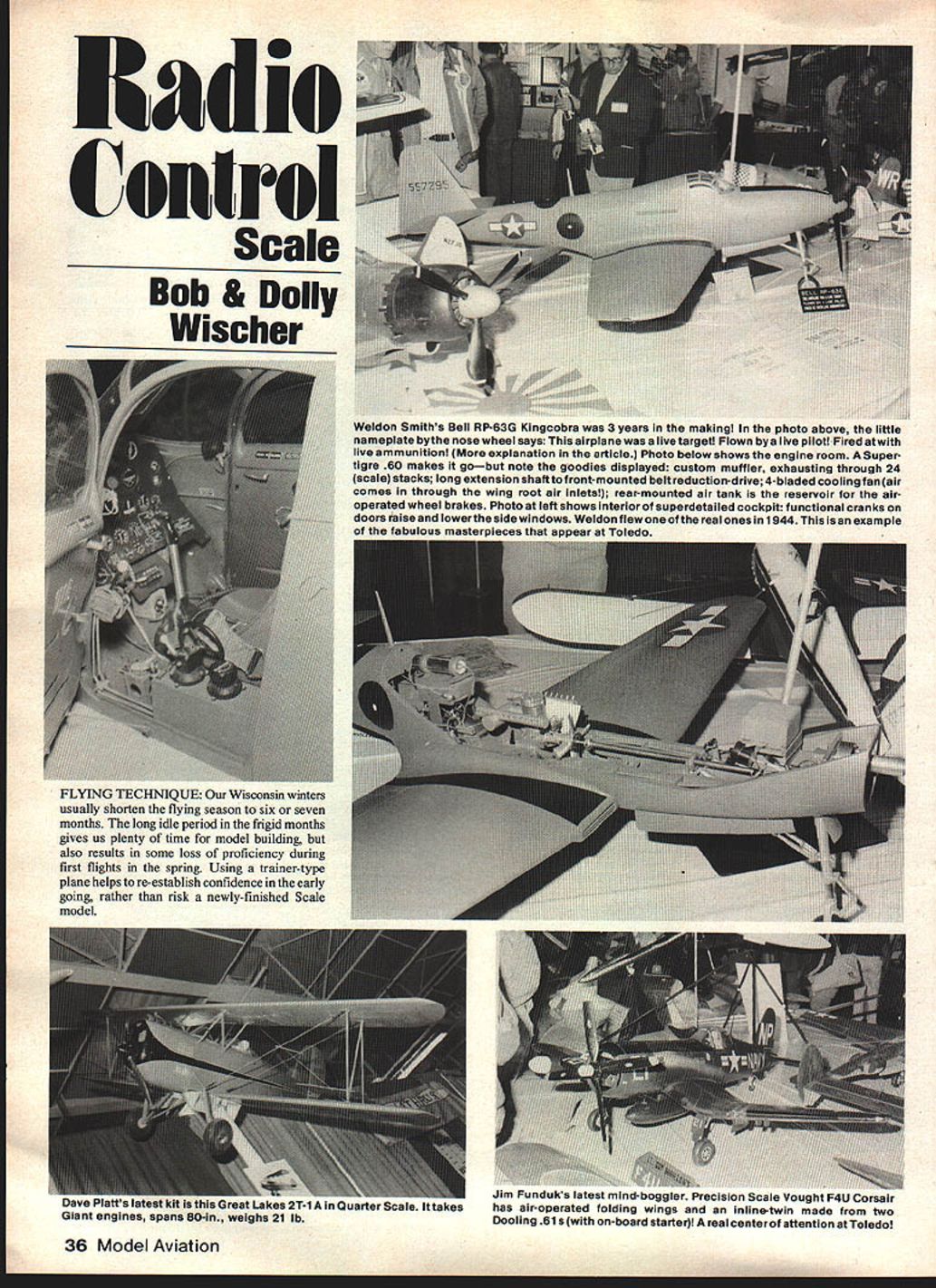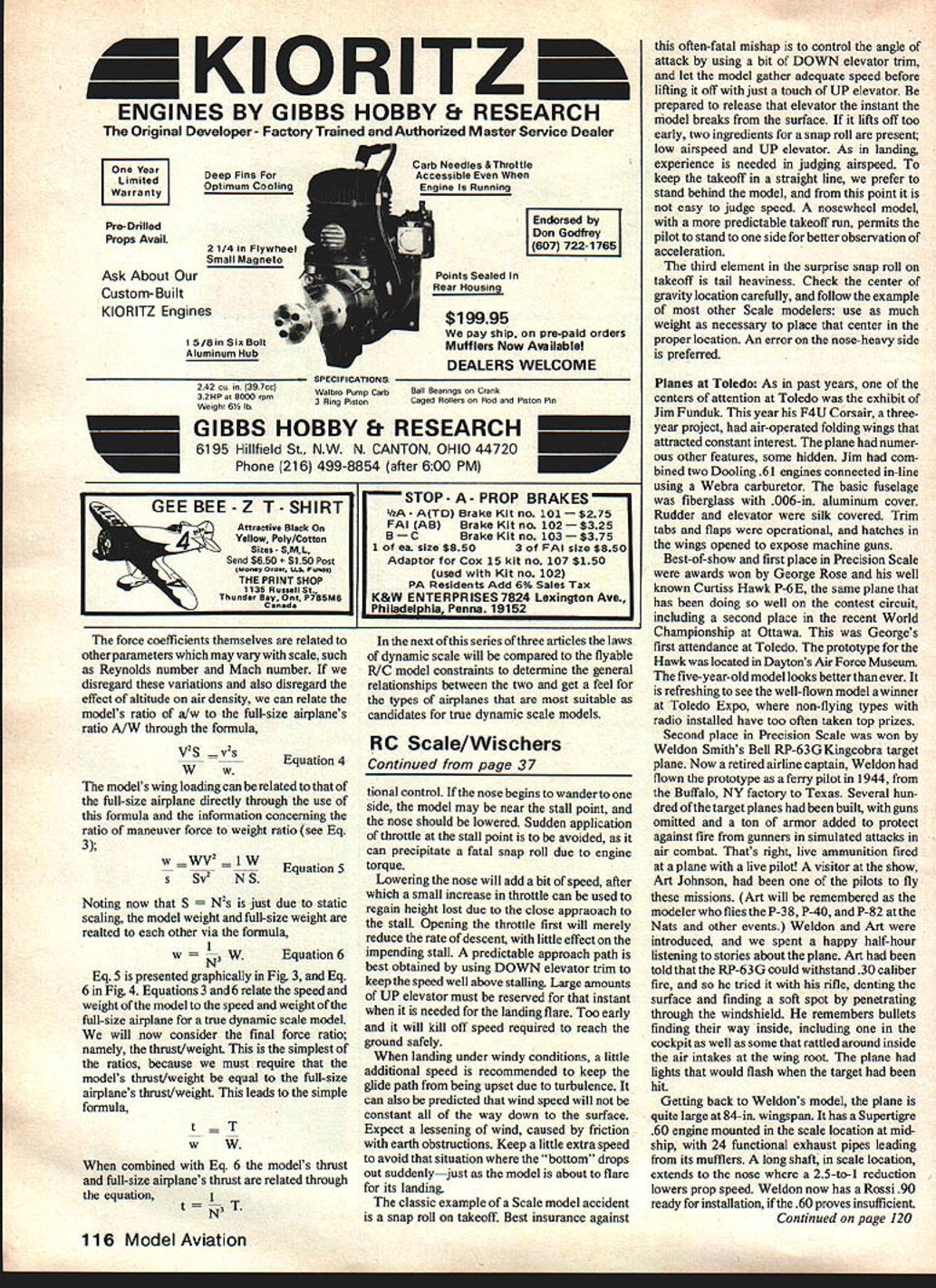 Couirol Scale Bob & Dolly Wischer 36 Model Aviation Weldon Smiths Bell RP-63G Kingcobrs 3 years making photo above little nameplate bythe nose wheel says airplane alive target Flown bya live pilot Fired atwith live ammunition explanation article Photo below shows engine room Super tigre 60 makes gobut note goodies displayed custom muffler exhausting through 24 scale stacks long extension shaftto front-mounted belt reduction-drive 4-bladed cooling fan air comes through wing root air inlets rear-mounted air tank reservoir airoperated wheel brakes Photo left shows interior superdetailed cockpit functional cranks doors raise lowerthe sidewindows Weldon flewone real ones 1 g44 example fabulous masterpieces appear Toledo FLYING TECHNIQUE Wisconsin winters usually shorten flying season six seven months long idle period frigid months gives us plenty time model building also results some loss proficiency during first flights spring Using trainer-type plane helps re-establish confidence early going rather risk newly-finished Scale model dwrn ml IfliS uresi LOKOS LI-lAm UUSrter caie ni sngines spans 80-in weighs 21 lb jim Funduks latest mind-boggler Precision Scale Vought F4U Corsair has air-operated folding wings inline-twin made two Dooling 619 on-board starter real centerof attention Toledo trainer may introduce false sense assurance however Its forgiving nature may permit us forget devastating result high angle attack flying Scale model higher wing loading especially during periods reduced speed such climbing gliding light trainer larger-than-necessary engine may lead us believe altitude can acquired touch UP elevator surpris ing number pilots both fuilsize modelers have mistaken notion throttle speed control elevator controls altitude transmitter controls moved mechanically regard facts flight First step learningorunlearning process stop flying wide-open throttle Follow practice full-size planes using throttle position gives comfortable cruise speed set elevator trim control permit level flight wings angle attack speed will produce lift equal models weight Changing throttle position results climb descent important observation notice speed does change model climbs descends Without changing throttle position move elevator trim control UP elevator speed will reduced DOWN trim will increase speed observations air determine throttle altitude control elevator speed control Using two controls opposite manner can lead stalls spins crashes temptation pull nose up elevator stretching glide must resisted must agreed judging models attitude during glide distance pilot matter experience Because flying slowly its size doesnt change rapidly approaches head-on model appears losing altitude too rapidly touch throttle will slow descent gathering speed Adding too much throttle can cause model overshoot landing added DOWN elevator trim will result speed increase much same effect indication model about stall watch loss ofdirec Continued page 116 August1981 37 George Rose flew Curtiss Hawk p-BE last years Scale World Vito Tomeos HawKer ea 1-ury rD vii mu i n span Champs Ottawait took Best Show 1st Precision Scale won 1st Military Stand-off Scale Toledo year flown Toledo year truly magnificent model the 1980 Nats Note scale 5-bladed prop MIDWEST PRODUCTS COMPANY INC 4005 IndIana St Hobart IndIana 46342 219942-1134 send 1Ofl catalon KIORITZ ENiINES BY GIBBS HOBBY & RESEAI Original Developer Factory Trained Authorized Master Service Dealer Year Limited LnlJ Pre-Onhied Props Avail Ask About Custom- Built KIORITZ Engines Deep Fins Optimum Cooling 21/4 Flywheel Small Magneto 1 5/am Six Bolt Aluminum Hub Carb Needles &Throttle Accessible Engine Running IDon Godfrey 722-1765 Points Sealed Rear Housing $19995 pay shIp pre-pald orders Mufflers Now Availablel DEALERS WELCOME SPECIFICATIONS 242 Co 397ccWalbro Potnp CabSaii Reanogs Crank 32HP t 8000 ~3 Ring PistonCaged Rollers Rod Piston Pin Weight 64 lb GIBBS HOBBY & RESEARCH 6195 Hillfield St NW N CANTON OHIO 44720 Phone 216 499-8854 after 600 PM STOP-A-PROP BRAKES GEE BEE Z T-SHIRTA-ATDBrakeKltno 1O1$275 Attractive Black OnFAI CABBrake Kit no 102 $325 Yellow Poly/CottonB ke Kit no 103 Se Sizes SML1 ea size $8503 FAI size $850 Thsnd$1 PostAdaptor Kit$150 force coefficients themselves related other parameters may vary scale such Reynolds number Mach number disregard variations also disregard effect altitude air density can relate models ratio Ww full-size airplanes ratio NW through formula VS quation 4 Ww models wing loading can related full-size airplane directly through use formula information concerning ratio maneuver force weight ratio see Eq 3 w WV2 LW EquationS Sv2 NS Noting now S N2s just due static scaiing model weight full-size weight realted other via formula wN3 WEquation 6 Eq 5 presented graphically Fig 3 Eq 6 Fig 4 Equations 3 and6 relate speed weight model speed weight full-size airplane true dynamic scaie modeL will now consider final force ratio namely thrust/weight simplest ratios because must require models thrust/weight equal full-size airplanes thrust/weight leads simple formula wW combined Eq 6 models thrust full-size airplanes thrust related through equation 1 N3 T next series three articles laws dynamic scale will compared flyable K/C model constraints determine general relationships between two get feel types airplanes suitable candidates true dynamic scale models RC Scale/Wischers Continued page 37 tonal control nose begins wander side model may near stall point nose should lowered Sudden application throttle stall point avoided can precipitate fatal snap roll due engine torque Lowering nose will add bit speed after small increase throttle can used regain height lost due close appraoach stall Opening throttle first will merely reduce rate descent little effect impending stall predictable approach path best obtained using DOWN elevator trim keep speed well above stalling Large amounts UP elevator must reserved instant needed landing flare Too early will