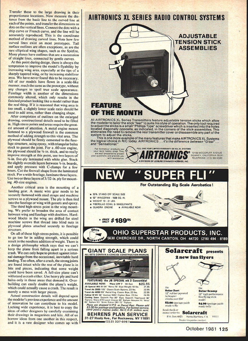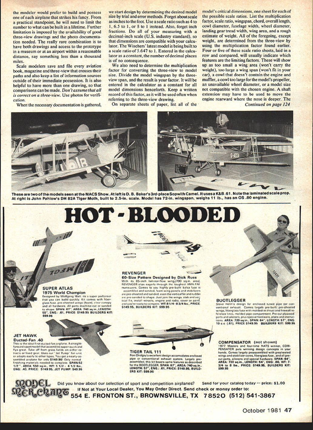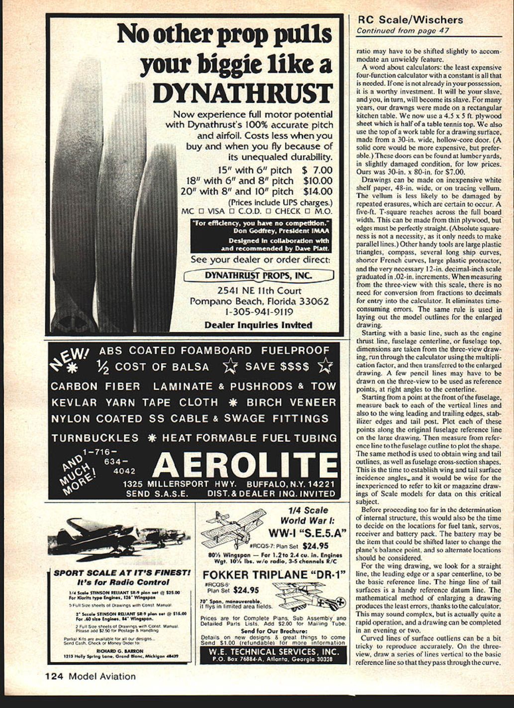 Radio Control Scale Bob & Dolly Wischer DESIGNING SCALE MODELS profusion Scale kits presently avail able would modeler want design own airplane Reasons plentiful may want something different hasnt done previously its reasonable estimate less half prototypes aviation history have modeled may like challenge working out problems own way modelers among innovative inventive individuals Equally important could seeking distinction producer one-of-akind some may baffle other modelers because uniqueness desire scratchbuild rare prototype could also expression dissatisfaction kits available particu larly fact some types appear half dozen kits equally attractive planes never kitted Skill knowledge patience can acquired desire necessary ingredient successful scratch-designing -building Scale modelers breed apart can amuse themselves endlessly paging through air plane books magazines viewing photo three-view drawing eye its potential model subject Given opportunity time Dennis Tapstield lives Maiaenneaa erKsnIre tnglana ana isjuauiuauiy proud two large-scale models left quarter-scale Meyers Little Toot Prototype EAA Museum tiny models span just 57 right 1936-era Chilton DW 1 builtto scale 35-in 1 ft spans 84 46 Model Aviation Three fantastic models keep turning up Toledo show top Jim Funduks F4U Corsairwith its air-operated folding wings Note high-collared ground crew servicing planes oxygen supply through open hatch lower left Joe Griffins A6M5 Zero built Royal kit modifications Finish acrylic lacquer over silkapan polyester resin Kraft 61 powers 85 lb model lower right scratch-built Ryan FR-I Fireball Bill Mikesell Design basis 3-view drawings found Historical Aviation Album its built 15-in scale features bomb-drop mechanism Rhom retracts Robert nosewheel modeler would prefer build possess airplane strikes fancy practical standpoint will need limit number what can built lifetime Further limitation imposed availability good three-view drawings photo documenta tion needed really rare combination have both drawings access prototype museum airport within reasonable distance say something less thousand miles Scale modelers save file aviation book magazine three-view crosses paths also keep list information sources outside immediate possession also helpful have drawing comparisons can made Dont assume correct three-view Use photos verifi cation necessary documentation gathered start design determining desired model size trial error methods Forget about scale inches foot Use scale ratio such 4 1 65 1 8 1 instead Also forget inch fractions measuring decimal-inch scale US industry standard dimensions compatible calcu lator Wischers latest model being built scale ratio 5647 1 Entered calcu lator constant number decimal places no consequence also need determine multiplication factor converting three-view model size Divide model wingspan threeview span result factor will entered calculator constant model dimensions henceforth Keep written record factor will used often referring three-view drawing separate sheets paper list models critical dimensions sheet possible scale ratios List multiplication factor scale ratio wingspan chord overall length cowl diameter fuselage width wheel diameter landing gear tread width wing area rough estimate weight foregoing except weight determined three-view using multiplication factor found earlier Four five scale ratio sheets laid row compared will usually indicate features limiting factors will show up too small wing area wont carry weight too large wing span wont fit car cowl doesnt contain engine muffler cowl too large models propeller unavailable wheel diameter model size compatible chosen engine shaft extension- may have used move engine rearward nose deeper Continued page 124 SUPER ATLAS 1975 World Champion Designed Wolfgang Mart its super performer can build qoickly Kit comes fiber glass lose pm-sheeted wings foam clear canopy hardware parts machine-cat sanded shape SPAN 67 AREA 740 sqin.LENGTH 59 ERG 61 PRICE $14995 BUILDERS KIT $9995 JET HAWK Ducted- Fan 404 ideal first dacted-fon airplane straight forward sport model assembles super-quick flys gteat Take aff grass fields either re tracts fined gear Uses oar Jet Pomp fan unit adapts easily other types Vs5 get nearly-as sembled airplane fo $14995 Only normal finishing materials needed complete SPAN52 1/2 550 sqie. Wi 5 1/2- 6 1/2 lbs ENG 40 PRIcE $14995 JET PUMP $4995 REVENGER-60-Size Pattern Designed Dick Russ its Sb-inch lomiear-flow mrng700 5gm ama PEVENGEg slips eagerly throagh tooghest AMA-FAI maneucers Comes highly pre-built balsa fuse assembled sanded foam wing panels stakilizers pie-sheeted sanded nertical fin rudder pm-sanded shape Just join wings stab ner rival fin install retracts engine radio coser paint youre ready compete INT5 1/4-53/4 lbs. PRICE $14995 BUILDERS KIT $9995 TIGER TAIL 111 Ron Chidgeys encellent design occomodates enclosed pipe connentional exhaust system Largelp pieassembled kit boasts same featsres described br BOOTLEGGER SPAN 67 AREA 740 sqin. LENGTH 57 ENG 61 PRICE $14995 BUILD ERS KIT $9995 BOOTLEGGER Steve Helms design enclosed tuned pipe con ventional exhaust Comes largely pre-built pm-sheeted wings fiberglass lane molded-in thrust firewall re ference lines molded pipe compartment Pie-cut plywood parts ailerons plus special hardware plans instruc rises AREA 720 sqin. SPAN 64 LENGTH 57 ERG lOne 61 PRICE $14995 BUILDERS KIT $9995 COMPENSATOR shown 1977 Masters lear-time NATS winner COM PENSATOR puts winning design concepts pour hands Comes largely preassembled milk presheeted wings stabilizemcorenfiberglass fsne. pre cut pans ailerons special hardware SPAN 64 AREA 730 sqin. LENGTH 54 ERG 60 Wi 7 3/4 5 lbs. PRICE $14995 BUILDERS KIT $9995 IOC L Did know about selection sport competition airplanes Send catalog today C $100 Local Dealer May Order Direct Send check money order EJC71 4 E FRONTON ST1 BROWNSVILLE TX 78520 512 541-3867 October 1981 47 w nuou ar MACS Show left D B Bakers 3rd-plac