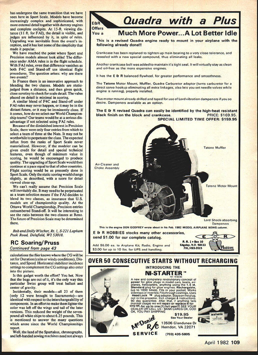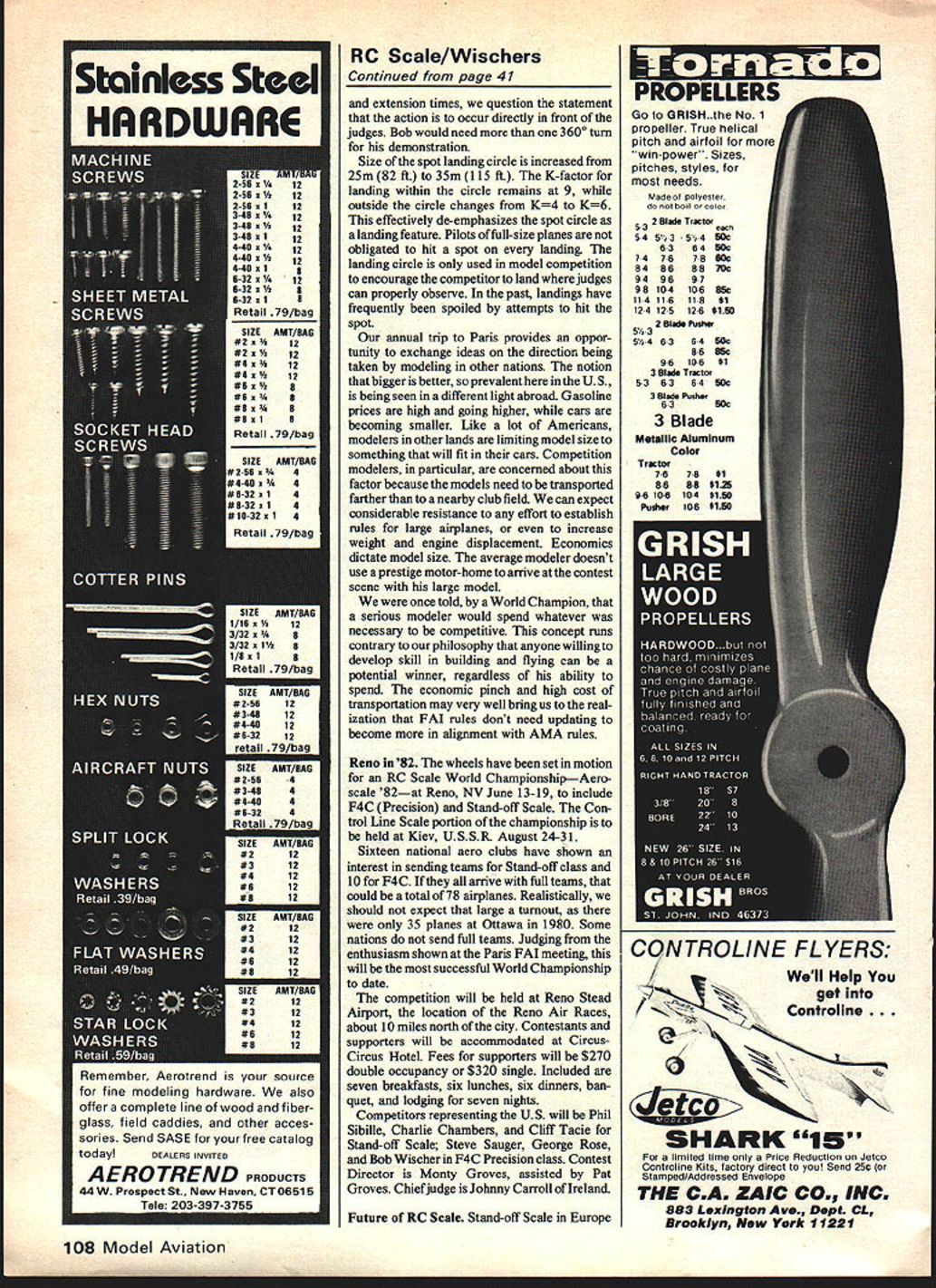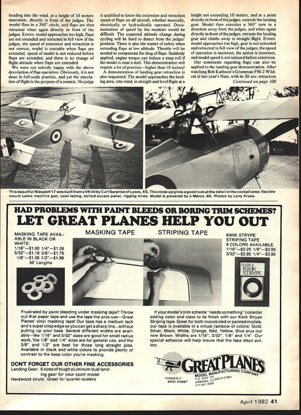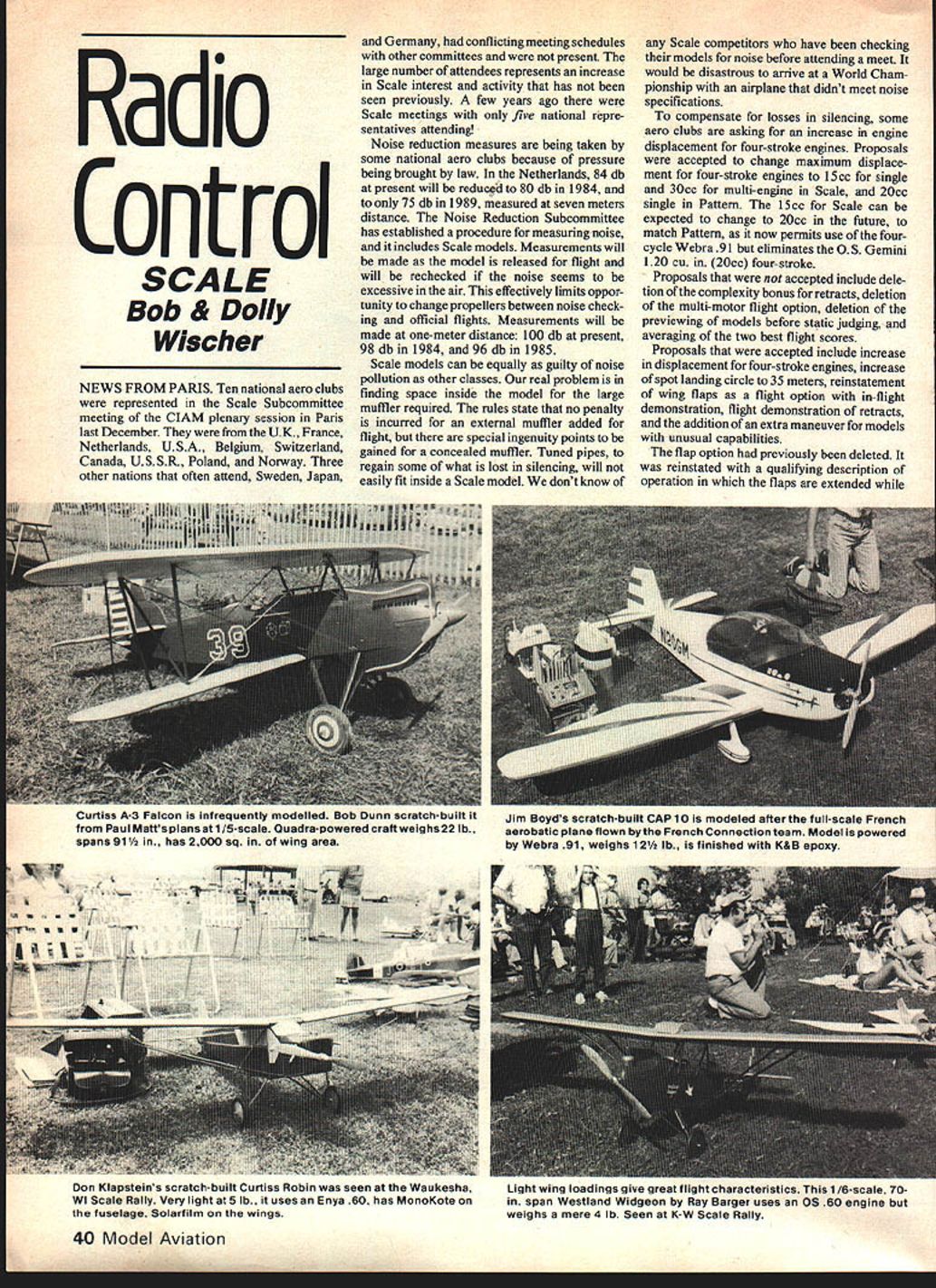Radio Control SCALE Bob & Dolly Wischer NEWS FROM PARIS Ten national aero clubs represented Scale Subcommittee meeting ClAM plenary session Paris last December UK France Netherlands USA Belgium Switzerland Canada USSR Poland Norway Three other nations often attend Sweden Japan Germany conflicting meeting schedules other committees present large number attendees represents increase Scale interest activity has seen previously few years ago Scale meetings five national repre sentatives attending Noise reduction measures being taken some national aero clubs because pressure being brought law Netherlands 84 db present will reducad 80 db 1984 75 db 1989 measured seven meters distance Noise Reduction Subcommittee has established procedure measuring noise includes Scale models Measurements will made model released flight will rechecked noise seems excessive air effectively limits oppor tunity change propellers between noise check ing official flights Measurements will made one-meter distance 100 db present 98 db 1984 96 db 1985 Scale models can equally guilty noise pollution other classes real problem finding space inside model large muffler required rules state no penalty incurred external muffler added flight special ingenuity points gained concealed muffler Tuned pipes regain some what lost silencing will easily fit inside Scale model dont know Scale competitors have checking models noise before attending meet would disastrous arrive World Cham pionship airplane didnt meet noise specifications compensate losses silencing some aero clubs asking increase engine displacement four-stroke engines Proposals accepted change maximum displace ment four-stroke engines 15cc singie 30cc multi-engine Scale 20cc singie Pattern 15cc Scale can expected change 20cc future match Pattern now permits use fourcycle Webra 91 eliminates OS Gemini 120 cu 20cc four-stroke Proposals accepted include dele tion complexity bonus retracts deletion multi-motor flight option deletion previewing models before static judging averaging two best flight scores Proposals accepted include increase displacement four-stroke engines increase spot landing circle 35 meters reinstatement wing flaps flight option in-flight demonstration flight demonstration retracts addition extra maneuver models unusual capabilities flap option previously deleted reinstated qualifying description operation flaps extended 40 Model Aviation K 5 Curtiss A-3 Falcon infrequently modelled OD Dunn scratcfl-Dutt Paul Matts plans 1/5-scale Quadra-powered craft weighs22 lb spans 911/2 has 2000 sq wing area Jim Boyds scratch-built CAP 10 modeled after full-scale French aerobatic plane flown bythe French Connection team Model powered Webra 91 weighs 2/2 lb finished K&B epoxy r Don Klapateins scratch-built Curtiss Robin seen Waukesha WI Scale Rally Very light 5 lb. uses Enya 60 has MonoKote fuselage Solarfilm wings Light wing loadings give great flight characteristics 1 /6-scaie iu span Westland Widgeon Ray Barger uses OS 60 engine weighs mere 4 lb Seen K-W Scale Rally heading wind height 10 meters maximum directly front judges model flies 3600 circle flaps retracted again directly front judges Errors model approaches too high flaps extended retracted full view judges speed extension retraction correct model unstable flaps extended speed model reduced before flaps extended no change flight attitude flaps extended entirely happy above description flap operation Obviously done full-scale practice yet simula tion flight purpose contest No judge qualified know extension retraction speed flaps aircraft whether manually electrically hydraulically operated Docu mentation speed modeler would difficult expected attitude change during cycling will hard detect judges position also matter safety extending flaps low altitude Throttle will needed compensate drag flaps Suddenly applied engine torque can induce snap roll model near stall demonstration will require lot practicehigher 10 meters demonstration landing gear retraction also requested model approaches land ing area wind straight level flight height exceeding 10 meters point directly front judges extends landing gear Model executes 3600 turn direction away judges again directly front judges retracts landing gear climbs away straight flight Errors model approaches too high gear extended retracted full view judges speed operation incorrect action incorrect model speed reduced before extension comments regarding flaps can also applied landing gear demonstration After watching Bob Karlssons Grumman FM-2 Wild cat last years Nats its 20-sec retraction Continued page 108 us beal uilt VK kit Curt Surprise Lyons KS close-up gives good look atthe detail th0 ..ckpit area mount Lewis machine gun cowl lacing bolted access panel rigging wires Model powered Merco 60 Photos Larry Kruse HAD PROBLEMS WITH PAINT BLEEDS OR BORING TRIM SCHEMES LET GREAT PLANES HELP YOU OUT MASKING TAPE AVAIL ABLE IN BLACK OR WHITE 1/16$100 1/4$159 3/32$119 3/8$179 1/8$139 1/2$199 36 Lengths MASKING TAPE Frustrated paint bleeding under masking tape Throw out paper tape use tape pros useGreat Planes vinyl masking tape tape has medium tack supercrisp edge can get sharp Iine.without pulling up base Several different widths avail ablethe 1/16 3/32 sizes good small radius work 1/8 1/4 sizes general use 3/8 1/2 best long straight jobs Available black white colors provide plenty contrast base color youre masking DON7 FORGET OUR OTHER FINE ACCESSORIES Landing Gear 6 sizes tough aluminum dual land ing gear sport model Hardwood struts Great quarter-scalers STRIPING TAPE KWIK STRYPE STRIPING TAPE 9 COLORS AVAILABLE 1/16$225 1/8$295 3/32t~ O IA..$395 models trim scheme needs something consider adding color class its finish Kwik Strype Striping tape Great both monokoted painted models tape available virtual rainbow colors Gold Silver Black White Orange Red Yellow Blue plus new Brown Widths 1/16 3/32 1/8 1/4 special adhesive will help insure tape stays put too ZIANU7IIP MO F
