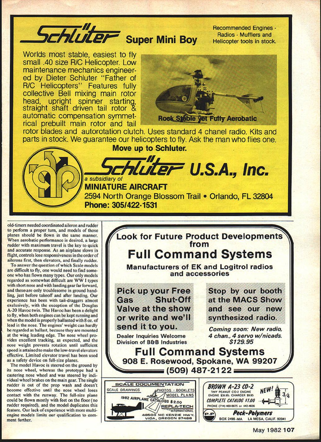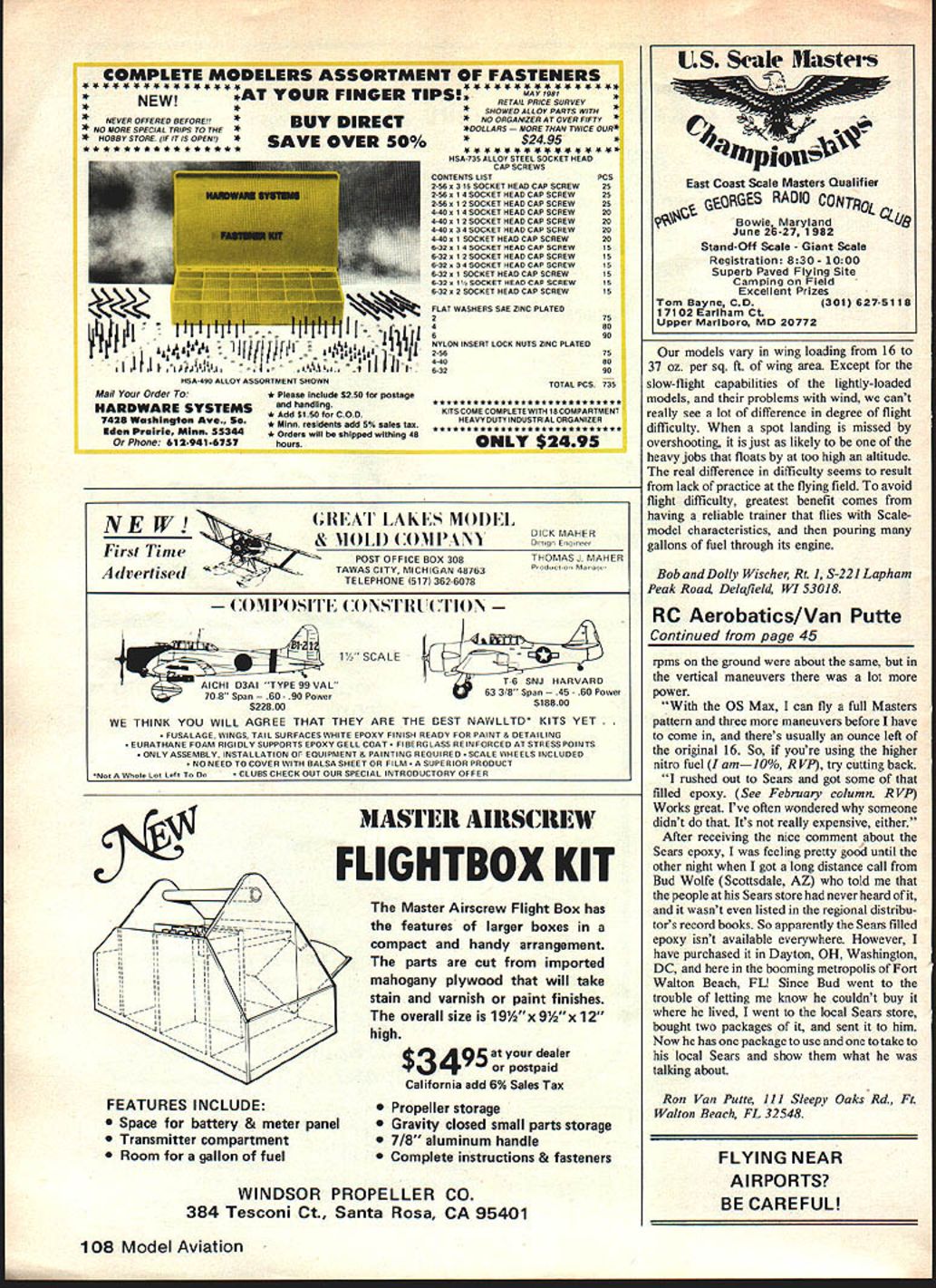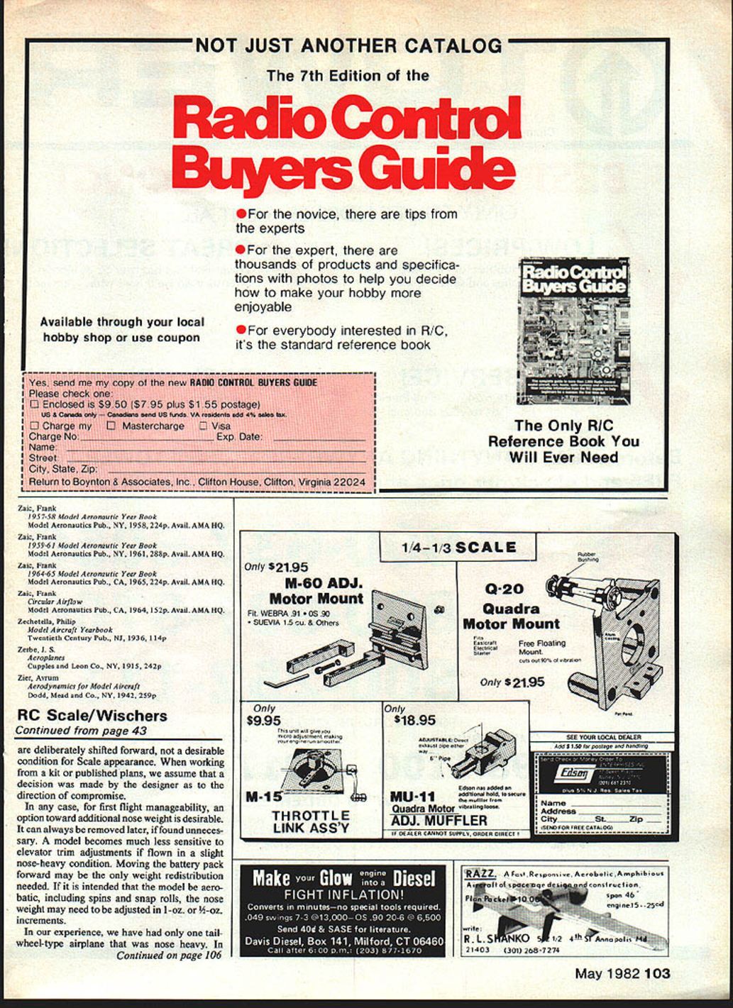 Rddio Control SCALE Bob & Dolly Wischer FLIGHT PROBLEMS opinion emphasis RC Scale centers its impor tant aspectflight model difficult fly though originated good plan kit problem lies improper preparation somewhere building process arrives field its first flight overweight wing warps misplaced center gravity improper incidence angles wing tail model prime candidate return home plastic trash bag lose another Scale advocate An inexperienced Scale modeler will often ask someone skilled make first flight untried model poor fellow faced having fight built-in problems have seen happen such predicament pilot using unfamiliar transmitter moved lever thought would elevator trim find after crash transmitter power switch moved ofi position test pilot needs someone sufficiently thick-skinned lose sleep over accident However accidents need inevitable no matter controls provided has experience models having similar flight controls model i well prepared Undetected warps wings tail surfaces can become prime cause disaster always disturbed find modelers able see warp because have devel oped measuring technique Robart incidence meter applied various points along wing will quickly show changes indicate warp own favorite method detectingwarps eyesight wing inverted held viewed trailing edge sighting along its center line holding wing steady shift line sight along left right trailing edges determine whether less wings lower surface visible area Hawker Sea Fury Xl Don Gruett Model weighs 12 lb 8 oz has scratch-built retracts 760 sq wing area uses OS gOFSR engine Fine finish Hobbypoxy Formula U over balsa 42 Model Aviation Salvatore Grossos beautiful Stinson SR-a Reliant entered Precision Scale category Toledo show Model 1/6-scale features working strobe navigation lights Precision Scale A6M3-22 Zero Bill Raftery modified Royal kit spans 69 weighs 9 lb one-year project Finish acrylic lacquer over K&B resin/fiberglass cloth has worn weathered look Webra 61 powers across pond see Dennis Iapsfleids latesta b-Ifl span Bede BD-8 Power Magnum 15cc 4-stroke Flying surfaces covered obeche veneer finished film Canopy detail includes 260 screws nuts lequivalent US size 172 polystyrene pilot has fiberglass head Engine uses auxiliary glow heat low throttle Plane has 8 sq ft wing area its 141/2 lb flying weight above trailing edge sighting eye must remain along center line can moved downward reduce amount visible lower surface Tiny warps small 1/32-in can detected simple method course 1/32-in warp could quite harmless average size wing -in warp needs straight ening Better find warp during building process rather after finishing Warps can reduced eliminated using heat steaming kettle soften surface twisting direction opposite warp must twisted beyond straight position because will some spring-back Hold opposite twist cools Heat alone steam may also effective must used caution remember friend tried straighten wing over kitchen range wings interior loaded dope thinner fumes promptly exploded igniting nearby curtains beginnings disaster survived never built another warped wing detrimental warps mentioned type could appear either wing half both halves opposite directions worst condi tion warp raises leading edge lowers trailing edge wing tip its normal position airplane known washin opposite condition washout leading edge lower trailing edge wing tip compared wing root considered beneficial extent commonly used full-scale aircraft should incorporated model used prototype used aerobatic planes because its effect reversed during inverted flight main purpose washout delay tip-stall thereby maintaining lateral stability stall approached some wings washout continuous root tip others Outer panels have intentional warp best model flight results duplicate prototype scaling down model full size prominent features comes light difference angular incidence between wing stabilizer models usually reduced having near-symmetrical airfoils may have little no angular difference try duplicate exact angles reproduce accurate Scale model weight will need added nose compensate light model engine other words angular difference great move balance point forward carried too far model becomes prone nose-over tinless wheels Continued page 103 May 198243 fliS moaei 0 Leo Loudenslagers Laser aerobatic craft big Builder Karl Mueller crafted Mallory Models kit uses geared Webra 12 cu twin power Ship weighs 17 lb sports finish using Hobbypoxy MonoKote Solarfilm 000 REP M s Hot Performance NOT JUST ANOTHER CATALOG 7th Edition the novice tips experts Available through local hobby shop use coupon expert thousands products specifica tions photos help decide make hobby enjoyable everybody interested R/C its standard reference book Yes send copy new RADIO CONTROL BUYERS BUIDE B Please check 5 Enclosed $950 $795 plus $1 55 postage US Canada cawu Sand US funds VA residents add 4% saim lea 0 charge U Mastercharge S visa charge No_____________________ Exp Date ______________ Name Street city State Zip ________________________________________ Return Boynton & Associates Inc clifton House clifton virginia 22024 Zaic Frank 9S 7-58 Model Aeronautic Year Book Model Aeronautics Pub NY 1958 224p Avail AMA HQ Zaic Frank 1959-61 Model Aeronautic Year Book Model Aeronautics Pub NY 19612889 Avail AMA HQ Zaic Frank 1964-65 ModelAeronautic Year Book Model Aeronautics Pub CA 1965 224p Avail AMA HQ Zaic Frank Circular Airflow Model Aeronautics Pub CA 1964 152p Avail AMA HQ Zechetella Philip Model Aircraft Yearbook Twentieth Century Pub NI 1936 1149 Zerbe 1 S Aeroplanes Cupplesand Leon Co NY 1915 2429 Zier Avruns Aerodynamics Model Aircraft Dodd Mead Co NY 1942 2599 RC Scale/Wischers Continued page 43 deliberately shifted forward desirable condition Scale appearance working kit published plans assume decision made designer direction compromise case first flight manageability option toward additional nose weight desirable can always removed later found unneces sary model becomes much les