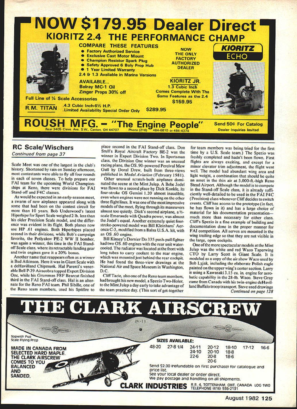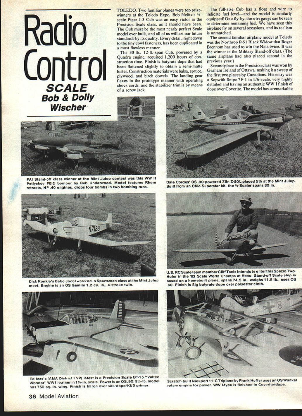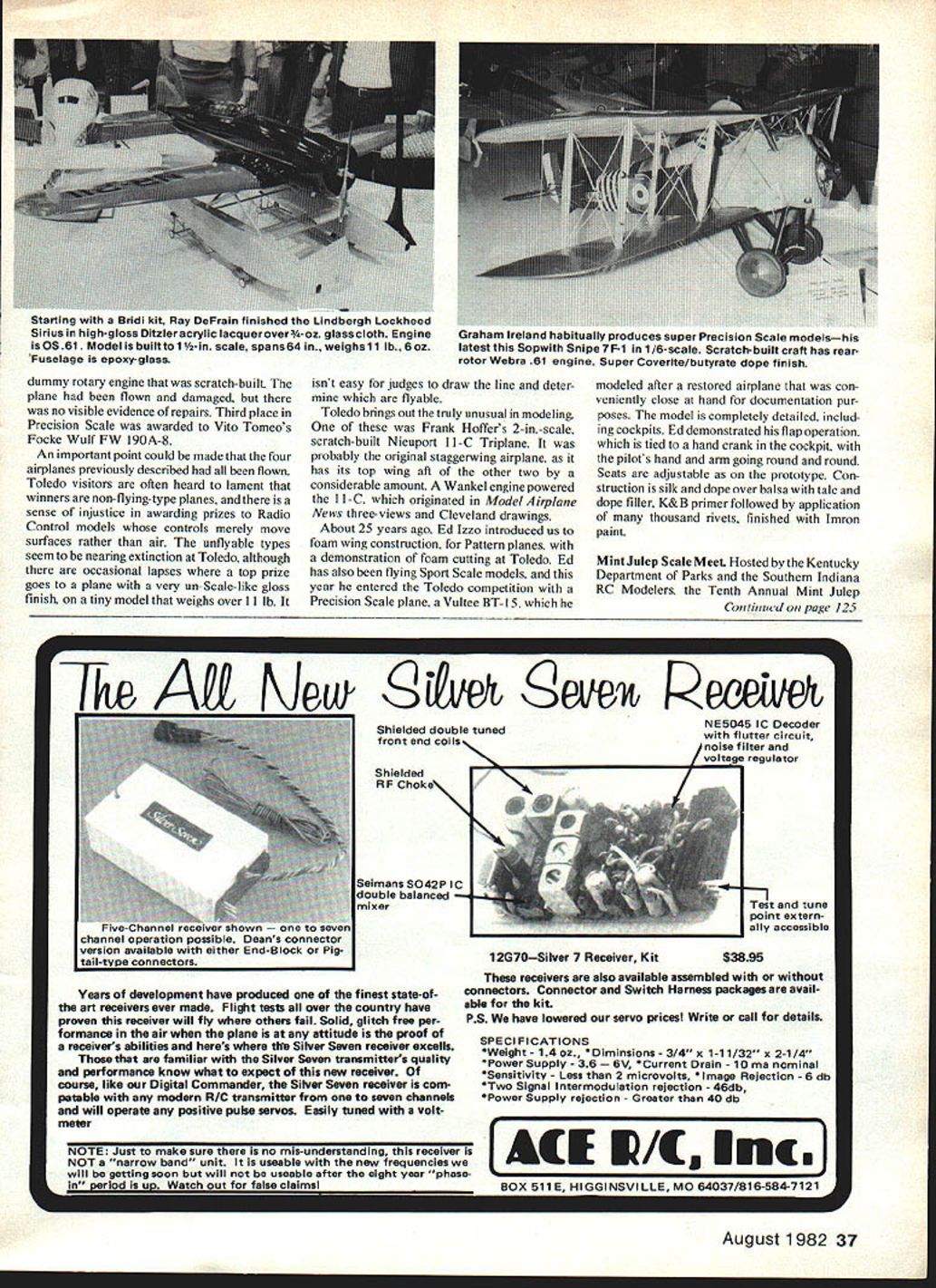 Radio Control SCALE Bob & Dolly Wischer TOLEDO Two familiar planes top prizewinners Toledo Expo Bob Nelitzs V3scale Piper J-3 Cub easy victor Precision Scale class should have Cub must nearly perfect Scale model ever built us will set future standards its quality detail right down tiny cowl fasteners has duplicated flawless manner 30-lb. 12-ft-span Cub powered Quadra engine required 1200 hours con struction time Finish butyrate dope flattened slightly obtain semi-matte luster Construction materials balsa spruce plywood birch dowels landing gear flexes prototype manner operating shock cords stabilizer trim means screw jack full-size Cub has float wire indicate fuel leveland model similarly equipped fly-by wire gauge can seen determine remaining fueL have seen airplane fly several occasions its realism unmatched second familiar airplane model Toledo Northrop P-6 Black Widow Roger Brennom has used win Nats twice winner Military Stand-off class same airplane also placed second previous year Second place Precision class won Graham Ireland Ottawa making sweep first two places Canadians entry Sopwith Snipe 7F-l 1/6-scale very highly detailed having authentic WW finish dope over Coverite model has remarkable 36 Model Aviation FAI tafld-0tt ciass winner sne MIllS Julep contest Petlyakov PE-2 bomber Bob Underwood Model features retracts HP 40 engines drops four bombs two bombing runs Dale Cordes OS 90-powered Zlin Z-50L placed 5th Mint Julep Built Ohio Superstar kit /4-5c510r spans 80 Dick Konkles Bebe Jodel 2nd Sportsman class Mint Julep meet Engine OS Gemini 12 cu 4-stroke twin U S RC Scaleteam memberclittTacle intenosto ensersnis pezIu iwo Holer 82 Scale World Champs Reno Stand-off Scale ship based homebuilt plane spans 745 weighs 11 lb uses OS 60 Finish Sig butyrate dope over polyester cloth O Izzos IMMM UI1Ii latest Precision Scale Br-is Vultee Vibrator WW II trainer 1-in scale Power OS90 91/2-lb model has 750 sq wing Finish lmron over silk/dope/K&B primer Scratch-built Nicuport 11-C Triplane Frank Hotter uses OSWankel rotary engine power WW I-type finished Coverite/dope dummy rotary engine scratch-built plane flown damaged no visible evidence repairs Third place Precision Scale awarded Vito Tomeos Focke WuIfFW 190A-8 An important point could made four airplanes previously described flown Toledo visitors often heard lament winners non-flying-type planes sense injustice awarding prizes Radio Control models controls merely move surfaces rather air unflyable types seem nearing extinction Toledo although occasional lapses top prize goes plane very un-Scale-like gloss finish tiny model weighs over 11 lb isnt easy judges draw line deter flyable Toledo brings Out truly unusual modeling Frank Hoffers 2-in-scale scratch-built Nieuport Il-C Triplane probably original staggerwing airplane has its top wing aft other two considerable amount Wankel engine powered Il-C originated Model Airplane News three-views Cleveland drawings About 25 years ago Ed Izzo introduced us foam wing construction Pattern planes demonstration foam cutting Toledo Ed has also flying Sport Scale models year entered Toledo competition Precision Scale plane Vultee BT- 15 modeled after restored airplane con veniently close hand documentation pur poses model completely detailed includ ing cockpits Ed demonstrated flap operation tied hand crank cockpit pilots hand arm going round round Seats adjustable prototype Con struction silk dope over balsa talc dope filler K&B primer followed application thousand rivets finished Imron paint Mint Julep Scale Meet Hosted Kentucky Department Parks Southem Indiana RC Modelers Tenth Annual Mint Julep Continued ot page 125 T t AOO NI~1 1veu evev PeeeWek NE5045 IC Decoder Shielded double tunedwith flutter circuit front end coilsnoise filter voltage regulator Shielded RF Choke\NN SimansSO42P IC uble balanced ilhicer Years development have produced finest state-ofthe art receivers ever made Flight tests aver country have proven receiver will fly others fail Solid glitch free per formance air plane attitude proof receivers abilities heres tile Silver Seven receiver excells familiar Silver Seven transmitters quality performance know what expect new receiver course like Digital Commander Silver Seven receiver corn pateble modern R/C transmitter seven channels will operate positive pulse servos Easily tuned volt meter L Test tune point extern ally accessible $3596 receivers also available assembled connectors Connector Switch Harness packages avail able kit PS have lowered servo prices Write call details SPECI FICATIONS Welght- 14 oz Diminsions-3/4 x 1-11/32 x 2-1/4 Power Supply -36 urrent Drain 10 ma nominal Sensitivity Less 2 microvolts * Image Rejection 6 db TwO Signal Intermodulation rejection 46db Power Supply rejection Greater 40db [All E/ IniW BOX ShE HIGGINSVILLE MO 64037/816-584-7121 August1982 37 starting Bridi Kit Hay DeFrain tinished Lindbergh Lockheed Sirius high-gloss Ditzleracrylic lacquerover-oz glass cloth Engine isOS61 Model built 1 1/2-jn scale spans 64 weighal 1 lb 6 Os Fuselage epoxy-glass Graham Ireland habitually produces super Precision Scale modelshis latest Sopwith Snipe 7 F-i 1/6-scale Scratch-built craft has rearrotor Webra 61 engine Super Coverite/butyrate dope finish I channel operation possible Deans connector version available either End-Block Pig- tail-type connectors 12G70Silver 7 Receiver Kit NOTE Just make sure no mis-understanding receiver NOT narrow band unit useable new frequencies will getting soon will useable after eIght year phase nerlad un Watch out false claimal Scale Meet largest clubs history Shortened rain Sunday afternoon contestants able fly four rounds seven classes help prepare FAI team upcoming World Champion ships Reno divisions FAI Stand-off F4C classes As would expected early-season meet swarm new airplanes appeared along some contest circuit 10 years Bob Underwoods latest Hiperbipe Sport Scale weighed 2 lb less older Precision Scale model differ ence ev