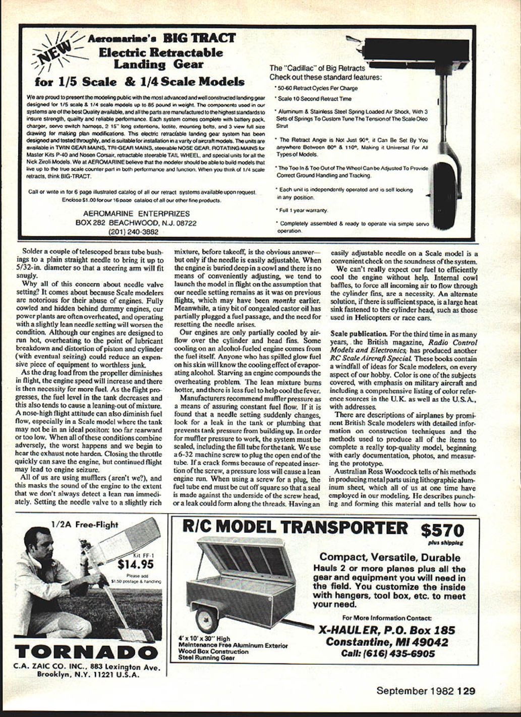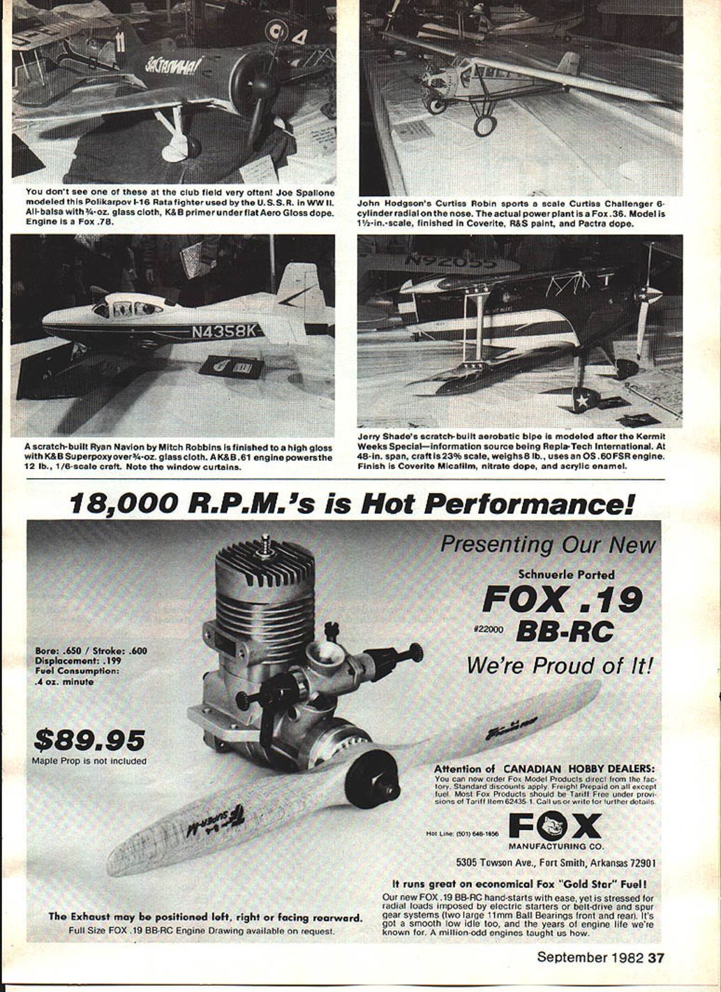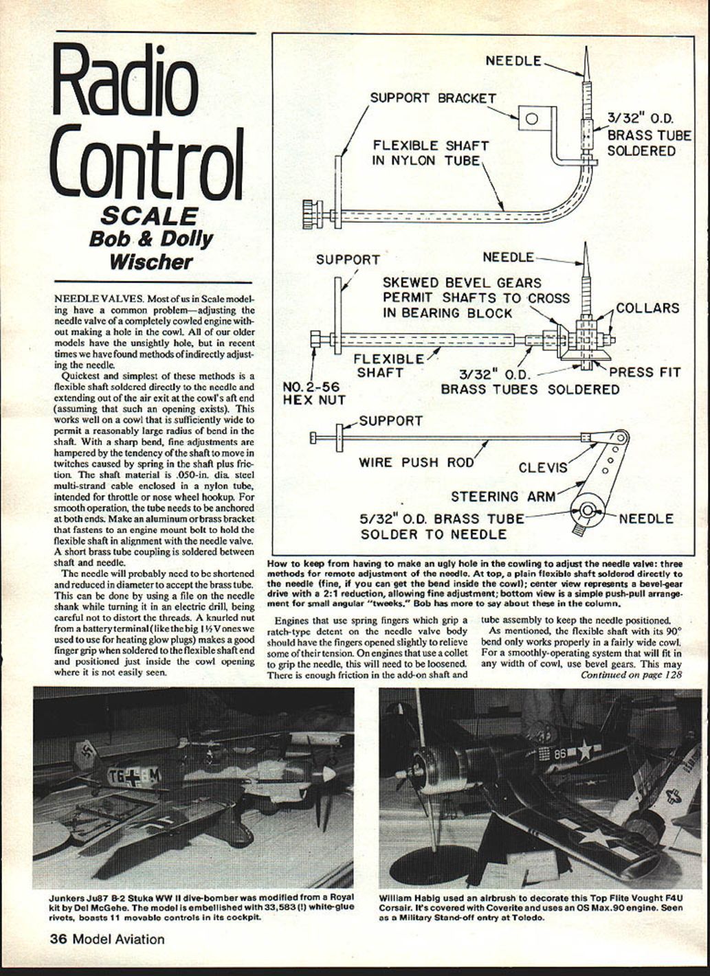 Radio Control SCALE Bob & Dolly Wischer NEEDLE VALVES Most us Scale model ing have common problemadjusting needle valve completely cowled engine out making hole cowL older models have unsightly hole recent times have found methods indirectly adjust ing needle Quickest simplest methods flexible shaft soldered directly needle extending out air exit cowls aft end assuming such opening exists works well cowl sufficiently wide permit reasonably large radius bend shaft sharp bend fine adjustments hampered tendency shaft move twitches caused spring shaft plus fric tion shaft material 050-in dia steel multi-strand cable enclosed nylon tube intended throttle nose wheel hookup smooth operation tube needs anchored both ends Make aluminum brass bracket fastens engine mount bolt hold flexible shaft alignment needle valve short brass tube coupling soldered between shaft needle needle will probably need shortened reduced diameter accept brass tube can done using file needle shank turning electric drill being careful distort threads knurled nut battery terminallike big 1 /2 V ones used use heating glow plugs makes good finger grip soldered flexible shaft end positioned just inside cowl opening easily seen SUPPORT NO 2-56 HEX NUT NEEDLE SUPPORT BRACKET03/32 OD fBRASS TUBE FLEXIBLE SHAFTSOLDERED IN NYLON TUBE I // ~0 NEEDLE H SKEWED BEVEL GEARS PERMIT SHAFTS TO CROSS COLLARS IN BEARING BLOCK II 3/32 OD PRESS FIT BRASS TUBES SOLDERED FLEXIBLE / SHAFT ~SUPPORT WIRE PUSH ROD 0 0 CLEVISo STEERING ARM 5/32OD BRASS TUBENEEDLE SOLDER TO NEEDLE keep having make ugly hole cowling adjust needle valve three methods remote adjustment needle top plain flexible shaft soldered directly needle fine can get bend inside cowl center view represents bevelgear drive 21 reduction allowing fine adjustment bottom view simple push-pull arrange ment small angular tweeks Bob has say about column Engines use spring fingers grip ratch-type detent needle valve body should have fingers opened slightly relieve some tension engines use collet grip needle will need loosened enough friction add-on shaft tube assembly keep needle positioned As mentioned flexible shaft its 900 bend works properly fairly wide cowL smoothly-operating system will fit width cowl use bevel gears may Continued page 128 36 Model Aviation Junkers Ju87 B-2 Stuka WW II dive-bomber modified Royal kit Del McGehe model embellished 33583 white-glue rivets boasts 1 1 movable controls Its cockpit William Habig used airbrush decorate Top Flite Vought F4U Corsair Its covered Coverite uses OS Max 90 engine Seen Military Stand-off entry Toledo Jerry naaes scratcn-DuIII aerooasic oipe moaeiea suer sue ermus scratch-built Ryan Navion Mitch Robbins finished high glossWeeks Specialinformation source being Repla-Tech International K& B Superpoxyover-oz glass cloth K&B 61 engine powersthe48in span craft 1s23% scale weighs8 lb uses OS 6OFSR engine 12 lb 1/6-scale craft Note window curtainsFinish Coverite Micaflim nitrate dope acrylic enamel September 1982 37 dont see club field very often Joe Spallone modeled Polikarpov 1-16 Rata fighter used USSR WW II All-balsa -oz glass cloth K& B primer under flat Aero Gloss dope Engine Fox 78 -.dgsons Curtiss Robin sports scale Curtiss Challenger 6cylinder radial nose actual power plant Fox 36 Model 1-in-scale finished Coverite R&S paint Pactra dope 1-- -000 REPEMW s Hot Performance $ write ror Ti Hot Line 501 646 1656 F 0 X MANUFACTURING Co 5305 Towson Ave Fort Smith Arkansas 72901 runs great economical Fox Gold Star Fuel new FOX 19 BB-RC hand-starts ease yet stressed radial loads imposed electric starters belt-drive spur facing rearward gear systems two large 11mm Ball Bearings front rear Its got smooth low idle too years engine life tng available requestknown million-odd engines taught us DeCO coorpact lightweight 21 o tO o Sg * Special coated surface fuel water resistant Carries starter 12v battery power pacol transoritter & has hocks fur cuiliug glow plug & starter curds lst,tOl Saninry cc.r mini Afuwicuw fulding legs 4 Both lid sides upon access unbreakable tiny organicor inside 1 DaCa Product Inc ONLY 17995 44 codels rein 1010 recairs Iyng Fasulage cradles all1 insi cc widurIr relencoyc GET ORGANIZE Dl s tel 01 4 sturdy Ides holds comprehensivetsr fine instruments fordyearsutynurfonoee8 nil wagoatnes small craft & aircraft design 4 MAG FILES $495 catalog return Box 1534 Southold NYP0 BOX 388-K 7ufaLertlnes inc 11971 516 765-19602DOVER NH 03820 Elmira NY back gang put annual bash drew over 100 fliers Harris Hill got lead full-scale Minanioa owned Reverend Groom out Phoenix Back several us interested old Scale subjects rumor Minamoa existed somewhere USA SSA listed Phoenix call made Reverend Groom told own story about bird freighted over Hindenburg owned Richard DuPont Reverend Groom back Thirties pushed line boy over Harris HilL DuPont killed experimental glider accident during war sometime thereafter Reverend Groom sought out Minamoa bought asked could come see told given away Asked could still seen anywhere told prob ably would have go Elmira donated SSA museum Harris Hill So couple days later Neil Liptak spent afternoon notebook camera tape measure dusty basement hangar famous hilL Doc Hall Glenview II cut wide swath Scale back Seventies saw material Neil compiled sald hed start building immediately did After bird framed out sat longest time project given up other priorities Eventually sold last year Dave Watson rebuilt part finished nine years after first phone call made Minamoa joined gulls off Torrey Pines Dave promises pictures later wanted share different kind modeling story now Good lift Dan Prus 131 E Pennington Lii Plainfield IL 60544 RC Scale/Wiscers Continued page 37 seem complex expensive solution problem actually quite simple model railroad industry has abundant supply gears various sizes shapes ratios obtainable through hobby dealers Precision Scale Co gearboxes molded plastic material 11 ratio helical gears 11 ratio in-line