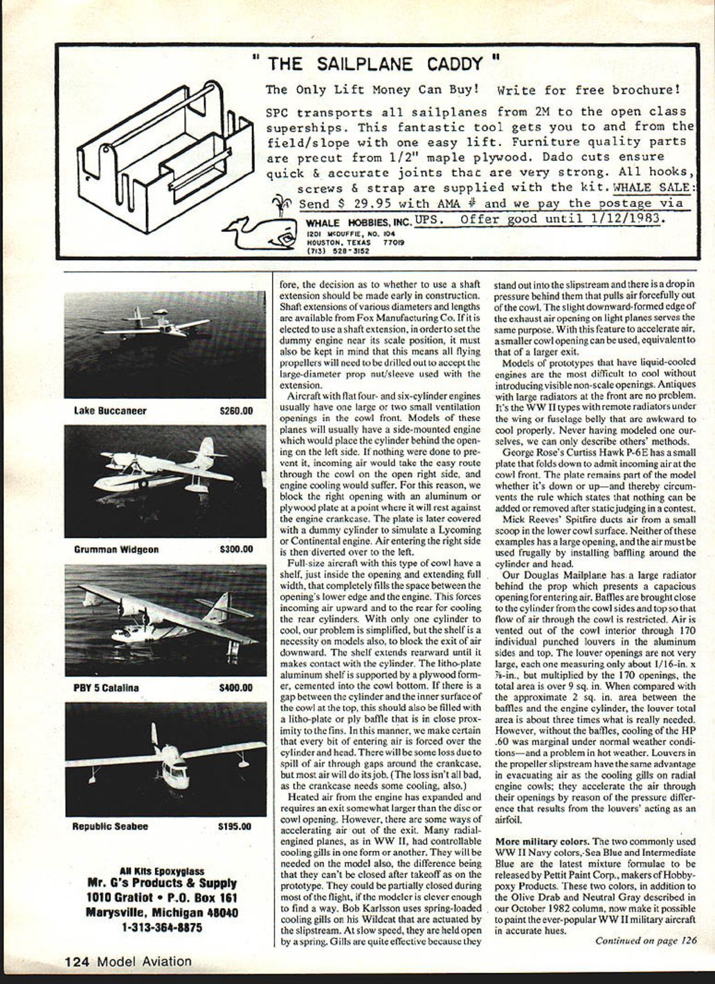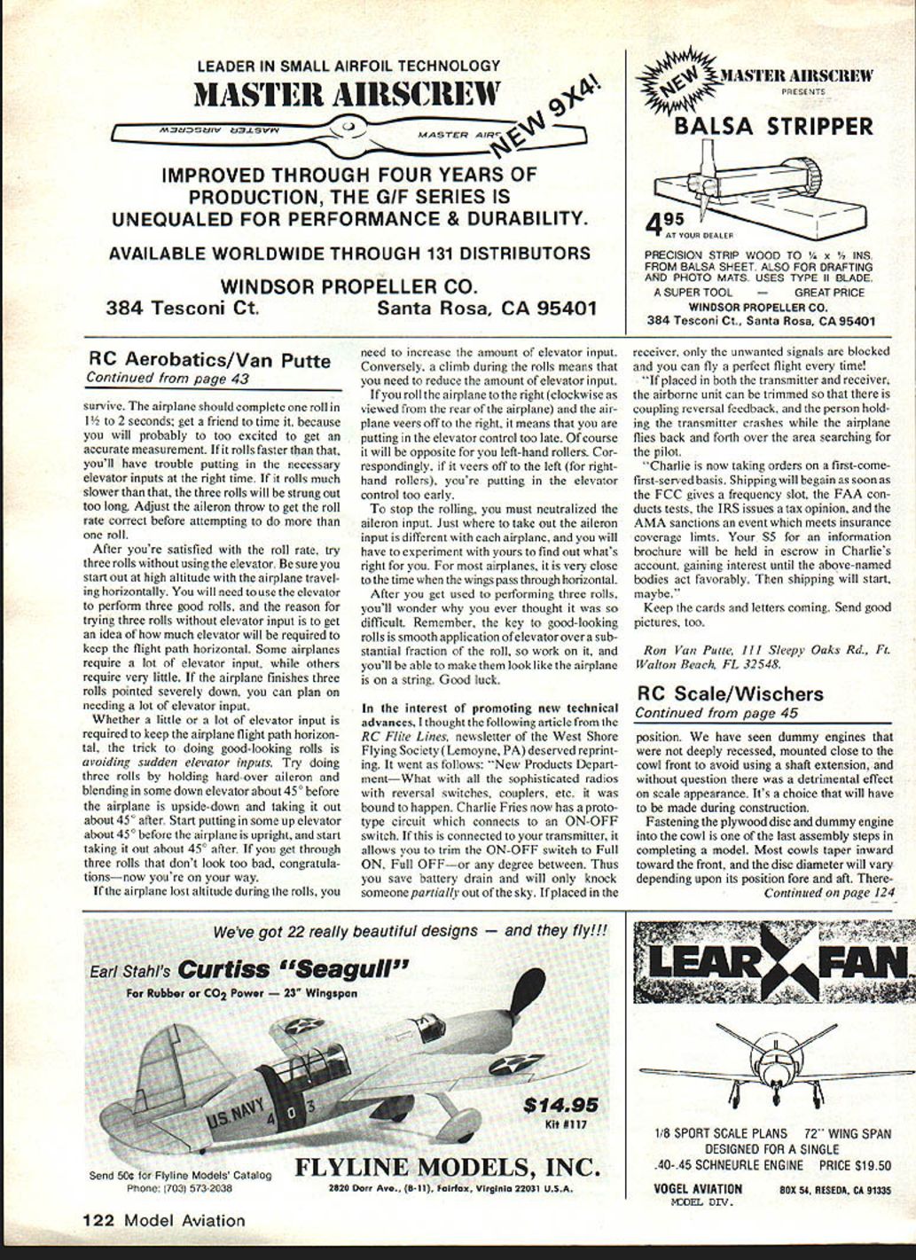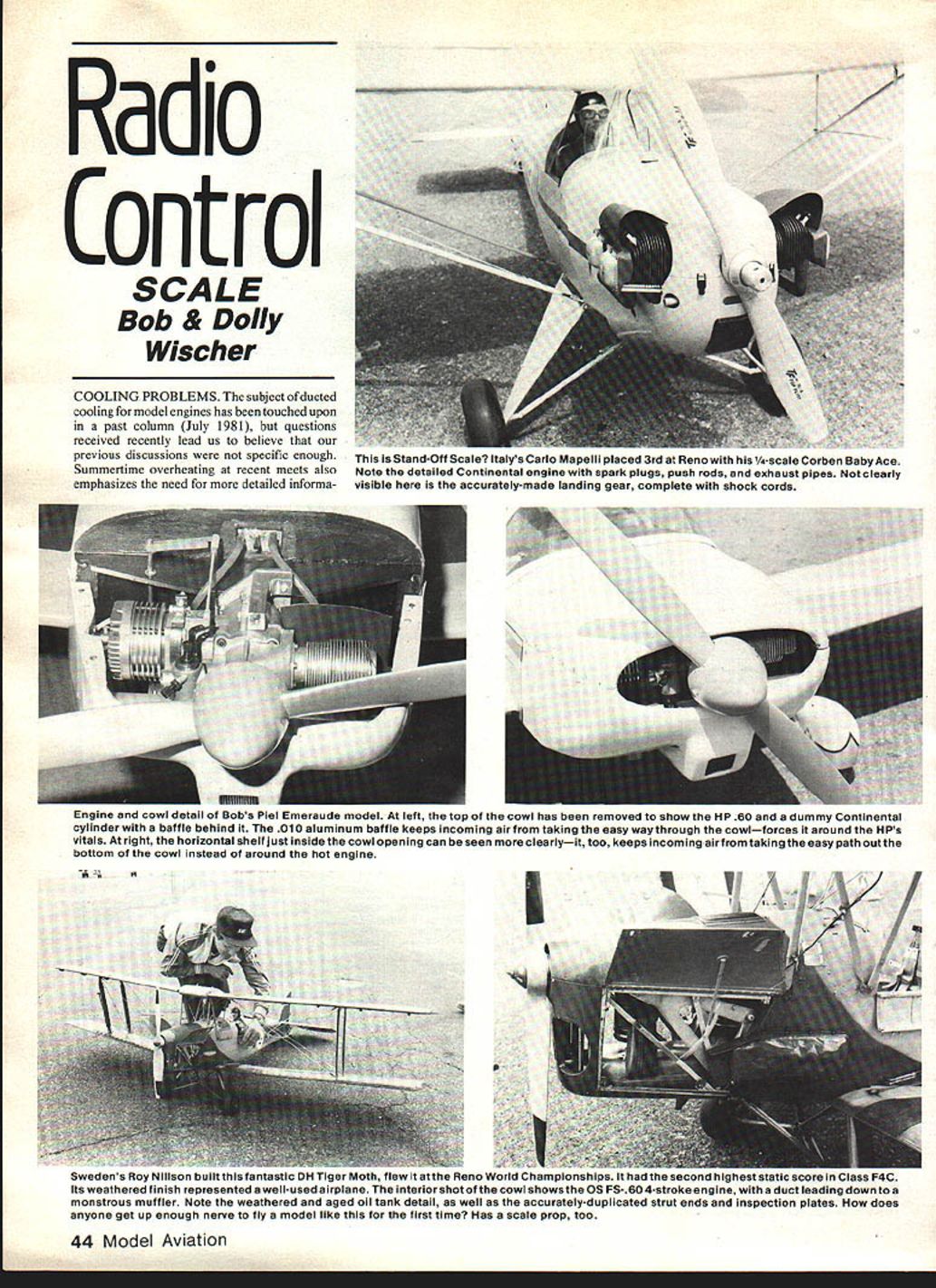 Radio Control SCALE Bob & Dolly Wischer COOLING PROBLEMS subject ducted cooling model engines has touched upon past column July 1981 questions received recently lead us believe previous discussions specific enough Summertime overheating recent meets also emphasizes need detailed informa mm Engine cowl detail Bobs Piel Emeraude model left top cowl has removed show HP 60 dummy Continental cylinder baffle behind 010 aluminum baffle keeps incoming air taking easy way through cowlforces around HPs vitals right horizontal shelfjust inside cowl opening can seen clearlyit too keeps incoming airfrom taking easy path outthe bottom cowl instead around hot engine Swedens Roy Nilison built fantastic DH Tiger Moth flew atthe Reno World Championships second higheststatic score Class F4C Its weathered finish represented well-used airplane interior shot cowl shows OS FS-60 4-stroke engine duct leading down monstrous muffler Note weathered aged oil tank detail well accurately-duplicated strut ends inspection plates does anyone get up enough nerve fly model like first time Has scale prop too 44 Model Aviation Stand-Off Scale Italys Carlo Mapelli placed 3rd Reno 1/4-scale Corben BabyAce Note detailed Continentalengine spark plugs push rods exhaust pipes clearly visible accurately-made landing gear complete shock cords tion Cooling cowled engine mounted behind dummy radial engine relatively simple Dummy half-cylinders mounted 1/16 plywood disc completely fills open ing cowl front model engine mounted such position cylinder center line falls between two dummy cylinders purposes will angle left viewed front engine exhaust will downward angle facilitates mounting muffler near cowl bottom also aids lowering needle valve relative fuel tank center line nine-cylinder dummy radial position favor would about 1400 between cylinders 4 5 counterclockwise top places model engine sidemounted its cylinder 500 below horizontal 100 below model engine placed between cylinders 3 4 plywood disc cut away between cylinders 4 5 trapped air can flow rearward opening will permit sufficient airflow cool 60 90 engine Two 1/32 plywood plates fastened vertically gussets rear ply disc such position rest directly against model engines cylinder fins reaching back approximate cylinder center line plates form box cowl interior surface incoming air forced flow through fins over cylinder head small portion air lost because side plates cant made fit snugly around engine crankcase air enters cowl front can exit through opening disc pres surized air exits around cylinder fins its velocity increased venturi opening disc doesnt need larger area fin space around cylinder head will take sharp eye viewing directly front see model engine Admittedly blocking complete cowl interior increases drag prop blades near hub ineffectual additional drag traded off engine cooling practical expedient larger diameter prop can used necessary model engines using layout typical present designs having carburetor front ball bearings spaced apart distance model engine ply disc will dictate shaft extension may necessary par ticularly true dummy engine ply disc recessed cowl front true scale Continued page 122 40 ENGINE $19500 Plus Shippiftg Kit includes pre-assembled flywheel drive gear starter hub unit K&B 40 state other pre-cut left- right-hand props canoe parts moulded head hands Wilbur poster plans much Build 1905 prototype Signal Corps Flyeror Type GEORGE MARSOEN 7621 Mary Cassatt Drive Potomac Md 20854 December 1982 45 shot shows interesting details construction techniques well HP 50 engine installation Bobs Douglas Mailpiane right plywood baffl hugs cylinder does thats Out sight under muffler third baffle fastened cowl top removed photo fits head glow plug tightly WRIGHT FLYER Ill 1 SPORT SCALE Water cooled cogged belt drive coupled wing-warp/rudder THREE CHANNELS LEADER IN SMALL AIRFOIL TECHNOLOGY MAStER AIRSCREW IMPROVED THROUGH FOUR YEARS OF PRODUCTION THE GIF SERIES IS UNEQUALED FOR PERFORMANCE & DURABILITY AVAILABLE WORLDWIDE THROUGH 131 DISTRIBUTORS WINDSOR PROPELLER CO 384 Tesconi Ct Santa Rosa CA 95401 PRESENTS BALSA STRIPPER A95 U AT YOUR DEALER PRECISION STRIP WOOD TO x INS FROM BALSA SHEET ALSO FOR DRAFTING AND PHOTO MATS USES TYPE II BLADE SUPER TOOL T PRICE WINDSOR PROPELLER CO 384 Tesconi Ct. Santa Rosa CA 95401 RC Aerobatics/Van Putte Continued page 43 survive airplane should complete roll 1 conds get friend time because will probably too excited get accurate measurement rolls faster youll have trouble putting necessary elevator inputs right time rolls much slower three rolls will strung out too long Adjust aileron throw get roll rate correct before attempting roll After youre satisfied roll rate try three rolls using elevator sure start Out high altitude airplane travel ing horizontally will need use elevator perform three good rolls reason trying three rolls elevator input get idea much elevator will required keep flight path horizontal Some airplanes require lot elevator input others require very little airplane finishes three rolls pointed severely down can plan needing lot elevator input Whether little lot elevator input required keep airplane flight path horizon tal trick doing good-looking rolls avoiding sudden elevator inputs Try doing three rolls holding hard-over aileron blending some down elevator about450 before airplane upside-down taking out about 450 after Start putting some up elevator about 450 before airplane upright start taking out about 450 after get through three rolls dont look too bad congratula tionsnow youre way airplane lost altitude during rolls need increase amount elevator input Conversely climb during rolls means need reduce amount elevator input roll airplane right clockwise viewed rear airplane air plane veers off right means putting elevator control too late course will opposite left-hand rollers Cor respondingly veers off left righthand rollers youre putting elevator control too early stop rolling must neutralized ai