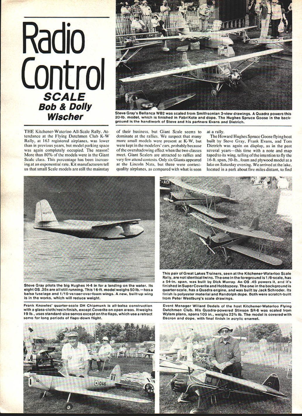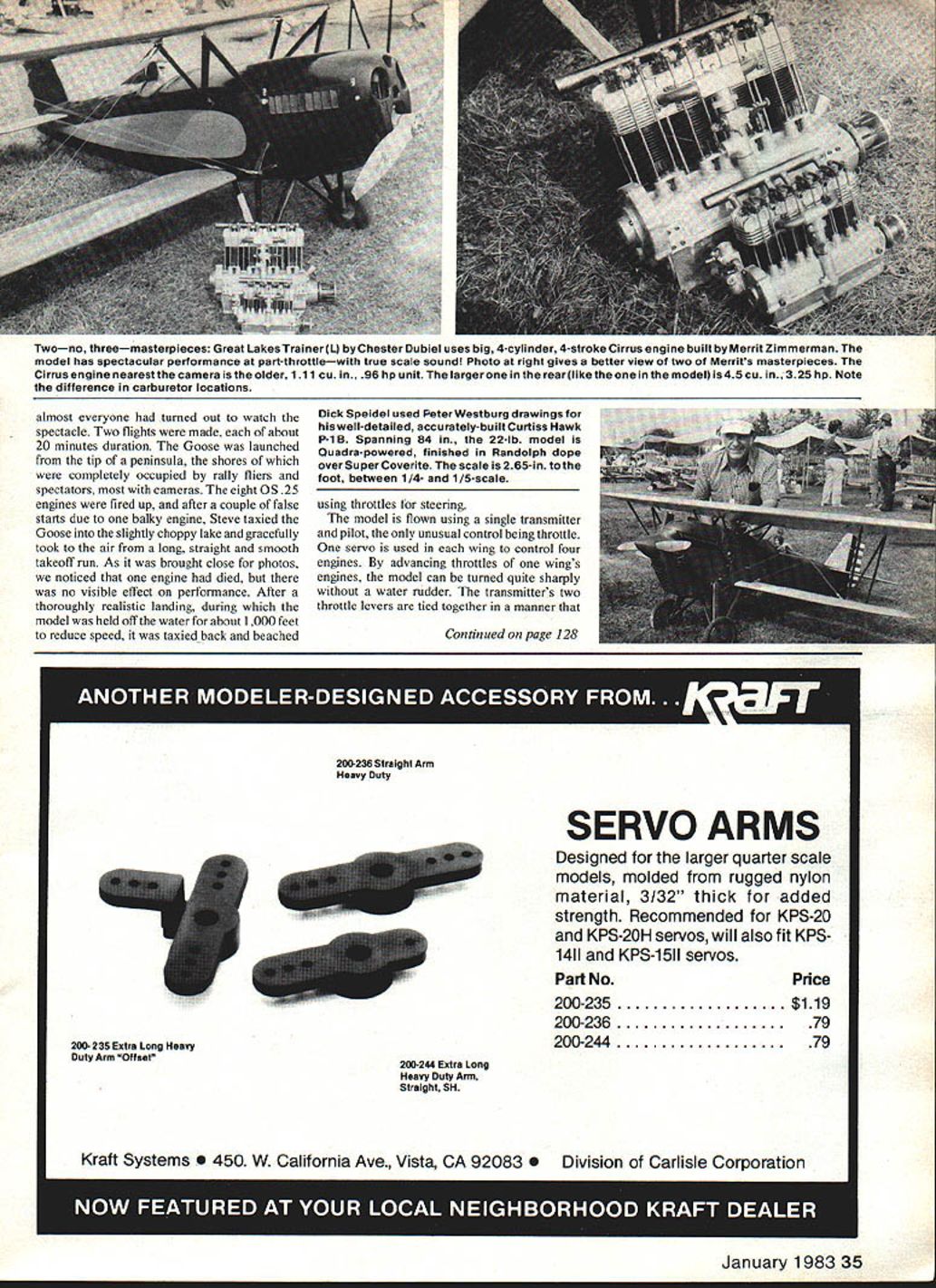 Radio Control SCALE Bob & Dolly Wischer THE Kitchener-Waterloo All-Scale Rally tendance Flying Dutchmen Club K-W Rally 163 registered airplanes lower previous years model parking space again completely occupied reason 80% models Giant Scale class percentage has increas ing exponential rate Kit manufacturers tell us small Scale models still mainstay business Giant Scale seems dominate rallies suspect small models present K-W kept modelers cars probably because overshadowing effect two classes meet Giant Scalers attracted rallies very few attend contests Only six Giants appeared Lincoln Nats contestquality airplanes compared what seen rally Howard Hughes Spruce Goose flying boat built Steve Gray Frank Evans Tom Dietrich again display past several yearsthis time note map taped its wing telling intention fly 16-ft span 50-lb foam plywood model lake Saturday evening arrived lake located park about five miles distant find ays Bellanca WB2 scaled Smithsonian 3-view drawings Quadra powers 20-lb model finished FabriKote dope Hughes Spruce Goose back ground handiwork Steve partners Evans Dietrich Steve Gray pilots big Hughes H-4 landing water Its eight OS 25s still running 1 6-ft model weighs 50 lbhas balsa fuselage 1/16-veneer-over-foam wings new built-up wing works will reduce weight pair ot ireat Lakes Trainers seen Kitchener-Waterloo Scale Rally identical twins foreground 1/6-scale has 54-in span built Dick Murray An 05 45 powers its finished Super Coverite Hobbypoxy background quarter-scale has Quadra engine built Jack Schroder Its finish polyester material Randolph dope Both scratch-built Peter Westburgs scale drawings Frank Knowles quarter-scale OH Chipmunk all-balsa constructionEvent Manager Willard Dedels host Kitchener-Waterloo Flying aglass-cloth/resinfinish exceptCoveriteon open areas ltweighsDutchmen Club Quadra-powered Stinson SR-6 scaled 191b usesstandard-sizeservosexceptontheflapswhichusearetractWylam plans spansla3 weighs22 lb model iscoveredwith servo long periods flaps-down flightDacron dope final finish acrylic enamel Twono threemasterpieces Great Lakes Trainer L Chester Dubiel uses big 4-cylinder 4-stroke Cirrus engine built Merrit Zimmerman model has spectacular performance part-throttlewith true scale sound Photo right gives better view two Merrits masterpieces Cirrus engine nearestthe camera older 111 cu g6 hp unit larger rearlikethe model is45 cu 325 hp Note difference carburetor locations almost everyone turned Out watch spectacle Two flights made about 20 minutes duration Goose launched tip peninsula shores completely occupied rally fliers spectators cameras eight OS 25 engines fired up after couple false starts due balky engine Steve taxied Goose slightly choppy lake gracefully took air long straight smooth takeoff run As brought close photos noticed engine died no visible effect performance After thoroughly realistic landing during model held off water about 1000 feet reduce speed taxied back beached Dick Speidel used Peter Westburg drawings well-detailed accurately-built Curtiss Hawk P-i B Spanning 84 22lb model Quadra-powered finished Randolph dope over Super Coverite scale 265-in foot between 1/4- 1/5-scale using throttles steering model flown using single transmitter pilot unusual control being throttle servo used wing control four engines advancing throttles wings engines model can turned quite sharply water rudder transmitters two throttle levers tied together manner Continued page 128 Part No 200-235$119 200-23679 200-24479 January 1983 35 200-236 Straight Arm Heavy Duty SERVO ARMS Designed larger quarter scale models molded rugged nylon material 3/32 thick added strength Recommended KPS-20 KPS-20H servos will also fit KPS 1411 KPS-1 511 servos 200- 235 Estra Long Heavy Duty Arm Offset Price 200-2U Extra Long Heavy Duty Arm Straight SH Kraft Systems 450 W California Ave Vista CA 92083e Division Carlisle Corporation BIG BEAUTIFUL AIRPLANES LOADMASTER 0 STINSON~ VOYAGER Qua e Scae 2 ble carrying 10 lbs cargo Wing Span 93-1/4 2 pcs Mammoth Kits designed Quadra other 2 cycle engines Plywood & Softwood construction $9950 BONZO Almost 1/3 Scale Sport Pylon Pattern Flying 60 Quadra Power Wing Span 54 1 Pc Shipping Charges Included US & Canada RC Scale/Wischers Continued page 35 permits moving either both unison second flight eight engines continued running prove boat wasnt under powered eight small engines Steve climbed usual cruising altitude 100 feet about 400 feet time interval less minute considerable spray during takeof landing engines high above water affected worth 1200-mile round trip K-W part enthusiastic crowd saw heard two models innumerable flights Rudi Mayer Flying Dutchmen Club made several flights 4-scale clippedwing Piper Cub floats Powered Webra 91 swinging large prop Rudis Cub out standing STOL performance very short takeoff landing runs contrast Spruce Goose addition flying boat Steve Gray also brought newest creation rally Bellanca WB2 Skyrocket built Smithsonian three-view drawings Steves Bellanca flown throughout two days along Dick Speidels venerable Fairchild FC-2 have seen GIANT-SCALE PLANS Including Assembly Instructions Available J-5 Airplanes Boats $1 795 SET s inmuwmusus P0 Box 82 Belmont Ontario NOL 150 Phone 1 5194440375 K-W Rally number years two planes same era similar size both Quadra powered formation takeoffs well touch-and-go landings com manded attention Everyone saw Merritt Zimmermans fourcylinder four-stroke Cirrus engine Toledo two years ago will interested latest engines similar construction much larger Displacement 45 cu in. 325 hp swings 20-14 prop 6500 rpm Two engines shown K-W large Great Lakes Trainer built Model Builderdrawings Dee Harwell flown Chester Dubiel model will climb quite steeply flying done part throttle exhaust sound four-cylinder engine listening experience particularly matched airplane used Cirrus engine Bob Nelitz returned K-W Rally 3-scale Piper Cub rare combination seen seldom Giant models near-perfect a