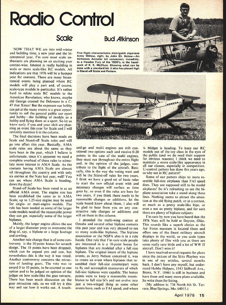 Radio Control Scale NOW THAT WE mid-winter building time new year bi centennial year Im sure scale en thusiasts planning exciting year contest-wise Interest really building scale scale-like RC models indications 1976 will bumper year contests bicen tennial events being planned RC models will play part course scale-type models particular Its rather hard relate scale RC models American Revolution knows maybe old George crossed Delaware C47 Xmas exposure hobby can get events great oppor tunity sell general public sport hobbythe building models hobby flying sport So let us know early club plan ning event year Scale will certainly mention column final decisions have made Scale Stand-off Scale rules will go effect year Basically AMA scale rules about same have past believe unfortunate since its apparent need complete overhaul rules stimu late interest AMA Scale As contests having AMA Scale almost nil throughout country six entries Nats last year well can see AMA Scale heading down drain Stand-off Scale has voted official AMA event engine size has established same AMA Scale up 125-size engine may used single- muti-engine models rule has needed some larger scale models need reasonable power can get especially some larger biplanes Mainly larger engine allows use larger diameter prop overcome drag say biplane large fuselage cowling Another rule change some con troversy 10-point bonus scratch design 10 points have dropped can argued pro con nevertheless way voted Another controversy concerns retrac tion landing gears vote award 0 10 points counted option judged opinion judges scale-like gear retracts has much discussion gear retraction rule will try way see works out touchBud Atkinson Fine flight characteristics distinguish Japanese Army Willow right John Eli BelowAn Airtronics Acrostar kit conversion incredibly Hawker Fury 1930s handi work K K McClure Showing what can done standard kit also has placed high Stand-off Scale Pattern and-go multi engines still con sidered two options receive 0-20 points case multi engines must run throughout entire flight opinion judges con tribute flight aircraft Basi cally way voting went will Stand-off rules two years think have good set basic rules start new official event necessary changes will surface time goes rules two years think needs reasonable changes additions let scale board know about also will glad hear con structive rule changes additions will air column attended multi-wing contest Omaha several other biplane contests past year very pleased see scale-like biplanes biplane association NSPA also rule hassle rule Im sure scale people interested 10-point bonus biplanes modeled after full size biplane original intent biplane events Jerry Nelson conceived create event biplanes re sembled full-size counterpart fly accomplish maneuvers full-size biplanes capable bonus points keep reasonable resem blance full size bis evolve just two-winged thing some other events have such FAI speed /4 Midget heading keep RC models out toy class eyes public need support obvious reasons think need maintain scale-like appearance classes especially competition U-control pattern has done years ago RC pattern Some pattern ships no re semble full-size airplanes FAI speed does supposed still model airplanes So its refreshing see bi plane association take stand along lines Nothing seems attract atten tion old flying patch contest much pretty scale-like bipe pretty biplane sure plenty biplane subjects Im sure now have heard 1976 Nats will held Dayton Ohio sounds like superb choice Air Force museum located offers finest military aircraft displays world scale types take plenty film some really rare birds lot WW II aircraft Dont miss have received several requests plans since picture Stits Playboy articles several months back dont have myself under stand Hobby Helpers 1543 StilIwell Ave Bronx NY 10461 still business have plans available So write listing address 734 North 6th St Ter race Blue Springs Mo 64015 April 1976 15