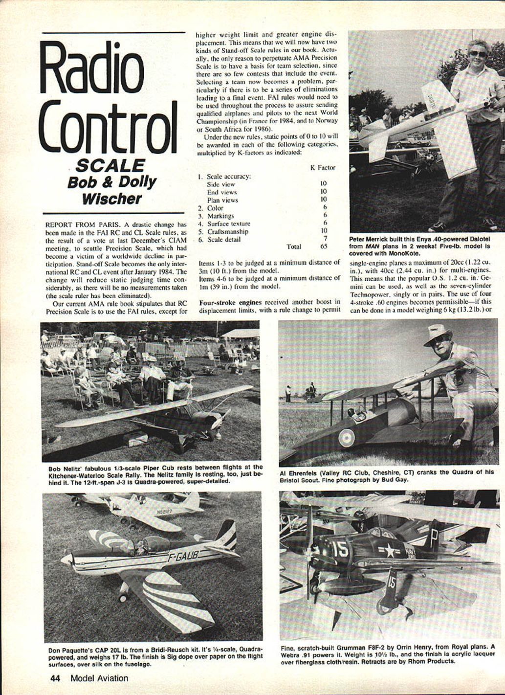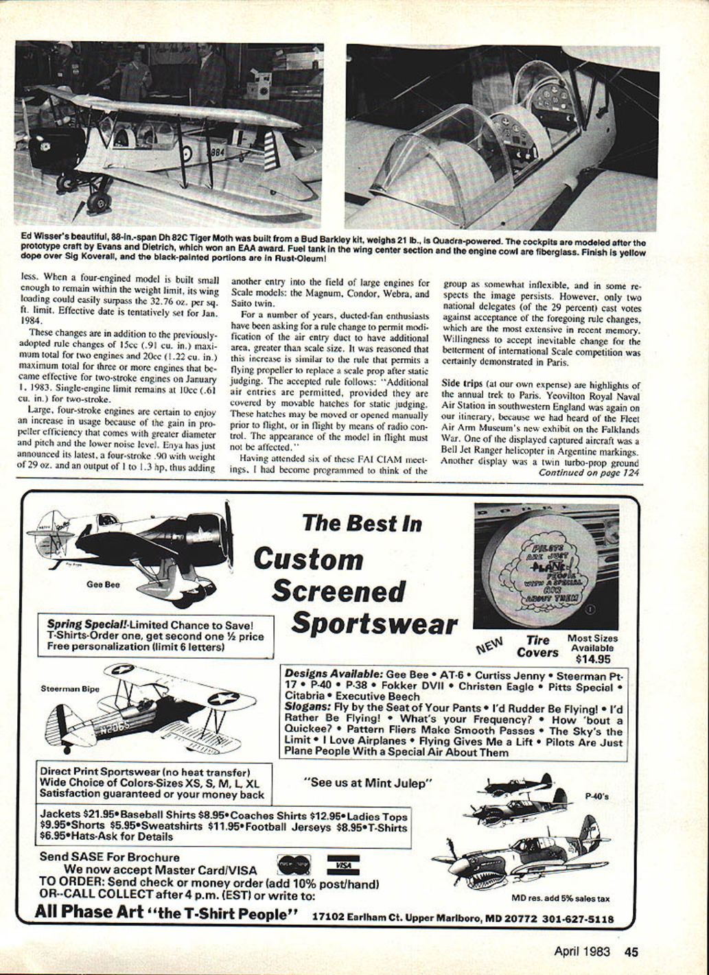 Radio Control SCALE Bob & Dolly Wlscher REPORT FROM PARIS drastic change has made FAI RC CL Scale rules result vote last Decembers CLAM meeting scuttle Precision Scale become victim worldwide decline par ticipation Stand-off Scale becomes inter national RC CL event after January 1984 change will reduce static judging time con siderably will no measurements taken scale ruler has eliminated current AMA rule book stipulates RC Precision Scale use FAI rules except higher weight limit greater engine dis placement means will now have two kinds Stand-off Scale rules book Actu ally reason perpetuate AMA Precision Scale have basis team selection since few contests include event Selecting team now becomes problem par ticularly series eliminations leading final event FAL rules would need used throughout process assure sending qualified airplanes pilots next World Championship France 1984 Norway South Africa 1986 Under new rules static points 0 10 will awarded following categories multiplied K-factors indicated K Factor I Scale accuracy Side view End views Plan views 2 Color 3 Markings 4 Surface texture 5 Craftsmanship 6 Scale detail 10 10 10 6 6 6 10 7 Peter Merrick built Enya 40-powered Dalotel Total65from MAN plans 2 weeksl Five-lb model covered MonoKote Items 1-3 judged minimum distance 3m 10 ft model Items 4-6 judged minimum distance Im 39 model Four-stroke engines received another boost displacement limits rule change permit single-engine planes maximum 20cc 122 cu 40cc 244 cu multi-engines means popular 05 12 cu Ge mini can used well seven-cylinder Technopower singly pairs use four 4-stroke 60 engines becomes permissibleif can done model weighing 6kg 132 lb 44 Model Aviation Bob Neliti fabulous 1/3-scale Piper uuo rests between flights Kitchener-Waterloo Scale Rally Nelitz family resting too lust hind 1 2-ft-span J-3 Quadra-powered super-detailed Al Ehrenfels Valley RC Club Cheshire CT cranks Quadra Bristol Scout Fine photograph Bud Gay Don Paquettes CAP 20L Bridi-Reusch kit Its 1/4-scale Quadrapowered weighs 17 lb finish Sig dope over paper flight surfaces over silk fuselage Fine scratch-built Grumman F8F-2 Orrin Henry Royal plans Webra 91 powers Weight 10V2 lb finish acrylic lacquer over fiberglass cloth/resin Retracts Rhom Products less four-engined model built small enough remain within weight limit its wing loading could easily surpass 3276 oz per sq ft limit Effective dale tentatively set Jan 1984 changes addition previouslyadopted rule changes 15cc 91 cu maxi mum total two engines 20cc 122 cu maximum total three engines came effective two-stroke engines January 1983 Single-engine limit remains 10cc 61 cu two-stroke Large four-stroke engines certain enjoy increase usage because gain pro peller efficiency comes greater diameter pitch lower noise level Enya has just announced its latest four-stroke 90 weight 29 oz output Ito 13 hp thus adding another entry field large engines Scale models Magnum Condor Webra Saito twin number years ducted-fan enthusiasts have asking rule change permit modi fication air entry duct have additional area greater scale size reasoned increase similar rule permits flying propeller replace scale prop after static judging accepted rule follows Additional air entries permitted provided covered movable hatches static judging hatches may moved opened manually prior flight flight means radio con trol appearance model flight must affected Having attended six FAI ClAM meet ings become programmed think group somewhat inflexible some re spects image persists However two national delegates 29 percent cast votes against acceptance foregoing rule changes extensive recent memory Willingness accept inevitable change betterment intemational Scale competition certainly demonstrated Paris Side trips own expense highlights annual trek Paris Yeovilton Royal Naval Air Station southwestem England again itinerary because heard Fleet Air Arm Museums new exhibit Falklands War displayed captured aircraft Bell Jet Ranger helicopter Argentine markings Another display twin turbo-prop ground Continued page 124 Spring Special-Limited Chance Save T-Shirts-Order get second 1/2 price Free personalization limit 6 letters Steerman Bipe rect Print Sportswear no heat transfer Wide Choice Colors-Sizes XS 5 M 1 XL Satisfaction guaranteed money back Best Custom Screened Sports wear See us Mint Julep Jackets $21 95 Baseball Shirts $895 Coaches Shirts $1295 Ladies Tops $995Shorts $595Sweatshirts $1195 Football Jerseys S895T-Shirts $695 Hats-Ask Details Send SASE BrochurerI now accept Master Card/VISA TO ORDER Send check money order add 10% post/hand OR--CALL COLLECT after 4 pm EST write toMD res add 5% sales tax Phase Art T-Shirt People 17102 Earlham Ct Upper Marlboro MD 20772 301-627-5118 j April 1983 45 Ed Wissers beautiful 88-in-span Dh 82C Tiger Moth built Bud Barkley kit weighs 21 lb Quadra-powered cockpits modeled after prototype craft Evans Dietrich won EAA award Fuel tank wing center section engine cowl fiberglass Finish yellow dope over Sig Koverall black-painted portions Rust-OleumI TireAvailable Most Sizes Covers $1495 Designs Available Gee Bee iss Jenny rman Pt 17 er DVII sten Eagle s Special Citabria utive Beech Slogans Fly Seat Pants udder Flying ather Flying s Frequency Quickee ern Fliers Make Smooth Passes Limit Airplanes ng Gives Lift ts Are Just Plane People Special Air About /tc77S UPER-MICRO WORLDSRadio Control SMALLEST SERVO Rx & COMPLETE R/C SYSTEM SUPER-MICRO Servo 47oz~64x3l/32 x 13/32 lSozn oil positivedeJAlOO Rx 4CM max48X4ght 54oz ~mpatible g MN R eI Tx other makes ITEMSYSTEMSP~KS 2CH 29oz 3CM oz 4CH \299521695 388 oz 5CM3089521995 416 oz *SERVO $3495 MICRO RX $81 954 CM *Micro Deans plug others $250 extra I SHIPPING Systems $650 Flite Packs $450 ServosRx $300 VISA Calif add Sales Tax 20% deposit C 0 Ds Brochure 7& I j US $200 Foreign CASH DISCOUNT PRICES SHOWN 13400-26_Saticay StreetNorth Hollywood Calif 91605FIre linois Radio Society newsletter edited Bill Siebenhaar neat ide