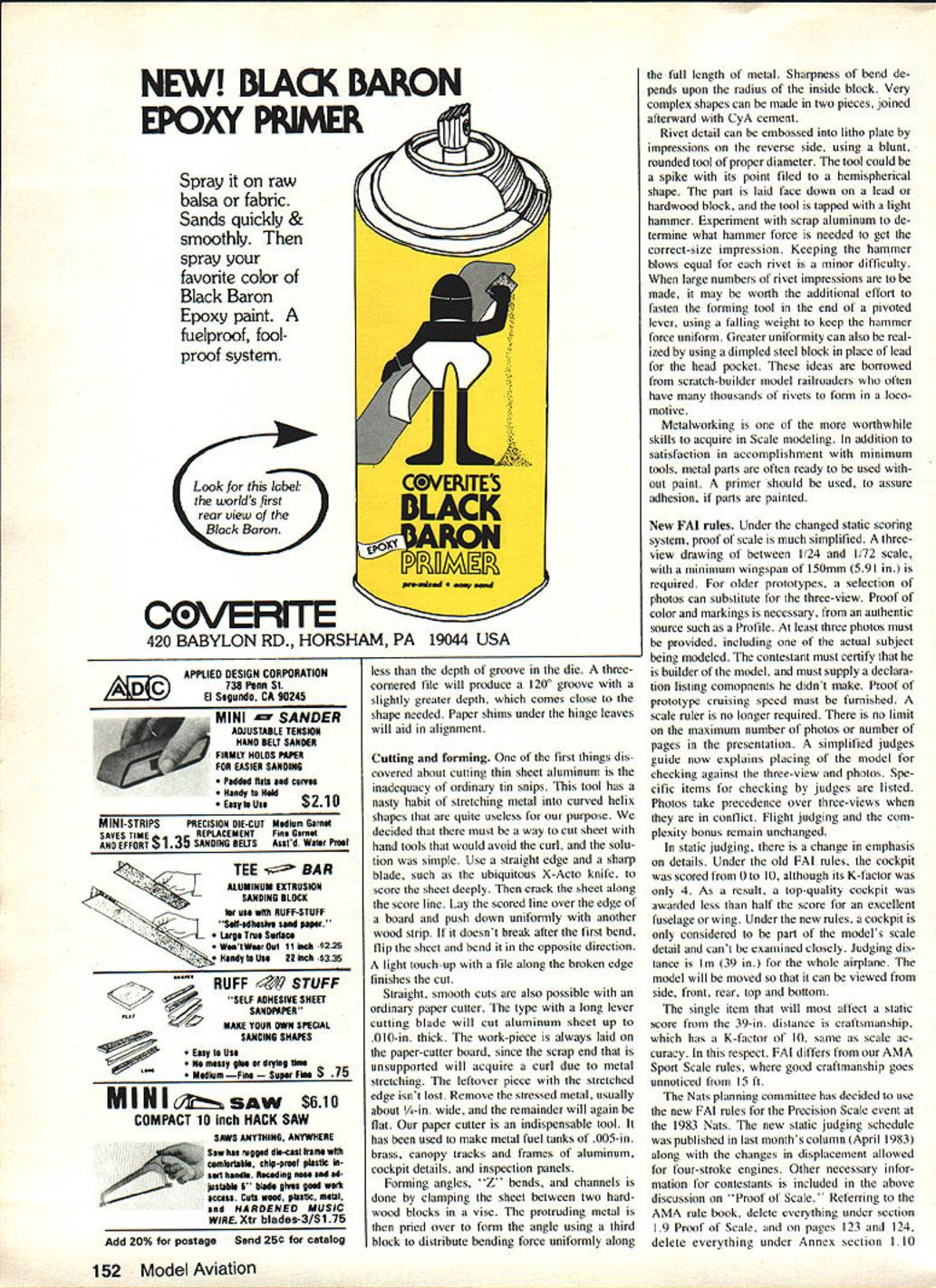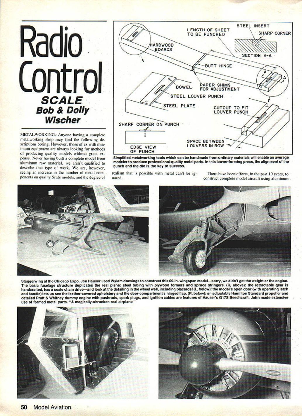 Radio Control SCALE Bob & Dolly Wlscher METALWORKING Anyone having complete metalworking shop may find following de scriptions boring However us min imum equipment always looking methods producing quality models great ex pense Never having built complete model aluminum raw material arent qualified describe type work however seeing increase number metal com ponents quality Scale models degree Simplified metalworking tools can handmade ordinary materials will enable average modeler produce professional-quality metal pans louver-forming press alignment punch die key success realism possible metal cant ig nored have efforts past 10 years construct complete model aircraft using aluminum Staggerwing Chicago Expo Jon Hauser used Wylam drawings construct 69-in wingspan modelsorry didnt get weight engine basic fuselage structure duplicates real plane steel tubing plywood formers spruce stringers R above retractable gear handcrafted has scale chain driveand look detailing wheel well including placards L below models open door operating latch handle lets us see leather-covered upholstery door-compartments hinged flap R below adjustable Hamilton Standard propeller detailed Pratt & Whitney dummy engine pushrods spark plugs ignition cables features Hausers G175 Beechcraft John made extensive use formed metal pafls magicalIyshrunken real airplane 50 Model Aviation TO BE PUNCHEDSHARP CORNER SECTION A-A A PAPER SHIMS DOWELFOR ADJUSTMENT STEEL LOUVER PUNCH STEEL PLATECUTOUTTO FIT LOUVERPUNCH SHARP CORNER ON PUNCH SPACE BETWEEN EDGE VIEWLOUVERS IN ROW OF PUNCH sheet exact duplication full-size pro totype including internal structure have semi-successful flying models weight radio problems probable nega tive factors Jerry Fingler produced completely metal-covered balsa Shinn 2150A spec tacular beauty Radio noise due chafing alu minum sheets suspected reason its control difficulties changing radios using whip antenna some success attained raw material commonly used applications aluminum litho sheet 005-in 010-in thickness exterior applications supplier local newspaper time gave us sheets no charge used once print page recently have heen asked pay about 25g sheets scrap value aluminum quite hard would difficult form compound curves unless annealed heating quenching best use material tiat pieces simple forms recent models have parts made sheets Litho plate comes us liberal coating printers ink needs removed sol vent have used cleaning fluid gasoline alco hol dope thinner acetone equal success surface etched printed matter photos becomes reverse side part being formed exterior smooth Forming louvers average modeler doesnt have unlimited facilities metal work would like punch row louvers litho sheet will probably surprised find necessary materials close hand have used hardwood die holders metal em ployed actual point cutting maintain alignment between punch die two pieces hardwood X 10 average work hinged end 3-in dimension would make louvers /2 2-in long longer louvers increase board width suit 10-in length may vary depending length aluminum sheet punched hinge ordinary cabinet butt-type 2 3-in long Continued page 148 Gator RIC Products 3713 Pompano Dr Pensacola FL 32514 Phone AC 904 476-8639 ENGINE SLEEVE & BEARING PULLER Pull tight sleeves bearings easily damage Cone cone espanding brass ring grips sleeve bearing 10 new 60s 17MM rear bearing *SPECIAL* Both $1395 NewNew WING TUBE & SOCKETS 1 V dia aluminum alloy tubing plug-in wings Included pair special slip-fit phenolic sockets build wingstruct 2024 alum tube 24 long socket 12 long 58951 set TIGER TAIL 4 Ron Chidgeys latest best series little larger lighter slower retains honest flight characteristics ifs predecessors Especially recommended sportsman advanced pattern also good choice turn around pattern Plans construction hints- $995 ENDANNER USA MODELING PRODUCTE INC DEPTA U Po Box sie STOWN PA 19464 37-1231 ELECTRIC RETRACTS GIEZENDANNER Two Time World Champion REGULAR RETRACTS 5/32 Pattern- Up 10 lbs HEAVY DUTY RETRACTS 3/16 ForScale-lOto 18 lbs EXTRA HEAVY DUTY RETRACTS 1/4 Big Ones 18 50 lbs retract Slip Clutch prevent jamming stripping gears Left GMP-2001-R Regular Right GMP-2001 -D Deluxe Dealers Invited ELECTRONIC DIGITAL TACHOMETERS GMP-2001-D Visible display ble low battery display 2 & 3 Bladed props W liquid display Crystal controlled GMP-2001 -R Visible display Visible low battery display 2 Bladed W liquid display Crystal controlled Catalog Available Ideal beginner well master flier CHARGE IT Yes have Giezendanner Wipers 3 Bladed Low-Noise Glass Filled Props May 1983 51 Richard Guinlan displayed exquisite Douglas DC-3 Chicago Expo began Royal kit spans 83 has two K&B 408 real metal skin Its aluminum refrigerator insulation Take careful note scale props antennas landing gear details door hinges Interior has curtains seats model required two years building time GP nhuJu rn II dEi - I 1981 -82 World RIG Aerobatic C dpi Winner 7 Consecutive Las Vegas Tournament Champions Shown above Giezendanner GMP 2001 -D Digital Tachometer See Dealer Order Direct Include 75 Per Item UPS THE new POWRTOW WINCH ZIP & LONGER BATTERY LIFE Power size sailplane current draw -kiting & manual drum brakes adjustable speed parachute turn-a round foot switch 115 lb braided line use iith RETRIEVER launch-a-minute flightsan end line shagging delays line crossings drag free operation tangles heavy-duty cables Clips braided 301blinetow ribbonhand switch line guides ball bearing swivels DAVEY SYSTEMS CORPORATION ONE ROOD LANEMALVEEN PA 19355 215644-0692 Write call information Cam-Axial/Paul Continued page 48 Although first engines have conceived model airplane propulsion units mind little imagination can lead visualize other uses Since dont see need new technologies material processes should production pos sibilities utilizing latest materials methods Using current state art equiv alent present-day engine manufacturing would expect some Cam-Axial engine possible advantages might i
