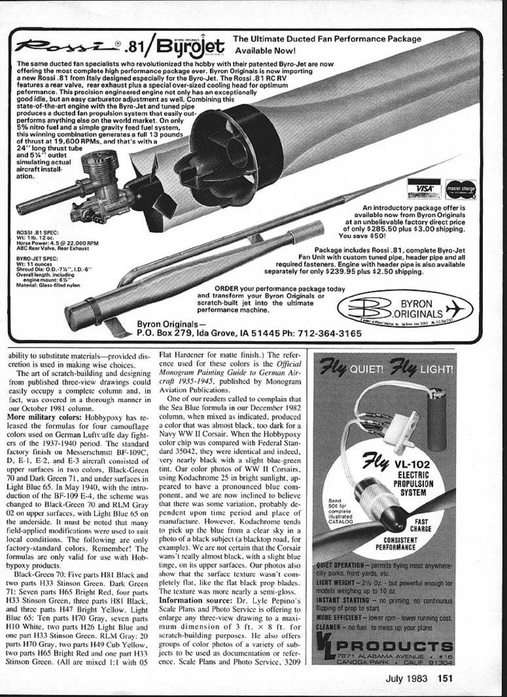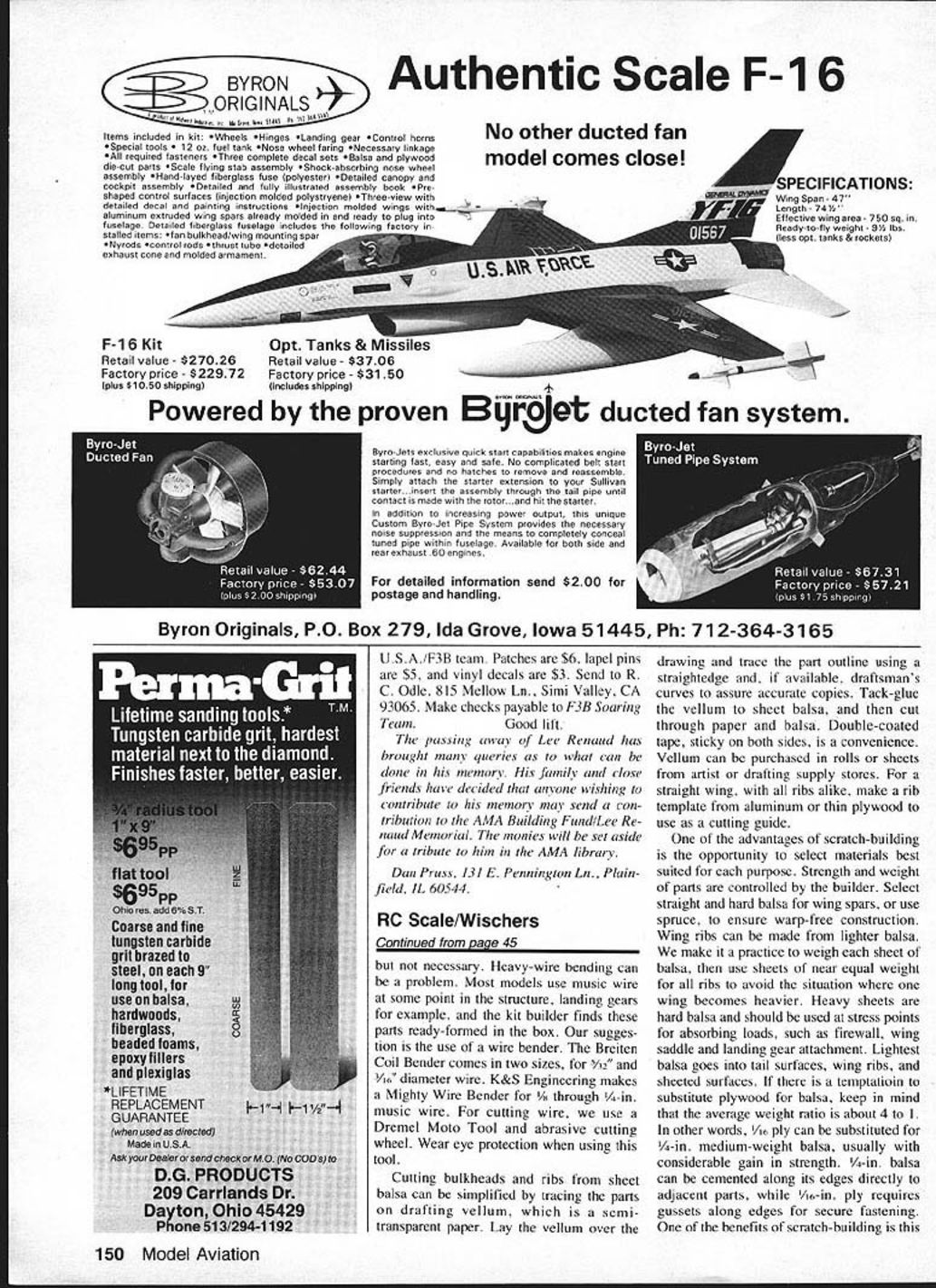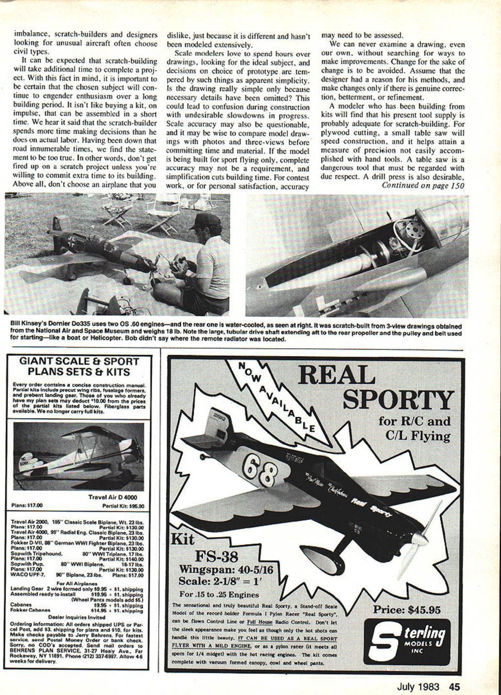 Radio Control SCALE Bob & Dolly Wischer SCRATCH-BUILDING term scratch differs meaning among model ers depending upon degree originality required complete project some extensive modification kit qualifies scratch-building other end scale modeler may go extremes orig inating drawings measurement prot6type before designing building model between two types builders us build drawings supplied plans services magazines Kit builders ready venture scratch-building first time need bit encouragement Building plans can lead modelers desire develop own plans route hobby acquires new designers first attempt scratch-building Scale model came result dissat isfaction kit 50 years ago knowing about three-view drawings almost nonexistent time model designed photos found book Standard Oil Co Indiana showing excellent side front top views Laird LCB biplane flight Know ing basic dimensions span length model designed photos Short comings method lack cross sections fuselage airfoil Laird rather simple airplane rectangular fuselage section rounded turtle deck model actually re sembled prototype use photos make model draw ings remains viable expedient now acquired knowledge camera techniques can produce accurate drawings need spend hours measuring actual airplane Long-focal-length lenses necessity avoid distortion Direct top bottom views impossibility course modelers imagination fills missing portions Working photos has brought up status fine art some modelers Being capable working such minimum sources need no help model have contestquality scale accuracy average builder would wise start reliable threeview published model construction draw ings least five types scratchbuilders 1 Kit modifiers 2 Builders published model construction drawings 3 Designers construction drawings published three-views 4 Designers original factory construction drawings diffi cult acquire 5 Designers measure prototypethe ultimate scratch-builders sweat tears Extent motivation will determine course follow Probably 95% scratch Scale models originate type No 2 immense quantity drawings available certainly path least resistance magazines offer lists drawings advertised plans services augment total published master list has 1600 Scale plans however heavy emphasis WW II planes civil types havent extensively modeled ex cept ubiquitous Cub Because 44 Model Aviation Mal Gatford modified Dively kit build Grumman TBF Avenger Model spans 81 weighs 15 lb uses 14 ci Rhino engine Finish Poly S paint over K&B primer torpedo doors open model emits machine gun sound effects Bill Kleinhans built Aeronca C-3 Balsa USA kit An OS fourstroke 60 powers 1 1-tb beauty Covering polyester fabric finish nitrate dope just like real Bob seems like models Emeraude Dick Konkle 1/3-scale rendition powered Quadra Seen 82 Mint Julep Benny Howard Ike racer trom Paul Malls Historical Aviation Album draw ings Jim Petrezka Displayed Chicago Expo imbalance scratch-builders designers looking unusual aircraft often choose civil types can expected scratch-building will take additional time complete proj ect fact mind important certain chosen subject will con tinue engender enthusiasm over long building period isnt like buying kit impulse can assembled short time hear said scratch-builder spends time making decisions does actual labor Having down road innumerable times find state ment too true other words dont get fired up scratch project unless youre willing commit extra time its building Above dont choose airplane dislike just because different hasnt modeled extensively Scale modelers love spend hours over drawings looking ideal subject decisions choice prototype tem pered such things apparent simplicity drawing really simple because necessary details have omitted could lead confusion during construction undesirable slowdowns progress Scale accuracy may also questionable may wise compare model draw ings photos three-views before committing time material model being built sport flying complete accuracy may requirement simplification cuts building time contest work personal satisfaction accuracy may need assessed can never examine drawing own searching ways make improvements Change sake change avoided Assume designer reason methods make changes genuine correc tion betterment refinement modeler has building kits will find present tool supply probably adequate scratch-building plywood cutting small table saw will speed construction helps attain measure precision easily accom plished hand tools table saw dangerous tool must regarded due respect drill press also desirable Continued page 150 July 1983 45 Bill Kinseys Dornier Do335 uses two OS 60 enginesand rear water-cooled seen right scratch-built 3-view drawings obtained National Air Space Museum weighs 18 lb Note large tubular drive shaft extending aft rear propeller pulley belt used startinglike boat Helicopter Bob didnt say remote radiator located GIANT SCALE & SPORT PLANS SETS & KITS order contains concise construction manual Partial kits include precut wing ribs fuselage formers prebent landing gear already have plan sets may deduct 1000 prices partial kits listed below Fiberglass parts available no longer carry full kits Plans $1700 Travel Air 2000 105 classic Scale Biplane Wt 23 lbs Plans $1700Partial Kit $13000 Travel Air 4000 99 Radial Eng classic Biplane 23 lbs Plans $1700 Partial Kit $13000 Fokker DVII 99 German WWI Fighter Biplane 23 lbs Plans $1700Partial Kit $13000 Sopwith Tripehound80 WWI Triplane 17 lbs Plans $1700Partial Kit $14000 Sopwith Pup80 WWI Biplane16-17 lbs Plans $1700 Partial Kit $13000 WACO UPF790 Biplane 23 lbsPlans $1700 Airplanes Landing Gear 2 wire formed $995 hipping Assembled ready install $1995 hipping lWheel Pants models add $51 Cabanas $995 hipping Fokker Cabanas $1495 hipping Dealer Inquiries Invited Ordering information orders shipped UPS Par cel Post add $3 shipping plans $10 kits Make checks payable Jerry Behrens fastest service send Postsl Money Order bank check Sorry no CODs accepted Send mai