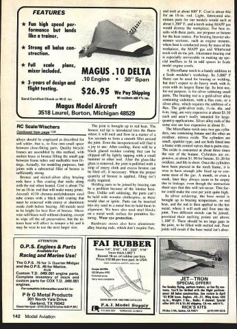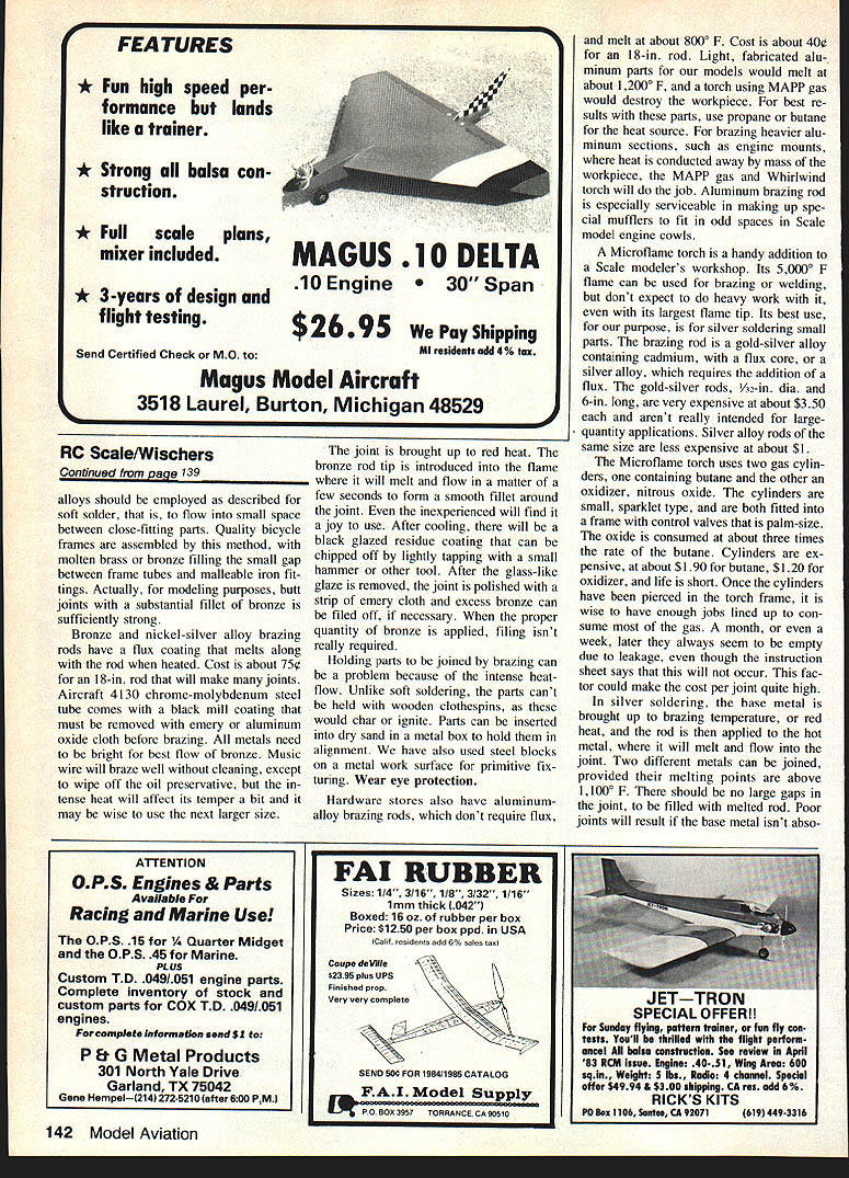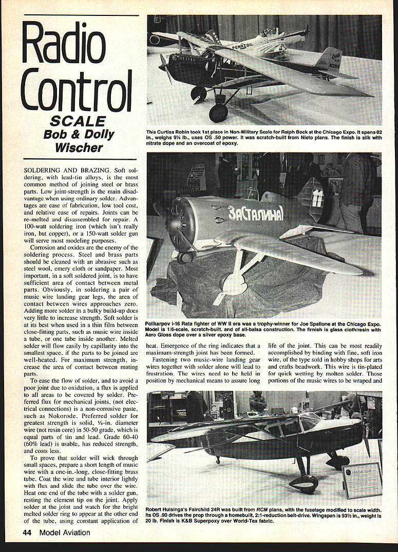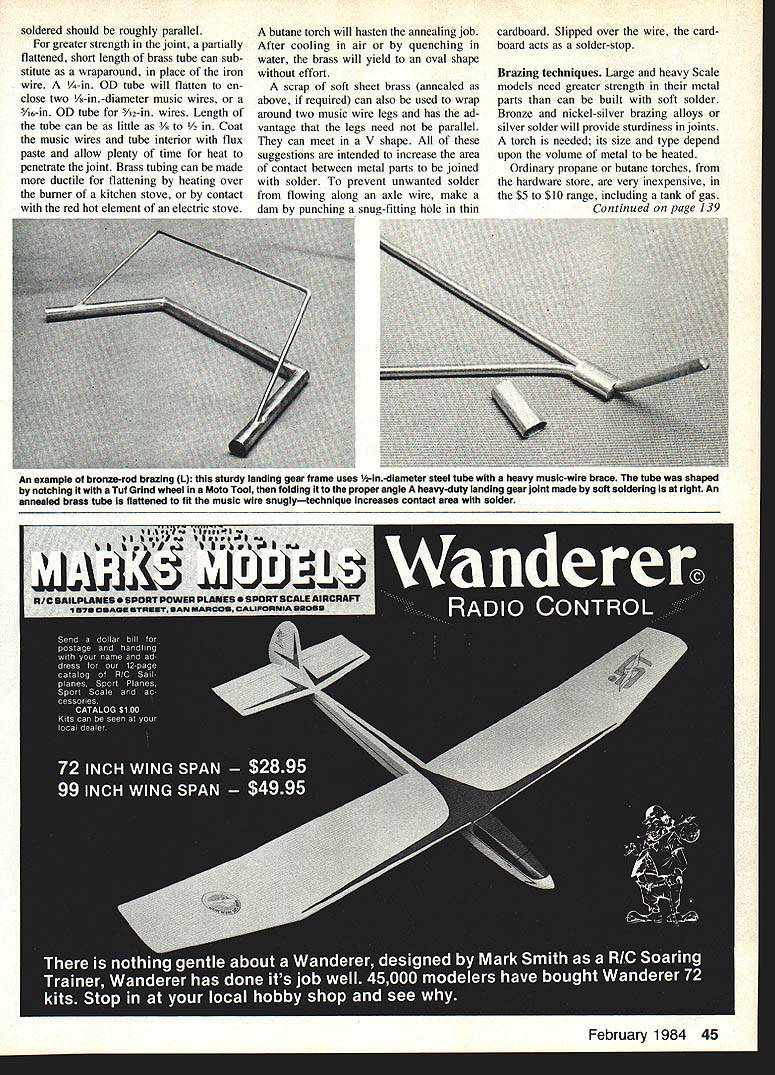 Radio Control SCALE Bob & Dolly Wischer SOLDERING AND BRAZING Soft sol dering lead-tin alloys common method joining steel brass parts Low joint-strength main disad vantage using ordinary solder Advan tages ease fabrication low tool cost relative ease repairs Joints can re-melted disassembled repair 100-watt soldering iron isnt really iron copper 150-watt solder gun will serve modeling purposes Corrosion oxides enemy soldering process Steel brass parts should cleaned abrasive such steel wool emery cloth sandpaper Most important soft soldered joint have sufficient area contact between metal parts Obviously soldering pair music wire landing gear legs area contact between wires approaches zero Adding solder bulky build-up does very little increase strength Soft solder its best used thin film between close-fitting parts such music wire inside tube tube inside another Melted solder will flow easily capillarity smallest space parts joined well-heated maximum strength crease area contact between mating parts ease flow solder avoid poor joint due oxidation flux applied areas covered solder Pre ferred flux mechanical joints elec trical connections non-corrosive paste such Nokorode Preferred solder greatest strength solid -in diameter wire resin core 50-50 grade equal parts tin lead Grade 60-40 60% lead usable has reduced strength costs less prove solder will wick through small spaces prepare short length music wire one-in-long close-fitting brass tube Coat wire tube interior lightly flux slide tube over wire Heat end tube solder gun resting element tip joint Apply solder joint watch bright melted solder ring appear other end tube using constant application heat Emergence ring indicates maximum-strength joint has formed Fastening two music-wire landing gear wires together solder alone will lead frustration wires need held position mechanical means assure long life joint can readily accomplished binding fine soft iron wire type sold hobby shops arts crafts beadwork wire tin-plated quick wetting molten solder portions music wires wraped 44 Model Aviation Curtiss Robin took 1st place Non-Military Scale Ralph Beck Chicago Expo spans 82 weighs 9 lb uses OS 50 power scratch-built Nieto plans finish silk nitrate dope overcoat epoxy Pollkarpov 1-16 Rats fighter WW II era trophy-winner Joe Spallone Chicago Expo Model 1/6-scale scratch-built all-balsa construction firnish glass cloth/resin Aero Gloss dope over silver epoxy base Robert Nuisingas Fairchild 24R pau wm fuselage modified scale width Its OS 90 drives prop through uu. -rduction belt-drive Wingspan 93 weIght 20 lb Finish K&B Superpoxy over Worid-Tex fabric soldered should roughly parallel greater strength joint partially flattened short length brass tube can sub stitute wraparound place iron wire -in OD tube will flatten en close two /sin-diameter music wires 5A6-in OD tube 5A2-in wires Length tube can little t music wires tube interior flux paste allow plenty time heat penetrate joint Brass tubing can made ductile flattening heating over burner kitchen stove contact red hot element electric stove butane torch will hasten annealing job After cooling air quenching water brass will yield oval shape effort scrap soft sheet brass annealed above required can also used wrap around two music wire legs has ad vantage legs need parallel can meet V shape suggestions intended increase area contact between metal parts joined solder prevent unwanted solder flowing along axle wire make dam punching snug-fitting hole thin cardboard Slipped over wire card board acts solder-stop Brazing techniques Large heavy Scale models need greater strength metal parts can built soft solder Bronze nickel-silver brazing alloys silver solder will provide sturdiness joints torch needed its size type depend upon volume metal heated Ordinary propane butane torches hardware store very inexpensive $5 $10 range including tank gas Continued page 139 An example bronze-rod brazing L sturdy landing gear frame uses 1k-in-diameter steel tube heavy musIc-wire brace tube shaped notching Tuf Grind wheel Moto Tool folding proper angle heavy-duty landing gear loint made soft soldering right An annealed brsss tube flattened fit music wire snuglytechnique Increases contact area solder February 1984 45 Epilogue subject aerodynamics bit complex have tried make seem intention articles try expose reader subject rational light fashionyet giving some useful formulas relationships ex ample say CL 10 typical models quite true general way effects aspect ratio air foil selection etc can change some what some critics have loudly indicated such criticism must reply am trying take complicated subject put fairly simple terms can digested average reader hope discussion Lift Equation has interest want know about design Questions comments may ad dressed Brad Powers 5470 Castle Hills Dr San Diego CA 92109 RC Scale/Wischers Continued page 45 Light steel parts can brazed 23000 F flame either kind gas heavier metal such l/.in.diameter steel tube landing gears torch suitable use MAPP methyl acetylene pro padiene gas preferred Its flame tempera ture used appropriate torch such Master Mechanic Whirlwind $24 36000 F gas about three times expensive propane s2n3 New Standard Giant Models 28 HP Lbs Send $100 Catalog 149 Direct Sales Only PIns hippsg Work Horse rel7fl 96 IORITZ 2a4 32 HP 6A Lbs III Dealer Direct PIns sblppiq Now Distribute Sachs-Dolmar Engines Yeager Machines TO RUN INCLUDING 6 BOLT PROP HUB AVAILABLE AT EXTRA CHARGE Nm ___ ___ NGINERear 340w Cleveland Isve. SW EU EEECanton OH 44707I IC DIVISIONPhone 216484-6810 48443741 job finished time because intensely hot flame actual cost per joint remains about same /2-in -diameter 035-in -wall aircraft steel tube brought red heat ready brazing bronze rod about ten seconds out red heat steel brazed bronze rod brazing alloy will melt flow uniformly around joint Insufficient heat primary reason lack success brazing Whirlwind torch has pres sure adjustment permits its use pr