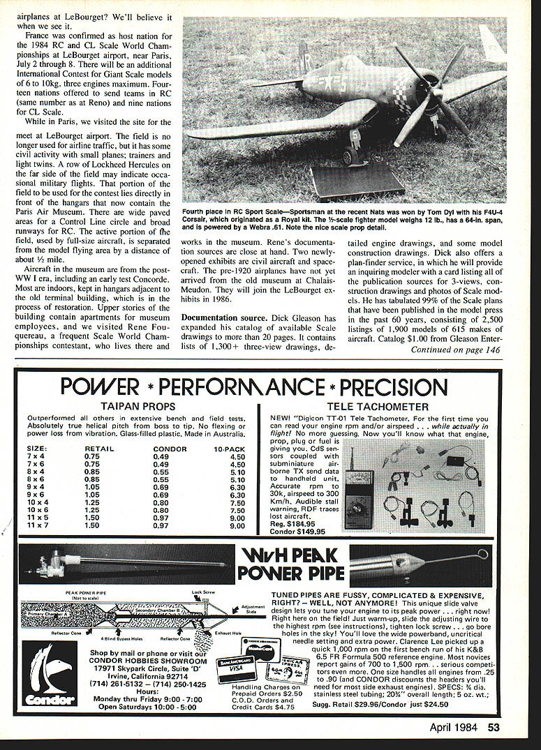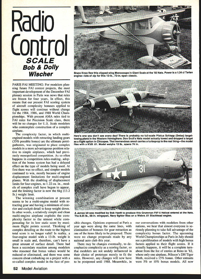 Radio Control SCALE Bob & Dolly Wlscher PARIS FAI MEETING modelers plan ning future FAI contest projects important development December FAI plenary session Paris news rules frozen four years effect means present FAI scoring system aircraft complexity bonuses applied flight scores will continue change 1984 1986 1988 World Cham pionships present AMA rules tied FAI rules Precision Scale class will no changes US Scale modelers contemplate construction complex airplane complexity factor multiengined models retracting landing gears 35% possible bonus ultimate pointgatherers originated place complex models advantageous position rela tive simple airplanes previ ously monopolized competition As often happens competition rules-making adop tion bonus system has delayed effect type models being used first no effect simpler models continued win mostly because engine displacement limitations multi-engined planes doubling displacement limits four-engines 122 cu mod els complex craft have begun appear limiting factor now 6kg 132 lb weight limit winning combination present seems multi-engine model re tracting gear having minimum exte rior cockpit detail keep weight down other words relatively simple clean multi-engine airplane exploits com plexity factor utmost com pensating its low static score maxi mum flight points scored Thinking complex detailing route highest total score no longer valid reality four-engine model 13-lb weight small scale therefore cant have great amount surface detail secondary reaction among modelers reasoned bonus values would reduced eliminated some concern about embarking project so-called complex model face pos sible changes Opinions expressed Paris year ago along same lines elimination bonuses gear retraction items likely proposed no change proposals made national aero club year may changes eventually de emphasize complexity scoring factor modelers unduly influenced choice prototype merely fit rules However changes will now have postponed until 1988 Meanwhile conversations modelers other nations hear almost everyone se riously planning take full advantage complexity bonus factor upcoming World Championships Paris July should see proliferation models high bonus factors applied flight scores actually happens will complete turn about list entries Reno 82 airplane Nilssons DH Tiger Moth received 15% bonus Other entrants 5% 10% bonus models new 52 Model Aviation Bruce Knox flew clipped-wing Monocoupe Giant Scale 83 Nats Power 134 ci Tartan enginelots zip 12-lb 72-in-span classic Heres dont see day probably no full-scale Pilatus Schlepp Swiss targettowing plane Western Hemisphere Don Srulls Nats model actually towed dropped target flight option Chicopee tremendous snoot carries turboprop real thingthe model flies KB 61 Model weighs 13 lb spans 74 Jemco kit modified Bob Hanft produce Grumman F6F-5 Hellcat entered Nats 825 lb 58-in wIngspan Navy fighter tiles Webra 61 Blackhead engine airplanes LeBourget Well believe see France confirmed host nation 1984 RC CL Scale World Cham pionships LeBourget airport near Paris July 2 through 8 will additional International Contest Giant Scale models 6 10kg three engines maximum Four teen nations offered send teams RC same number Reno nine nations CL Scale Paris visited site meet LeBourget airport field no longer used airline traffic has some civil activity small planes trainers light twins row Lockheed Hercules far side field may indicate occa sional military flights portion field used contest lies directly front hangars now contain Paris Air Museum wide paved areas Control Line circle broad runways RC active portion field used full-size aircraft separated model flying area distance about /2 mile Aircraft museum post WW era including early test Concorde Most indoors kept hangars adjacent old terminal building process restoration Upper stories building contain apartments museum employees visited Rene Fou quereau frequent Scale World Cham pionships contestant lives works museum Renes documenta tion sources close hand Two newlyopened exhibits civil aircraft space craft pre-1920 airplanes have yet arrived old museum Chalais Meudon will join LeBourget ex hibits 1986 Documentation source Dick Gleason has expanded catalog available Scale drawings 20 pages contains lists 1300 e-view drawings de tailed engine drawings some model construction drawings Dick also offers plan-finder service will provide inquiring modeler card listing publication sources 3-views con struction drawings photos Scale mod els has tabulated 99% Scale plans have published model press past 60 years consisting 2500 listings 1900 models 615 makes aircraft Catalog $100 Gleason EnterContinued page 146 POWER * PERFORNKANCE * PRECISION TAIPAN PROPS Outperformed others extensive bench field tests Absolutely true helical pitch boss tip No flexing power loss vibration Glass-filled plastic Made Australia SIZE 7x4 7x 6 8x4 8x6 9x4 9x6 lOx 4 lOx 6 11 x5 11 x 7 RETAIL 075 075 085 085 105 105 125 125 150 150 CONDOR 049 049 055 055 069 069 080 080 097 097 10-PACK 450 450 510 510 630 630 750 750 900 900 TELE TACHOMETER NEW Digicon TT-01 Tele Tachometer first time can read enoine mm and/or airsneed ntually flight No Now Annine prop plug fuel giving CdS sen sors coupled subminiature air borne TX send data handheld unit Accurate rpm 30k airspeed 300 Km/h Audible stall warning RDF traces lost aircraft Rag $18495 Condor $14995 NvH PEkK PONER PIPE PEAK POWER pIPELoot SOtO toattiTUNED PIPES ARE FUSSY COMPLICATED & EXPENSIVE RIGHT NOT ANYMORE unique slide valve ~ondryCttntb, B~ design lets tune engine its peak power . right nowl Right field Just warm-up slide adiusting wire .Qi "-the highest rpm see instructions tighten lock screw . go bore Rttcto ConEohoott Hotholes sky Youll love wide powerband uncritical 4BIjod Byp, Hot,RtIoto Coo A2-..o....needle setting extra power Clarence Lee picked up quick 1000 rpm first bench run K&B Shop mail phone Visit our65 FR Formula 500 reference engine Most novices CONDOR H