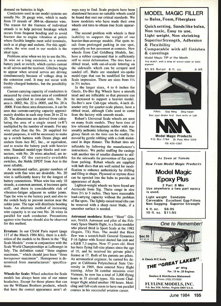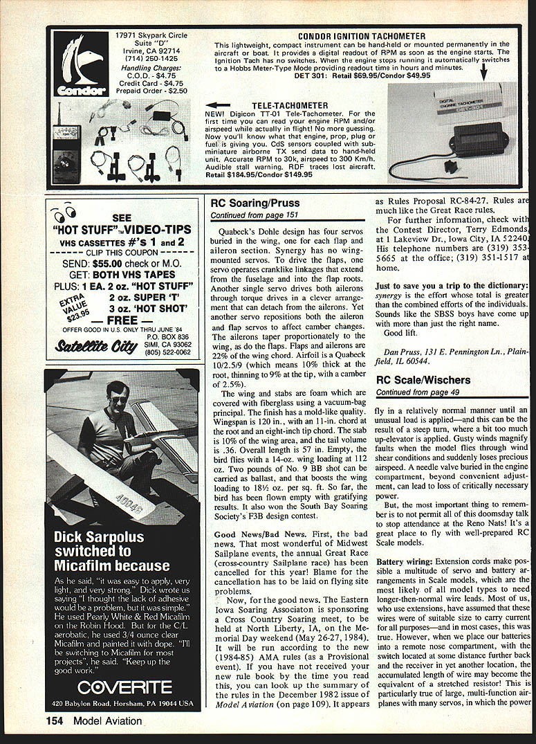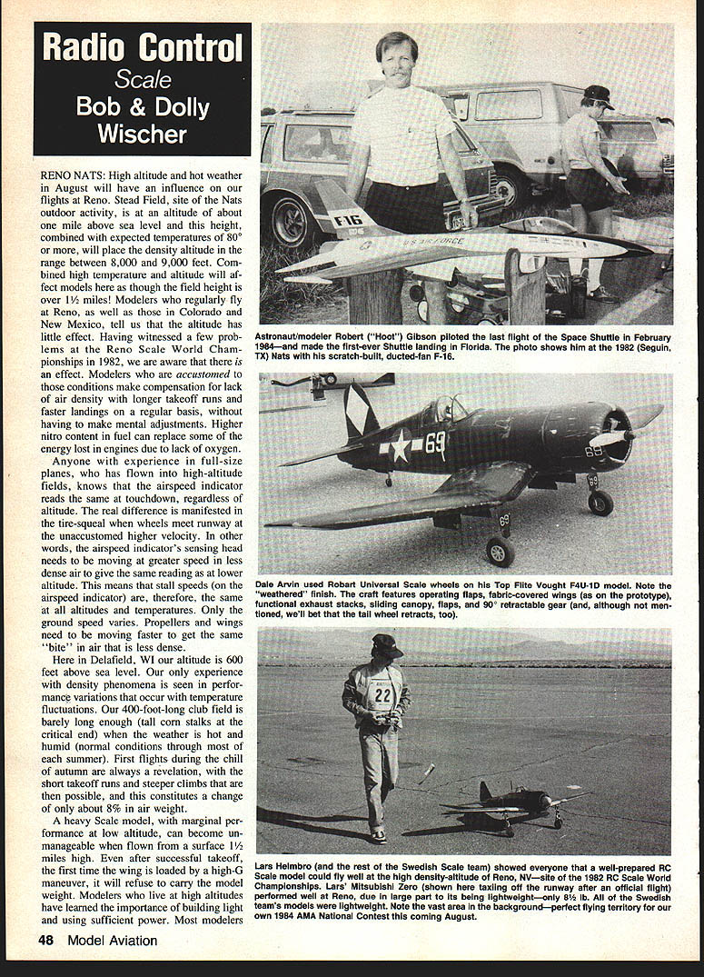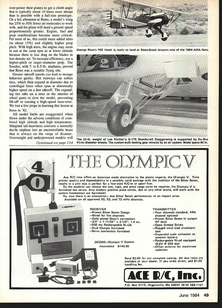 RENO NATS High altitude hot weather August will have influence flights Reno Stead Field site Nats outdoor activity altitude about mile above sea level height combined expected temperatures 800 will place density altitude range between 8000 9000 feet Com bined high temperature altitude will af fect models though field height over 1 /2 miles Modelers regularly fly Reno well Colorado New Mexico tell us altitude has little effect Having witnessed few prob lems Reno Scale World Cham pionships 1982 aware effect Modelers accustomed conditions make compensation lack air density longer takeoff runs faster landings regular basis having make mental adjustments Higher nitro content fuel can replace some energy lost engines due lack oxygen Anyone experience full-size planes has flown high-altitude fields knows airspeed indicator reads same touchdown regardless altitude real difference manifested tire-squeal wheels meet runway unaccustomed higher velocity other words airspeed indicators sensing head needs moving greater speed less dense air give same reading lower altitude means stall speeds airspeed indicator therefore same altitudes temperatures Only ground speed varies Propellers wings need moving faster get same bite air less dense Delafield WI altitude 600 feet above sea level experience density phenomena seen perfor manc variations occur temperature fluctuations 400-foot-long club field barely long enough tall corn stalks critical end weather hot humid normal conditions through summer First flights during chill autumn always revelation short takeoff runs steeper climbs possible constitutes change about 8% air weight heavy Scale model marginal per formance low altitude can become un manageable flown surface 1 /2 miles high after successful takeoff first time wing loaded high-G maneuver will refuse carry model weight Modelers live high altitudes have learned importance building light using sufficient power Most modelers 48 Model Aviation Astronautmodeler Robert Hoot Gibson piloted last flight Space Shuttle February 1984and made first-ever Shuttle landing Florida photo shows him 1982 Seguin TX Nats scratch-built ducted-fan F-16 Dale Arvin used Robart Universal Scale wheels Top Fiite Vought F4U-1 D model Note weathered finish craft features operating flaps fabric-covered wings prototype functional exhaust stacks sliding canopy flaps 900 retractable gear although men tioned well bet tall wheel retracts too Lars Heimbro rest Swedish Scale team showed everyone well-prepared RC Scale model could fly well high densIty-altitude Reno NVsite 1982 RC Scale World Championships Lars Mitsubishi Zero shown taxiing off runway after official flight performed well Reno due large part its being lIghtweightonly 8 lb Swedish teams models lightweight Note vast area backgroundperfect flying territory own 1984 AMA National Contest coming August over-power planes get climb angle typically about 10 times abrupt possible full-size prototype hot afternoon Reno models wing has 25% 30% fewer air molecules work plane will need ground speed proportionately greater Engine fuel prop combinations become critical us could mean added nitro about 15% slightly higher prop pitch high nitro engine may seem run same rpm lower altitude because less drag blades low-density air increase efficiency use higher-pitch larger-diameter prop Swedes 7- 85-lb airplanes proved Reno suitable flying site Greater takeoff speeds can lead strange behavior quirks Hot runways can soften tires expand diameter due centrifugal force spun abnormally higher speed fast takeoff expand ing tire rubs strut interior wheel pants slow model preventing lift-off causing high-speed nose-over lost few props learning lesson Reno 82 model faults exaggerated flown under adverse conditions com bined high altitude high temperature Marginal tail-heaviness converts normally docile airplane uncontrollable beast always verge disaster Overweight underpowered models will Continued page 154 THE OLYIMLPJCV Ace R/C now offers American made alternative plastic imports Olympic V Time proven quality dependability sensible solid package tradition Silver Seven results unit perfect first time R/Cer sport flier So modeler can choose size type price range servo requires Olympic V furnished less servos Any modern positive pulse servos Ace other brand will work system connectors furnished So now alternative Ace Silver Seven performance import price Available approved 50 53 72 mHz channels RECEIVERTRANSMITTER Proven Silver Seven DesignFour channels standard fifth Wired five channels channel optional Gold plated Deans connectorsProven Silver Seven hi output 3/4 x 1-11/32 x 2-1/4 14 oz RF deck 500 ma Rechargeable NicdsOpen Gimbal Sticks Dual Charger furnishedRugged vinyl clad aluminum Servo connectors furnished case Expanded scale voltmeter monitor battery 20G500Olympic V SystemRechargeable Ni-cd equipped 96V @ 500 ma Assembled $14995Offset antenna maximum radiation Send $200 complete catalog Ace items available dealer order direct add $100 handling fee [AU I/C Em PO Box 511E Higginsville Mo 64037 816 584-7121 June 1984 49 George Roses P6E Hawk ready land Reno-Stead Airportsite 1984 AMA Nats 22-lb weight Lee Richters G-175 Beechcraft Staggerwing supported Du-Bro 4-in-diemeter wheels custom-built landing gear retracts air system Model spans 80 CONDOR IGNITION TACHOMETER lightweight compact instrument can hand-held mounted permanently aircraft boat provides digital readout RPM soon engine starts Ignition Tach has no switches engine stops running automatically switches Hobbs Meter-Type Mode providing readout time hours minutes DET 301 Retail $6995/Condor $4995 - TELE-TACHOMETER NEW Digicon TT-01 Tele-Tachometer first time can read engine RPM and/or airspeed actually flight No guessing Now youll know what engine prop plug fuel giving CdS sensors coupled sub miniature airborne TX send data hand-held unit Accurate RPM 30k airspeed 300 Km/h Audible stall warning RDF traces lost aircraft Retail $18495/Condor