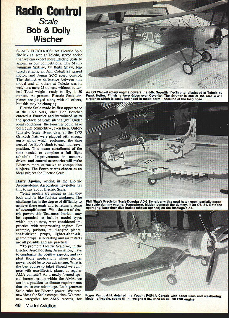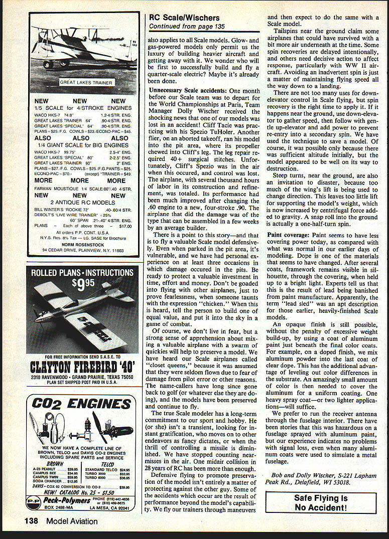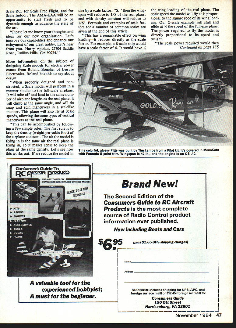 Radio Control Scale Bob & Dolly Wischer SCALE ELECTRICS An Electric Spit fire Mk la seen Toledo served notice can expect Electric Scale appear competitions 61-inwingspan Spitfire Keith Shaw fea tured retracts AFI Cobalt 25 geared motor Jomar SC-2 speed control distinctive difference between model others Toledo its weight mere 25 ounces batter ies Total weight ready fly 80 ounces present Electric Scale air planes judged along others may changing Electric Scale made its first appearance 1973 Nats Bob Boucher entered Fournier introduced us spectacle Scale silent flight Under ideal conditions Fournier could have quite competitive Unfor tunately Scale flying days 1973 Oshkosh Nats plagued strong gusty winds prolonged time needed Bobs climb maneuver position meant curtailment time needed complete full flight schedule Improvements motors drives control accessories will make Electrics attractive competition subjects Fournier chosen ideal subject Electric Scale Harry Apoian writing Electric Aeromodeing Association newsletter has say about Electric Scale Scale models unique look fly like full-size airplanes challenge lies degree difficulty achieve goals return sense accomplishment use elec tric power Scaleness horizon may expanded include model types up now considered im practical reciprocating engines example pushers multi-engine planes shaft-driven props lighter-than-air geared props self-starting air restarts possible practical promote Electric Scale Electric Aeromodeling Association have emphasize positive aspects ex ploit applications electric power would advantage What best course take Should com pete non-Electric planes regular AMA contests As newly-formed spe cial interest group within AMA position dictate requirements advantage Lets generate Scale rules Electric power need new ideas Scale competition need new categories AMA records 46 Model Aviation An OS Wankel rotary engine powers 6-lb Sopwlth 1 -Strutter displayed Toledo Frank Hoffer Finish Aero Gloss over Coverite Strutter rare WW airDianes easily balanced model formbecause lana noe& Phil Nlggs Precision Scale Douglas AD-6 Skyraider cowl hatch open partially expos ma scale dummy engine Somewhere hidden beneath dummy 05 61 Note oidive brakes shownI Roger Vanbuskirk detalied Vought F4U-1A Corsair panel lines weathering Model %-scaie spans 61 weighs 9 lb uses OS 90 FSR engine Scale RC Scale Free Flight Scale Indoor AMA-EAA will opportunity start fresh dynamic enough advance state art Please let know thoughts ideas new organization Lets improve capabilities enhance enjoyment great hobby Lets hear Harry Apoian 27704 Saddle Road Rollins Hills CA 90274 information subject designing Scale models electric power comes Roland Boucher Leisure Electronics Roland has say about design properly designed con structed Scale model will perform manner similar full-scale airplane will take off land same num ber airplane lengths real plane will climb same angle will snap spin maneuvers scalelike manner plane will also fly Scale speeds allowing same types vertical maneuvers real plane can accomplished follow ing few simple rules first rule keep density weight per cubic foot airplane constant air model flying same air real plane flying makes sense keep plane same density Lets see works out reduce model size scale factor 5 wing span will reduce 1/S real plane density constant will reduce l/S Formula examples scale fac tors number common scales given end article has remarkable effect wing loadingit reduces directly scale factor example A-scale ship would have scale factor 4 would have / wing loading real plane scale speed model will fly propor tional square root its wing load ing A-scale example will stall glide speed full-size plane power required fly model directly proportional its speed weight scale power required would Continued page 135 Brand New Second Edition Consumers Guide RC Aircraft Products complete source Radio Control product information ever published Now Including Boats Cars $95plus $165 UPS shipping charges Name ____________________________________________________________[v32][b2083259811100]] Adireee Send $860 includes shipping UPS APO foreign surface maiI $1246 foreign air maii consumers Guide 150 Ott Street Harrlsonburg VA 22801 November 1984 47 colorful glossy Pitta built Tim Lamp Pilot kit Its covered Monoote Formula U paint trim Wingspan 42 engine 05 40 valuable tool experienced hobbyist must beginner Model Magic Filler Quick setting Light weight Non shrinking Fillets Gap filling Ding repair See dealer urst Model Magic Products Model Magic Products PO Box 7784St Paul Minn 55119 715 425-1397 $595 Retail 8 fI oz Adhesion Balsa Foam Fiberglass Strength Flexing Spreading Fuel Resistance Sanding Hardness Finishing Shelf Life Tint Acceptance Water Resistance Comparison Chart Model Magic Excellent Product X Very Poor a Good As medium balsa As Hard Balsa Any fish/covering till used up Excellent Soft balsa Soft balsa ail Spoils i 5lmo Very Poor Test methods arid data avalable request care enough fill very best uisast Model Magc Fler Circus Magic FiNer Nats start Id love cant Nats RC Pattern coverage will handled Steve McCann Pete Callas members National Society Radio Controlled Aerobatics Pete Steve co-District 7 Vice Presidents NSRCA jointly author District 7 submission K-Factor newsletter NSRCA always look forward K-Factor articles know real treat Nats coverage Ron Van Putte 111 Sleepy Oaks Rd Ft Walton Beach FL 32S48 RO ScalelWlschers Continued page 47 reduced real planes power 1/S3 weight factor l/V speed factor Using Y-scale 65 hp Piper Cub example power re quired would 65 p 65 hp Continental engine turned 72-in-diameter prop 2400 rpm 18-in scale-size prop used must turn faster square root scale fac tor 2400 x -VT rpm example A-scale plane given keep math easy results however 108-in-span plane weighing 12 lbsnot exactly schoolyard flier Lets see what happens prac tical scale factor 1% J-3 Cub chosen choice scale results 61-in-span model weig