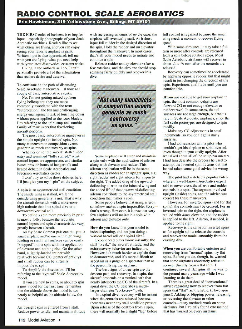RADIO CONTROL SCALE AEROBATICS 1 rTY2 41 I.i1 ] rTYYZ 11 r- i- i ItI1 THE FIRST order business beg inputespecially photographs Scale Aerobatic machines Readers like see what others flying can enjoy seeing favorite airplane print Written input also appreciated tell what flying what need help latest discoveries secret tricks Living outback I cant personally provide information readers desire deserve continue path discussing Scale Aerobatic maneuvers Ill look couple basic autorotative events No Im getting mixed up flying helicopters commonly associated term autorotation fun challenging energy-management task touching down power applied rotor blades Im referring spin-snap-and-tumble family maneuvers fixed-wing aircraft perform basic autorotative maneuver simple upright inside spin maneuvers competition events generate much controversy spins Whether aircraft stalled upon entry remained fully stalled what control inputs appropriate similar issues provide hours hangar talk heated debate Scale Aerobatics Precision Aerobatics circles wont try solve debates Ill just give spin subject spin asymmetrical stall condition inside wing stalled outside wing generally Thats aircraft descends more-nosehigh attitude spiral dive downward vertical roll define spin precisely print mostly folly because requisite control inputs spin characteristics vary greatly between aircraft As Scale Combat pals can tell small airplane and/or high wing loading small tail surfaces can easily snapped spin application elevator nothing else other hand lightly-loaded trainer relatively forward CC center gravity small rudder can virtually impossible spin simplify discussion Ill referring typical Scale Aerobatics model new spins about spin new model first time remember altitude above model nearly helpful altitude below model An upright spin entered stall Reduce power idle maintain altitude increasing amounts up elevator airplane will eventually stall As does input full rudder desired direction spin Hold rudder up elevator throughout maneuver cases thats model needs initiate continue spin Release rudder up elevator after few rotations airplane should stop spinning fairly quickly recover dive Some airplanes will enter maintain spin application aileron along elevator rudder aileron application will same direction rudder upright spin eg right rudder right aileron spin right added drag upwarddeflecting aileron inboard wing added lift downward-deflecting aileron contribute asymmetrical stall condition makes spin Some people believe using aileron somehow makes spin impossible Sorry thats wrong However true very few airplanes will maintain spin aileron elevator know model indeed spinning just doing vertical barrel roll spiral dive Experienced pilots know instantly stall break aircraft attitude exit/recovery behavior indicators However its much harder explain demonstrate its difficult ascertain judge spectator person flying airplane best signs true spin descent path recovery spin aircraft descends vertical path nearly intersects CG aircraft spiral dive CC describes muchlarger-diameter corkscrew path spiral dive recovery will instant controls released because never stall condition present Upon release controls spin will normally slight lag before full control regained because inner wing needs moment recover flying speed some airplanes may take full turn after controls released spin before rotation stops Most Scale Aerobatic airplanes will recover about turn after controls released Recovery can sometimes accelerated applying opposite rudder might result just changing direction spin Experiment altitude until comfortable able get airplane spin common culprits forward CC enough elevator rudder travel some cases tail surfaces large enough rare Scale Aerobatic airplanes since full-scale prototypes designed spin readily Make CC adjustments small increments dont get nasty surprise discussion pilot couldnt get airplane spin inverted though spun easily upright After talked about setup parameters him describe process used attempt inverted spin turns out taken some good advice wrong way pilot watched popular video wherein well-known Aerobatics expert said never cross aileron rudder controls spin segment involved upright inside spins advice correct maneuvers However inverted spins flat spins controls must crossed inverted spin right airplane stalled down elevator rudder applied left Aileron needed applied right Recovery same inverted spins upright spins release controls recover model smoothly ensuing dive comfortable entering recovering normal spins try flat spins Before though warned some airplanes absolutely refuse recover directly flat spin continued several flat spins way ground years ago learning great deal conventional advice regarding recover flat spins flat isnt reliable love spin puns Adding blipping power releasing reversing elevator other controlsmany methods work some airplanes Ive found method has worked airplane 112 Model Aviation enter flat spin before recovery issue Flat spins often entered normal spin Start higher altitude normal until familiar airplanes recovery habits Enter spin usual after spin stabilized slowly apply opposite aileron input upright flat spin right enter up elevator right rudder ailerons slowly cross ailerons left holding full right rudder full up elevator nose aircraft should raise slightly flat spin should develop Some airplanes will flat-spin extremely shallow nose-down attitudes rate fuselage will much flatter attitude normal spin descent rate will noticeably less flat spin normal spin certain aircraft flat spin can made flatter releasing possibly reversing elevator and/or adding bit throttle Others may recover fall back normal spin control changes Only flight testing will tell certain what airplane will first attempts flat spin dont wait too long initiate recovery Its easy get mesmerized maneuver allow room recovery After few turns flat spin initiate universal flat-spin recovery method call universal because its met