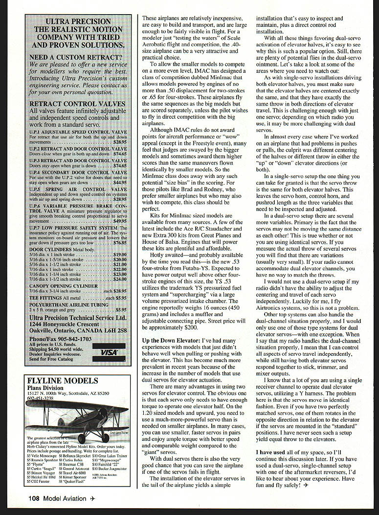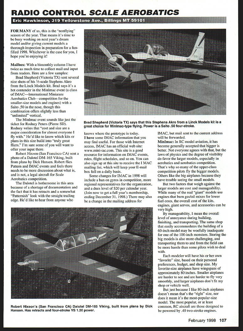 RADIO CONTROL SCALE AEROBATICS u-I FOR MANY us nonflying season year means its time busy working next years dream model and/or giving current models thorough inspection preparation funfilled 1998 Whichever case hope youre enjoying Mailbox bimonthly column have twice much time collect mail input readers few samples Brad Shepherd Victoria TX sent several nice shots /5-scale Stephens Akro Linck Models kit Brad says its hot contender Minmac event class IMACInternational Miniature Aerobatics Clubcompetition smaller-size models engines Saito 50 nose though combination offers slightly less unlimited vertical Minmac event sounds like just ticket Rodney Peters Pierre SD Rodney writes cost size major consideration almost everyone fly Hed like know kits plans size build truly great fliers Im sure some will want offer input Robert Hixson San Francisco CA sent photo Dalotel DM-165 Viking built plans Dick Hansen Robert flies Pattern IMAC events feels needs discussion about what is legal aircraft Scale Aerobatics competition Dalotel bothersome area because shortage documentation fact has retracts somewhat Patternish look straight trailing edge Hed like hear anyone knows prototype today have some IMAC information may find useful Internet access IMAC has official web site wwwmini-iaccom site good resource information IMAC events rules flight schedules can also sign up site receive MAC mailing list will keep E-mail box full daily basis Some changes IMAC 1998 will include ban gyros competition regional representatives organization dues level $20 per calendar year Join now get full years membership ending December 31 1998 may also change mailing address IMAC mail sent current address will forwarded Minmac RC model aviation has become generally accepted bigger better everyone agrees laws physics degree visibility favor larger models especially aerobatics aerobatics competition Thats upper-class competition pilots fly bigger models Others like big airplanes because have trouble seeing small models two factors weigh against larger models cost manageability real giant models use engines burn gas/oil mixes lower fuel costs overall cost kits engines giant servos accessories can very high manageability mean overall level annoyance during building finishing transporting same shop easily accommodates building 60-inch model may woefully inadequate 100-inch monsters Storing big models also challenging transporting field can hassle some pilots wish deal modeler will have own favorite size based personal preferences budget shop size favorite-size airplanes have wingspans approximately 80 inches Smaller airplanes harder see harder fly very smoothly larger airplanes dont fit shop vehicle well just because like 80-inch airplanes doesnt mean thats right size nor does mean its most-popular-size model popular least common RC aircraft designed powered 40 two-stroke engines February 1998 107 Brad Shepherd Victoria TX says Stephens Akro Linck Models kit great choice Minimac-type flying Power Saito 50 four-stroke Robert Hixsons San Francisco CA Dalotel DM-165 Viking built plans Dick Hansen Has retracts four-stroke VS 120 power greatest seleclia asrplaae plans t. Herb Clakeys renowned Flytine Kits Order yoars today Prices include postage handting write complete list $5 Vetie Monoconpe$8 Bellataca Skyracket$10 Great Lakes Trainee $5 Rearwin Speedster $8 Cnrtiss Rabin$10 Megawcnope $5 Flyrne$8 Stearman CSB$10 Fairchild 22 $5 Curtiss Seagull$8 General Aristocrat$10 Bucker inegmeitter $5 Stinsun Vayager$8 Travel Air 6000nose eitakel lOOd$8 Kianer Spuosteros sass $5 CG2 Punster$8 Quaker Flash airplanes relatively inexpensive easy build transport large enough fairly visible flight modeler just testing waters Scale Aerobatic flight competition 40size airplane can very attractive practical choice allow smaller models compete level IMAC has designed class competition dubbed Minmac allows models powered engines no 50 displacement two-strokes 65 four-strokes airplanes fly same sequences big models scored separately unless pilot wishes fly direct competition big airplanes Although IMAC rules award points aircraft performance wow appeal except Freestyle event feel judges swayed bigger models sometimes award higher scores same maneuvers flown identically smaller models So Minimac class does away such potential size bias scoring pilots like Brad Rodney prefer smaller airplanes may also wish compete class should perfect Kits Minmac sized models available sources few latest include Ace R/C Staudacher new Extra 300 kits Great Planes House Balsa Engines will power kits plentiful affordable Hotly awaitedand probably available time read thisis new 53 four-stroke Futaba-YS Expected have power output well above other fourstroke engines size YS 53 utilizes trademark YS pressurized fuel system supercharging via large volume pressurized intake chamber engine reportedly weighs 16 ounces 450 grams includes muffler adjustable connecting pipe Street price will approximately $200 Up Down Elevator Ive experiences models just didnt behave well pulling pushing elevator has become much prevalent recent years because increase number models use dual servos elevator actuation advantages using two servos elevator control obvious servo needs have enough torque operate elevator half 120 sized models upward need use much-more-powerful servo needed smaller airplanes cases can use smaller faster servos pairs enjoy ample torque better speed comparable weight compared giant servos dual servos also very good chance can save airplane servos fails flight installation elevator servos tail airplane yields simple installation thats easy inspect maintain plus direct control rod installation things favoring dual-servo activation elevator halves its easy see such popular option Still plenty potential flies dual-servo ointment Lets take look some areas need watch out As single-servo installations driving both elevator halves must make sure elevator halves centered exactly same have exa