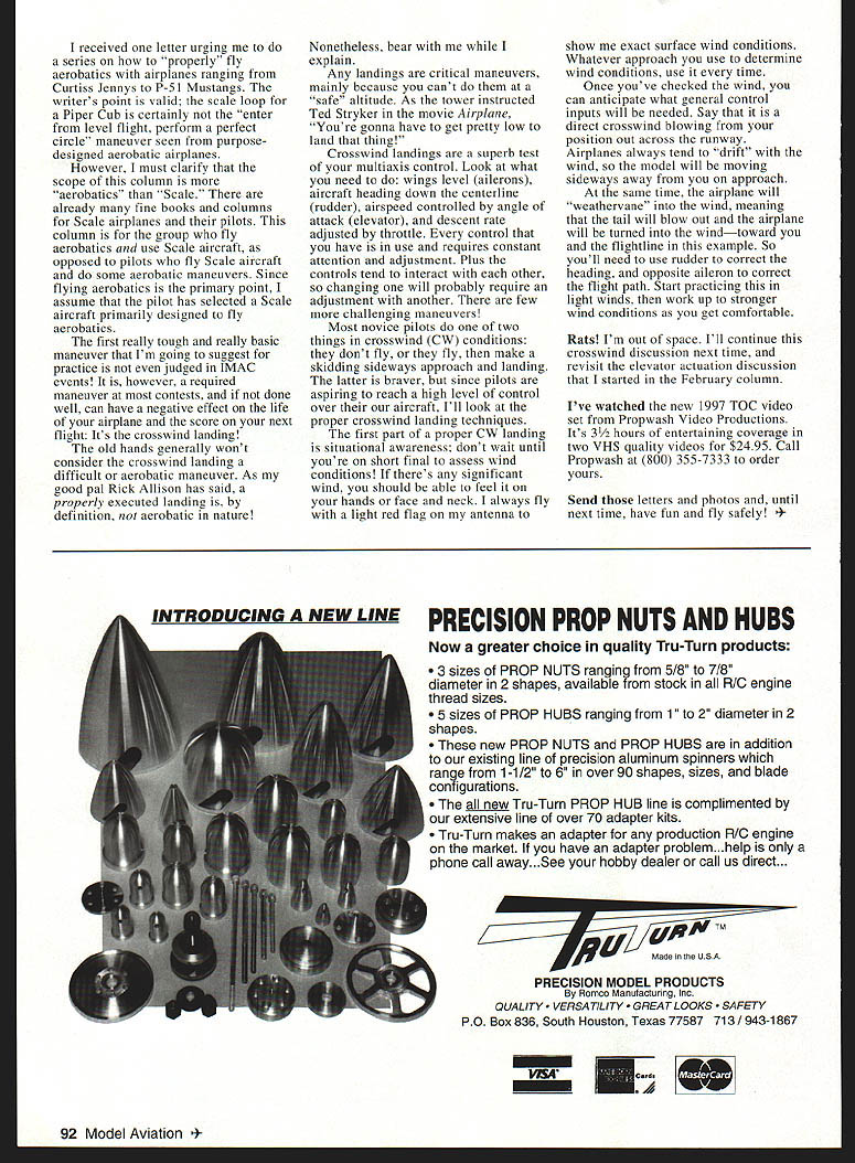 RADIO CONTROL SCALE AEROBATICS U Ir WHENEVER YOU gather fellow modelers hear opinions subjects Sometimes meetings result collection valuable information makes modeling life simpler better other times primary value entertainment Often dont know which Two subjects apply Scale Aerobatics types have mind lately mostly because listening conversations real cyber gyros scale flying Gyroscopic stabilizers gyros have become rage recent years pure Scale models Scale Aerobatics Single gyros yaw axis used Scale aircraft reduce pilots rudder workload Dual gyrosone pitch elevator yaw rudder channelshave installed IMAC International Miniature Aerobatic Club-type airplanes greatly reduce effort required perform torque rolls Gyros have legal helicopter competition since became available have illegal Pattern airplanes just long became illegal use IMAC competition starting 1998 believe good ruling especially light recent quantum leaps gyro performance have split opinion regarding modern electronic conveniences hand feel inherently wrong have type device aircraft used competition pilot skill makes control inputs pilot based feedback sensors installed airplane other hand find nothing wrong using computer radio perform trimming functions would otherwise possible real pain achieve aerodynamic modifications Some people feel opinions cross purposes huge leap between passive mixing active sensing latest gyros make strongest argument against allowing use pilot-skill competitions Generally known heading lock gyros new units sold Arcamax CSM far gyros supersede Until units arrived thing gyro mechanical piezo could dampen motion pilots thought would hold heading case gyros reacted motion installed axis usually yaw moved servo apply opposite control until motion stopped motion detected first place will have changed heading movement would stopped after some change heading occurred Reportedly heading-lock gyros rather simplified terms go step farther stop detected motion also put control needed cause aircraft move same rate time opposite direction gyro senses x rate right yaw second will stop apply opposite rudder cause same rate yaw second opposite direction effect single-axis auto pilot heading angle attack gyro will seek whatever position last commanded control stick heading-lock gyros pilots workload can greatly reduced torque roll extremely difficult maneuver will almost easy gyros actively flying elevator rudder expect see units TOC Tournament Champions hot-dog airplanes helicopters except prohibited congratulate IMAC outlawing such autopilot devices just nick timebefore invest $170-$250 per unit subject scale flying just contentious subject gyros dont know times Ive heard people watching hot Radio Control RC Aerobatics performance say something effect thats neat real airplanes cant fly like Depending model flown statement may may true model flown IMAC competition likely flying same manner full-scale aircraft since IMAC sequences very close adaptations full-scale JAC patterns gravity loads thrust-to-weight ratios may exceed full-scale norms maneuvers generally realistic place IMAC reality stretched some freestyle maneuvers near-stationary tumbling maneuvers yet seen full-scale events no sane pilot would touch ground his/her rudder during torque roll Im amazed what have seen recently full-scale aerobatics Lomeevaks commonplace combination snap roll tumble can imagine Torque rolls tail slides some reaching 100 mph backward airspeed seen 5400 stall turns have performed air shows across country current crop full-scale aerobatic mounts pilots capable performance impossible decade ago flying model current top designs things can close prototypical scale flying issue gets difficult subject old aerobatic designs non-aerobatic designs get tossed mix April 1998 91 Leroy Bangert holds Goldberg Sukhoi great IMAC performer can work well Pattern Size cost make Sukhois popular prefer upper size limits youll enjoy Tournament Champions-style aircraft Two-video set 1997 TOC available received letter urging series properly fly aerobatics airplanes ranging Curtiss Jennys P-51 Mustangs writers point valid scale ioop Piper Cub certainly enter level flight perform perfect circle maneuver seen purposedesigned aerobatic airplanes However must clarify scope column aerobatics Scale already fine books columns Scale airplanes pilots column group fly aerobatics use Scale aircraft opposed pilots fly Scale aircraft some aerobatic maneuvers Since flying aerobatics primary point assume pilot has selected Scale aircraft primarily designed fly aerobatics first really tough really basic maneuver Im going suggest practice judged IMAC events however required maneuver contests done well can have negative effect life airplane score next flight Its crosswind landing old hands generally wont consider crosswind landing difficult aerohatic maneuver As good pal Rick Allison has said properly executed landing definition aerobatic nature Nonetheless bear explain Any landings critical maneuvers mainly because cant safe altitude As tower instructed Ted Stryker movie Airplane Youre gonna have get pretty low land thing Crosswind landings superb test multiaxis control Look what need wings level ailerons aircraft heading down centerline rudder airspeed controlled angle attack elevator descent rate adjusted throttle control have use requires constant attention adjustment Plus controls tend interact other changing will probably require adjustment another few challenging maneuvers Most novice pilots two things crosswind CW conditions dont fly fly make skidding sideways approach landing latter braver since pilots aspiring reach high level control over aircraft Ill look proper crosswind landing techniques first part proper CW landing situational awareness dont wait until youre short final assess wind conditions theres significant wind should able feel hands face neck always fly light red flag antenna show exact surface wind conditions Whatever approach use determine wind c