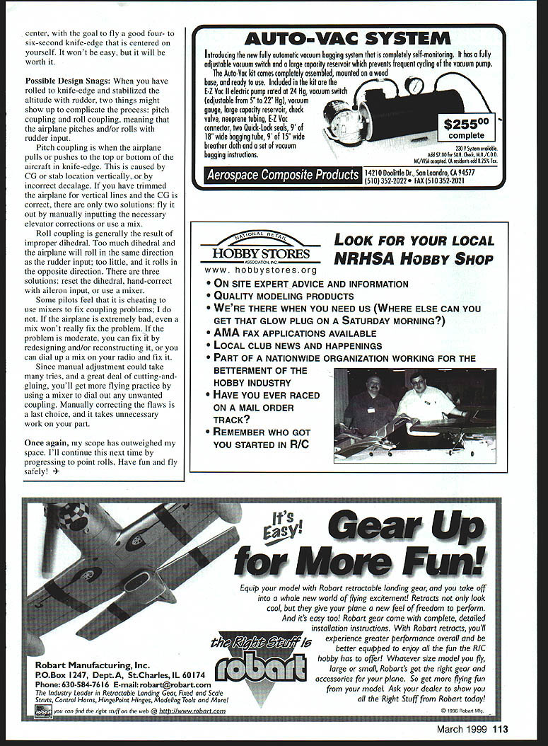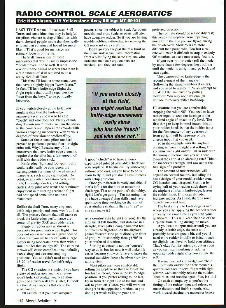 RADIO CONTROL SCALE AEROBATICS iru 1 I-1J TIME met discussed Stall Turns some hints may helpful pilots having difficulties Several people wrote really enjoyed column hoped like Thats good since primary focus flying Stall Turn maneuvers wont usually impress locals done well Its obvious casual observer fair amount skill required really nice Stall Turn time Ill look some maneuvers have slightly bigger wow factor fact Ill look knife-edge flight flight regime usually separates men boys politically incorrect watch closely field might realize knife-edge maneuvers really show has touch does Plenty hotdog barnstormer pilots can jam sticks corners impress crowds various snapping maneuvers various degrees precision predictability Some same pilots hardpressed perform perfect four- eightpoint roll Because maneuvers have knife-edge elements require pilot has fair amount skill rudder stick Knife-edge flight four-point rolls could realistically considered starting points advanced maneuvers such eight-point 16point other hesitation rolls slow rolls knife-edge circles rolling circles Any pilot wants maximum enjoyment mastering aerobatic flight best spend some time maneuvers Unlike Stall Turn airplanes knife-edge poorly some wont primary factors will make break knife-edge performance center gravity CC rudder area Plenty rudder area almost necessity good knife-edge flight does necessarily mean great deal deflection better off large rudder using moderate throw small rudder swings 400 extreme throws will cause complications including excess drag extreme coupling problems shouldnt need 1520O rudder travel knife-edge flight CG situation simple have plenty rudder area airplane wont hold knife-edge need power farther-aft CC Later Ill look other design aspects could problematic Ill assume have adequate power since subject Scale Aerobatic models Scale aerobats will also have adequate rudder So having trouble holding knife-edge try moving CC rearward very carefully Dont go very far past rear limit plans unless have information pilot flying same airplane indicates such adjustments neededand safe good check have moreexperienced pilot available check out airplane he/she can fly knife-edge problems have learn fly dont have mess setup problems Once aircraft ready able thats left pilot master challenge point hobby right Lets get going Im assuming have average flying skills have spent some time working trim airplane flies true can make comfortable height fly airplane full throttle stabilize straight level path couple hundred feet out flightline As airplane passes center point directly front roll smoothly through 900 preferred direction Starting center correct way now will make life easier because wont have make mental transition head-on view tailing view Most pilots comfortable rolling airplane top fuselage facing knife-edge position prefer rolling left fly right side box roll left Later will work doing opposite direction dont get weak rolling nonpreferred direction roll rate should reasonably fast keeps airplane departing much line flying during quarter-roll Slow rolls difficult point rolls Too fast roll rate will make difficult stop exactly 900 rotation use moderately fast rate over-roll under-roll model few degrees keep rolling until model upright go back start again quarter-roll knife-edge second element maneuver following straight-and-level entry need master Never attempt break off maneuver pulling elevator may have enough altitude recover half-loop Ill assume comfortable stopping roll 900 need have rudder input keep fuselage required angle attack fly level first thing keep mind tattoo rudder hand rudder input first quarter quarter-roll upright will opposite aileron input used So example airplane coming right rolling left must use right rudder Put rudder wrong direction will head toward earth alarming rate Think maneuver through roll out first sign problem amount rudder needed will depend several factors including basic design model rudder area CC location airspeed Start out trying half rudder stick throw airplane climbs knife-edge lessen rudder input loses altitude increase rudder As said some touch involved best entry knife-edge start applying needed rudder nearly same time start quarter-roll will keep nose airplane falling during move wait input rudder until already knife-edge nose will probably have dropped bit youll need rudder initially bring back up slightly past level hold altitude Thats okay first attempts soon can start working adding opposite rudder right after initiate roll Having reached knife-edge held line rudder few moments quarter-roll back level flight right aileron smoothly release rudder relax breathe again Fun isnt attempt try perfect timing rudder input release make start finish smooth Also work toward starting maneuver before 112 Model Aviation er goal fly good four- six-second knife-edge centered yourself wont easy will worth Possible Design Snags have rolled knife-edge stabilized altitude rudder two things might show up complicate process pitch coupling roll coupling meaning airplane pitches and/or rolls rudder input Pitch coupling airplane pulls pushes top bottom aircraft knife-edge caused CG stab location verticallyor incorrect decalage have trimmed airplane vertical lines CG correct two solutions fly out manually inputting necessary elevator corrections use mix Roll coupling generally result improper dihedral Too much dihedral airplane will roll same direction rudder input too little rolls opposite direction three solutions reset dihedral hand-correct aileron input use mixer Some pilots feel cheating use mixers fix coupling problems airplane extremely bad mix wont really fix problem problem moderate can fix t redesigning and/or reconstructing can dial up mix radio fix Since manual adjustment could take tries great deal cutting-andgluing youll get flying practice using mixer dial out unwanted coupling Manually correcting flaws last choice takes unnecessary work part Once again scope has outw