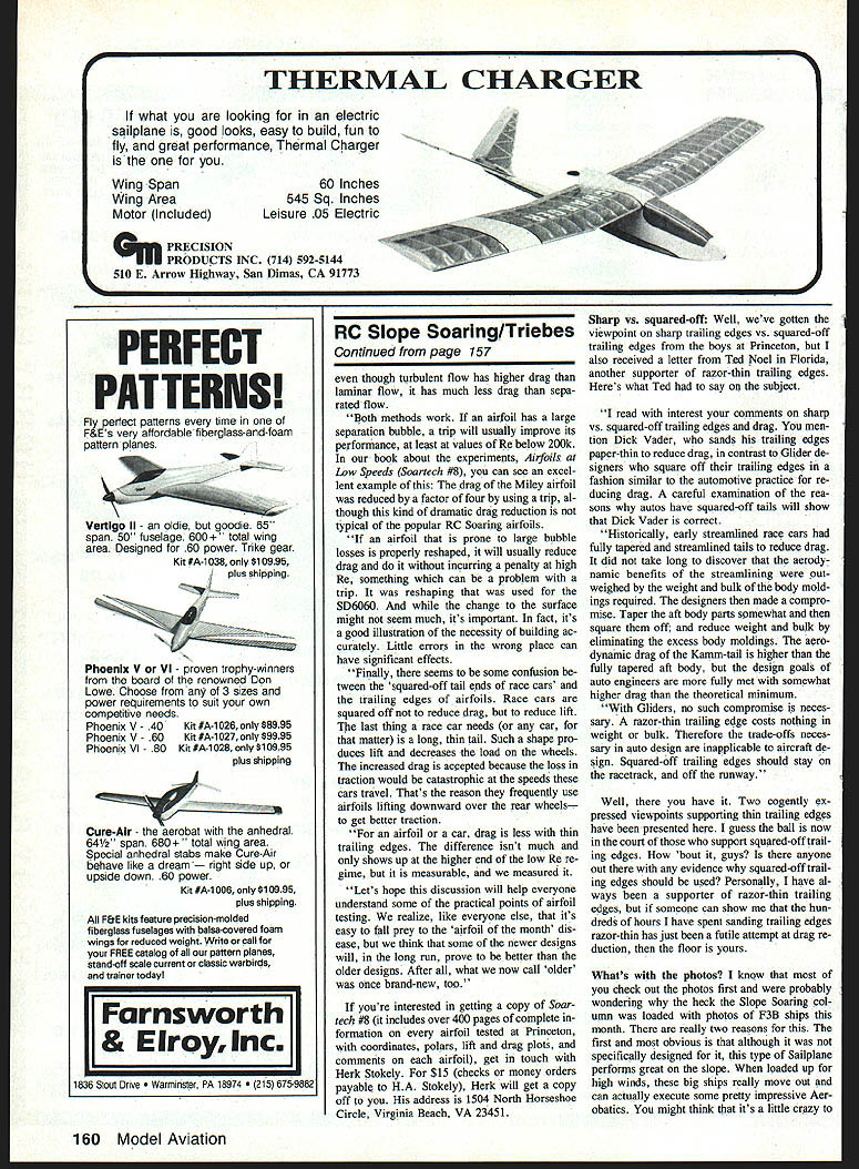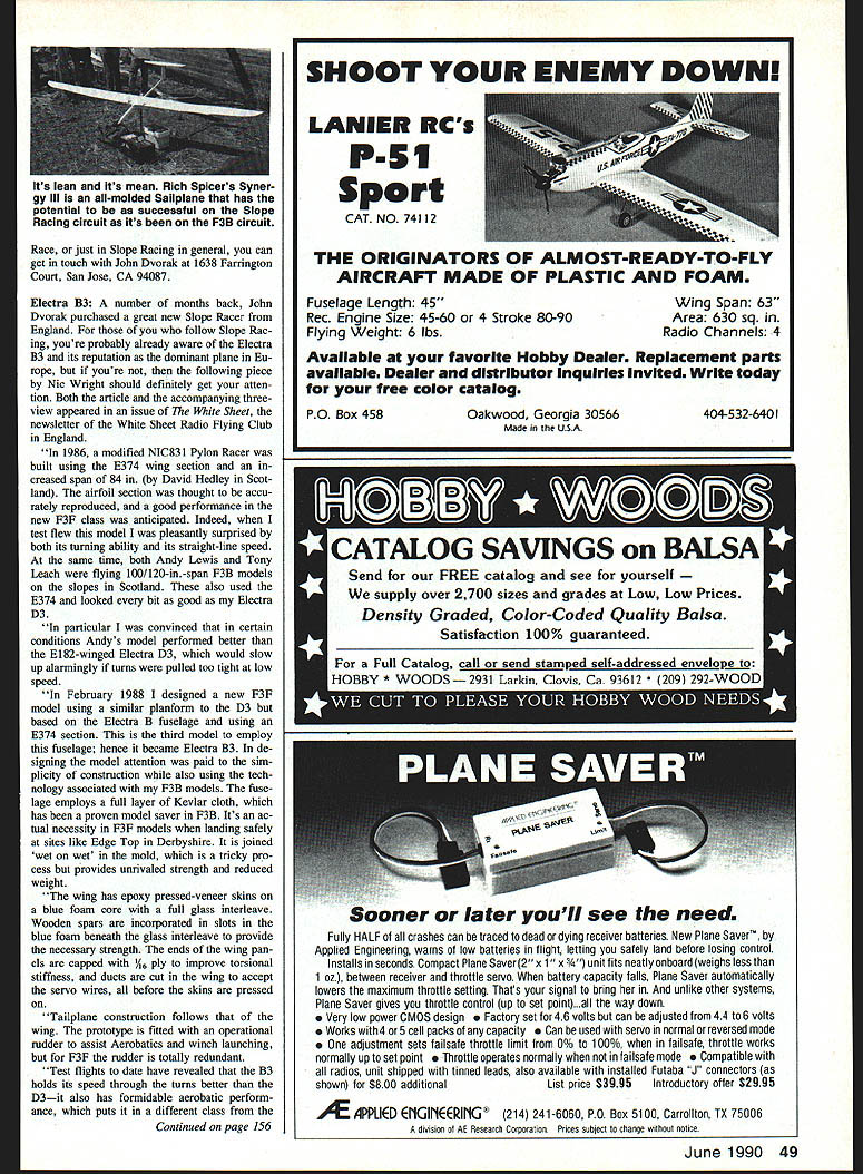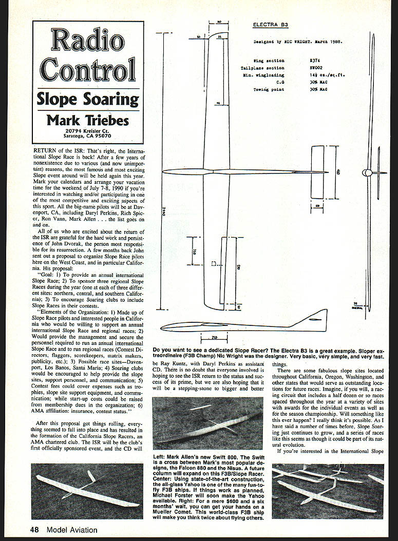 RETURN ISR Thats right Interna tional Slope Race back After few years nonexistence due various now unimpor tint reasons famous exciting Slope event around will held again year Mark calendars arrange vacation time weekend July 7-8 1990 youre interested watching and/or participating competitive exciting aspects sport big-name pilots will Dav enport CA including Daryl Perkins Rich Spic er Ron Vann Mark Allen st goes on us excited about return ISR grateful hard work persist ence John Dvorak person respolisi ble its resurrection few months back John sent out proposal organize Slope Race pilots West Coast particular Califor nia proposal Goal 1 provide annual international Slope Race 2 sponsor three regional Slope Races during year three differ ent sites northern central southern Califor nia 3 encourage Soaring clubs include Slope Races contests Elements Organization 1 Made up Slope Race pilots interested people Califor nia would willing support annual internatiunal Slope Race regional races 2 Would provide management secure personnel required run annual international Slope Race run regional races Contest Di rectors flaggers scorekeepers matrix makers publicity etc 3 Possible race sitesDaven port Los Banos Santa Maria 4 Soaring clubs would encouraged help provide slope sites support personnel communication 5 Contest fees could cover expenses such tro phies slope site support equipment commu nication start-up costs could raised membership dues organization 6 AMA affiliation insurance contest status After proposal got things rolling thing seemed fall place has resulted formation California Slope Racers AMA chartered club ISR will clubs first officially sponsored event CD will Ki 10 ELECTRA B3 flsned NIC WaIGMT MArCkk 1985 In4 uscSlOfl Talplane seotiell Mm un1oadnS towing point 3374 1W002 14* oz/uqft 30% MC 30% MAC 2 ii 21 see dedicated Slope Aacer Electra B3 great example Sloper ox traordhiaire F38 Champ Nic Wright designer Very basic very simple very fast Ray Kuntz Daryl Perkins assistant things CD no doubt everyone involved some fabulous slope sites located hoping see ISR return staius suc- throughout California Oregon Washington cess its prime also hoping other states would serve outstanding loca will stepping-stone bigger better tions future races Imagine will rac ing circuit includes half dozen races spaced throughout year variety sites awatds individual events Well season championship Will something like ever happen really think its possible As have said number times before Slope Soar ing just continues io grow series races like seems though could part its nat ural evolution youre interested International Slope Left Mark Aliens new Swift 800 Swift cross between Marks popular de signs Falcon 880 Nisus future column wili expand F3B/Sldpe Racer Center Using state-of-the-art construction all-glass Yahoo fun-tofly F3B ships things work planned Michael Forster wili soon make Yahoo available Right mere $600 six months wait can get hands 8 Mueller Comet world-class F3B ship will make think twice about flying others 48 Model Aviation Radio Cono1 Slope Soaring Mark Triebes 20794 Kreisier Cs Sarawga CA 95670 Race just Slope Racing general can get touch John Dvorak 1638 Farrington Court San Jose CA 94087 Eleetra B3 number months back John Dvorak purchased great new Slope Racer England follow Slope Rac ing youre probably already aware Electra B3 its reputation dominant plane Eu rope youre following piece Nic Wright should definitely get atten tion Both article accompanying three view appeared issue White Sheet newsletter White Sheet Radio Flying Club England 1986 modified N1C831 Pylon Racer built using E374 wing section creased span 84 David Hedley Scot land airfoil section thought accu rately reproduced good performance new F3F class anticipated Indeed test flew model pleasantly surprised both its turning ability its straight-line speed same time both Andy Lewis Tony Leach flying 100/120-in-span F3B models slopes Scotland also used E374 looked bit good Electra D3 particular convinced certain conditions Andys model performed better E182-winged Electra D3 would slow up alarmingly turns pulled too tight low speed February 1988 designed new F3F model using similar planform D3 based Electra B fuselage using E374 section third model employ fuselage hence became Electra B3 de signing model attention waa paid sim plicity construction also using tech nology associated F3B models fuse lage employs full layer Kevlar cloth has proven model saver F3B Its ac tual necessity F3F models landing safely sites like Edge Top Derbyshire joined wet wet mold tricky pro cess provides unrivaled strength reduced weight wing has epoxy pressed-veneer skins blue foam core full glass interleave Wooden spars incorporated slots blue foam beneath glass interleave provide necessary strength ends wing pan els capped improve torsional stiffness ducts cut wing accept servo wires before skins pressed Tailplane construction follows wing prototype fitted operational rudder assist Aerobatics winch launching F3F rudder totally redundant Test flights date have revealed B3 holds its speed through turns better D3it also has formidable aerobatic perform ance puts different class Continued page 156 SHOOT YOUR ENEMY DOWN LANDER RCs P51 Sport CAT NO 74112 THE ORIGINATORS OF ALMOST-READY-TO-FLY AIRCRAFT MADE OF PLASTIC AND FOAM Fuselage Length 45 Rec Engine Size 45-60 4 Stroke 80-90 Flying Weight 6 lbs Wing Span 63 Area 630 sq Radio Channels 4 Available favorite Hobby Deaier Replacement parts available Dealer distributor inquiries invited WrIte today free color catalog PO Box 458 Oakwood Georgia 30566 Made USA 404-532-6401 Fully HALF crashes can traced dead dying receiver batteries New Plane Saver Applied Engineering warns low batteries flight letting safely land before losing control Installs seconds Compact Plane Saver 2 xl x 3/4 unit fits neatly onboard weighs less 1 oz between receiver throttle servo battery capacity falls Plane Saver automatically