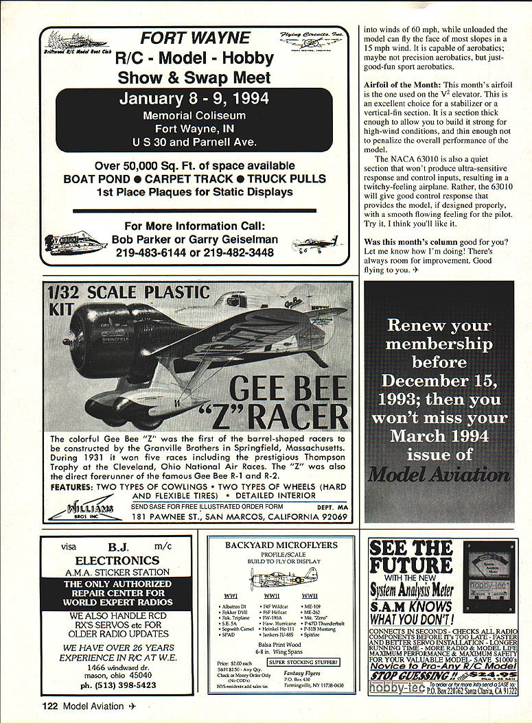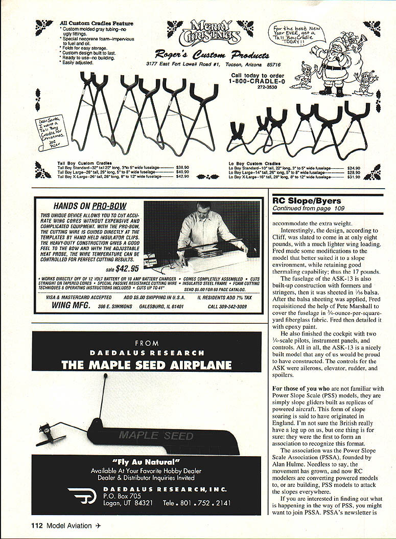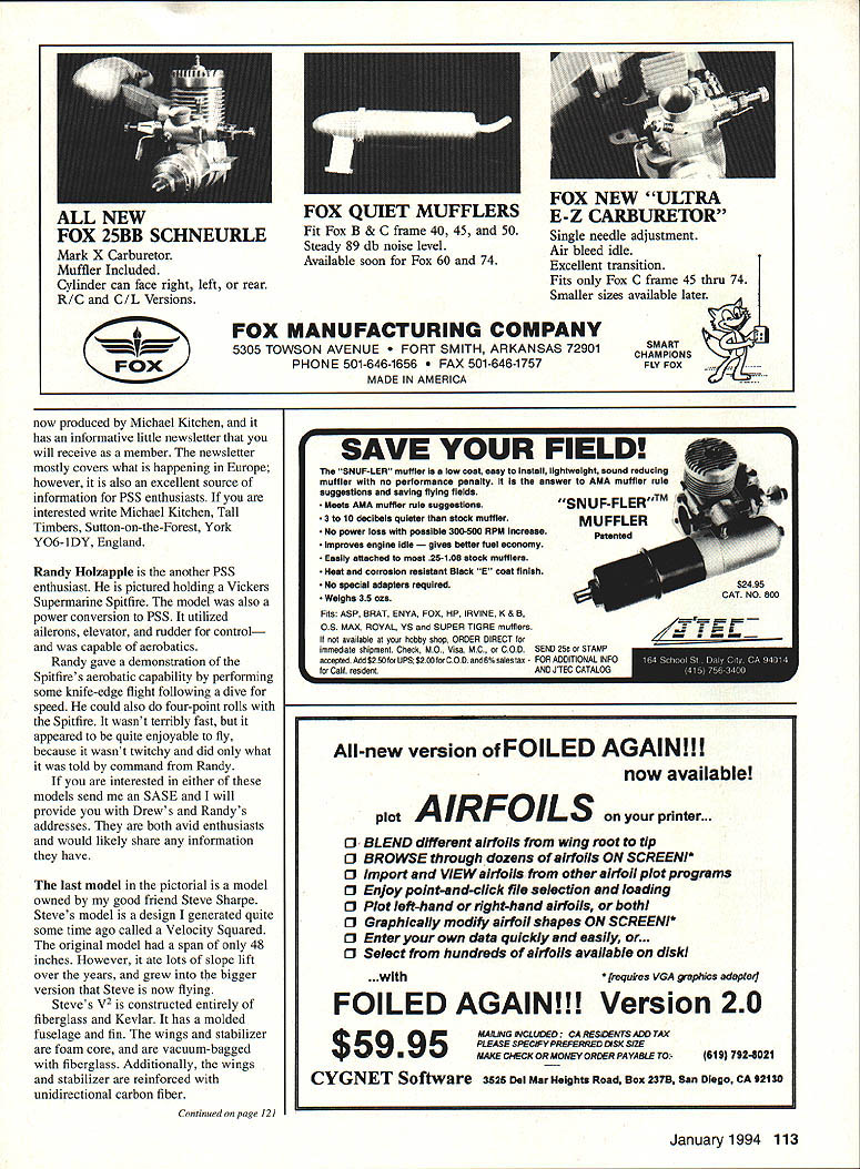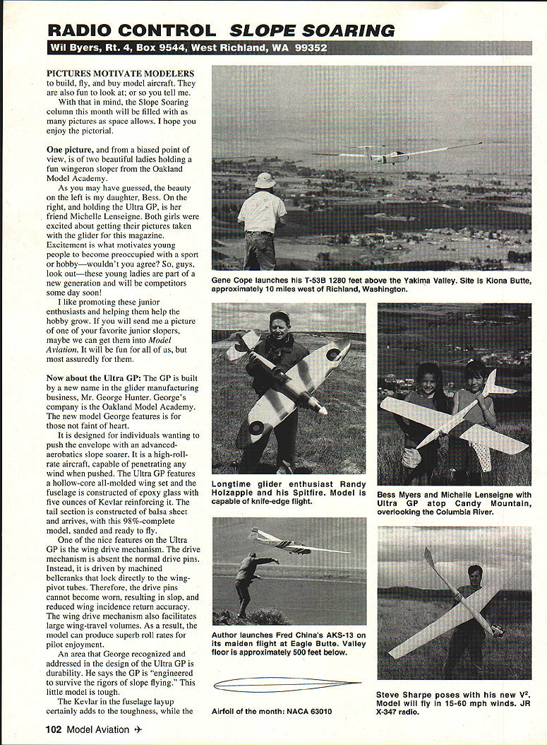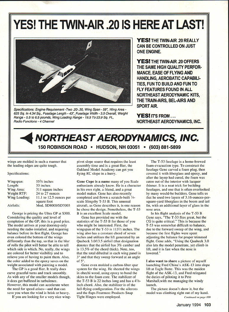 RADIO CONTROL SLOPE SOARING PICTURES MOTIVATE MODELERS build fly buy model aircraft also fun look tell mind Slope Soaring column month will filled pictures space allows hope enjoy pictorial picture biased point view two beautiful ladies holding fun wingeron sloper Oakland Model Academy As may have guessed beauty left daughter Bess right holding Ultra GP friend Michelle Lenseigne Both girls excited about getting pictures taken glider magazine Excitement what motivates young people become preoccupied sport hobbywouldnt agree So guys look outthese young ladies part new generation will competitors some day soon like promoting junior enthusiasts helping help hobby grow will send picture favorite junior slopers maybe can get Model Aviation will fun us assuredly Now about Ultra GP GP built new name glider manufacturing business Mr George Hunter Georges company Oakland Model Academy new model George features faint heart designed individuals wanting push envelope advancedaerobatics slope soarer high-rollrate aircraft capable penetrating wind pushed Ultra GP features hollow-core all-molded wing set fuselage constructed epoxy glass five ounces Kevlar reinforcing tail section constructed balsa sheet arrives 98%-complete model sanded ready fly nice features Ultra GP wing drive mechanism drive mechanism absent normal drive pins Instead driven machined bellcranks lock directly wingpivot tubes Therefore drive pins cannot become worn resulting slop reduced wing incidence return accuracy wing drive mechanism also facilitates large wing-travel volumes As result model can produce superb roll rates pilot enjoyment An area George recognized addressed design Ultra GP durability says GP engineered survive rigors slope flying little model tough Kevlar fuselage layup certainly adds toughness Airfoil month NACA 63010 102 Model Aviation Cope launches T-53B 1280 feet above Yakima Valley Site Kiona Butte approximately 10 miles west Richiand Washington Longtime glider enthusiast Randy Holzapple Spitfire Model Bess Myers Michelle Lenseigne capableofknife-edgeflight Ultra GP atop Candy Mountain overlooking Columbia River Author launches Fred Chinas AKS-13 its maiden flight Eagle Butte Valley floor approximately 500 feet below Steve Sharpe poses new V2 Model will fly 15-60 mph winds JR X-347 radio wings molded such manner leading edges quite tough Specifications Wingspan Length Wing Area Weight RTF Wing Loading Airfoils 553/s inches 33 inches 311 square inches 24 27 ounces 111 to 125 ounces per square foot Mod SD8000/SD7003 George pricing Ultra GP $300 Considering quality level completion GP good price model arrives doorstep needing radio installed requiring balance before its first flight George has colored bottom wings differently top blur rolls pilot will better able tell side No really wings colored better visibility relieve having paint Also color added epoxy saves weight associated painting model GP good flier really does carve graceful turns track smoothly As smaller models though does get buffeted turbulence However model can accelerate need speed arisesand can save wind brisk heavy looking very nice wingpivot slope soarer requires least assembly time great flier Oakland Model Academy can get flying RC slope hurry Gene Cope name Scale enthusiasts already know character own right friend great model maker Gene has also recently completed flown scratch-built Y5scale Slingsby 1-53 B unusual aircraft Gene describes reason chose design Nonetheless T-53 B excellent Scale model Gene has provided statistics T-53 B might interested First wingspan 1-53 1 l3/2 inches wing also has constant chord seven inches utilizes lift generated Quabeck 3Q135 airfoil designation denotes airfoil has 3% camber 135% chord thick Note too total dihedral wing panel 30 sweep forward angle 50 Gene molded carbon-fiber spar system wing sheeted wings obechi wood using epoxy bond skins foam core stabilizer T-53 B 22 inches long has inch chord Also stabilizer full-flying configuration ailerons flaps Fourmost Products Snap Tight Hinges employed 1-53 fuselage home-brewed foam-evacuation type construct fuselage Gene carved foam plug covered fiberglass epoxy after layup cured foam eaten out interior lacquer thinner neat trick building fuselages often overlooked would-be builders Gene tells us used two layers 316-ounces-persquare-yard fiberglass boom tail fin additional layer glass nose area flight analysis 1-53 B Gene says 1-53 flies great CG quite critical because 1-53 somewhat difficult balance due forward sweep wing because first flights spent adjusting balance proper trimmed flight Gene adds Using Quabeck 30 also lets model penetrate yet climb lift fast nose lowered also want share picture myself launching Fred Chinas ASK-13 slope lift Eagle Butte maiden flight ASK-13 Fred relegated duties piloting Pete Marshallwith managing windy launch picture doesnt show model climbing right out hand Continued page 109 January1994 103 YES THE TWIN-AIR 20 IS HERE AT LAST YES THE TWiN-AIR 20 REALLY CAN BE CONTROLLED ON JUST ONE ENGINE YES THE TWIN-AIR 20 OFFERS THE SAME HIGH QUALITY PERFOR MANCE EASE OF FLYiNG AND HANDLING AEROBATIC CAPABILI TIES FUN TO BUILD AND FUN TO FLY FEATURES FOUND IN ALL NORTHEAST AERODYNAMIC KITS THE TRAIN-AIRS BEL-AIRS AND SPORT AIR YES ITS FROM . NORTHEAST AERODYNAMICS INC 4 NORTHEAST AERODYNAMICS INC 150 ROBINSON ROAD ON NH 03051 881-5899 Specifications Engine Requirement -Two 20-30 Wing Span 58 Wing Area 625 Sq 434 Sq Fuselage Length 43 Fuselage Width 35 Overall Weight Range 55 65 pounds Wing Loading Range 195 239 Sq Ft Radio Functions 4 Channel An interesting line fun scale plans being offered Gus Morfis 4709 Green Meadows Avenue Torrance CA 90505-5679 Primarily WW II fighters Y12-scale designed around 15 20 two-stroke glow engines Gus plans will produce models IightweighL originally intended RC combat aircraft show no provision landing modelers build airplanes enjoying lightly loaded flying characteristics everyday sport flying models 