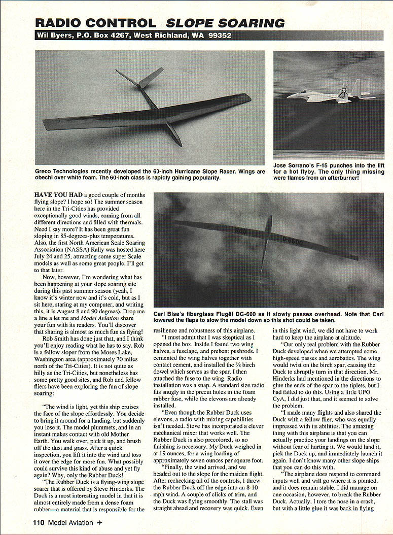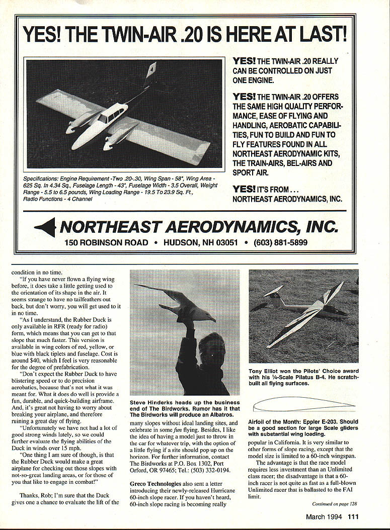RADIO CONTROL SLOPE SOARING HAVE YOU HAD good couple months flying slope hope summer season Tn-Cities has provided exceptionally good winds coming different directions filled thermals Need say has great fun sloping 85-degrees-plus temperatures Also first North American Scale Soaring Association NASSA Rally hosted July 24 25 attracting some super Scale models well some great people Ill get later Now however Im wondering what has happening slope soaring site during past summer season yeah know its winter now its cold sit staring computer writing August 8 90 degrees Drop line let Model Aviation share fun its readers Youll discover sharing almost much fun flying Rob Smith has done just think youll enjoy reading what has say Rob fellow sloper Moses Lake Washington area approximately 70 miles north Tri-Cities quite hilly Tn-Cities nonetheless has some pretty good sites Rob fellow fliers have exploring fun slope soaring wind light yet ship cruises face slope effortlessly decide bring around landing suddenly lose model plummets instant makes contact old Mother Earth walk over pick up brush off dust grass After quick inspection lift wind toss over edge fun What possibly could survive kind abuse yet fly again Rubber Duck Rubber Duck flying-wing slope soarer offered Steve Hinderks Duck interesting model almost entirely made dense foam rubbera material responsible resilience robustness airplane must admit skeptical opened box Inside found two wing halves fuselage prebent pushrods cemented wing halves together contact cement installed 3/ birch dowel serves spar attached fuse wing Radio installation snap standard size radio fits snugly precut holes foam rubber fuse elevons already installed though Rubber Duck uses elevons radio mixing capabilities isnt needed Steve has incorporated clever mechanical mixer works well Rubber Duck also precolored no finishing necessary Duck weighed 19 ounces wing loading approximately seven ounces per square foot Finally wind arrived headed out slope maiden flight After rechecking controls threw Rubber Duck off edge 8-10 mph wind couple clicks trim Duck flying smoothly stall straight ahead recovery quick light wind did have work hard keep airplane altitude real problem Rubber Duck developed attempted some high-speed passes aerobatics wing would twist birch spar causing Duck abruptly turn direction Mr Hinderks mentioned directions glue ends spar tiplets failed Using little UFO CyA did just seemed solve problem made flights also shared Duck fellow flier equally impressed its abilities amazing thing airplane can actually practice landings slope fear hurting would land pick Duck up immediately launch again dont know other slope ships can airplane does respond command inputs well will go pointed does remain stable did manage occasion however break Rubber Duck Actually tore nose crash little glue back flying 110 Model Aviation Sorranos F-15 punches lift Greco Technologies recently developed 60-inch Hurricane Slope Racer Wings hot flyby thing missing obechi over white foam 60-inch class rapidly gaining popularity flames afterburnerl Carl Bises fiberglass Flugel DG-600 slowly passes overhead Note Carl lowered flaps slow model down shot could taken condition no time have never flown flying wing before does take little getting used orientation its shape air seems strange have no tailfeathers out back dont worry wilt get used no time As understand Rubber Duck available RFR ready radio form means can get slope much faster version available wing colors red yellow blue black tiplets fuselage Cost around $40 feel very reasonable degree prefabrication Dont expect Rubber Duck have blistering speed precision aerobatics because thats what meant What does well provide fun durable quick-building airframe its great having worry about brealdng airplane therefore ruining great day flying Unfortunately have lot good strong winds lately could further evaluate flying abilities Duck winds over 15 mph thing am sure though Rubber Duck would make great airplane checking out slopes not-so-great landing areas like engage combat Thanks Rob Im sure Duck gives chance evaluate lift Steve Hinderks heads up business end Birdworks Rumor has Birdworks will produce Albatros slopes ideal landing sites celebrate some ffin flying Besides like idea having model just throw car whatever trip option little flying site should pop up horizon further information contact Birdworks PO Box 1302 Port Orford OR 97465 Tel 503 332-0194 Greco Technologies also sent letter introducing newly-released Hurricane 60-inch slope racer havent heard 60-inch slope racing becoming really Tony Elliot won Pilots Choice award -Scale Pilatus B-4 scratchbuilt flying surfaces Airfoil Month Eppler E-203 Should good section large Scale gliders substantial wing loading popular California very similar other forms slope racing except model size limited 60-inch wingspan advantage race model requires less investment Unlimited class racer disadvantage 60inch racer quite fast full-blown Unlimited racer ballasted FAI limit Continued page 128 March1994 111 YES THE TWIN-AIR 20 IS HERE AT LAST YES THE TWiN-AIR 20 REALLY CAN BE CONTROLLED ON JUST ONE ENGINE YES THE TWINAIR 20 OFFERS THE SAME HIGH QUALITY PERFOR MANCE EASE OF FINING AND HANDLING AEROBATIC CAPABIU TIES FUN TO BUILD AND FUN TO FLY FEATURES FOUND IN ALL NORTHEAST AERODYNAMIC KITS THE TRAIN-AIRS BEL-AIRS AND SPORT AIR YES IVS FROM . NORTHEAST AERODYNAMICS INC 4 NORTHEAST AERODYNAMICS INC 150 ROBINSON ROAD ON NH 03051 881-5899 Specifications Engine Requirement -Two 20-30 Wing Span 58 Wing Area 625 Sq 434 Sq Fuselage Length -43 Fuselage Width 35 Overall Weight Range 55 65 pounds Wing Loading Range 195 239 Sq Ft Radio Functions -4 Channel Camcorder Computer Cellular & Cordless Phones Batteries Gell Cells Lithium & Motorola Batteries Custom Battery Packs Authorized SA$YO Distributor STANDARD S2llCAPACITY ImAhIDIA HTWEIGHT Iozl PRICE N-SOAAA1/3AM503945910128 200 N-11OAA1/3M1105516500208150 N150NN1504531