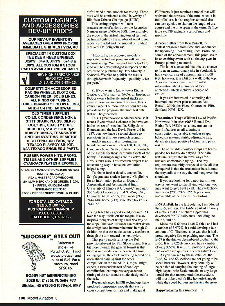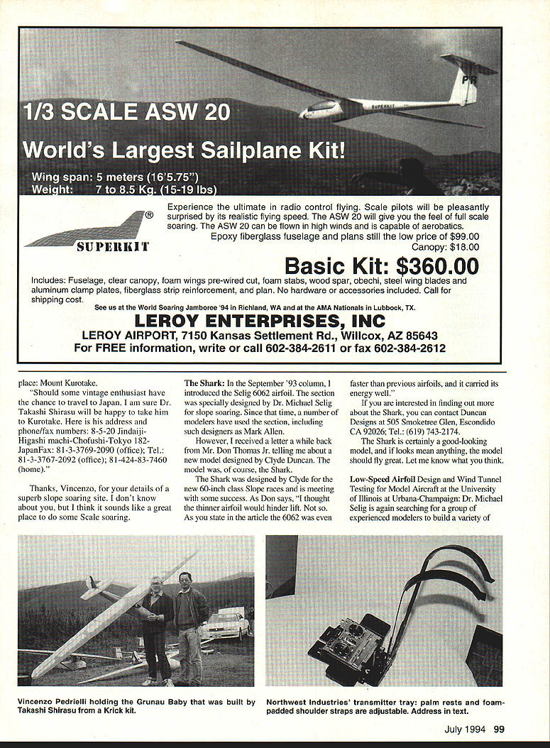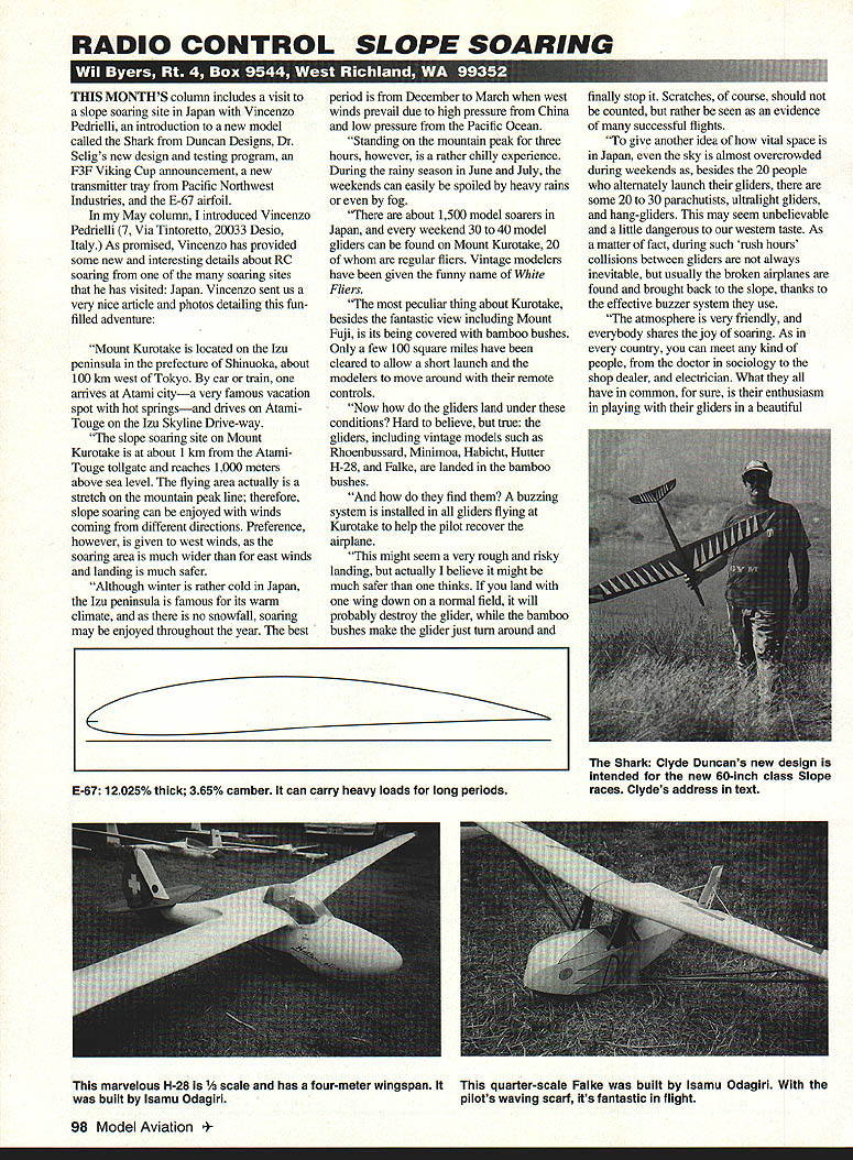RADIO CONTROL SLOPE SOARING hi EU 1L-d THIS MONTHS column includes visit slope soaring site Japan Vincenzo Pedrielli introduction new model called Shark Duncan Designs Dr Seligs new design testing program F3F Viking Cup announcement new transmitter tray Pacific Northwest Industries E-67 airfoil May column introduced Vincenzo Pedrielli 7 Via Tintoretto 20033 Desio Italy As promised Vincenzo has provided some new interesting details about RC soaring soaring sites has visited Japan Vincenzo sent us very nice article photos detailing funfilled adventure Mount Kurotake located Izu peninsula prefecture Shinuoka about 100 km west Tokyo car train arrives Atami citya very famous vacation spot hot springsand drives Atami Touge Izu Skyline Drive-way slope soaring site Mount Kurotake about 1 km Atami Touge tollgate reaches 1000 meters above sea level flying area actually stretch mountain peak line therefore slope soaring can enjoyed winds coming different directions Preference however given west winds soaring area much wider east winds landing much safer Although winter rather cold Japan Izu peninsula famous its warm climate no snowfall soaring may enjoyed throughout year best period December March west winds prevail due high pressure China low pressure Pacific Ocean Standing mountain peak three hours however rather chilly experience During rainy season June July weekends can easily spoiled heavy rains fog about 1500 model soarers Japan weekend 30 40 model gliders can found Mount Kurotake 20 regular fliers Vintage modelers have given funny name White Fliers peculiar thing about Kurotake besides fantastic view including Mount Fuji its being covered bamboo bushes Only few 100 square miles have cleared allow short launch modelers move around remote controls Now gliders land under conditions Hard believe true gliders including vintage models such Rhoenbussard Minimoa Habicht Hutter H-28 Falke landed bamboo bushes find buzzing system installed gliders flying Kurotake help pilot recover airplane might seem very rough risky landing actually believe might much safer thinks land wing down normal field will probably destroy glider bamboo bushes make glider just turn around finally stop Scratches course should counted rather seen evidence successful flights give another idea vital space Japan sky almost overcrowded during weekends besides 20 people alternately launch gliders some 20 30 parachutists ultralight gliders hang-gliders may seem unbelievable litfie dangerous western taste As matter fact during such rush hours collisions between gliders always inevitable usually broken airplanes found brought back slope thanks effective buzzer system use atmosphere very friendly everybody shares joy soaring As country can meet kind people doctor sociology shop dealer electrician What have common sure enthusiasm playing gliders beautiful 98 Model Aviation 12025% thick 365% camber can carry heavy loads long periods Shark Clyde Duncans new design intended new 60-inch class Slope races Clydes address text marvelous H-28 1A scale has four-meter wingspan ItThis quarter-scale Falke built lsamu Odagiri built lsamu Odagiripilots waving scarf its fantastic flight S U Pill K I Basic Kit $36000 Includes Fuselage clear canopy foam wings pre-wired cut foam stabs wood spar obechi steel wing blades aluminum clamp plates fiberglass strip reinforcement plan No hardware accessories included Call shipping cost See us World Soaring Jamboree 94 Richiand WA AMA Nationals Lubbock TX LEROY ENTERPRISES INC LEROY AIRPORT 7150 Kansas Settlement Rd Wilicox AZ 85643 FREE information write call 602-384-2611 fax 602-384-2612 place Mount Kurotake Should some vintage enthusiast have chance travel Japan am sure Dr Takashi Shirasu will happy take him Kurotake address phone/fax numbers 8-5-20 Jindaiji Higashi machi-Chofushi-Tokyo 182JapanFax 8 1-3-3769-2090 office Tel 81-3-3767-2092 office 81-424-83-7460 home Thanks Vincenzo details superb slope soaring site dont know about think sounds like great place some Scale soaring Shark September 93 column introduced Selig 6062 airfoil section specially designed Dr Michael Selig slope soaring Since time number modelers have used section including such designers Mark Allen However received letter back Mr Don Thomas Jr telling about new model designed Clyde Duncan model course Shark Shark designed Clyde new 60-inch class Slope races meeting some success As Don says thought thinner airfoil would hinder lift As state article 6062 faster previous airfoils carried its energy well interested finding out about Shark can contact Duncan Designs 505 Smoketree Glen Escondido CA 92026 Tel 619 743-2174 Shark certainly good-looking model looks mean anything model should fly great Let know what think Low-Speed Airfoil Design Wind Tunnel Testing Model Aircraft University Illinois Urbana-Champaign Dr Michael Selig again searching group experienced modelers build variety July1994 99 Experience ultimate radio control flying Scale pilots will pleasantly surprised its realistic flying speed ASW 20 will give feel full scale soaring ASW 20 can flown high winds capable aerobatics Epoxy fiberglass fuselage plans still low price $9900 Canopy $1800 Vincenzo Pedrielli holding Grunau Baby built byNorthwest Industries transmitter tray palm rests foam Takashi Shirasu Krick kitpadded shoulder straps adjustable Address text SPECIALIST IN CUSTOM COX TEE DEE & REED ENGINES 020S 049S 051S 074S & 09S ALL CUSTOM & STOCK PARTS AVAIl ARI F INfliViflhlAl V CuMra II EUN AUUSbUKI RACING WHEELS KLOTZ OIL CARBON FIBER SOLID LINES ALL KINDS OF TUBING THREE BRANDS OF GLOW PLUGS HARD-TO-FIND HARDWARE OLD TIMER SUPPLIES COILS CONDENSERS NGK & STIlT SPARK PLUGS SILK 8 COLORS QUALITY DOPE BRUSHES 5 & 7 LOOP 114 RUBBERBANDS TRANSISTOR IGNITION SYSTEMS RESISTOR HIGH TENSION LEADS 112A TEXACO PLAYBOY SR KIT 112A TEXACO ENGINES & PARTS RUBBER POWER KITS PROPS TISSUE AND OTHER SUPPLIES CYANOACRYLATES & EPOXIES ORDER BY MAIL OR PHONE 619 728-4365 SORRY NO COD VISA & MAS