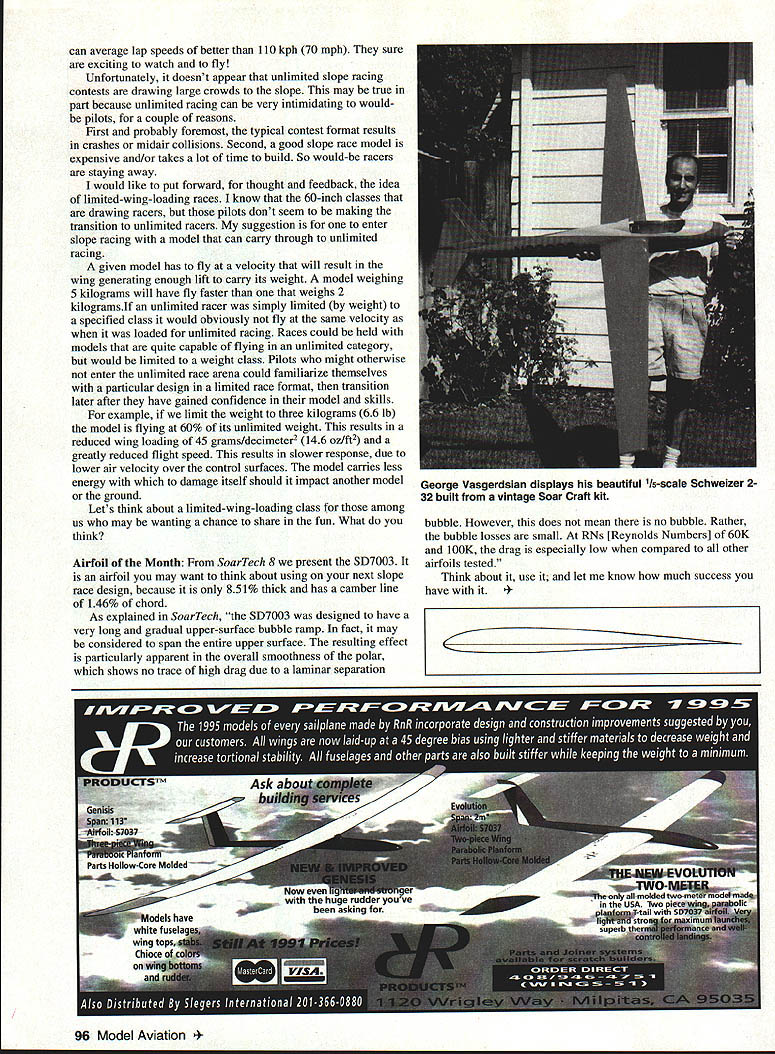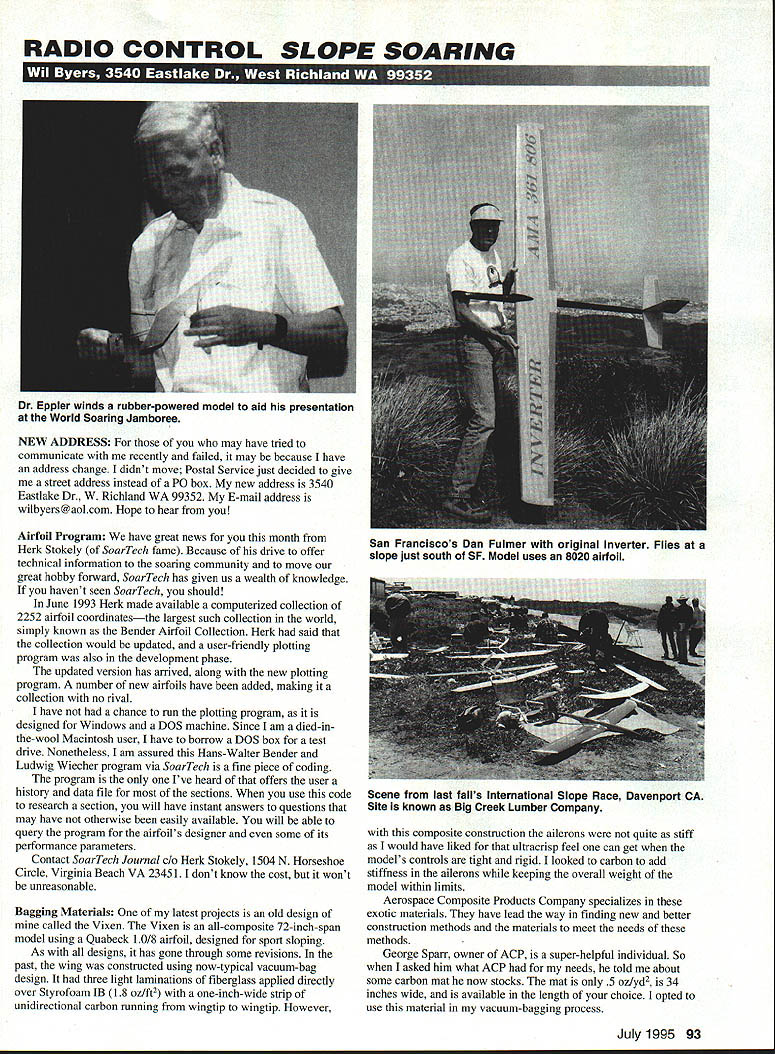 RADIO CONTROL SLOPE SOARING NEW ADDRESS may have tried communicate recently failed may because have address change didnt move Postal Service just decided give street address instead P0 box new address 3540 Eastlake Dr W Richiand WA 99352 E-mail address wilbyers@aolcom Hope hear Airfoil Program have great news month Herk Stokely SoarTech fame Because drive offer technical information soaring community move great hobby forward SoarTech has given us wealth knowledge havent seen SoarTech should June 1993 Herk made available computerized collection 2252 airfoil coordinatesthe largest such collection world simply known Bender Airfoil Collection Herk said collection would updated user-friendly plotting program also development phase updated version has arrived along new plotting program number new airfoils have added making collection no rival have chance run plotting program designed Windows DOS machine Since am died-inthe-wool Macintosh user have borrow DOS box test drive Nonetheless am assured Hans-Walter Bender Ludwig Wiecher program via SoarTech fine piece coding program Ive heard offers user history data file sections use code research section will have instant answers questions may have otherwise easily available will able query program airfoils designer some its performance parameters Contact SoarTech Journal Herk Stokely 1504 N Horseshoe Circle Virginia Beach VA 23451 dont know cost wont unreasonable Bagging Materials latest projects old design called Vixen Vixen all-composite 72-inch-span model using Quabeck 10/8 airfoil designed sport sloping As designs has gone through some revisions past wing constructed using now-typical vacuum-bag design three light laminations fiberglass applied directly over Styrofoam lB 18 ozlft2 one-inch-wide strip unidirectional carbon running wingtip wingtip However composite construction ailerons quite stiff would have liked ultracrisp feel can get models controls tight rigid looked carbon add stiffness ailerons keeping overall weight model within limits Aerospace Composite Products Company specializes exotic materials have lead way finding new better construction methods materials meet needs methods George Sparr owner ACP super-helpful individual So asked him what ACP needs told about some carbon mat now stocks mat 5 oz/yd2 34 inches wide available length choice opted use material vacuum-bagging process July1995 93 Dr Eppler winds rubber-powered model aid presentation World Soaring Jamboree San Franciscos Dan Fulmer original Inverter Flies slope just south SF Model uses 8020 airfoil Scene last falls International Slope Race Davenport CA Site known Big Creek Lumber Company plan use two laminations lightweight fiberglass cloth carbon mat captured between should make wing stiffer stronger looking composite material cant find anywhere else suggest contact Aerospace Composites will gladly send latest catalog filled items vacuum-bagging molding just glassing wings Aerospace Composite Products 14210 Doolittle Dr San Leandro CA 94577 Tel 510 352-2022 Fax 510 352-2021 New Newsletter/Magazine spin-off North American Scale Soaring Association coming way July US-based premium quality quarterly newsletter/magazine dedicated Scale RC soaring slope soaring publication will simply called Scale Slope Publicists new venture say direct result modelers demanding information burgeoning areas Scale slope soaring Consequently Scale Slope will focus two specialized areas gathering information soaring community spans globe SSs blueprints call feature photo pictorial craftsmans corner modeler interviews news Scale vintage section Scale modern section sources section SS airfoils slope racing aerobatics just plain general Scale slope flying Scale Slope will feature color cover black-and-white inside pages introductory price $1995 year Members NASSA can purchase SS $995 Box 4267 W Richland WA 99352 Check money orders Hot New CyA Charlie Smith Bob Smith Industries sent nice note couple product samples other day Wow Bob Smith coming out neatest new glue since cyanocrylates CyAs invented Insta-Cure CyA gel will released July Let quote Bob Smiths brochure help better understand CyAs Cyanoacrylates have become adhesive choice hobby household applications High-quality CyAs such InstaCureTM used properly form bonds cases stronger material being adhered Insta-Cure highly refined CyA combined its freshness gives guaranteed two-year shelf life CyAs reactive monomers chemically link polymerize pressed thin film very thin layer water moisture present surfaces acts alkali weak base catalyst results bonding however presence detectable amounts water usually degrades performance CyAs Insta-Cure has water-thin viscosity wicks deep joints capillary action cures matter few seconds Surfaces bonded must tight fitting should held together apply CyA around edges seam moment CyAs cure give off vapor can irritate nose eyes Thin CyAs work very well balsa since penetrate wood form just surface bond Since its gel product stays put such simple solution problem CyAs running down part applied Im surprised took industry long think Insta-Cure GelTM simple apply use Squeezes out tube onto part being bonded locate part needed hit accelerator Fantastic Bob Smiths new gel will able find number applications model building Food Thought Slope racing riot right go-fast-turn-right go-fastturn-left part wonderful hobby Unlimited racers can average well excess 120 mph during dive start gate can max out weight five kilograms carry wing loading 75 grams/decimeter2 11 pounds 2435 ozlft2 said no wonder July1995 95 D & J ELECTRONICS Howell Michigan mI517-546-2644 Service & Repairs Most Radio Control Systems Utilizing Calibrated Test Equipment & Spectrum Analyzers Endorsed AMA RCMA Sticker Station #105 Futaba Airtronics JR Ace HiTec Tower Cirrus World Engines & WE USE GENUINE FACTORY REPLACEMENT PARTS Complete 1991 Narrow Banding & Upgrades RCD / HITEC R/C DEALER FCC Licensed Speed Control Repairs Quality Service Fast Turn Around Sh
