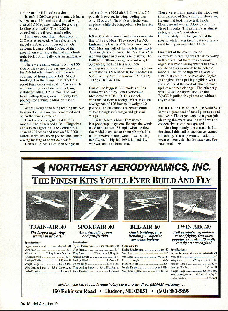 RADIO CONTROL SLOPE SOARING E'i1 HISTORICALLY SLOPE Soaring hasnt produced large-participation competitions events Organizers probably inhibited about organizing due nature flying environment Slope Soarings total dependance wind generate lift isnt conducive scheduling events wind doesnt blow slope event becomes thermal affair Consequently can count standout Slope Soaring events hand Memorable events include International Slope Races Torrey Pines Scale FunFly Mid-Columbia Slope Races Tn-Cities Scale Fun Flies World Soaring JamboreeTM Now another significant annual Slope Soaring eventthe Los Banos Slope Scale Soar-In held May 5-7 scheduled again 1996 Los Banos Slope Scale Soar-In event minds Lynsel Miller Sean Sharif created help promote Scale RC Soaring As such brings together unique talented group modelersnot fly also share documenting building ideas participate Scale Soaring buffs travel Los Banos far away Canada Oregon Washington California three-day relaxed-atmosphere event hosted central Californias San Joaquin Valley just off Interstate 5 Los Banos Reservoir slope site 400-acre reservoir ringed steep grassy hills hills containing irrigation water also accommodate almost wind direction generate lift models soaring birds Los Banos Contest Directors can host Soar-In fears about wind conditions Attending event like truly fun-filled aesthetic treat Its modelers event motivates stimulates pleases eyes spectator provides diversity hobby has much offer Moreover events like breaking new ground RC soaring movement Los Banos event others like provide fliers chance fly models organized format isnt normally available AMA contest circuit importantly Los Banos event about joy model building flying sharing hobby Los Banos brought out dedicated Scale Soaring movement Included Rich Spicer R n R Products Ken Williams K&A Models Phil Bernhardt Managing Editor Model Builder Steve Hinderks Birdworks New faces included some outstanding modelersfellows like Dave Squires Collen Raley great Junior modeler Dennis Brandt Dan Fulmer Tom Overton Jose Sarrano about 65 others wasnt huge event certainly respectable account Entrants flew potpourri Soaring aircraft including Modem soarers Vintage gliders Power Slope Scale PSS craft Entries ranged 1/6 scale number odd scales between John Raley coined phrase GGG categoryGerman Generic Glider means new gliders driven performance constraints look alike something everyone 92 Model Aviation t organizer Sean Sharif readies Pilatus B-4 launch note cloud developments background Willy Grundler launches Grob 103C Acro hillside lift Model prebuilt Peter Zack Models Florida Bill Liscomb readies DG-202 Racer launch 1h-scale model has 151-in span glass fuselage bagged wing John Raleys nice 1A-scale Grunau Baby does slow flyby camera model built Krick kit Modern soarer category George Hollidge showed crowd what high aspect ratio about super-performing /5-scale model George built model R n R Products limitedproduction kit machine has great lift-to-drag ratio Rich Spicer manufactures kit said close scale could get three-view available did look fly like full-scale glider Dennis Brandt flew nicely done -scale Thermo Flugel ASW-24 model shows what new generation Scale RC soarer about Its very accurate Scale model performs exceedingly well model has 35-meter span Ritz 2 modified airfoil Dennis has done great job detailing cockpit pilot instrument panel Los Banos meet awarded Pilots Choice awards Modern Vintage PSS categories Jim Thurmond won Modern category -scale copy John Roncz-designed Genesis Jim scratch-built example carved plug fabricate mold fiberglass fuselage pressed obechi veneer skins over blue foam construct wings Jim vacuumformed canopy over canopy buck thing missing Modern design fully detailed cockpit pilot Nonetheless Jims scratch-built effort clearly demonstrated modeler doesnt need spend $1000 Scale model participate eventor have whole lot fun Vintage category winner Pilots Choice Award Dennis Brandt beautiful -scale Minimoa Dennis model also scratch-built Its fabric-covered red-andwhite paint scheme tastefully decorated design flew exceptionally well standout model scratch-built category although Vintage model gorgeous -scale Schweizer l-26C Jason Nemake built glider MA plans features exquisite white MonoKote finish model includes details including wingtip wheels used USE 21.. 57X3 6x21159 63X42395 65X292395 65X372395 65X503395 65X553395 t5X6t3395 65 X653395 7X315159 7X415159 7X5159 7Xt159 7X7159 7X8159 7X9159 7X10159 7625 X 32514395 78X4395 78X66395 78X76395 8X414179 8X54179 8Xt179 8X7179 8X8179 8X9179 8X10179 85X54395 85X554395 85X655395 85X705395 5 795 875X8O..5.. 875 X 825 . S 8758855 984 16 985 16199 986199 987199 988199 9X9199 9810199 95 X tSN .. S395 95 X 70N .. S395 95 X 75N .. 5395 95 X 8ON .. 5395 95 X 8SN .. 5395 9865 395 9X75 395 9885 395 95 845 29 1083229 10x4229 1OXS229 10X6229 1t87229 ltX8229 1989229 19819229 195 845 11395 1183249 Sound Suppression Design High Thrust Efficiency Long Fiber Advanced Composite Material Continually Evolving Design Manufactured Landing Products PO Box 938 knights Landing CA 95845 SIZEUSE PRICE 1184249 1185249 11X6249 1187249 1188249 1189249 1286289 1287289 1286289 118137795 118117795 118127795 11812W7795 118137795 118147795 115848289 1225 X 3758349 12897795 1289W7795 128107795 12810W7795 128117795 12811N7795 1281157795 128127795 1281257795 12812N7795 12X137795 12813N7795 128147795 125897795 12SX1O7795 1258117795 SIZEUSE PRICE 12581157795 1258127795 12581257795 125X13 5 1386425 1387425 1388425 1389 7795 13X10 795 13X11 795 13812 795 13813N 95 13813SN.9795 1358971295 1358 it71205 1358 115N 71295 1358125 101295 1358133 101295 1358135 101295 135 X 14 .. 10 . 1295 135 8 14W 1295 1485N1295 14861295 14881295 148101295 14811171295 14812101295 148 12N101295 14813lt.1295 14813N191295 148135 19 1295 148 13SN . 10 . 1295 14814191295 SIZEUSE PRICE 14814N101295 1448 195 101295 144812 101295 144813 ..I0.1295 145 8 14N . 10 . 1295 1458 145N10