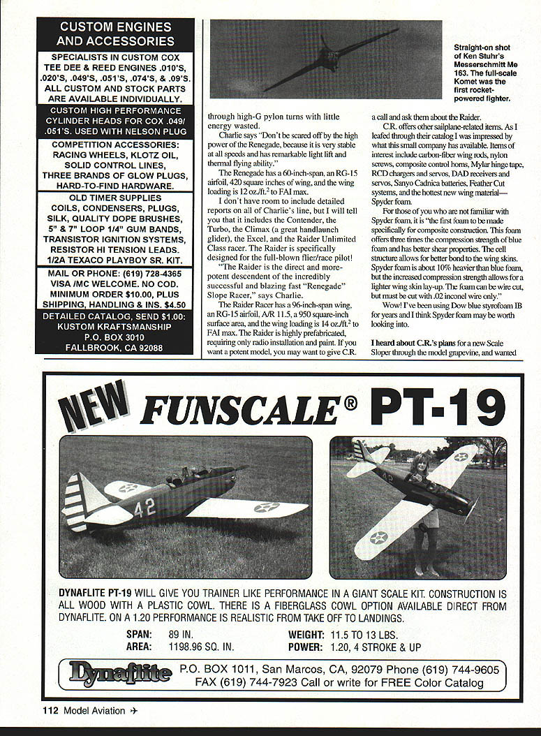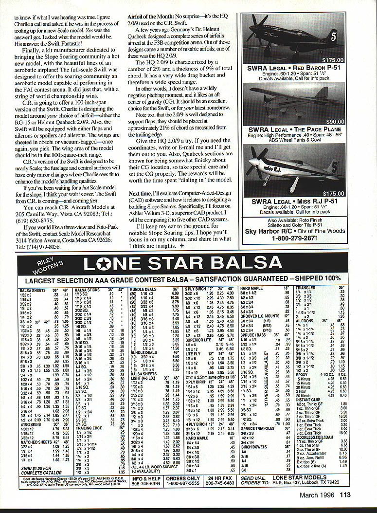 RADIO CONTROL SLOPE SOARING INTERNET CONNECTIONS Internet communications environment no equal electronic communications network links millions computers give penetrate its web information click mouse Simply Internet massive place full information ideas model aviation enthusiasts Intemet has become area see seen Moreover has given millions modelers would-be modelers instant access concepts ideas might otherwise go unnoticed Without doubt Internet good growth model aviationand good model aviation certainly good RC Soaring Consequenfly would like invite read column contact via Internet E-mail address wilbyers@aolcom dont have Internet connection have computer may want think about contacting Internet access provider get online lots access providers wont tiy evaluate services short column will emphasize youre choosing provider must look needsnot now also n not-too-distant future needs will change best provider will able service needs look providers can meet needs now America Online Inc service company can give Intemet World Wide Web WWW access America Online provider like what have Other providers include Prodigy CompuServe MS-Net Apple-Net host independent providers will get online some offer access features unique server system computers connect Internet via modem computer Make sure meet needs get online may want check out World Wide Web Web called marvelous evolution Intemet giving users links information worldwide Being Web means can visit electronically information sites tilled useable data Moreover Web unique uses user-friendly HyperText Markup Language HTML incorporates HyperText Transfer Protocol HTIP What does mean Web user click link text Internet connection automatically transferred site link link may take Dr Seligs Web site South Africa Australia Japan location makes no differenceyou WWW have connections world nearly speed light said Ill give few sites visit may open eyes mind Net Id suggest begin good search site site like useremember othersis Yahoo Yahoos address http/wwwyahoocom Once youre connected Yahoo site can simply type search parameter Yahoo will rest example type SOARING Yahoo searches its Web references gives number hits subject interest Next click HTIP link highlighted blue computer Net will rest work Soon computer will linked site information experience fun yields lots cyber data few soaring sites may want check out Dr Michael Seligs site httpAixhcsouiucedu/selig Good Weather site http/wwwprincetonedufWebweather/wwhtm Northeast Sailpianes http/afabmvcomlnsplnsphtm Soaring Society America http/aCRoharvardedu/SSAlssahomepghtml MIT Soaring Area http/aCRoharvar&edu/MlTSAIrnitsa homepghtm Switzerland Scaiing http/wwweurotaxchlhangliderfmdexhtuil Sailplane Modeler http/wwwwolfenet/zachsoft/sailplane few hundreds sites out pemsal Log cbeck out learn lot have great time browsing Web CR Aircraft have participated Slope Soaring some length time may know Charlie Richardson CR Aircraft company has grown include diverse designs CR has very few companies focus its design attention Slope Soaring CR process tooling up produce its first entry Scale arena first let tell about company what else has offer CR Aircraft has wide army Slope gliders fact CR almost completely dedicated Slope Soaring market product line includes models ranging 72-inch wingeron Contender Raider Unlimited Class racer models offer high-quality molded epoxy/fiberglass fuselages some reinforced Kevlar graphite CR fuselages feature beautifully crafted slip-on nose cones CR also known craftsmanship vacuum-bagged wings browse through CR catalog get instant feel power behind some Charlies designs Slope models dedicated performance Slope environment will attack sky heaviest winds Renegade example high-performance 60-inch-span Class Slope Racer sports RG-15 airfoil beautifully vacuum-bagged wing airplane has structural integrity carry two pounds ballast will tum guided missile Renegade incorporates flaperon system crank model 4 March1996 111 Gary Brokaw does flyby nice -scale German Scheibe Bergfalke sailplane V-Max cruises slope lift aided strong thermals Bigger better Pete Bechtel looks lift /4-scale ASW 24 model German Thermoflugel kit OLD TIMER SUPPLIES COILS CONDENSERS PLUGS SILK QUALITY DOPE BRUSHES 5 & 7 LOOP 114 GUM BANDS TRANSISTOR IGNITION SYSTEMS RESISTOR HI TENSION LEADS 112A TEXACO PLAYBOY SR KIT MAIL OR PHONE 619 728-4365 VISA IMC WELCOME NO COD MINIMUM ORDER SIOOO PLUS through high-U pylon turns little energy wasted Charlie says Dont scared off high power Renegade because very stable speeds has remarkable light lift thennal flying ability Renegade has 60-inch-span RG-15 airfoil 420 square inches wing wing loading 12 ozlft2 FM max dont have room include detailed reports Charlies line will tell includes Contender Turbo Climax great handlaunch glider Excel Raider Unlimited Class racer Raider specifically designed full-blown flier/race pilot Raider direct morepotent descendent incredibly successful blazing fast Renegade Slope Racer says Charlie Raider Racer has 96-inch-span wing RG-15 airfoil A/R 115 950 square-inch surface area wing loading 14 ozift2 FM max Raider highly prefabncated requlnng radio installation paint want potent model may want give CR Straight-on shot Ken Stuhrs Messerschmiu 163 full-scale Komet first rocketpowered fighter call ask about Raider CR offers other sailplane-related items As leafed through catalog impressed what small company has available Items interest include carbon-fiber wing rods nylon screws composite control horns Mylar hinge tape RCD chargers servos DAD receivers servos Sanyo Cadnica batteries Feather Cut systems hottest new wing material Spyder foam familiar Spyder foam first foam made specifically composite construction Ibis foam offers three times compression strength blue foam has better shear properties cell structure allows better bond wing skins Spyder foam about 10% heavier blue foam increased compression strength allows lighter wing skin lay-up foam can wiie cut m
