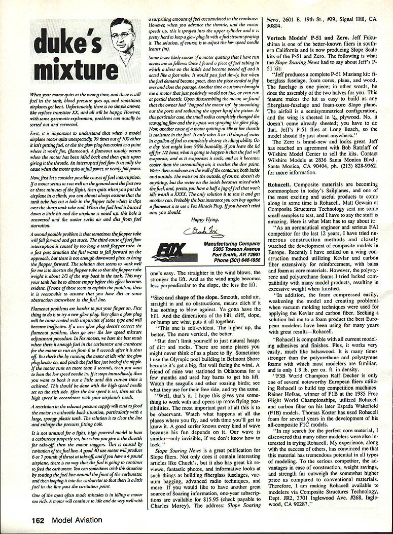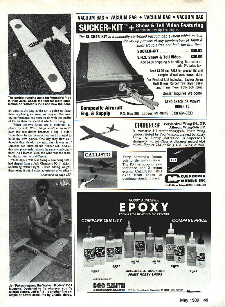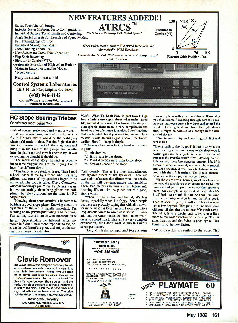 INTERNATIONAL RC Scale Soaring Fun-Fly coming up recently received update Wil Byers years fun-fly Heres what say weekend Memorial Day 1988 weekend first-ever National RC Scale Soar ing Fun-Fly Soaring Social event marked outstanding enthusiasm tremen dous support Soaring community As result event will probably go down Soar ing annuals genuine success therefore Tn-City Soarers feel worthy repeating 1989 Now attended enjoyed yourself want invite come back share event us again however able attend last year think event kind Soaring happening want part heartily welcome come TnCities participate International RC Scale Soaring Fun-Fly May 26 27 28 1989 goal years event attract entrants over world well US Canada successful endeavor will have opportunity share other fine craftsmanship flying skills participation vital end Whether its because youre meticulous crafts man talented flier just all-around nice guy would absolutely miss able attend want Think about much fun would have regis ter great Soaring experience will again using Clover Island Mo tor Inn fun-fly headquarters hotel has greatly improved through complete remod eling management hospitable last year restaurant has added new menu view rooms still just great ever Columbia River flowing just feet away room beautiful desert mountains distance Tn-Cities Soarers genuinely hope registering right now will soon get chance meet see models action Make note re ceive registration will enter event about month prior event will send information packet packet will include maps telephone numbers site location directions Additionally sug gest register early make room res ervation making reservations hotel please indicate Soaring group course get Glider done order Lastly Tri-Cities has picked site 1989 AMA National Championships year will include AMA sanctioned one-day Slope race feel testa ment slopes second provided wind cooperates plans will rewarded fun-fly enjoyable times Soaring life Viking F3F Slope Race event will held Denmark June 1 1989 opportunity see some best Slope fliers world received letter Dale Willoughby will competitors US Dale will team manager/competitor anyone dwel ling east Mississippi River bound Denmark plan attending event get touch Dale soon possible ad dress PO Box 927 Jacksonville NC 285410927 Lift following two-part article ap peared two recent issues Slope Soaring News Written Chuck Korolden discusses what lift find LiftWhat What stupid question Lift Its what live its Just because wind blowing up slope good clip doesnt mean lift good fact wind velocity ladder impor tance several rungs below other factors present readily obvious True Maniah other factors come moot function gether whole called life an lift bout Freudian slip keyboard Lift combination wind velocity Left Members White Sheet Radio Fiying Ciub recent ciub Scaie competition WSRFC premier Siope ciubs UK Obviously specallze Scaie modeiing Right David Brigga waIts judging circie gorgeous quarter-scaie Twin Acoro Southwest main bowi Slope background site has plenty room iand glider Photos Sean Waibank 48 Model Aviation Radio Conoi Slope Soaring Mark Triebes 20794 Kreisier Ct Saratoga CA 95070 Doug Hertzog copilot Troy gets ready aunch Dougs Siihouette Silhouette new kit being produced Doug come future articie Photo Charile Morey air density As long air going up faster plane goes down stay up Soar ing performance has quality air speed its rising two forces optimum planes fly well things arent up snuff best design becomes dog didnt know factors existed until started build own planes day flew thought should next day someone taken flubber out took place under aimost same wind condi tions As learned later wind same air very different day test flying new wing shaped Jack Chambers JC-14 airfoil Something wasnt right tried adding weight taking out made adjustment after adjustContinued page 157 VACUUM BAG UM BAG UM BAG UM BAG SUCKER-KIT manually controlled vacuum bag system makes lay up process combination foam & skins trouble free fast first time SUCKER-KIT$5995 VHS Show & Tell Video$3995 Add $400 shipping & handling MI residents add 40/a sales tax Send $100 SASE product list samples real wood veneer skins Product List Includes Gapless Arrow Shaft Hinges Carbon Tow Mylar Sheet High-Tech items Dealer Inquires Welcome SEND CHECK OR MONEY ORDER TO Box 866 Lapeer Ml 48446 313 664-3330 Polyhedral Wing-$41 PP Aileron Wmg-$46 PP versatile 1/2 meter wingspan Foam Wing Glider Piloted Paul Wilson crewed Rusty Shaw & Leroy Satterlee Chupersoas designers set Glass record 66 miles Eppler 214 Tersy Edmonds famous pair thermal duration 10 has superior per formance 2 meter events CALLISTO takes over dominate standard class May 1989 49 perfect running mate Vortechs P-51 Zero Check text Infor mation Vortechs P-51 new Zero Composite Aircraft Eng & Supplypo Jeff Fukushima Vortech Models P-51 Mustang Designed fly wherever fly aileron planes Jeffs P-Si another fine ex ample power scale Plc Charlie Moray 8971 AVAILABLE AT AMERICAS FINEST HOBBY SHOPS 69786528 DISTRIBUTED BY sMInhII RED WDYZRZD 7660 So, Gobriel Rood cadero CA 95422 806 466-1717 FROM IIAVEY YSTEMS ir really slick trainers little hassles building taken out box before open birds simple build pretty look small parts well sides tail feathers pre cut ready quick assembly Youll air flying own faster ever expected AT-50 four channel advanced trainer 19-30 engines scale look flies rock stable like pattern bird has wide speed range Has 50 span semi-symme trical airfoil 400 sq area Both kits feature rolled plans step-by step instructions hardware wheel pants formed gear accurately die machine cut selected woods BT-20 three channel trainer 15-25 engines Has fully sheeted flat bottom wing can built optional ailerons 50 span 400 sq area IAVEY675 TOWER LANE YSTEMS WEST CHESTER PA 19380 oRPORATIoN tial interference distant sources number measures can take reduce eliminate skywave interfer ence problems some suggestions 1 Use good quality narrow-band 