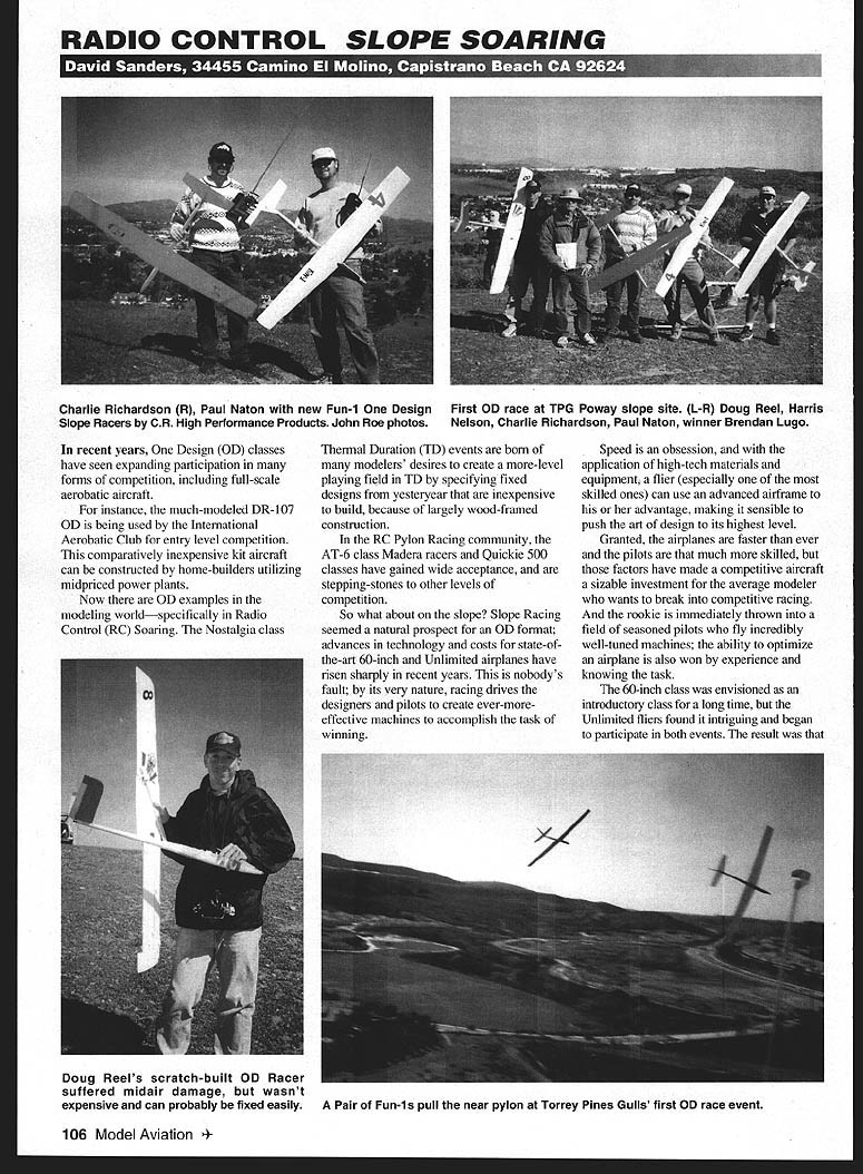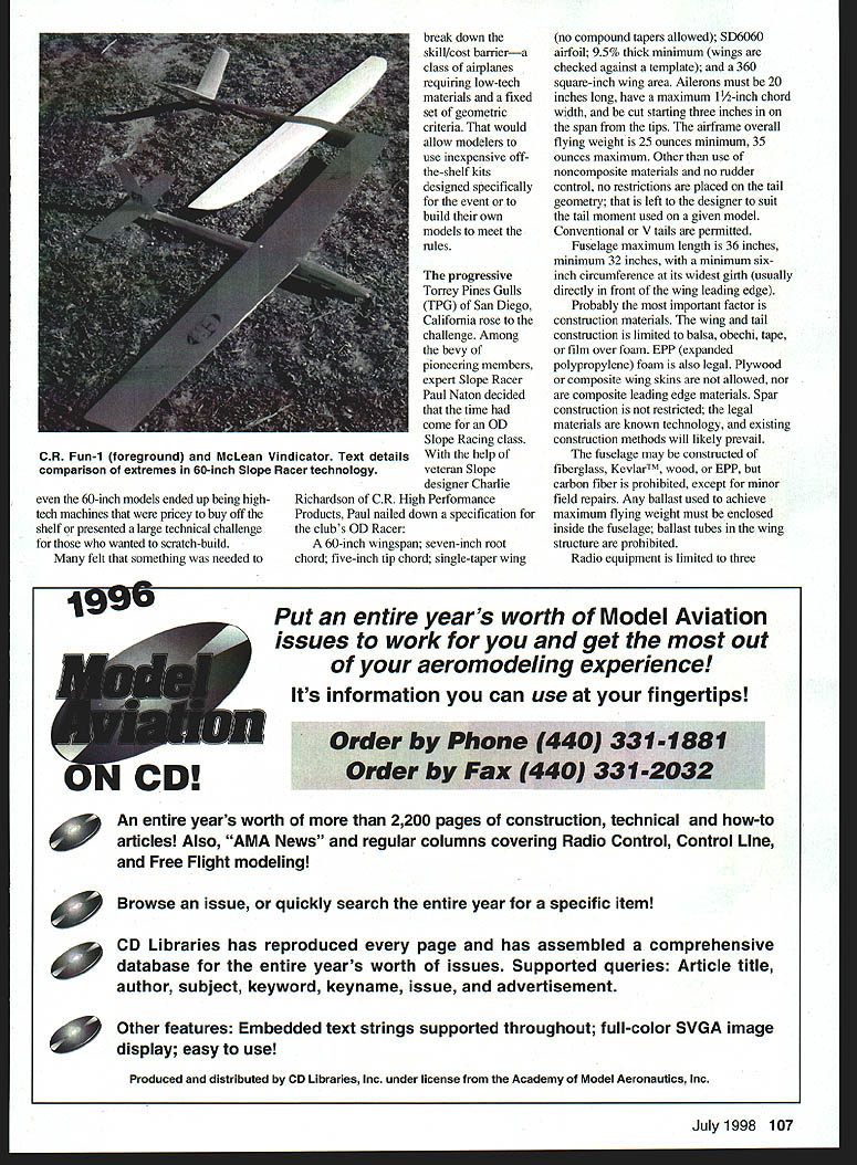 RADIO CONTROL SLOPE SOARING El FxTr recent years Design OD classes have seen expanding participation forms competition including full-scale aerobatic aircraft instance much-modeled DR-107 OD being used International Aerobatic Club entry level competition comparatively inexpensive kit aircraft can constructed home-builders utilizing midpriced power plants Now OD examples modeling worldspecifically Radio Control RC Soaring Nostalgia class Thermal Duration TD events born modelers desires create more-level playing field TD specifying fixed designs yesteryear inexpensive build because largely wood-framed construction RC Pylon Racing community AT-6 class Madera racers Quickie 500 classes have gained wide acceptance stepping-stones other levels competition So what about slope Slope Racing seemed natural prospect OD format advances technology costs state-ofthe-art 60-inch Unlimited airplanes have risen sharply recent years nobodys fault its very nature racing drives designers pilots create ever-moreeffective machines accomplish task winning Speed obsession application high-tech materials equipment flier especially skilled ones can use advanced airframe advantage making sensible push art design its highest level Granted airplanes faster ever pilots much skilled factors have made competitive aircraft sizable investment average modeler wants break competitive racing rookie immediately thrown field seasoned pilots fly incredibly well-tuned machines ability optimize airplane also won experience knowing task 60-inch class envisioned introductory class long time Unlimited fliers found intriguing began participate both events result 106 Model Aviation lie Richardson R Paul Naton new Fun-i Design First OD race TPG Poway slope site L-R Doug Reel Harris Slope Racers CR High Performance Products John Roe photos Nelson Charlie Richardson Paul Naton winner Brendan Lugo Doug Reels scratch-built OD Racer suffered midair damage wasnt expensive can probably fixed easily Pair Fun-is pull near pylon Torrey Pines Gulls first OD race event 60-inch models ended up being hightech machines pricey buy off shelf presented large technical challenge wanted scratch-build felt something needed break down skill/cost barriera class airplanes requiring low-tech materials fixed set geometric criteria would allow modelers use inexpensive offthe-shelf kits designed specifically event build own models meet rules progressive Torrey Pines Gulls TPG San Diego California rose challenge Among bevy pioneering members expert Slope Racer Paul Naton decided time come OD Slope Racing class help veteran Slope designer Charlie Richardson CR High Performance Products Paul nailed down specification clubs OD Racer 60-inch wingspan seven-inch root chord five-inch tip chord single-taper wing no compound tapers allowed 5D6060 airfoil 95% thick minimum wings checked against template 360 square-inch wing area Ailerons must 20 inches long have maximum 1 V-inch chord width cut starting three inches span tips airframe overall flying weight 25 ounces minimum 35 ounces maximum Other use noncomposite materials no rudder control no restrictions placed tail geometry left designer suit tail moment used given model Conventional V tails permitted Fuselage maximum length 36 inches minimum 32 inches minimum sixinch circumference its widest girth usually directly front wing leading edge Probably important factor construction materials wing tall construction limited balsa obechi tape film over foam EPP expanded polypropylene foam also legal Plywood composite wing skins allowed nor composite leading edge materials Spar construction restricted legal materials known technology existing construction methods will likely prevail fuselage may constructed fiberglass KevlarTM wood EPP carbon fiber prohibited except minor field repairs Any ballast used achieve maximum flying weight must enclosed inside fuselage ballast tubes wing structure prohibited Radio equipment limited three July1998 107 CR Fun-i foreground McLean Vindicator Text details comparison extremes 60-inch Slope Racer technology j990 Put entire years worth Model Aviation issues work get out aeromodeling experience Its information can use fingertips g An entire years worth 2200 pages construction technical how-to articles Also AMA News regular columns covering Radio Control Control Line Free Flight modeling g Browse issue quickly search entire year specific item g CD Libraries has reproduced page has assembled comprehensive database entire years worth issues Supported queries Article title author subject keyword keyname issue advertisement Other features Embedded text strings supported throughout full-color SVGA image display easy use Produced distributed CD Libraries Inc under license Academy Model Aeronautics Inc servosone elevator two ailerons Differential aileron mixing stick-activated camber changing allowed camber-toelevator mixing prohibited instance flaperon function must manually controlled transmitters left stick idea create ~spirit rules class Paul has indicated specification will remain flux year sure achieves desired goal inexpensive aircraft fun-oriented racing format encourage participation beginning racers downward mentorship experts areas airframe setup ballasting flying technique could shot arm Slope Racing could provide excellent basis development fun low-tech speedy sport Slope models Fun-i CR High Performance Products already market being used TPG members monthly races great-performing aircraft has set standard OD class models wing balsa sheeted over styrene foam uses glass/KevlarTM fuselage balsa tail group fuselage same Charlie Richardsons already successful widelyflown Blazer except Fun-is tail designed conventional arrangement opposed Blazers stock V configuration Notice photo Fun-i state-ofthe-art Brian McLean Vindicator set side-byside physical comparison models will give idea major differences Vindicator has triple-taper wing planform labor-intensive construct need six separate cutting 