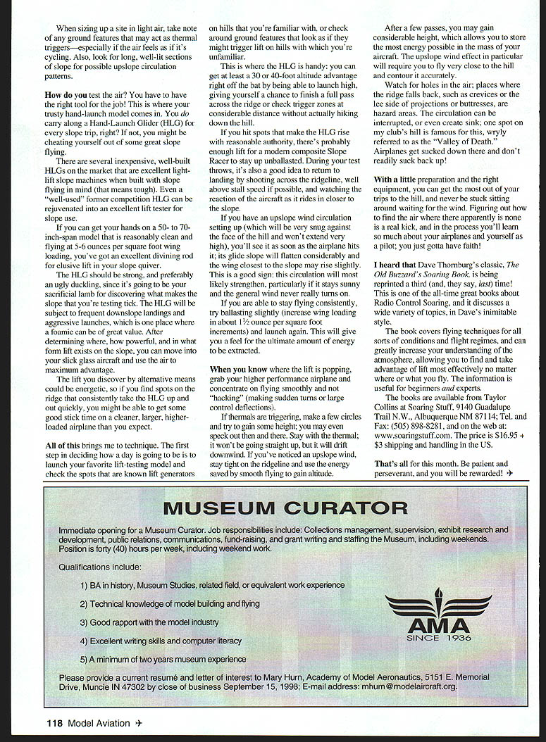 RADIO CONTROL SLOPE SOARING Slope contours Crevices often induce sink points ridges can trigger strong thermals straight areas can make upslope winds durations several minutes working columns pairs individually can impart considerable energy aircraft hallmark thermals triggering moving up slope cyclic slope winds wind blows lightly up slope stops reverses direction intervals few minutes theres likely thermals Im optimist know day spent slope good dayeven wind stinks fun way challenge yourself machines such day finding utilizing unconventional forms lift Three primary factors involved having good time light-lift days atmospheric/geographic analysis airframe selection flying technique rewarding necessarily thrilling sessions days youre event vacation may have take what can get Following some things ponder about above factors next light-lift slope-flying experience Just because general wind weak bit off-direction slope doesnt mean theres no lift may true general wind-driven slope lift theres still likely abundant least usable amount available through other means especially its sunny day general wind present least near correct direction slope very few days theres no lift just need know look Primary among alternate sources lift thermals however Slope Soarers fall appreciate take advantage thermal lift because dont make association never gave much thought until started flying regularly Thermal Duration TD pilots Some skilled experienced pilots could routinely work seemingly impossible air develop amazing energy speed runs aerobatics along ridgeline Thermals often propagated irregularities terrain consistent calm days hill fly may effective thermal trigger particularly possesses irregularities such outcroppings buttress ridges See Figure terrain-triggered thermals often columnar nature can pump lift popping loose valley floor face hill local slope has two sharp bends its ridgeline very reliable thermal trigger points making site flyable days theres almost no slope lift areas lift can very concentrated especially theyre close ground finding locations can challenging second source lift phenomenon known upslope winds See Figures 3 4 confused slope lift generated general wind See Figure 2 Upslope winds can found readily west-facing slopes sunny days As slope face begins heat up late morning midday hours adjacent air becomes heated warm air begins flow up slope thin layer As day wears reaches point maximum heating midafternoon circulation sets up creates rising air along face slope sinking air further Out front point lift ends apparent height above ridgeline horizontal distance out face Typically day good circulation sets up can get usable lift extending about 20% total sunlit height slope above ridgeline about half distance away air flattens begins sink out reaches ambient temperature again Several factors involved determining strength lift attainable upslope wind effect generally favors 3045O slope angles few irregularities ridgeline cast shadows Ive flown slopes less 100 feet tall exhibited phenomenon though lift created very gentle its smooth enjoyable fly Larger slopes can produce powerful very laminar upslope circulations make exciting afternoon whole process can establish itself matter minutes its worth waiting around before giving up going home General wind slope lift Compression face rotor just behind ridge Lift strong may turbulent ridgeline Early upslope wind little no general wind slope pattern can set up adequate ground heating Later upslope wind Heating continues later day upslope circulation gains energy size smooth clean lift 116 Model Aviation 4/11 \RIDGELINE CRE VICE SLOPE Fig 2 /// // 7-f Af /SLOPE Fig 3 //2 /4 71/ SLOPE Fig 4 sizing up site light air take note ground features may act thermal triggersespecially air feels its cycling Also look long well-lit sections slope possible upslope circulation patterns test air have have right tool job trusty hand-launch model comes carry along Hand-Launch Glider HLG slope trip right might cheating yourself out some great slope flying several inexpensive well-huilt HLGs market excellent lightlift slope machines built slope flying mind means tough well-used former competition HLG can rejuvenated excellent lift tester slope use can get hands 50- 70inch-span model reasonably clean flying 5-6 ounces per square foot wing loading youve got excellent divining rod elusive lift slope quiver HLG should strong preferahly ugly duckling since its going sacrificial lamb discovering what makes slope youre testing tick HLG will subject frequent downslope landings aggressive launches place foamie can great value After determining powerful what form lift exists slope can move slick glass aircraft use air maximum advantage lift discover hy alternative means could energetic find spots ridge consistently take HLG up out quickly might able get some good stick time cleaner larger higherloaded airplane expect brings technique first step deciding day going to launch favorite lift-testing model check spots known lift generators hills youre familiar check around ground features look might trigger lift hills youre unfamiliar HLG handy can get least 30 40-foot altitude advantage right off bat being able launch high giving yourself chance finish full pass across ridge check trigger zones considerable distance actually hiking down hill hit spots make HLG rise reasonable authority theres probably enough lift modern composite Slope Racer stay up unballasted During test throws its also good idea return landing shooting across tidgeline well above stall speed possible watching reaction aircraft rides closer slope have upslope wind circulation setting up will very snug against face hill wont extend very high youll see soon airplane hits its glide slope will flatten considerably wing closest slope may rise slightly good sign circulation will likely strengthen particularly stays sunny general wind never really turns able stay flying consistently try ballasting slightly increase 