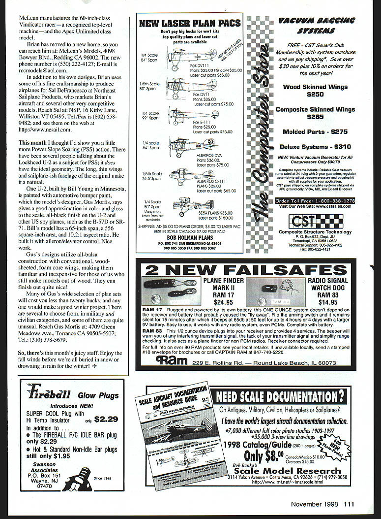 RADIO CONTROL SLOPE SOARING arent great deal competitive opportunities typical slope flier youve basically got Racing Combat Scale other little-mentioned score card though Academy Model Aeronautics AMA record book May 10 two intrepid slope-flying colleagues Rex Coffman Dean Thomas both Eureka California set out take stab AMA Class Slope Duration record Armed good batteries some time kill made li-hour-plus flights Rex took top honors flight 11 hours 43 minutes besting Deans time 22 minutes have tried duration flying know along long time standing hill pushing sticks Rex achieved record flight CR Aircraft Models Climmax See times have told leave home hand-launch airplane Climmax widely recognized all-time great high-utility Hand-Launched Gliders Out Deans equally impressive effort accomplished using own-design Panther Congratulations Rex Dean true ironman effort Quite few people have need speed getting best airframe can arduous task best ones often built cottage industries much ability meet publics hunger fast state-of-the-art models Stephen Situm San Rafael California notified putting production new Unlimited-class racer designed F3B World Champion Daryl Perkins coordination noted aero engineer Gavin Botha Viper has carefully optimized Slope Racing task Lets take look some details Following trend todays hottest new F3B Thermal Duration models Viper fully molded familiar construction means parts hollow constructed thin fiberglass shells create airframes form Advantages fidelity shape profile well light weight strength Parts painted molds factory-assembled eliminates almost finishing work user Vipers geometry airfoil carefully worked out tested worldclass team designers takes things highest levels V-tail design incorporates 1122-inch span tripletapered wing planform aspect ratio 1431 area 900 square inches carrying dry weight 73-77 ounces wing three-piece theres center section bolted fuselage outer panels fixed 1/2 x carbon joiners setup allows strong monolithic structure wings highest bending-stress pointwhere wing meets fuselage airfoil old favoritethe RG-15 Viper can ballasted full 5 kg Federation Aeronautique Internationale FAI weight limit well methodically figured out design goals sounds silly have ever tried fit 100 ounces lead narrow glass fuselage bears some head-scratching wings prewired servos control surfaces cut hinged pushrod housings installed specially manufactured control horns Paul Trist like mention airplanes column certain reasons Viper notable its top level competitive racing model regular slope flier can actually get hands Steve anticipates waiting time four weeks too bad compared similar designs Viper costs $950 kit form Steve can install set up radio equipment another $150 yielding Ready-to-fly model Its good see hometown guys giving European makers run money Reach Steve Situm 4 Friar Tuck Lane San Rafael CA 94901 Tel 415 456-2996 can also visit Web page http//membersaolcom/rcsoaring Another company might have seen mentioned McLeans Models Brian 110 Model Aviation Youngs 65-inch-span Lockheed U-2 Gus Morfis plans has ideal geometry Power Slope Soaring Viper friends Back L-R Jerry Hinds Steve Toschitz Karl Boe Jay Brehm Front L R Kevin Ostrum unknown sloper Mark Triebes Darrell Zaballos McLean manufactures 60-inch-class Vindicator racera recognized top-level machineand Apex Unlimited class model Brian has moved new home can reach him McLeans Models 4198 Bowyer Blvd Redding CA 96002 new phone number 530 222-4127 E-mail mcmodels@aolcom addition own designs Brian uses some fine craftsmanship produce airplanes Sal DeFrancesco Northeast Sailplane Products markets Brians aircraft several other very competitive models Reach Sal NSP 16 Kirby Lane Williston VT 05495 Tel/Fax 802 6589482 see web http//wwwnesailcom month thought Id show little Power Slope Soaring PSS action have several people talking about Lockheed U-2 subject PSS does have ideal geometry long thin wings sailplane-ish fuselage original make natural U-2 built Bill Young Minnesota painted automotive bumper paint models designer Gus Morfis says gives good approximation color gloss scale all-black finish U-2 other US spy planes such B-57D SR 71 Bills model has 65-inch span 556 square-inch area 1021 aspect ratio built aileronlelevator control Nice work Guss designs utilize all-balsa construction conventional woodsheeted foam core wings making familiar inexpensive us still make models out wood can finish out quite nice Guss wide selection plan sets will cost less twenty bucks would make good winter project several choose military civilian categories some quite unusual Reach Gus Morfis 4709 Green Meadows Ave Torrance CA 90505-5507 Tel 310 378-5679 So theres months juicy stuff Enjoy fall winds before buried snow drowning rain winter shippingt Save over $30 now plus 10% orders next year/ Wood Skinned Wings 9250 VACVW 5AfINU trtiiMt FREE- CSTSovers Club Membership system purchase U U U m U II EEl ill U U EComposite Skinned Wings mU1285 U U U U U NEW Venturi Vacuum Generator Air Compussora Only $3070 Complete Systems include Reliable Cast vacuum pomp rated 24 in/hg 2year goarantee regulator assembly adjost vacuum prenuore begging supplies application CST pays shippieg complete systems shipped via UPS greund VtSA MC Am Es Discover N •00 U U_____________ U____________ w ______ Em UE Molded Parts 1275 U Deluxe Systems $310 Visit Web Site wwwcstsalesconi .. U IE I I ~ U U U Composite Structure Technology PO Box 622 Dept u Tehactiapi CA 93581-a622 Tec5nical Support 805-8224162 Fax 8a5-822-4121 Glow Plugs Introduces NEW SUPER COOL Plug Hi Temp Insulator caly $229 addition . FIREBALL RC IDLE BAR plug $229 Hot & Standard Non-Idle Bar plugs still $195 Swanson Associates PO Box 151 Wayne NJ 07470 Antiques Military Civilian Helicopters Sailpianes hove wodds largest aircraft documentation collection 7000 different full color photo studies 1903-1997 35000 3view line drawings 1998 Cotolo /Guide 200 pages Only g$8Ccnadcr Moo $500 Baikus