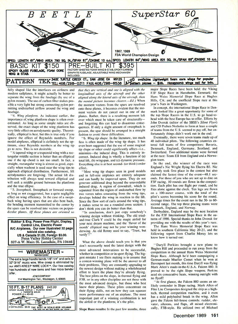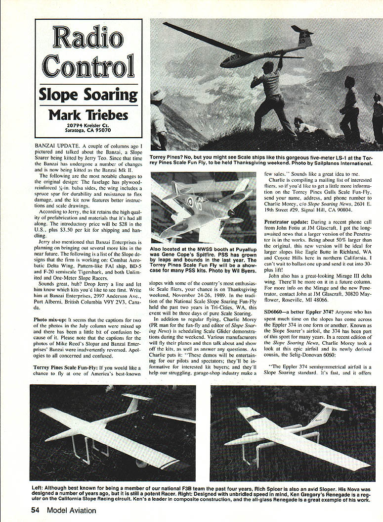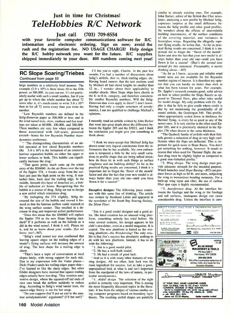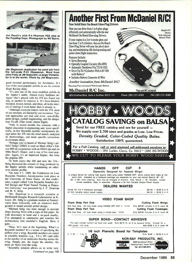 BANZAI UPDATE couple columns ago pictured talked about Banzai Slope Soarer being kitted Jerry Teo Since time Banzai has undergone number changes now being kitted Banzai Mk II following notable changes original design fuselage has plywoodreinforced /5-in balsa sides wing includes spruce spar durability resistance flex damage kit now features better instruc tions scale drawings According Jerry kit retains high qual ity prefabrication materials its along introductory price will $28 US plus $350 per kit shipping han dling Jerry also mentioned Banzai Enterprises planning bringing out several kits near future following list Slope de signs firm working Combat Aero batic Delta Wing Pattern-like FAt ship BD-5 F-20 semiscale Tigershark both Unlim ited One-Meter Slope Racers Sounds great huh Drop Jerry line let him know kits youd like see first Write him Banzai Enterprises 2997 Anderson Ave Port Alberni British Columbia V9Y 2V3 Cana da Photo mix-up seems captions two photos July column mixed up has little bit confusion cause Please note captions photos Mike Reeds Slopar Banzai Enter prises Banzai inadvertently reversed Apol ogies concerned confused Torrey Pines Scale Fun-Fly would like chance fly Americas best-known slopes some countrys enthusias tic Scale fliers chance Thanksgiving weekend November 24-26 1989 tradi tion National Scale Slope Soaring Fun-Fly held past two years Tn-Cities WA event will three days pure Scale Soaring addition regular flying Charlie Money PR man fun-fly editor Slope Soar jog News scheduling Scale Glider demonstra tions during weekend Various manufacturers will fly planes talk about show off kits well answer questions As Charlie puts demos will entertain ing pilots spectators theyll formative interested kit buyers theyll help struggling garage-shop industry make few sales Sounds like great idea Charlie compiling mailing list interested fliers youd like get little informa tion Torrey Pines Gulls Scale Fun-Fly send name address phone number Charlie Morey Slope Soaring News 2601 E 19th Street #29 Signal Hill CA 90804 Penetrator update During recent phone call John Fotiu JM Glascraft got longawaited news larger version Penetra tor works Being about 50% larger original new version will ideal larger slopes like Eagle Butte Richland WA Coyote Hills northern California cant wait ballast up send Out 30plus lift John also has great-looking Mirage III delta wing Therell future column info Mirage new Pene trator contact John JM Glascraft 30820 May flower Roseville MI 48066 596060a better Eppler 374 Anyone has spent much time slopes has come across Eppler 374 form another Known Slope Soarers airfoil 374 has part sport years recent edition Slope Soaring Newr Charlie Money took look epic airfoil its newly derived cousin Selig-Donovan 6060 Eppler 374 semisymmetnical airfoil Slope Soaring standard Its fast offers Left Although best known being member national F3B team past four years Rich Spicer also avid Sloper Nova designed number years ago still potent Racer Right Designed unbridled speed mind Ken Gregorys Renegade reg ular California Slope Racing circuit Kens leader composite construction all-glass Renegade great example work 54 Model Aviation Radio Control Slope Soaring Mark Triebes 20794 Kreisier Cc Saratoga CA 95070 Torrey Pines No might see Scale ships like gorgeous five-meter LS-1 Tar ray Pines Scale Fun Fly held Thanksgiving weekend Photo Sailpianes International Also located NWSS booth Puyallup Gene Copes Spitfire P55 has grown leaps bounds last year Torrey Pines Scale Fun Fly will show case PSS kits Photo Wil Byers good inverted performance Aerobatics Its popular airfoils use custom Slope Racing ships Its also modified airfoils Dr Epplers stable Almost Sailplane de signer whos played 374 has found way another improve Its thinned tweaked tossed turned tilted inter est making better already Although everyone tinkers 374 attempts limited resources Typ ical approaches trial error seat-of-thepants design eyeball engineering ubiqui tous TLAR Looks About Right Only recent months has someone higher education engineering specif ically low Reynolds number aerodynamic de sign taken 374 wind tunnel analyzed its shortcomings made specific corrections eliminate Perhaps youve heard Michael Seligs air foils Seligs S3021 used Mark Allens Fal con 880 conjunction S3014 tip Mike Reeds Slopar pop ular Again its improved Eppler time popular 205 both casesthe 205 now 374 Selig decreased amount drag produced Eppler airfoils maintaining other wise similar profile June 5-7 1989 Conference Low Reynolds Numbers Aerodynamics took place University Notre Dame confer ence paper called Low Reynolds Number Air foil Design Wind Tunnel Testing Prince ton University presented J F Donovan M S Selig Mr Donovan research scientist McDonnell Douglas Research Laboratories St Louis Mr Selig graduate student Pennsyl vania State University extensive back ground model aircraft airfoil design Michael Selig kind enough provide Slope Soaring News copy paper So dictionary hand six-pack nearby Ive attempted summarize translate technicalese modelers English goes Okay lets start beginning Whats Reynolds number Its means specifying airflow over wing Reynolds numbers stated scientific notationeg 30 x 105—and refer number air molecules flowing across wing Simply put larger number air flows over wing Scientific notation allows us write very Continued page 160 Another First McDaniel RICI New Solid State On-Board Glow-Plug Drivers Now can drive ito 9 glow plugs efficiently automatically new McDaniel On-Board Glow-plug Drivers engine 2 or4 stroke glow has ito 9 cylinders On-Board Glow-Plug Drivor will ease job start ing maintaining idle during taxiing power down flight maneuvers Features Include Servo Reversing Optically Coupled Circuitry No RFI Automatic Shutdown Via TX RX Drive Up 9 Cylinders 48V 500 mAh Batteryt Includes Battery Connector & Wire Jim Rauchs slick F-4 Phantom P55 ship PuVallup Expo Photograph Wil Byers Model 475 Sti