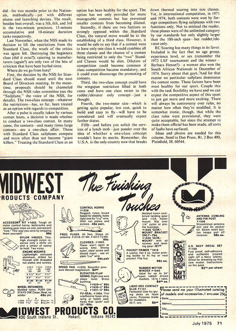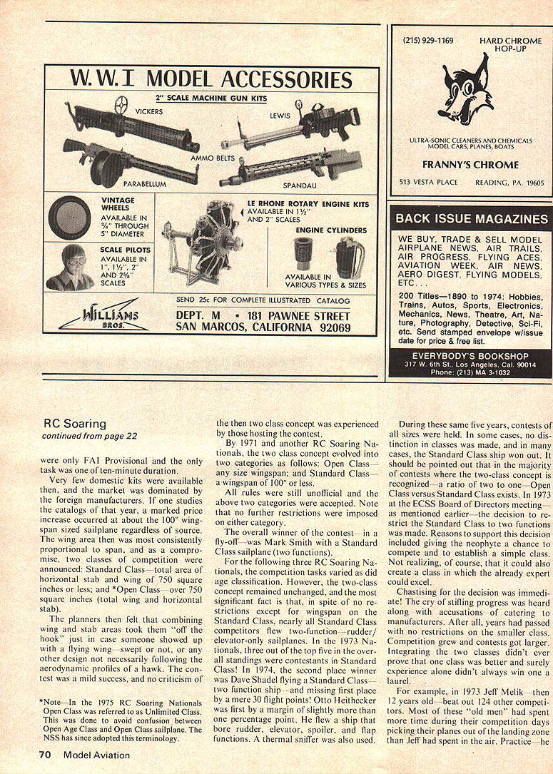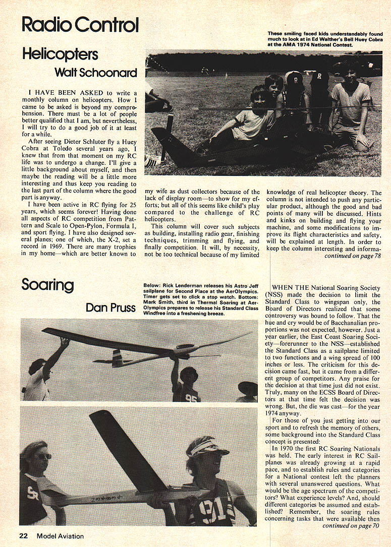 Radio Control Hebcopters Wzilt Schoonard HAVE BEEN ASKED write monthly column helicopters came asked beyond compre hension must lot people better qualified am nevertheless will try good job least After seeing Dieter Schiuter fly Huey Cobra Toledo several years ago knew that moment RC life undergo change Ill give little background about myself maybe reading will little Interesting thus keep reading last part column good part anyway have active RC flying 25 years seems forever Having done aspects RC competition Pat tern Scale Open-Pylon Formula sport flying have also designed sev eral planes X-2 set record 1969 trophies homewhich better known Soaring wife dust collectors because lack display roomto show ef forts seems like childs play compared challenge RC helicopters column will cover such subjects building installing radio gear finishing techniques trimming flying finally competition will necessity too technical because limited Below Rick Lenderman releases Astro Jeff sailplane Second Place AerOlympics Timer gets sat click stop watch Bottom Mark Smith third Thermal Soaring Aer Dan Pruss Olympics prepares Standard Class freshening smiling faced kids understandably found much look Ed Waithers Bell Huy Cob4a AMA 1974 National Contest knowledge real helicopter theory column intended push partic ular product although good bad points will discussed Hints kinks building flying machine some modifications im prove its flight characteristics safety will explained length order keep column interesting informa continued page 78 WHEN THE National Soaring Society NSS made decision limit Standard Class wingspan Board Directors realized some controversy bound follow hue cry would Bacchanalian pro portions expected however Just year earlier East Coast Soaring Soci etyforerunner NSSestablished Standard Class sailplane limited two functions wing spread 100 inches less criticism de cision came fast came differ ent group competitors Any praise decision time just did exist Truly ECSS Board Direc tors time felt decision wrong die castfor year 1974 anyway just getting sport refresh memory others some background Standard Class concept presented 1970 first RC Soaring Nationals held early interest RC Sailplanes already growing rapid pace establish rules categories National contest left planners several unanswered questions What would age spectrum competi tors What experience levels should different categories assumed estab lished Remember soaring rules concerning tasks available continued page 70 22 Model Aviation LWwI MODEL ACCESSORIES 2 SCALE MACHINE GUN KITS AMMO BELTS SEND 25c FOR COMPLETE ILLUSTRATED CATALOG DEPT M PAWNEE STREET SAN MARCOS CALIFORNIA 92069 215 929-1169HARD CHROME HOP-UP ULTRA-SONIC CLEANERS AND CHEMICALS MODEL CARS PLANES BOATS FRANNYS CHROME 513 VESTA PLACEREADING PA 19605 U UY TRADE & SELL MODEL AIRPLANE NEWS AIR TRAILS AIR PROGRESS FLYING ACES AVIATION WEEK AIR NEWS AERO DIGEST FLYING MODELS ETC. 200 Titlesi 890 1974 Hobbies Trains Autos Sports Electronics Mechanics News Theatre Art Na ture Photography Detective Sci-Fi etc Send stamped envelope w/issue date price & free list RC Soaring continued page 22 FAI Provisional task often-minute duration Very few domestic kits available market dominated foreign manufacturers studies catalogs year marked price increase occurred about 100 wing span sized sailplane regardless source wing area consistently proportional span compro mise two classes competition announced Standard Classtotal area horizontal stab wing 750 square inches less *Open Class -over 750 square inches total wing horizontal stab planners felt combining wing stab areas took off hook just case someone showed up flying wing-swept or other design necessarily following aerodynamic profiles hawk con test mild success no criticism *Note..In 1975 RC Soaring Nationals Open Class referred Unlimited Class done avoid confusion between Open Age Class Open Class sailplane NSS has since adopted terminology two class concept experienced hosting contest 1971 another RC Soaring Na tionals two class concept evolved two categories follows Open Class size wingspan Standard Class wingspan 100 less rules still unofficial above two categories accepted Note no further restrictions imposed either category overall winner contest-in fly-offwas Mark Smith Standard Class sailplane two functions following three RC Soaring Na tionals competition tasks varied did age classification However two-class concept remained unchanged significant fact spite no re strictions except wingspan Standard Class nearly Standard Class competitors flew two-function er/ elevator-only sailplanes 1973 Na tionals three out top five over standings contestants Standard Class 1974 second place winner Dave Shadel flying Standard Class-two function ship --and missing first place mere 30 flight points Otto Heithecker first margin slightly percentage point flew ship bore rudder elevator spoiler flap functions thermal sniffer also used During same five years contests sizes held some cases no dis tinction classes made cases Standard Class ship won out should pointed out majority contests two-class concept recognizeda ratio two oneOpen Class versus Standard Class exists 1973 ECSS Board Directors meeting mentioned earlierthe decision re strict Standard Class two functions made Reasons support decision included giving neophyte chance compete establish simple class realizing course could also create class already expert could excel Chastising decision immedi ate cry stifling progress heard along accusations catering manufacturers After years passed no restrictions smaller class Competition grew contests got larger Integrating two classes didnt ever prove class better surely experience alone didnt always win laurel example 1973 Jeff Melik---then 12 years old-beat out 124 other competi tors Most old men spent time during competition days picking planes out landing zone Jeff spent air Practice-- -he 70 Model Aviation VICKERS w VINTAGE WHEELS AVAILABLE IN