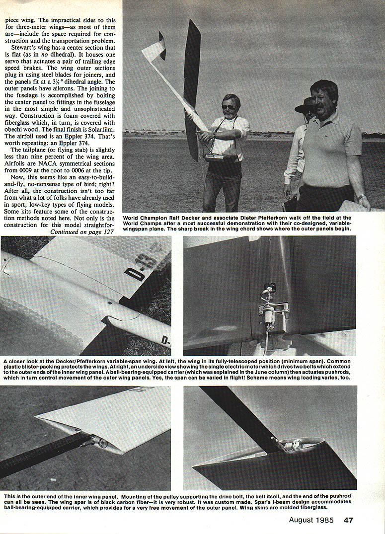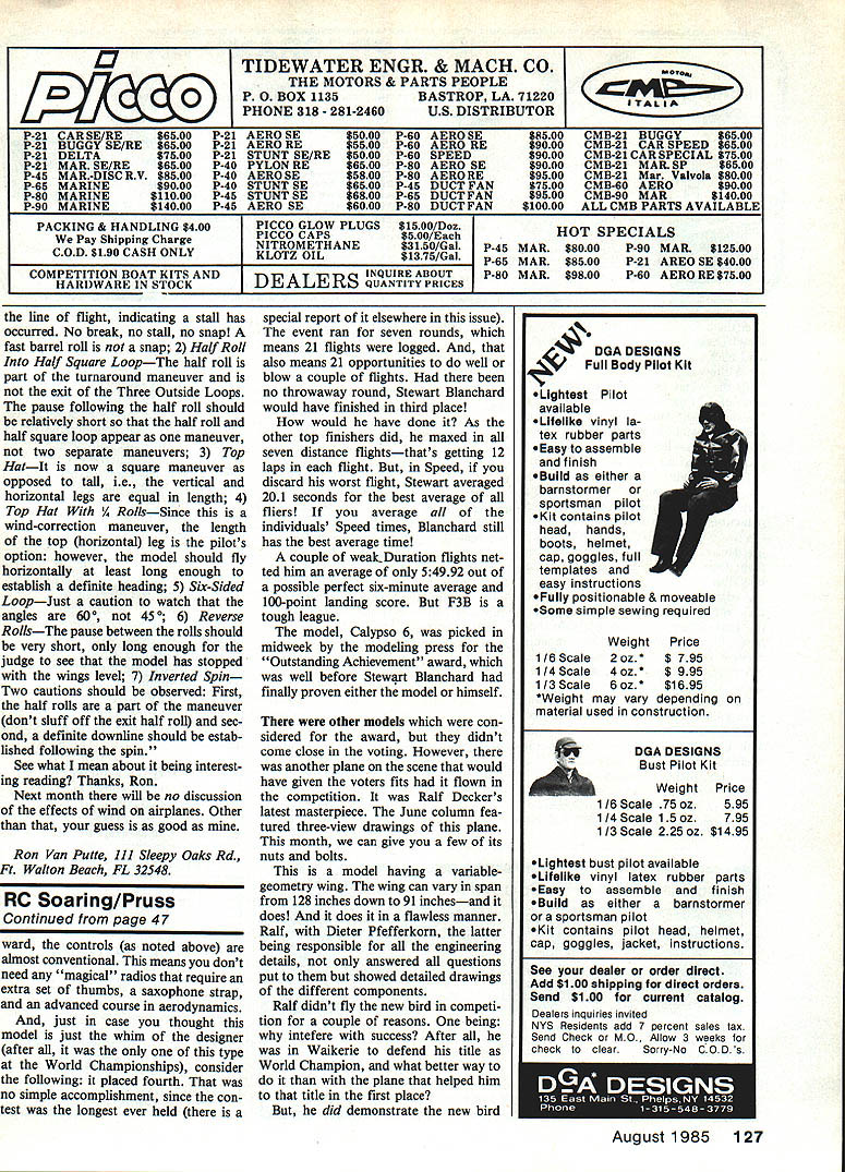 Radio Control Soaring Dan Pruss SURPRISE Yes very pleas ant surprise Fifth F3B World Championships surprise form excellently-flying model designed flown Stewart Blanchard Great Britain high-tech side model construc tion has shy away F3B over years please read know column has featured mold-making has required hundreds some cases thousands man-hours pro duce first model course students school defend method model building primary reas once molds finished model produced identical Thats end modeling spec trum Closer opposite end technique building model pro duced Stewart Blanchard old cliche built kitchen table comes close built flush door made up workbench bedroom fuselage Nothing fancy boom fiberglass tube having con stant cross section available stock item some shops according Mr Blanchard pod fashioned conform boom houses two servos receiver battery servo drives flying stabilizer con ventional manner using bellcrank vertical fin other servo operates rudder set push-pull cables tail end fiberglass boom large enough cross section fair cover small rudder horns cables totally concealed diameter boom small enough provide very neat installation yet provide protec tion area can vulnerable hard landingsespecially rough terrain wing teammates removing one-piece 10-foot wings crates least long Mr Stewart taking models boxes half size Although wing couple inches longer assembled threepiece feature does make better rela tions cab drivers airline folks team managers unique features wing construction its three sections three-piece wing new idea seeing F3B model some thing new Wing strength has become par amount consideration F3B fliers have found best way attain strength required through one46 Model Aviation stewan uiancnara creat urtsainj wirn ma aiypso u ne iargsrnwingspan moo. World Champs Both model filer full surprisesread column piece wing impractical sides three-meter wingsas areinclude space required con struction transportation problem Stewarts wing has center section flat no dihedral houses servo actuates pair trailing edge speed brakes wing outer sections plug using steel blades joiners panels fit 3%O dihedral angle outer panels have ailerons joining fuselage accomplished bolting center panel fittings fuselage simple unsophisticated way Construction foam covered fiberglass turn covered obechi wood final flaish Solarfilm airfoil used Eppler 374 Thats worth repeating Eppler 374 tailplane flying stab slightly less nine percent wing area Airfoils NACA symmetrical sections 0009 root 0006 tip Now seems like easy-to-buildand-fly no-nonsense type bird right After construction isnt too far what lot folks have already used sport low-key types flying models Some kits feature some construc tion methods noted World Champion Raif Decker associate Dieter Pfefferkorn waik off fieid construction model straightfor- World Champs after successful demonstration co-designed variable ntinued span plane sharp break wing chord shows outer panels begin outer end Inner wing panel Mounting pulley supporting drive belt belt Itself end pushrod can seen wing spar black carbon fiberIt very robust custom made Spars i-beam design accommodates ball-bearing-equipped carrier provides very free movement outer panel Wing skins molded fiberglass August 1985 47 closer look Decker/Pfefferkorn variable-span wing left wing its fully-telescoped position minimum span Common plastic blister-packing protectsthe wings right undersideview showing single electric motorwhlch drlvestwo beltswhich extend outer ends Innerwing panel ball-bearing-equipped carrier explained June column actuates pushrods turn control movement outer wing panels Yes span can varied flighti Scheme means wing loading varies too TIDEWATER ENGR & MACH CO P-21CARSE/RE$6500P-21AERO SE$5000P60AEROSE$8500CMB-21 BUGGY6500 P-21BUGGY SE/RE$6500P21AERO RE$5500P60AERO RE$9000CMB-21 CAR SPEED6500 P-21DELTA$7500P21STUNT SE/RE$5000P60SPEED$9000CMB-21 CAR SPECIAL17500 P-21MAR SE/RE$6500P-40PYLON RE$6500P80AERO SE$9000CMB21 MAR SP$6500 P45MAR-DISC RV$8500P40AERO SE$5800P80AERO RE$9500CMB-21 Mar Valvola$8000 P65MARINE$9000P-40STUNT SE$6500P-45DUCT FAN17500CMB-60 AERO$9000 P80MARINE$11000P-45STUNT SE$6800P65DUCT FAN$9500CMB-90 MAR$14000 P90MARINE$14000P45AERO SE$6000P80DUCT FAN$10000ALL CMB PARTSAVAILABLE PACKING & HANDLING $400PICCO GLOW PLUGS $1500/Doz ChargePICCO CAPS$500/EachHOT SPECIALS Pay ShippingNITROMETHANE$3150/GalP45 MAR$8000P90 MAR $12500 COD $190 CASH ONLYKLOTZ OIL$1375/GalP-65 MAR$8500P-21 AREO SE $4000 COMPETITION BOAT KITS ANDThT ATiT~CI INQUIREABOUTP-SO MAR $9800P-60 AERORE$7500 HARI WARE IN STOCKJI AIflJfl QUANTITY PRICES line flight indicating stall has occurred No break no stall no snap fast barrel roll snap 2 Half Roll Half Square LoopThe half roll part turnaround maneuver exit Three Outside Loops pause following half roll should relatively short half roll half square loop appear maneuver two separate maneuvers 3 Top HatIt now square maneuver opposed tall ie vertical horizontal legs equal length 4 Top Hat 1/4 RollsSince wind-correction maneuver length top horizontal leg pilots option however model should fly horizontally least long enough establish definite heading 5 Six-Sided LoopJust caution watch angles 600 450 6 Reverse RollsThe pause between rolls should very short long enough judge see model has stopped wings level 7 Inverted Spin Two cautions should observed First half rolls part maneuver dont sluff off exit half roll sec ond definite downline should estab lished following spin See what mean about being interest ing reading Thanks Ron Next month will no discussion effects wind airplanes Other guess good Ron Van Putte 111 Sleepy Oaks Rd Ft Walton Beach FL 32548 RC Soaring/Pruss Continued page 47 ward controls noted above almost conventional means dont need magical radios require extra set thumbs saxophone strap advanced course aerodynamics just case thought model just whim designer after type World Championships consider following placed fourth no simple accomp