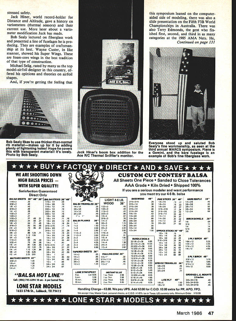 rp ~itiii Soaring Dan Pruss GADGETS ideas should make life simpler workshop flying field months subject before get youve got hear what Madison Area Radio Con trol Society MARCS did first week November 1985 week end third annual RC symposium event just gets better year As past topics ranged high-tech presentations low-key discussions something everyone Introduction Aerodynamics HINERS AUDIO AMPLIFIER gv Sw presented Frank Baker Meteor ology Soaring Professor Roland Stull both gentlemen University Wisconsin Ken Bates entertained strong emphasis entertained 90-some folks first day lecture fly ing wings Any club Ann Arbor MI 6 Subminiature Plug5/ 2LM386 ReceiverlOKfl220 mfd BA Speaker 9v Jack Hiner built audio amp could use loudspeaker Thermal Sniffler circuit Radio Shacks Engineers Mini-Notebook Op Amps parts list end Dans column month area would well getting Ken club meetings comes complete slides sketches witty anecdotes Five cross-country experts Pat Flynn Noal Rossow Ken Bates Stan Watson Mark Stidhem discussed aspects cross-country flying cluded preparation tasks aircraft chase vehicles discussion cen tered around aircraft design construc tion techniques phases talk V 2 IN 3 IN 4 GND LM386 7 6 5 ouT Heres what pins LM386 inte grated circuit used 46 Model Aviation Mock-up built Scott Christensen demonstrate Gregg Seydels fine Idea improv ing fling-stab mounts Pivot left uses small squares circuit board material glued fin structure pivot-wire hole drilled number-drill no-slop fit Randy Culbertson shows ott 0 hIs low-aspect-ratIo designs lum Searcher 100 spans 100 has 75-to-one aspect ratio FX60-100 airfoil Wing area 181325 Sq Two-Meter version has 56-to Leon Kincaid has nifty way close gaps between wing roots fuse lage Scheme explained column 0 ssed safety Jack Hiner world record-holder Distance Altitude gave history variometers thermal sensors current use later about vario meter modification Jack has made Bob Sealy lectured fiberglass work presented line fuselages pro ducing examples craftsman ship its best Wayne Custer like manner showed Super Wings foam-core wings best tradition type construction Michael Selig rated top model-airfoil designer country fered opinions theories airfoil shapes youre getting feeling symposium leaned computeraided side modeling also slide presentation Fifth F3B World Championships Australia also Terry Edmonds gent fin ished first second third categories 1985 AMA Nats Continued page 131 Everyone stood up saluted Bob Sealys fine workmanshIp seen third annual MARCS symposium Piane Gemini bare fuselage example Bobs fine fiberglass work ASmAI WE ARE SHOOTING DOWN HIGH BALSA PRICES WITH SUPER QUALITYI Satisfaction Guaranteed Direct Only BALSA SN EETS 36 48 1/16233 3/32240 1/8 243 3/16248 1/4 256 1/33337 1/20337 1/163374831 3/323445837 1/8 3547146 3/163628255 1/4 3730661 5/16385 3/8 38812471 1/2 e3110155 3/4 3165 1/164587648 3/324709456 1/8 48010686 3/1648312275 1/4 411013484 3/8 225 1/2 4225261 MATCHED SHEETS 43 3/324100 1/84108 3/164120 1/44131 30, BALSA SliCKS 1/16 1/4 1/16 3/8 1/16 1/2 3/32 1/4 3/32 3/8 3/32 1/2 1/8 1/8 1/8 1/4 1/8 3/8 1/8 1/2 3/183/16 3/18 3/8 3/18 1/2 1/4 1/4 1/4 3/8 1/4 1/2 1/4 3/4 1/41 5/18 5/16 3/8 3/8 3/8 1/2 3/8 3/4 2/81 1/2 1/2 1/2 3/4 1/21 5/8 5/8 3/4 3/4 3648 09 10 14 10 12 16 08 1116 1218 1824 1116 17 2230 1624 1926 2130 3444 40 2126 2737 3246 4255 52 3653 4662 56 46 67 BALSA HOT LINE Ciii 806 745-6394 10 am -6pm Central lime LONE STAR MODELS 1623 57th St Lubbock TX 79412 WOOD 1/323 1/203 1/163 3/323 1/83 3/163 1/43 3/83 1/23 3/43 13 1/164 3/324 1/84 3/164 1/44 3/84 1/24 1W BALSA TRIANGLES 36 4425 383830 2235 343445 55 BALSA PLANKS 36 85 250 3200 4280 11/23276 11/24360 22225 23325 24435 33495 34658 TAPERED SHEETS36 1/42 65TRAILING EDGE36 1/43 851/4132 3/82 685/1611/439 3/83 983/811/246 1/231201/2270 LONE STAR EPOXY 9,L,1-835 5 ri598 15,,556 30 ne598 INS TAN CL UE 1 k 208 1 , Thi 208 2o Thick 500 2, Thie 500 CUSTOM CUT CONTEST BALSA Sheets Piece ed Close Tolerances AAA Grade Dried ped 100% serious modeler want performance BASSWOOD 3/16 3/16 3/161/4 3/163/8 3/16 1/2 3/163/4 1/4 1/4 1/43/8 1/4 3/4 3/8 3/8 3/81/2 3/8 3/4 1/2 1/2 1/23/4 must try 4-6 lb balsa 48 26 20 38 46 80 42 49 80 00 70 80 80 108 BUNDLE DEALS 201/6336685 201/164361020 20-3/32 336840 153/32436955 15-1/8336715 10-1/5436675 15-3/16336000 10-3/16436810 10-1/4336630 151/4436880 103/8336800 0-3/8436625 0-1/2336540 5-1/2436855 103/32448845 0-1/8448485 5-3/16448585 5-1/4449625 PINESTICKS 36 48 / HARD MAPLE 1/81/813171/43/8 1/81/416233/83/8 1/03/820273/81/2 3163/1617243/83/4 3/163/823321/23/4 3/161/23040 1/41/42637 14 3/83042I 1/41/23447 3/0 3/83762 SPRUCE SliCKS 36 48 1/8 1/815 1/8 1/41624 1/8 3/82029 3/163/162534 1/4 1/43145 1/4 3/83650 3/8 3/84563 3/6 1/25570 t/2 1/28080 1/2 3/448 88 SPRUCE TRIANGLES 3/83/6 1/2 1/2 3/43/4 BIRCH DO WELS 1/8 3/16 1/4 5/16 3/8 IS 40 46 50 08 68 36 09 11 14 20 32 3PLVBIRCH48 1/6412025 1/3212425 1/1612435 1/012450 SPLVBIRCH48 3/3212570 1/812585 363/1612585 401/412600 61 77 GROOVED LG MOUNTS LITEPLY 48 1/86154 1/812300 13 Inches 3/83/4/1/8/40 3/83/4/5/32/00 1/23/4/3/16/45 Handling Charge$30O pay UPS Add $200 COD $300 extra PP APO FPO accept Visa MasterCard personal checks COD 4-1/8% las Teas US currency 017 Minimam Order 01000 Sem LiGHT 4-6 LB 36 49 49 49 56 67 76 85 115 120 220 308 70 91 108 117 138 207 282 March 1986 47 Bob eaiy likes use thickernian-normai rib materialmakes up adding plenty lightening holes Hope covers transparent materla lilts lovely Photo Bob Sealy Jack Hiners boom box auuuouon Ace R/C Thermal Snifflers monitor Matched Performance System TOP PERFORMANCE K&B ENGINES AirplaneMarine K&B FUELSK&B GLOW PLUGS B Blends4 Cheices Matched Finish System BEST APPEARANCE K&B FIBERGLASS CLOTH K&B Micro-Balloons FILLER K&B SUPER POXY RESIN K&B SUPER FOXY THINNER K&B SUPER POXY PRIMER K&B SUPER POXY PAINT K&B MIXING CUPS sion centered third-order intermodula tion interference 31M considered test data presented George Steiner receivers Bill 