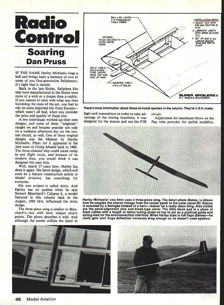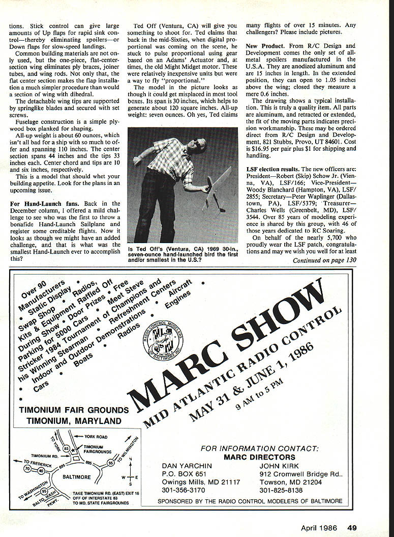 Radio Control Soaring Dan Pruss IF THE NAME Harley Michaelis rings bell brings back memory two some first-generation Sailpianers its right should Back late Sixties Sailplane kits manufactured States wish dream reality wanted stick what becoming state art rely some imported kits Europe wasnt bad consider price quality kits few individuals worked up own designs some originals caught became popular weekend afternoon con test circuit well original designs Miskeet Harley Michaelis Plans appeared July issue Flying Models back 1969 three-channel ship could stand today flight circle because its modern lines would think designed past July Well nearly 17 years later Harley has done again latest design will soon feature construction article Model Aviation has something everyone new project called Atrix Hprley has no qualms says Stewart Blanchards Calypso 6 model featured column back August 1985 MA influenced Atrix design three-piece wing similar Blan chardsbut unique attach points photo describes well although model utilizes latest high-tech transmitters order take ad vantage mixing functions designed masses F3B -INSTALLATION HINTS I ADJUST HEX NLJTh FOR PAIN FRICTION 8 PLAY 2 LLSRICATE JOINTS WITH SPRAY SILICONE ETC 3 SET LIP AND PLAN UNKAGE SPOILERS ARE N PLACE 3-5FROU EP OF________________ CARE TLWVG BALSA CAP SAND TO MATCH AIRFc GOLD-N-ROD TYPE LOCATENEAR TOP SlJR UUPUR POILERU o R/C DESIGN & DEVELOPMENT Theres information about all-metal spoilers column Theyre USA-made circuit Adjustment maximum throw flap trim provides airfoil modifica Harley Michaells new Atrix uses three-piece wing detail photo Below L shows cou p lea aileron linksge center panel outer panel R Aileron actuated Swingee instead hornmakes really clean wing Also visible pane -alignment p ins blade-type joiner little black pad piece foam rubber length teflon tubing glued p act pushrod guide spring-load end-connection interface Harley dials full flaps Belowhe really gets em Huge deflection increases drag enough doesnt need spoilers 48 Model Aviation tions Stick control can give large amounts Up flaps rapid sink con trolthereby eliminating spoilersor Down flaps slow-speed landings Common building materials ly used one-piece flat-centersection wing eliminates ply braces joiner tubes wing rods flat center section makes flap installa tion much simpler procedure would section wing dihedral detachable wing tips supported springlike blades secured set screws Fuselage construction simple ply wood box planked shaping All-up weight about 60 ounces isnt bad ship much fer spanning 110 inches center section spans 44 inches tips 33 inches Center chord tips 10 six inches respectively model should whet building appetite Look plans upcoming issue Hand-Launch fans Back December column offered mild chal lenge see first throw bonafide Hand-Launch Sailplane register some creditable flights Now looks though might have added challenge what smallest Hand-Launch ever accomplish Ted Off Ventura CA will give something shoot Ted claims back mid-Sixties digital pro portional coming scene stuck pulse proportional using gear based Adams Actuator times old Might Midget motor relatively inexpensive units way fly proportional model picture looks though could get misplaced tool boxes Its span 30 inches helps generate about 120 square inches All-up weight seven ounces Oh yes Ted claims flights over 15 minutes Any challengers Please include pictures New Product R/C Design Development comes set allmetal spoilers manufactured USA anodized aluminum 15 inches length extended position can open 105 inches above wing closed measure mere 06 inches drawing shows typical installa tion truly quality item parts aluminum retracted extended fit moving parts indicates preci sion workmanship may ordered direct R/C Design Develop ment 821 Stubbs Provo UT 84601 Cost $1695 per pair plus $1 shipping handling LSF election results new officers PresidentRobert Skip Schow Jr Vien na VA LSF/l 66 Vice-President Woody Blanchard Hampton VA LSF/ 2855 SecretaryPeter Waplinger Dallas town PA LSF/5379 Treasurer Charles Wells Greenbelt MD LSF/ 3544 Over 85 years modeling experi ence shared group 46 years dedicated RC Soaring behalf nearly 5700 proudly wear LSF patch congratula tions may wish well least Continued page 130 e*4e 0ec t ~0 00&0 49 %e$~ o0 0 MONIUM FAIR GROUNDS TIMONIUM MARYLAND #o*s cP N TIMONIUM RD jcoN IMOREw -j E s TAKE TIMONIUPA RD EAST EXIT 16 OFF OF INTERSTATE 83 EO D STATE FAIRGROUNDS DAN YARCHIN PO BOX 651 Owings Mills MD 21117 301-356-3170 FOR INFORMATION CONTACT MARC DIRECTORS JOHN KIRK 912 Cromwell Bridge Rd. Towson MD 21204 301-825-8138 SPONSORED BY THE RADIO CONTROL MODELERS OF BALTIMORE April 1986 49 Ted Ofts Ventura CA 1969 30-in seven-ounce hand-launched bird first andlor smallest US SAILPLANE LAUNCH EQUIPMENT FOR EVERY S PORT WINCH source QUIET FLIGHT supplies hi-starts accessories electric motors & reducers batteries chutes braided nylon line tow line drums more. VISA MASTERCARD DAVEY 1Pm lE CoRPoRATmN ONE WOOD LANEMALVERNPA19355 215644-6772 SEND SASE FOR INFO Engines/Wilson Continued page 127 tion maintain constant down pressure piston Plastigage mashed out too wide clearance too close thicker shim combination shims shouldbe used Plastigage mashed out wide enough clearance too great thinner shim no shim should used clear ance correct clean off Plastigage piston head reassemble head engine gasket used backplate put place mount backplate engine Tighten screws previously described Rotate crankshaft sure crankpin and/or connecting rod rubbing backplate binding detected tighten propeller crankshaft hold ward doesnt cure problem remove frontplate Using wood block protect crankshaft tap back crankshaft center hammer sure crankshaft rear bearing fully seated forwardmost position Reassemble engine try again crankshaft bearings fully seated should no contact backplate fully-assembled engine turns feels free except case new ABC engine may bind top stroke screw fresh glow plug re