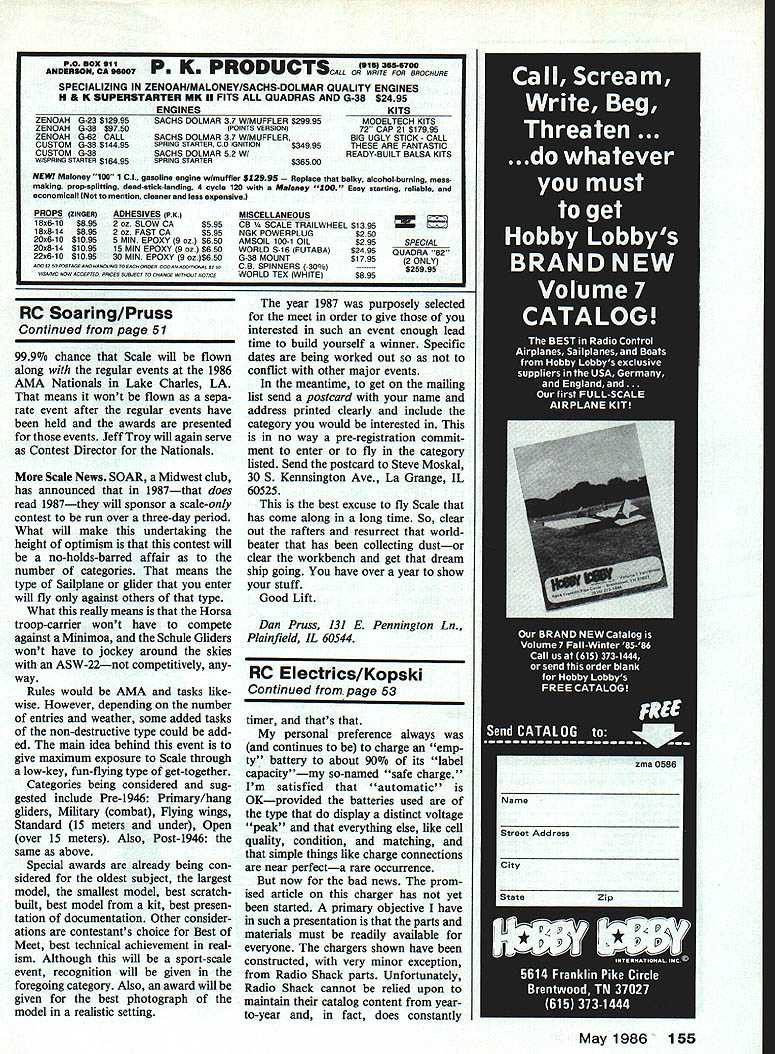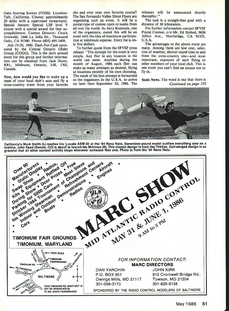 Radio Control Soaring Dan Pruss YOULL want pencil calendar read months column especially cross-country bug has drawing interests judging mail just months time type event has bite several clubs As scale photos dont let throw curve because theres some big news front also travel events incon venience club has remedied situation about later contests chronological order May 24-26 1986 Sugarloaf Classic sponsored Capital Area Soaring Association CASA course covers 315 miles rolling hills open fields just south Frederick MD Entry fee $40 further information contact Charles Wells CD 1-B Westway Greenbelt MD 20770 June 7-8 1986 Santa Maria Soaring Societys Sixth Annual Cross-Country Race Course Triangular25 miles long Further information Larry Turner 323 Nougera Pt Arroyo Grande CA 93420 Telephone 805 489-8000 June 19-21 1986 SOARs Great Race X 76km classic has Sailplanes perform tasks dream 10 years ago site flat open farm land country roads located about 40 miles southwest Chicago An added event year will Scale using AMAs Sport Scale rules Teams may enter Scale ship regular assigned frequency further information contact ad dress end column July 12-13 1986 Fourth Annual Western Great Race Sponsor Thousand 50 Model Aviation Michigans Ed Whyte ROGd TG3 85 AMA Nats Model scratch-built Waiter Kilnger West Germany shows off model 1924 Darmstadt 7 presentday standards its beautiful designbut Walters workmanship would stand next finest world rudder hinge line R exemplifies fine workmanship evident model ail-builtup construction plywood covering fuselage upcoming SOAR 1987 AIiScaie contest would have its own competition class Dan has information contest column all-molded LS4 1 belongs Roland Summer West Germany Cockpit details hide radio gear retractabip landing gear mechanism spans four meters Woody Blanchard R newly-elected VP LSF 1983 photo catches him launching S peed Astir 1SF Tournament Plane has full controls plus retractable gear towhook Oaks Soaring Society TOSS Location Taft California Course approximately 20 miles supervised turnaround Special feature Special LSF level V course special award ac complishment Contest Director Chuck Griswold 1646 La Jolla Dr Thousand Oaks CA 91360 Phone 805 495-1409 July 19-20 1986 Dash-For-Cash spon sored Central Ontario Glider Group COGG sixth annual event group further informa tion can obtained Jack Nunn RRl Midhurst Ontario LOL iXO Canada Now would like make up team local clubs aces fly cross-country event favorite site over own favorite course San Fernando Valley Silent Flyers organizing such event will postal-type contest open teams over world As Jerry Krainock organizers stated will event idea maximum participa tion minimum expense Entry fee ly five dollars further quote SFVSF press release concept event very simple Any flier location world can enter Anytime during month August 1986 flier can make attempts desired flying locations entirely own choosing result best attempt forwarded organizers USA arrive no later September 30 1986 winners will announced shortly thereafter task straight-line goal distance 30 kilometers further information contact SFVSF Postal Contest Mr Ed Slobod 9626 Jellico Ave Northridge CA 91325 USA advantages above event Among low cost selec tion weather shorter travel time cross-country siteand important exposure such flying other members local club event cant find excuse fly Scale News The word out Continued page 155 Californias Mark Smith 1 readies /3-scale ASW20 84 Reno Nats Seventeen-pound model outflew everything else towline John Read Denver CO about launch Minlmoa R classic design Thirties Gull-winged design graceful other contest activity stops whenever someone f lies e Photo 84 Reno Nats ob Oee &~ 04e oL4% \@ \ o TIMONIUM FAIR GROUNDS #0 TIMONIUM MARYLAND A~YORKROAD/4 0 N 183TIMONIUM FAIRG N TIMONIUM RD EDEFtICIJN BALTIMORE 2w - E S TAKE TIMONIUM RD EASD EXIT 16 OFF OF INTERSTATE 83 MD STATE FAIRGROUNDS DAN YARCHIN PO BOX 651 Owings Mills MD 21117 301-356-3170 FOR INFORMATION CONTACT MARC DIRECTORS JOHN KIRK 912 Cromwell Bridge Rd. Towson MD 21204 301-825-8138 SPONSORED BY THE RADIO CONTROL MODELERS OF BALTIMORE May 1986 51 PO Box 011 ANDERSON CA 0600 PRODUCTSjOlSi 365-6700 CALL OR WRITE FOR BROCRURE SPECIALIZING IN ZENOAH/MALONEYISACHS-DOLMAR QUALITY ENGINES H & K SUPERSTARTER EK II FITS ALL QUADRAS AND 0-38 $2495 ENGINESKITS MODELTECH KITS 72 CAP 21 $17995 BIG UGLY STICK CALL THESE ARE FANTASTIC READY-BUILT BALSA KITS ZENOANG23 $12995 ZENOAHG-38 $9750 ZENOAHG-62 CALL CUSTOMG-38 $14495 CUSTOMG-38 WISPRING STARTER $16495 SACHS DOLMAR 37 WIMUFFLER $29995 POINTS VERSION SACHS DOLMAR 37 WIMUFFLER SPRING STARTER CD IGNITION$34995 SACHS DOLMAR 52 WI SPRING STARTER$36500 NEW Maloney 100 1 Cl. gasoline engine w/muffler $12998 ace balky alcohol-burning messmaking prop-splitting dead-stIck-landing 4 cycle 120 Maloney 100 Easy starting reliable economicall INot mention cleaner less expensivel PROPSZINGERADHESIVES PK 18x6-1O$8952 oz SLOW CA$595 18x8-14$8952 oz FAST CA$595 20x6-10$10955 MIN EPOXY 9 oz$650 20x8-14$109515 MIN EPOXY 9 oz$650 22x6-1O$109530 MIN EPOXY 9oz$650 ADD $250 POD TAGEAND 55ANDLNO TO EACA ORDER CODANaoor AC $250 EISAPE NOW ACCEPTED PACES SIJSJECT CHANGE EDTISOCT NOJOCE RC Soaring/Pruss Continued page 51 999% chance Scale will flown along regular events 1986 AMA Nationals Lake Charles LA means wont flown sepa rate event after regular events have held awards presented events Jeff Troy will again serve Contest Director Nationals Scale News SOAR Midwest club has announced 1987that does read 1987they will sponsor scale-only contest run over three-day period What will make undertaking height optimism contest will no-holds-barred affair number categories means type Sailplane gilder enter will fly against others type What really means Horsa troop-carrier wont have compete against Minimoa Schule Gliders wont have jockey around skies ASW-22not competitively way Rules would AMA tasks like wise However depending number entries we
