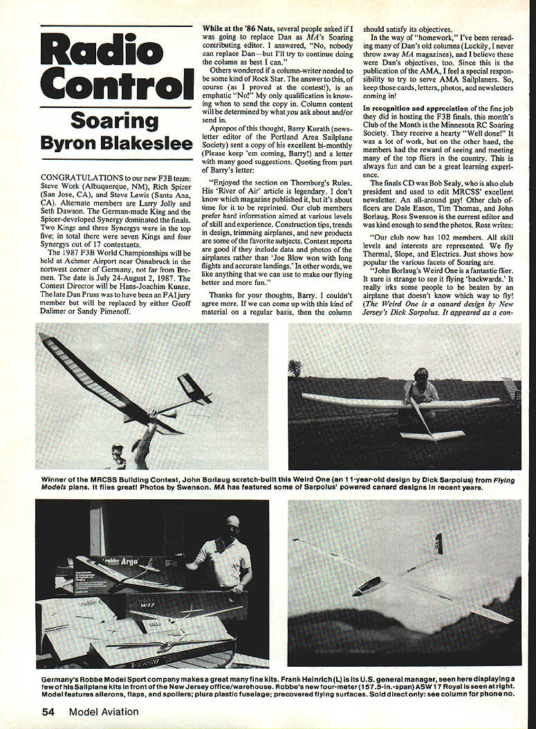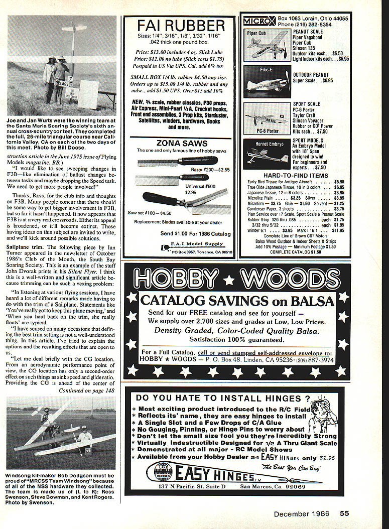 Radio Control Soaring Byron Blakeslee CONGRATULATIONS new F3B team Steve Work Albuquerque NM Rich Spicer San Jose CA Steve Lewis Santa Ana CA Alternate members Larry Jolly Seth Dawson German-made King Spicer-developed Synergy dominated finals Two Kings three Synergys top five total seven Kings four Synergys out 17 contestants 1987 F3B World Championships will held Achmer Airport near Osnabruck nortwest corner Germany far Bre men date July 24-August 2 1987 Contest Director will Hans-Joachim Kunze late Dan Pruss have FAI jury member will replaced either Geoff Dalimer Sandy Pimenoff 86 Nats several people asked going replace Dan MAs Soaring contributing editor answered No nobody can replace Danbut Ill try continue doing column best can Others wondered column-writer needed some kind Rock Star answer course proved contest emphatic No qualification know ing send copy Column content will determined whatyou ask about and/or send Apropos thought Barry Kurath news letter editor Portland Area Sailplane Society sent copy excellent hi-monthly Please keep em coming Barry letter good suggestions Quoting part Barrys letter Enjoyed section Thornburgs Rules River Air article legendary dont know magazine published its about time reprinted club members prefer hard information almed various levels skill experience Construction tips trends design trimming airplanes new products some favorite subjects Contest reports good include data photos airplanes rather Joe Blow won long flights accurate landings other words like anything can use make flying better fun Thanks thoughts Barry couldnt agree can come up kind material regular basis column should satisfy its objectives way homework Ive reread ing Dans old columns Luckily never throw away MA magazines believe Dans objectives too Since publication AMA feel special respon sibility try serve AMA Sailplaners So keep cards letters photos newsletters coming recognition appreciation fine job did hosting F3B finals months Club Month Minnesota RC Soaring Society receive hearty Well done lot work other hand members reward seeing meeting top fliers country always fun can great learning experi ence finals CD Bob Sealy also club president used edit MRCSS excellent newsletter An all-around guy Other club ficers Dale Eason Tim Thomas John Borlaug Ross Swenson current editor kind enough send photos Ross writes club now has 102 members skill levels interests represented fly Thermal Slope Electrics Just shows popular various facets Soaring John Borlaugs Weird fantastic flier sure strange see flying backwards really irks some people beaten airplane doesnt know way fly Weird canard design New Jerseys Dick Sarpolus appeared conWinner MRCSS Building Contest John Borlaug scratchbuiit Weird 11 -year-oid design Dick Sarpoius Flying Models pians fiies great Photos Swenson MA has featured some Sarpolus powered canard designs recent years Germanys Robbe Model Sport company makes great fine kits Frank Heinrich L its US general manager seen displaying few Sailpiane kits front New Jersey office/warehouse Robbes newfourmeter1 575-in-span ASW 17 Royal seen right Modei features alierons fiaps spoilers plura piastic fuselage precovered fiying surfaces Soid direct see coiumn phone no 54 Model Aviation Joe Jan Wurtswerethe winning team Santa Maria Soaring Societys sixth nual cross-sountrycontest Theycompleted full 26-mile triangular course nearCali fornia Valley CA two days meet Photo Bill Doose struction article June 1975 issue Flying Models magazine BR would like see sweeping changes F3Blike elimination ballast changes tween tasks maybe dropping Speed task need get people involved Thanks Ross club info thoughts F3B people concur should some way get bigger involvement F3B far hasnt happened now appears F3B very real crossroads Either its appeal broadened itll become extinct having ideas subject invited write well kick around possible solutions Sailplane trim following piece Ian Turner appeared newsletter October 1986s Club Month South Bay Soaring Society example stuff John Dvorak prints Silent Flyer think well-written significant article cause trimming can such vexing problem listening various flying sessions have heard lot different remarks made having trim Sailplane Statements like Youve really got keep plane moving haul back trim really floats typical have sensed occasions defin ing best trim setting well-understood thing article Ive tried explain options resulting effects open us Let deal briefly CG location aerodynamic performance point view CG location has second-order effect such things sink speed glide ratio Providing CG ahead center Continued page 148 Windeong kit-maker Bob Dodgson must proud MRCSS Team Windsong because of NSS hardware collected team made up L R Ross Swenson Steve Bowman Kent Rogers Photo Swenson FAI RUBBER Sizes 1/43/16 1/8 3/32 1/16 042 thick pound box Price $1300 includes 4 oz Slick Lube Price $1200 no lube Slick costs $1 75 Postpaid US Via UPS Cal add 6% tax SMALL BOX 1/4 lb rubber $450 size Orders up $1500 1/4 lb rubber nde add $150 UPS Over$l5add 10% MEW e rebber classIcs P30 prep Air Express MinI-Peagl Crecket hoeks Frent miii assembles 3 Prep kits Stanluster Satellites winders hardware leeks mere ZONA SAWS famous line hobby saws Razor#200 $255 Universal #500 Saw set #100 $450 Replacement Blades available dealer Send $100 1986 Cataiog F Mo del Supply December 1986 55 Box 1063 Lorain Ohio 44055 Phone 216 282-8354 Njer ltlPEANUT SCALE Piper Vagabond Piper Cub Stinson 125 Outdoor kits each. $650 Light Indoor kits each. 3605 PEANUT hid IIdle. $605 SPORT SCALE PC-S Porter Taylor Craft jr- Stinson Voyager Rubber CO2 Power PC-S ParlorKits each. $750 SPORT MODELS An Embryo Model 18 Span designed win beginners experts . $750 HARD-TO-FIND ITEMS Early Bird Tissue Antique Aircraft 5595 True Olde Japanese Tissue 10 3 colors . Japanese Tissue t2 6 colors 3395 Microlite Plain3325 Silver5395 Microfilm 3375 Glue 3160 Solvent Condenser Paper 3 sheets 375 Plan Service over 17 Scale S