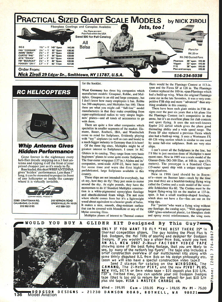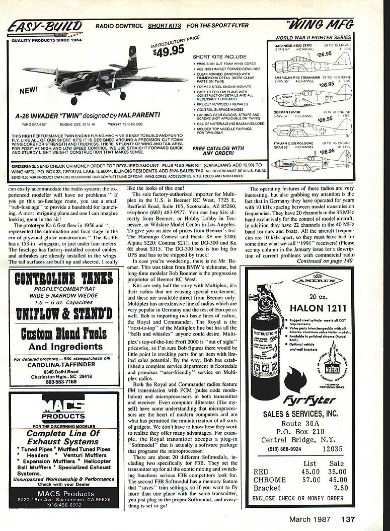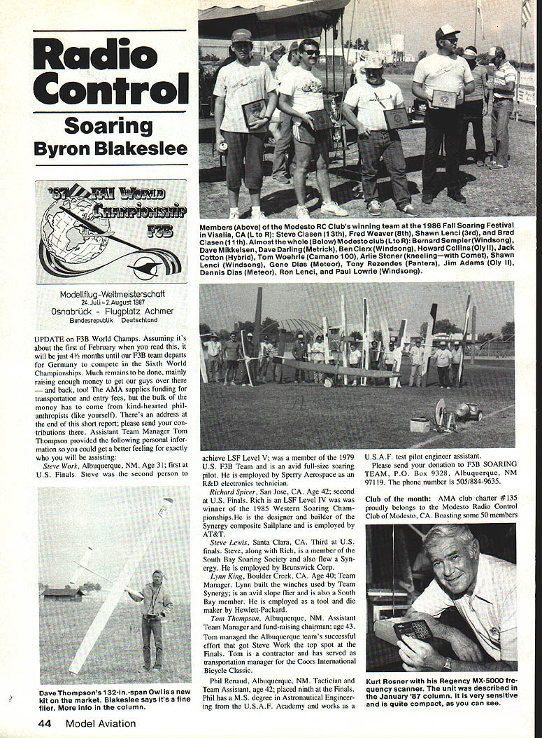Radio Control Soaring Byron Blakeslee Modellf Lug -Weitmeisterschoft 21.JuU2August 1987 Osnobrck Flugplotz Achmer Bundesrepubtik Deutschtond UPDATE F3B World Champs Assuming its about first February read will just 4 months until F3B team departs Germany compete Sixth World Championships Much remains done mainly raising enough money get guys over back too AMA supplies funding transportation entry fees bulk money has come kind-hearted phil anthropists like yourself Theres address end short report please send con tributions Assistant Team Manager Tom Thompson provided following personal infor mation could get better feeling exactly will assisting Steve Work Albuquerque NM Age 31 first US Finals Steve second person achieve LSF Level V member 1979 US F3B Team avid full-size soaring pilot employed Sperry Aerospace R&D electronics technician Richard Spicer San Jose CA Age 42 second US Finals Rich LSF Level IV was winner 1985 Western Soaring Chain pionshipsHe designer builder Synergy composite Sailplane employed AT&T Steve Lewis Santa Clara CA Third US finals Steve along Rich member South Bay Soaring Society also flew Syn ergy employed Brunswick Corp Lynn King Boulder Creek CA Age 40 Team Manager Lynn built winches used Team Synergy avid slope flier also South Bay member employed tool die maker Hewlett-Packard Tom Thompson Albuquerque NM Assistant Team Manager fund-raising chairman age 43 Tom managed Albuquerque teams successful effort got Steve Work top spot Finals Tom contractor has served transportation manager Coors International Bicycle Classic Phil Renaud Albuquerque NM Tactician Team Assistant age 42 placed ninth Finals Phil has MS degree Astronautical Engineer ing USAF Academy works Club month AMA club charter #135 proudly belongs Modesto Radio Control Club Modesto CA Boasting some 50 members 44 Model Aviation Members Above Modesto RC Clubs winning team 1986 FaIl Soaring Festival Visalia CA L R Steve Clasen 13th Fred Weaver 8th Shawn Lend 3rd Brad Clasen 11th Almostthewhole Below Modesto club Ito R Bernard SempierWindsOng Dave Mikkelsen Dave Darling Metrick Ben ClerxWindsong Howard CollinsOly II Jack Cotton Hybrid Tom Woehrle Camano 100 Arlie Stoner kneelingwith Comet Shawn Lend Windsong Gene Dias Meteor Tony Rezendes Pantera Jim Adams Oly II Dennis Dias Meteor Ron Lend Paul Lowrie Windsong USAF test pilot engineer assistant Please send donation F3B SOARING TEAM PO Box 9328 Albuquerque NM 97119 phone number 505/884-9635 Dave Thompsons 1 32-in-span Owl new kit market Blakeslee says its fine flier info column Kurt Rosner Regency MX-5000 fre quency scanner unit described January87 column very sensitive quite compact can see far Pennsylvania Japan club begins its second quarter-century service community modelers proud past Founded originally offshoot old Mod esto Flying Circus club originally pri marily power modelers club As radiocontrolled Soaring became popular sport majority members became Glider fliers club members fly fun nearly Sun day Beyer High School flying site Mod esto club also has serious com petitive side addition community service programs such demonstrations shopping malls scouting groups club has spon sored co-sponsored such prestigious events several regional League Silent Flight tour naments Two-Meter World Cup several Distance events recent contest undertaking Western United States RC Soaring Championships held past two years near Sacramento $500 first prize premier two-day contest country draws contestants spectators over United States Members also active comprehensive club contest schedule well Northern Cali fornial Soaring League consortium clubs within area Added next year Tri-club Challenge new event three central California clubs Officers 1986 Ron Lenci president Benard Simpier VP & CD Tern Dias SecretaryTreasurer Dave Darling newsletter editor 1987 officers Benard Simpier president Shawn Lenci VP & CD Arlie Stoner SecretaryTreasurer Dave Darling newsletter editor description provided Dave Darling also puts Out terrific newsletter Thanks very much Dave Great Race good news Bill Christian SOAR Club reports will run Great Race again year Dates June 13 14 Bill will Contest Director said club intends malntain traditions race former CD Dan Pruss established un familiar its origins Great Race first held 1976 Bicentennial tribute course laid out covered 76 kilometers granddaddy other cross-country events now held around wold Im sure SASE Bill will get info address 1604 N Chestnut Ave Arlington Heights IL 60004 Continued page 135 ATT- CHEK7 ON-Board Battery Tester Saves Time. Saves Models B AiTCHEK RX-1 $1495 em USA Install RC Models Check receiver battery status press button Small Light 1/2 oz Precise Rugged ORDER TODAY dealer Protune Corp 19141 462-6452 PO Box 1808 Poughkeepsie NY 12601 March 198745 Steve Work used WestGerman designed byPeterMuller Kingtotakethetopplaceat recent US F3B team-selection Finals Photo Ray Marvin NEW ANNUAL RADIO CONTROL EXPOSITION TOLEDO SPORTS ARENA ONE MAIN STREET TOLEDO OHIO APRIL 10 11 & 12 1987 presented Weak Signals RIO Club Toledo Ohio Exposition intormation avallaoie D contacting Wayne Yeager co-director ticket address shown below ADVANCED TICKETS may ordered sending self-addressed-stamped busi ness size 4 x 9 envelope Tickets 38235 Castle Romulus Michigan 48174 phone 313 941-6661 Canadian orders must contain International Postal Cou pon US Stamps orders above 5 tickets must contain extra postage Include check money order US funds made payable Weak Signals R/C Club along 25 cents per order handling charge must state expo days tickets used prices $400 per day adults $100 per day children 12 under Deadline ticket orders March 31 1987 Ticket sales final non 4,nAhI orders program will returned near mid-March Tickets also available door COMPETITION CLASS NON-MILITARY SPORT SCALE PLANE AMA Rules MILITARY SPORT SCALE PLANE AMA Rules PRECISION SCALE PLANE AMA Rules PATTERN PLANE SPORT MONO-PLANE non-scale models SPORT 81-PLANE non-scale model