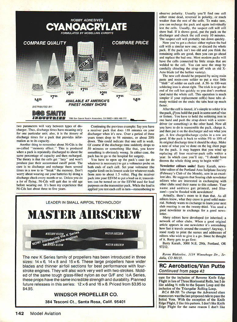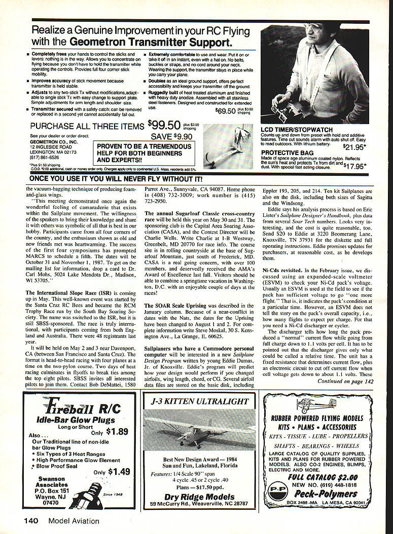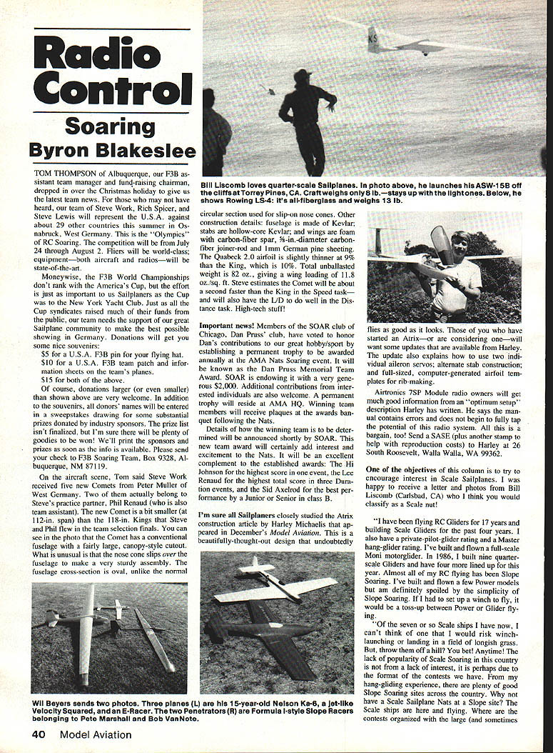 Radio Control Soaring Byron Blakeslee TOM THOMPSON Albuquerque F3B sistant team manager fund-raising chairman dropped over Christmas holiday give us latest team news may have heard team Steve Work Rich Spicer Steve Lewis will represent USA against about 29 other countries summer Os nabruck West Germany Olympics RC Soaring competition will July 24 through August 2 Fliers will world-class equipmentboth aircraft radioswill state-of-the-an Moneywise F3B World Championships dont rank Americas Cup effort just important us Sailplaners Cup New York Yacht Club Just Cup syndicates raised much funds public team needs support great Sailplane community make best possible showing Germany Donations will get some nice souvenirs $5 USA F3B pin flying hat $10 USA F3B team patch infor mation sheets teams planes $15 both above course donations larger smaller shown above very welcome addition souvenirs donors names will entered sweepstakes drawing some substantial prizes donated industry sponsors prize list isnt finalized Im sure will plenty goodies won Well print sponsors prizes soon info available Please send check F3B Soaring Team Box 9328 Al buquerque NM 87119 aircraft scene Tom said Steve Work received five new Comets Peter Muller West Germany Two actually belong Steves practice partner Phil Renaud also team assistant new Comet bit smaller 112-in span 118-in Kings Steve Phil flew team selection finals can see photo Comet has conventional fuselage fairly large canopy-style cutout What unusual nose cone slips over fuselage make very sturdy assembly fuselage cross-section oval unlike normal circular section used slip-on nose cones Other construction details fuselage made Kevlar stabs hollow-core Kevlar wings foam carbon-fiber spar %-in-diameter carbonfiber joiner-rod 1mm German pine sheeting Quabeck 20 airfoil slightly thinner 9% King 10% Total unballasted weight 82 oz giving wing loading 118 oz/sq ft Steve estimates Comet will about second faster King Speed task will also have L/D well Dis tance task High-tech stuff Important news Members SOAR club Chicago Dan Pruss club have voted honor Dans contributions great hobby/sport establishing permanent trophy awarded annually AMA Nats Soaring event will known Dan Pruss Memorial Team Award SOAR endowing very gene rous $2000 Additional contributions inter ested individuals also welcome permanent trophy will reside AMA HQ Winning team members will receive plaques awards ban quet following Nats Details winning team deter mined will announced shortly SOAR new team award will certainly add interest excitement Nats will excellent complement established awards Hi Johnson highest score event Lee Renaud highest total score three Dura tion events Sid Axelrod best per formance Junior Senior class B Im sure Sailplaners closely studied Atrix construction article Harley Michaelis ap peared Decembers Model Aviation beautifully-thought-out design undoubtedly WiI Beyers sends two photos Three planes L 1 5-year-old Nelson Ka-6 jet-lIke VelocIty Squared E-Racer two Penetrators R Formula I-style Slope Racers belongIng Pete Marshall Bob VanNote flies good looks wno nave started Atrixor considering onewill want some updates available Harley update also explains use two indi vidual aileron servos altemate stab construction full-sized computer-generated airfoil tem plates rib-making Airtronics 75P Module radio owners will get much good information optimum setup description Harley has written says man ual contains errors does begin fully tap potential radio system bargain too Send SASE plus another stamp help reproduction costs Harley 26 South Roosevelt Walla Walla WA 99362 objectives column try encourage interest Scale Sailplanes happy receive letter photos Bill Liscorob Carlsbad CA think would classify Scale nut have flying RC Gliders 17 years building Scale Gliders past four years also have private-pilot-glider rating Master hang-glider rating Ive built flown full-scale Moni motorglider 1986 built nine quarterscale Gliders have four lined up year Almost RC flying has Slope Soaring Ive built flown few Power models am definitely spoiled simplicity Slope Soaring set up winch fly would toss-up between Power Glider fly ing seven Scale ships have now cant think would risk winchlaunching landing field longish grass throw off hill bet Anytime lack popularity Scale Soaring country lack interest perhaps due format contests have hang-gliding experience plenty good Slope Soaring sites across country have Scale Sailplane Nats Slope site Scale ships flying contests organized large sometimes 40 Model Aviation Bill Liscomb loves quarter-scale Sailpianes photo above launches ASW-1 5B off cliffs atTorrey Pines CA Craft weighs 8 ibstays up light ones Below shows Rowing LS-4 Its all-fiberglass weighs 13 lb indeed think Bill has offered excellent idea Next need suitable site group organize wants write offers Seriously Europe run lots Scale fun-flies/contests slopesso no reason shouldnt able put something Lets hear about Wil Byers Richiand WA wrote report Slope Soaring alive well great Pacific Northwest Wil said picked up model ing father began Soaring Don Burt Bunny 1976 interest models revitalized after very nasty hang-gliding acci dent Thats thing like about models can have terrible crash nobody gets hurt Anyway Wil organized first Mid-Columbia Slope Soaring Fun Fly 1979 says have 45 participants over 80 air planes Wil club also put two AMAsanctioned Slope races last year will again sponsor 1987 Wil goes say Slope racing new NW Soaring com munity such just beginning recog nized alternative Thermal competition Tn-City Soarers TRICS club has much support NWSS Northwest Soaring Society get events publicized fine newsletter hopeful will see fliers involved Slope Soaring affiliated group come out fly us regular basis would say primary goal club People come fly us four states also Canada pilots mixed bag range familiar names such Tom Brightbill airline pilot Canada avid flier fliers Continued page 138 high q