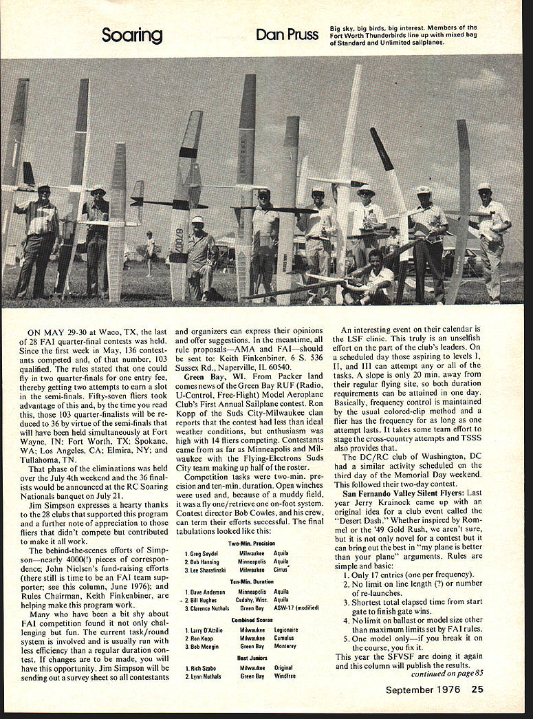 ON MAY 29-30 Waco TX last 28 FAI quarter-final contests held Since first week May 136 contest ants competed number 103 qualified rules stated could fly two quarter-finals entry fee thereby getting two attempts earn slot semi-finals Fifty-seven fliers took advantage time read 103 quarter-finalists will re duced 36 virtue semi-finals will have held simultaneously Fort Wayne IN Fort Worth TX Spokane WA Los Angeles CA Elmira NY Tullahoma TN phase eliminations held over July 4th weekend 36 final ists would announced RC Soaring Nationals banquet July 21 Jim Simpson expresses hearty thanks 28 clubs supported program further note appreciation fliers didnt compete contributed make work behind-the-scenes efforts Simp sonnearly 4000 pieces correspon dence John Nielsens fund-raising efforts still time FAI team sup porter see column June 1976 Rules Chairman Keith Finkenbiner helping make program work have bit shy about FAI competition found chal lenging fun current task/round system involved usually run less efficiency regular duration con test changes made will have opportunity Jim Simpson will sending out survey sheet contestants organizers can express opinions offer suggestions meantime rule proposalsAMA FAIshould sent Keith Finkenbiner 6 5 536 Sussex Rd Naperville IL 60540 Green Bay WI Packer land comes news Green Bay RUF Radio U-Control Free-Flight Model Aeroplane Clubs First Annual Sailplane contest Ron Kopp Suds City-Milwaukee clan reports contest less ideal weather conditions enthusiasm high 14 fliers competing Contestants came far Minneapolis Mil waukee Flying-Electrons Suds City team making up half roster Competition tasks two-mm pre cision ten-mm duration Open winches used because muddy field fly one/retrieve on-foot system Contest director Bob Cowles crew can term efforts successful final tabulations looked like Two-M Precisisa 1 Greg Seydel 2 Bob Massing 3 Lee Sharafioski MilwaukeeAquila Minneapolis Aquila MilwaukeeCirrus Ten-Mi Duration 1 Dave Anderson 2 Bill Hughes 3 Clarence Nuthals Minneapolia Cuduhy Wisc Green Bay Aquila Aquila ASW-11 modified Combined Scores 1 Larry DAttilia 2 Ron Kopp 3 Bob Mongin Milwaukee Milwaukee Green Bay Legiosaire Cumulus Monterey Beat Juniors 1 Rich SzahoMilwaukeeOriginal 2 Lyna NathalsGreen BayWiodfree Big sky big birds big interest Members Fort Worth Thunderbirds line up mixed bag Standard Unlimited sailpianes An interesting event calendar LSF clinic truly unselfish effort part clubs leaders scheduled day aspiring levels II III can attempt tasks slope 20 mm away regular flying site both duration requirements can attained day Basically frequency control maintained usual colored-clip method flier has frequency long attempt lasts takes some team effort stage cross-country attempts TSSS also provides DC/RC club Washington DC similar activity scheduled third day Memorial Day weekend followed two-day contest San Fernando Valley Silent Flyers Last year Jerry Krainock came up original idea club event called Desert Dash Whether inspired Rom mel 49 Gold Rush arent sure novel contest can bring out best plane better plane arguments Rules simple basic I Only 17 entries per frequency 2 No limit line length er re-launches 3 Shortest total elapsed time start gate finish gate wins 4 No limit ballast model size other maximum limits set FAI rules 5 One model onlyif break course fix year SFVSF doing again column will publish results continued page 85 September 1976 25 GRAB HANDFUL OF RS CHANNEL Theres least 3 reasons think youll inter ested new 3 channel transmitter First its small size 48 X 54 X 16 easy carry easy handle Second its light weight just 1 lb 5 oz including rechargeable nicads Third familiar RS quality handcrafting quality components its compact design precise control functions new RS 3 channel transmitter natural variety powered sail soaring applications See local dealer details contact us direct da RS Systems Canada 2050 Mansfield St Montreal Quebec H3A 1 Y9 Canada COMPANY Holland Drive sville Maryland 20705 474-2900 edge motor installed twostrand motor 2-mm rubber about 19 long works well Put about 1000 turns allow model ROG flies straight ahead stalls bend rudder over left turn stalling persists bend stabilizer trailing edge down Re member tightening up left turn will help convert stall spiral climb reduce need down-thrust stabilizer force during initial power burst model adjusted climb smooth left turn stalling add few turnsmy normal maximum about 1500 model should take off make fairly steep climb left nearly stall roll out proceed shallow left climb stall too severe turn tight bend stabilizer down add down-thrust shim hind top nose block initial flights model refuses climb rather flies tight left circle open up turn rudder climb still poor remove some ballast clay consider yourself lucky Stalling probable difficulty addi tional incidence built lower left wing should hold up during turns ever doesnt add small trim tab prototype model nearly five years old now has provided lot enjoy able flying competitive well just fun hope yours does same RC Soaring/Pruss continued page 25 Ron Kopp pointed out fact al though half contestants Suds City team support like encourages new clubs further promote RC Soaring pointed out Suds City Soaring Teams now sponsored Old Milwaukee beerfirst successful con test because group down Chicago way kind enough loan winches operators that newly formed group now has annual bashOld Mil waukee sponsoredcalled Suds City Soar-In Tn State Soaring Society Mention group made back now probably fastest growing clubs country Made up fliers eastern Ohio western Pennsylvania West Virginia organization has over 60 members judging news letter Sandbag now theres honest bunch calls way see group active expert/sportsman categories discussed column last month Sharon Center OH May 22 28 fliers competed J Keleher topped Grand Esprit next five places also won expert class J Davis out-flew next two earned seventh place overall first sportsman class Davis 